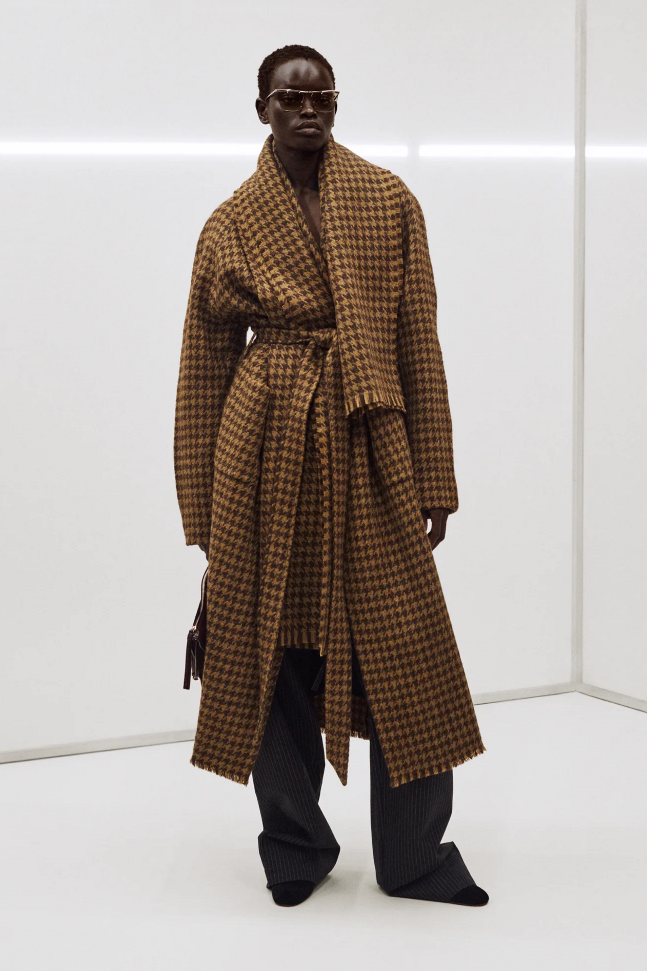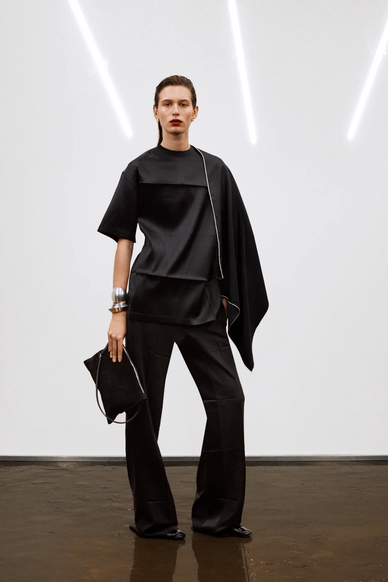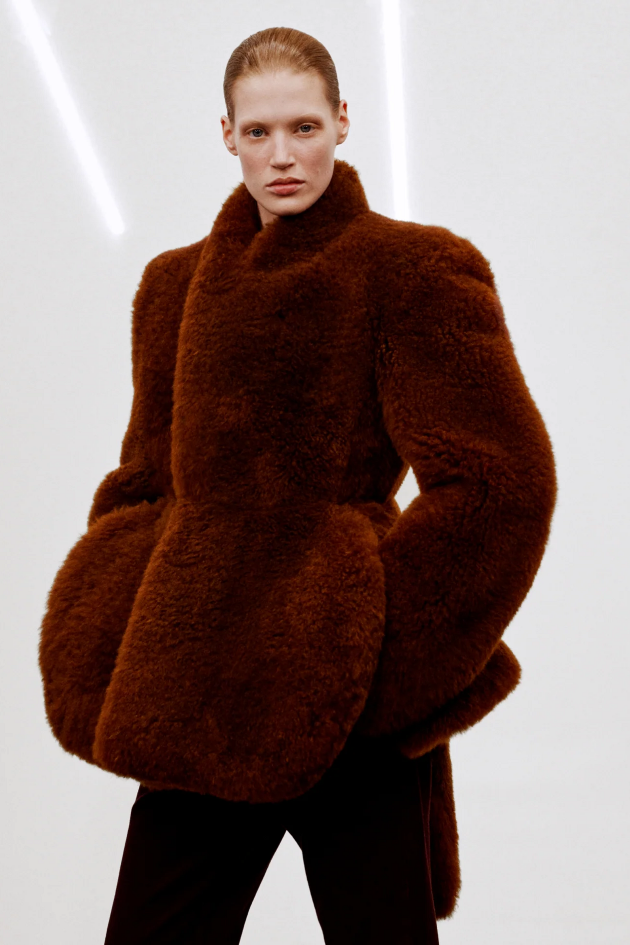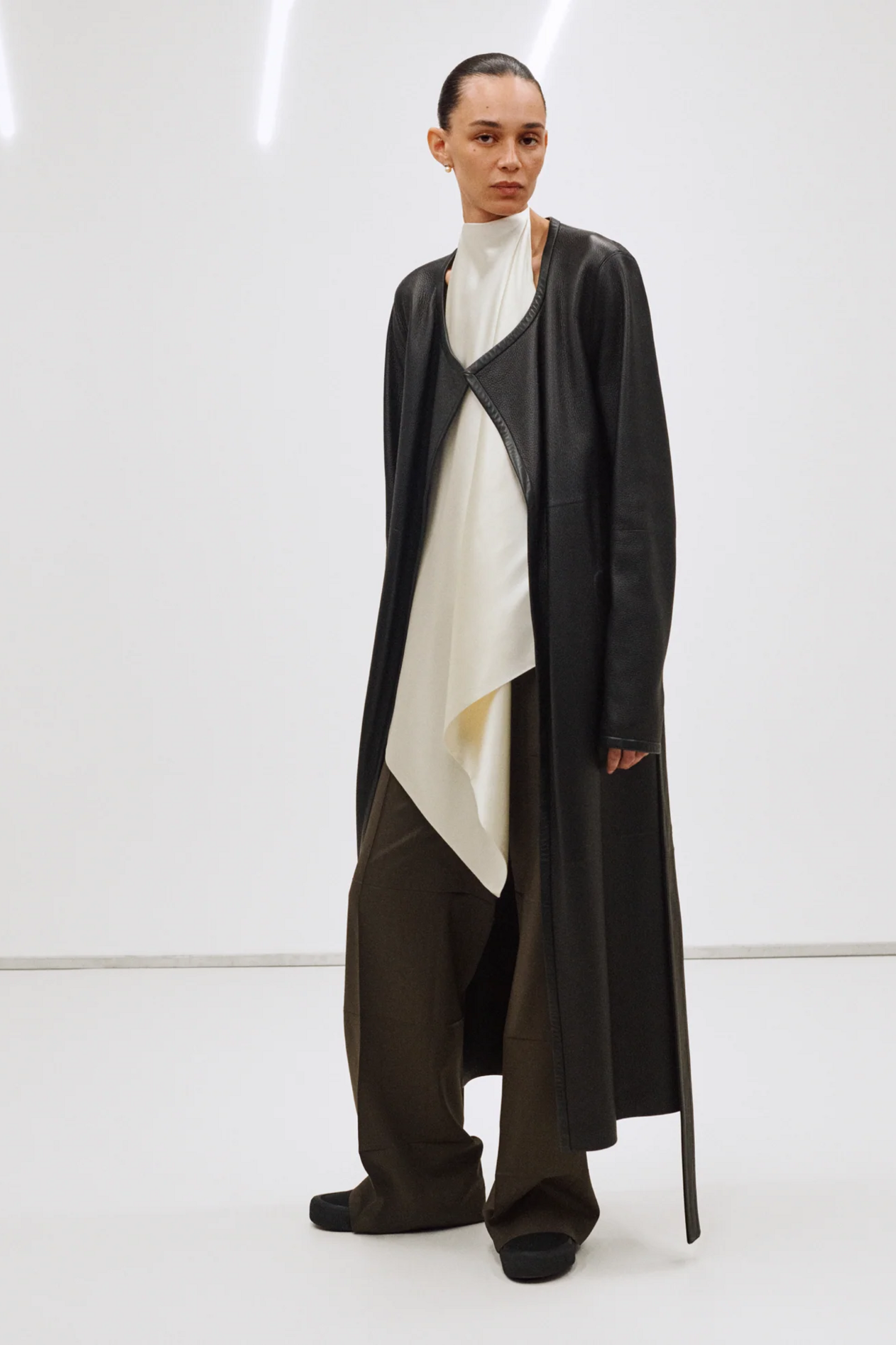 材质扮演着低调却重要的角色。羊毛皮贯穿始终,经特殊处理后其质感从挺括变为柔软,效果近乎做旧。皮革则被运用在一些看似不寻常的单品中——尤其是常常用来营造舒适感的款式,例如宽松长裤或简约套装。这种熟悉与颠覆之间的张力贯穿整季,赋予了原本简洁的单品更加鲜明的个性。