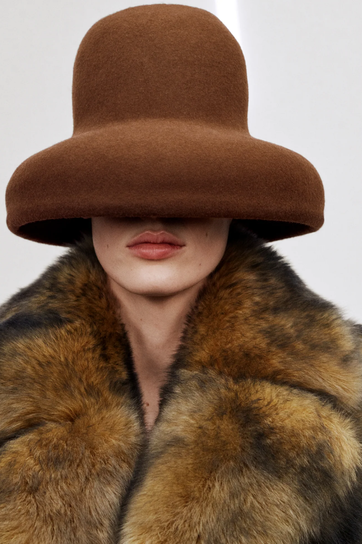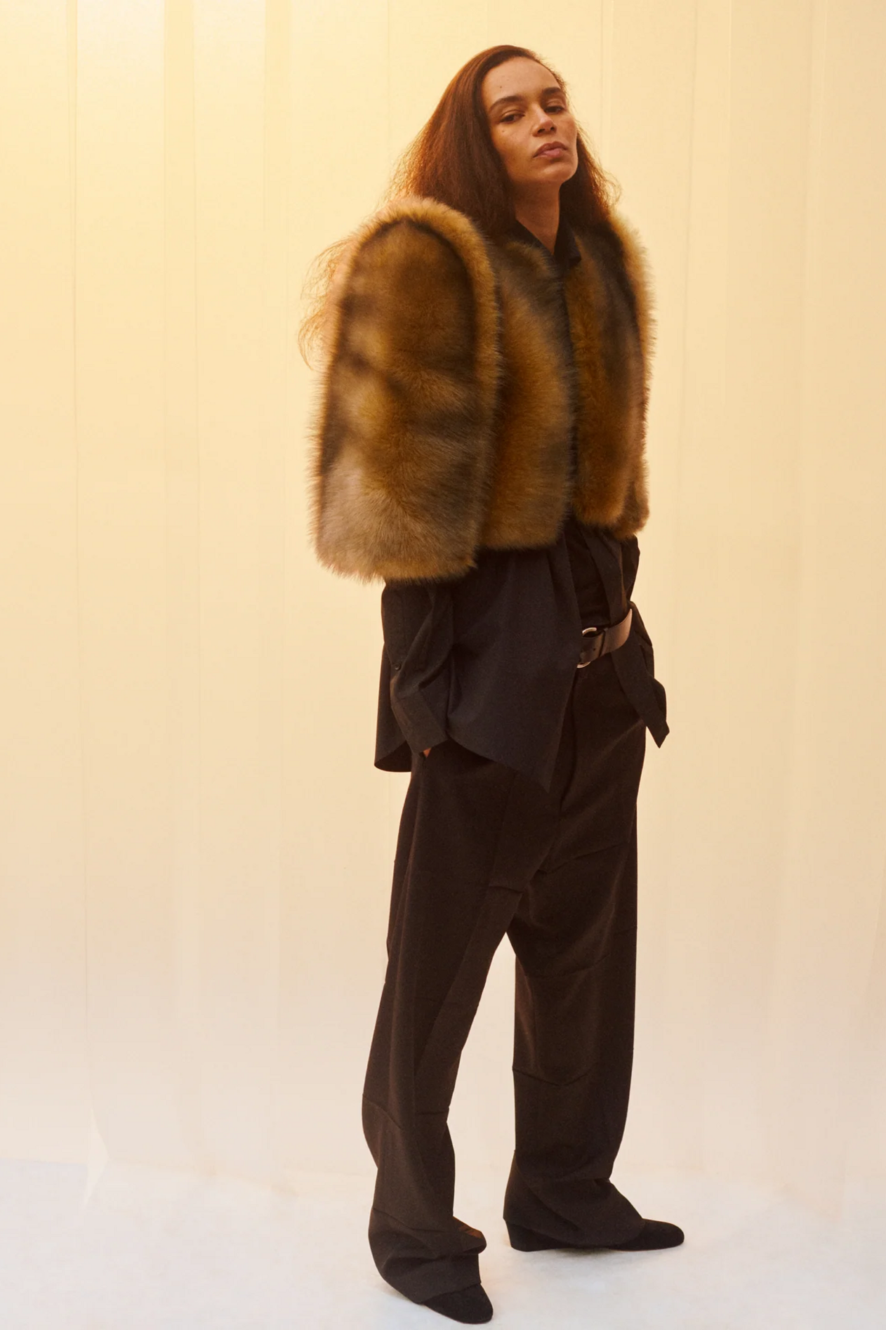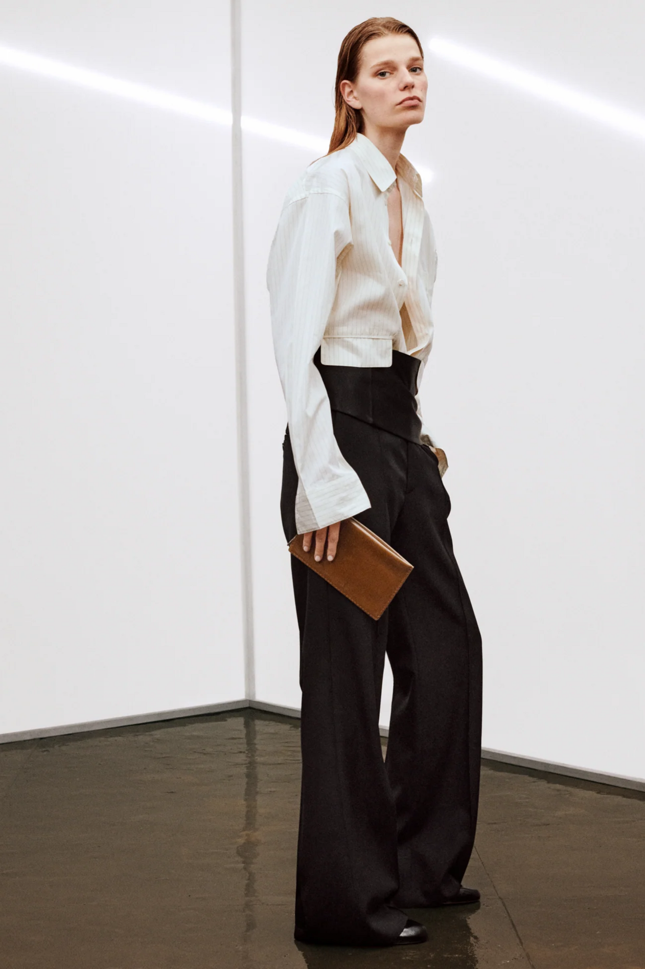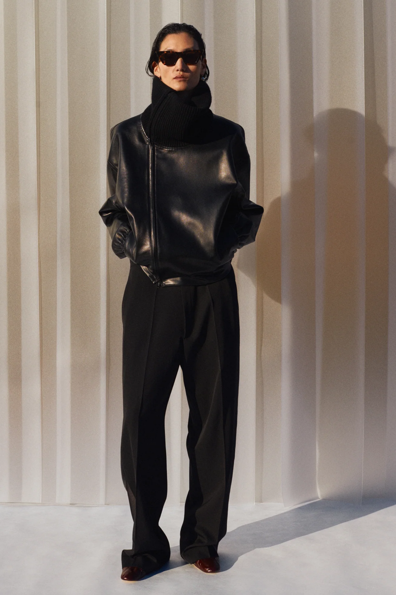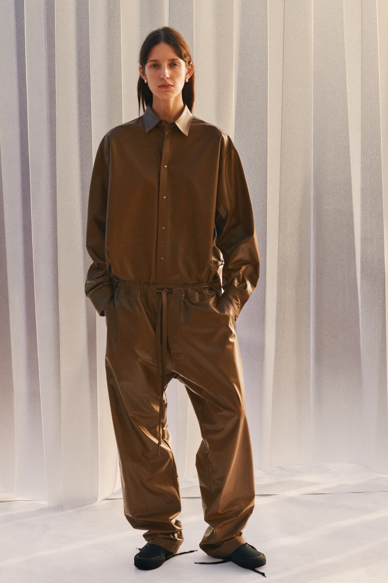 材质扮演着低调却重要的角色。羊毛皮贯穿始终,经特殊处理后其质感从挺括变为柔软,效果近乎做旧。皮革则被运用在一些看似不寻常的单品中——尤其是常常用来营造舒适感的款式,例如宽松长裤或简约套装。这种熟悉与颠覆之间的张力贯穿整季,赋予了原本简洁的单品更加鲜明的个性。