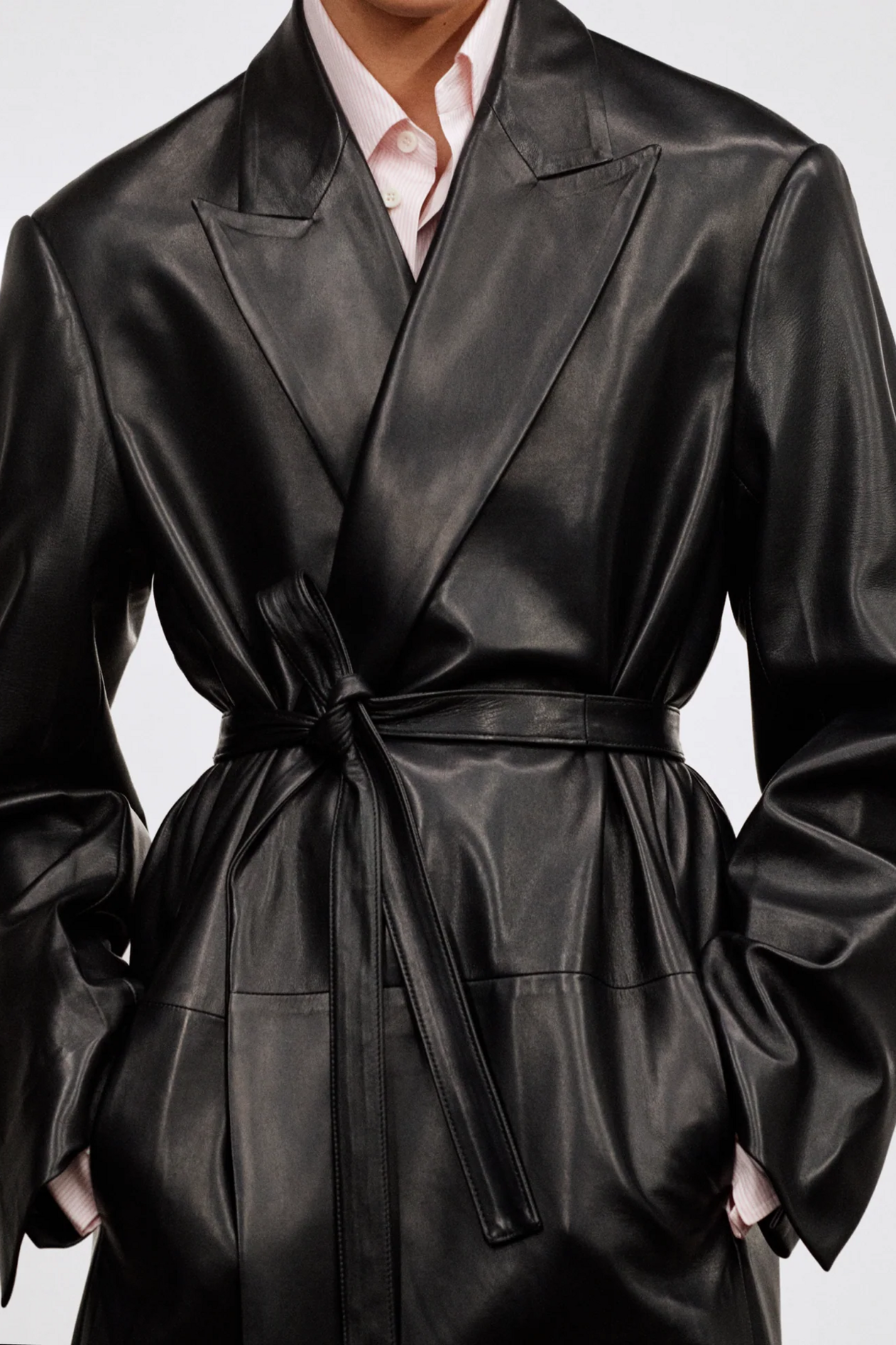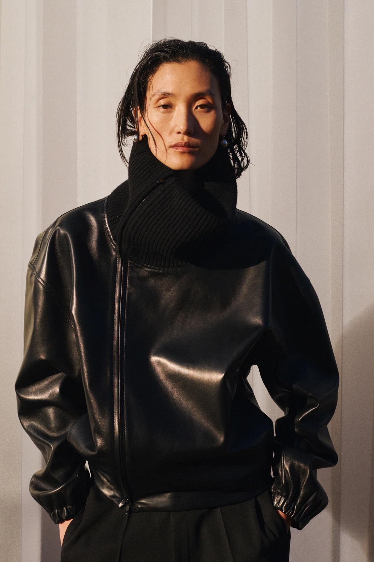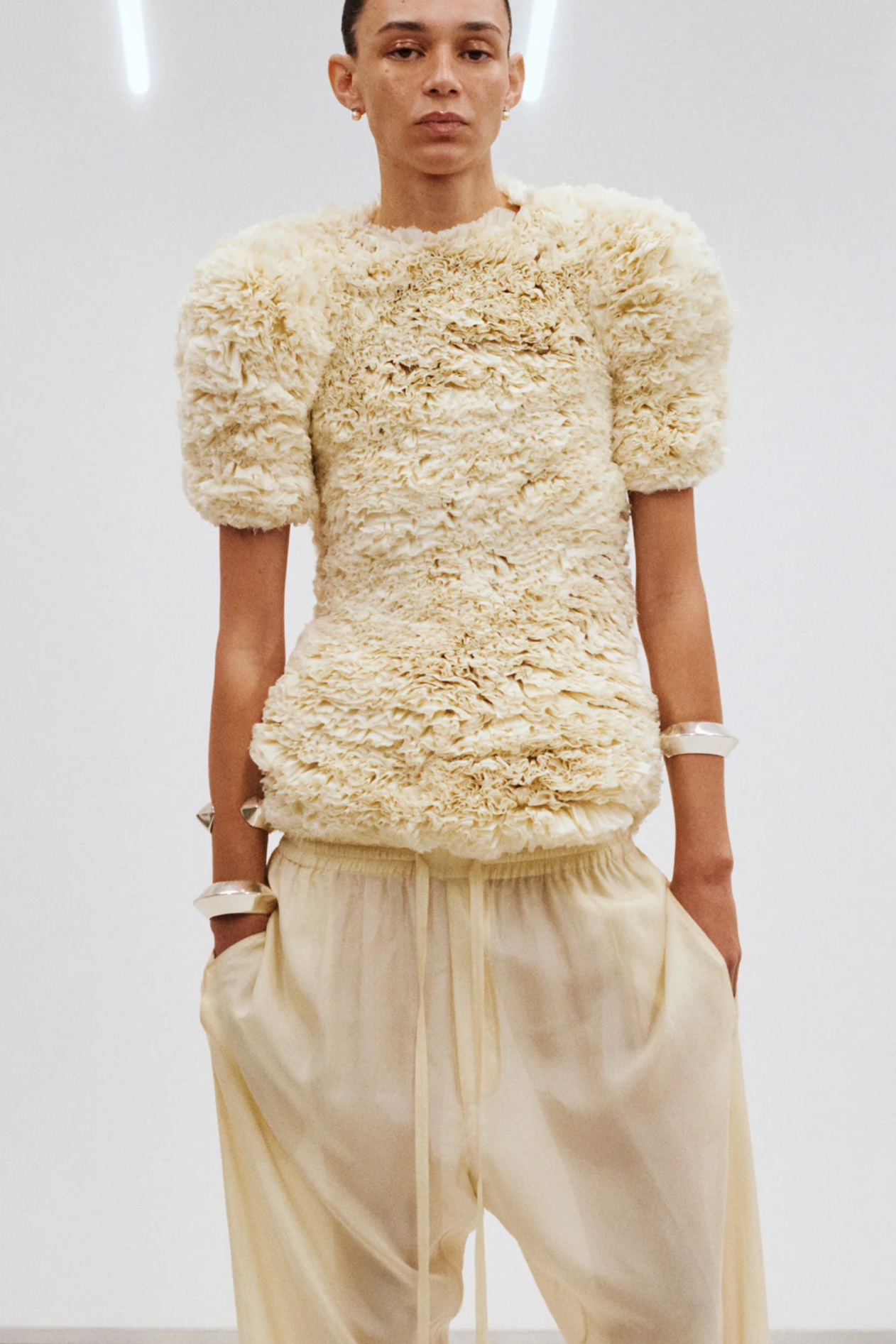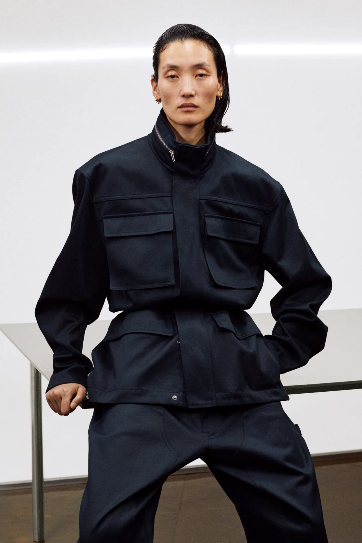 材质扮演着低调却重要的角色。羊毛皮贯穿始终,经特殊处理后其质感从挺括变为柔软,效果近乎做旧。皮革则被运用在一些看似不寻常的单品中——尤其是常常用来营造舒适感的款式,例如宽松长裤或简约套装。这种熟悉与颠覆之间的张力贯穿整季,赋予了原本简洁的单品更加鲜明的个性。