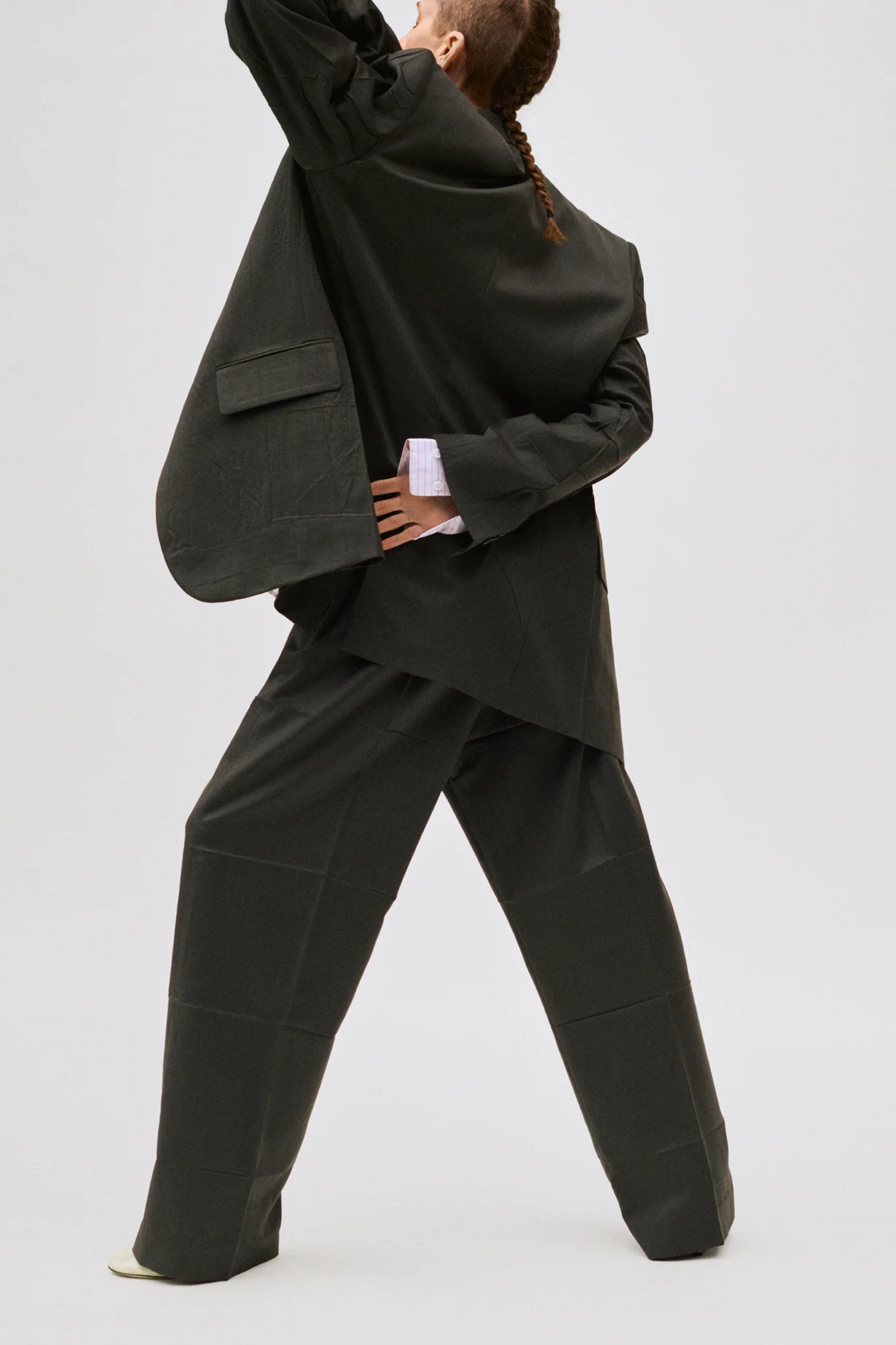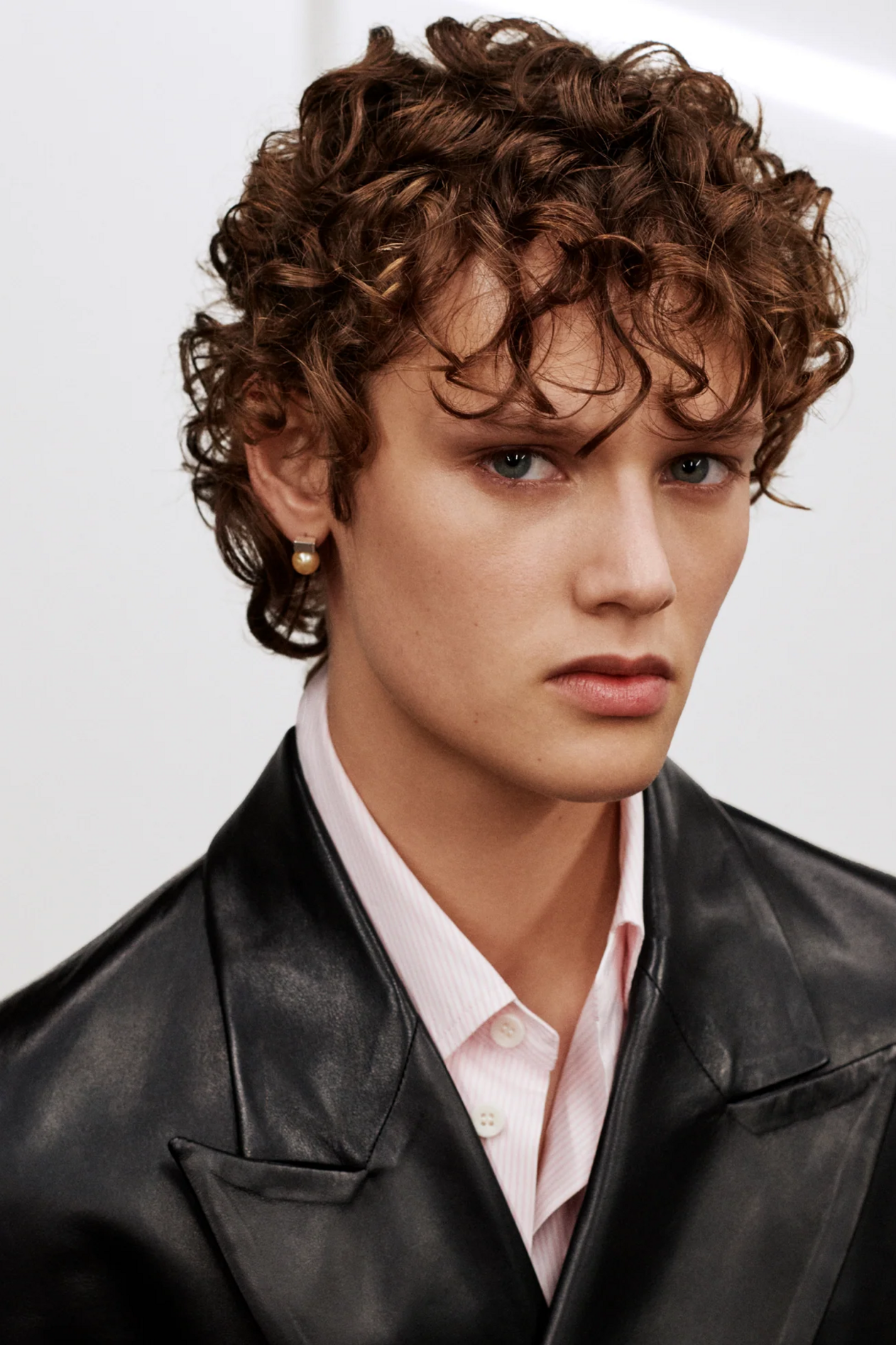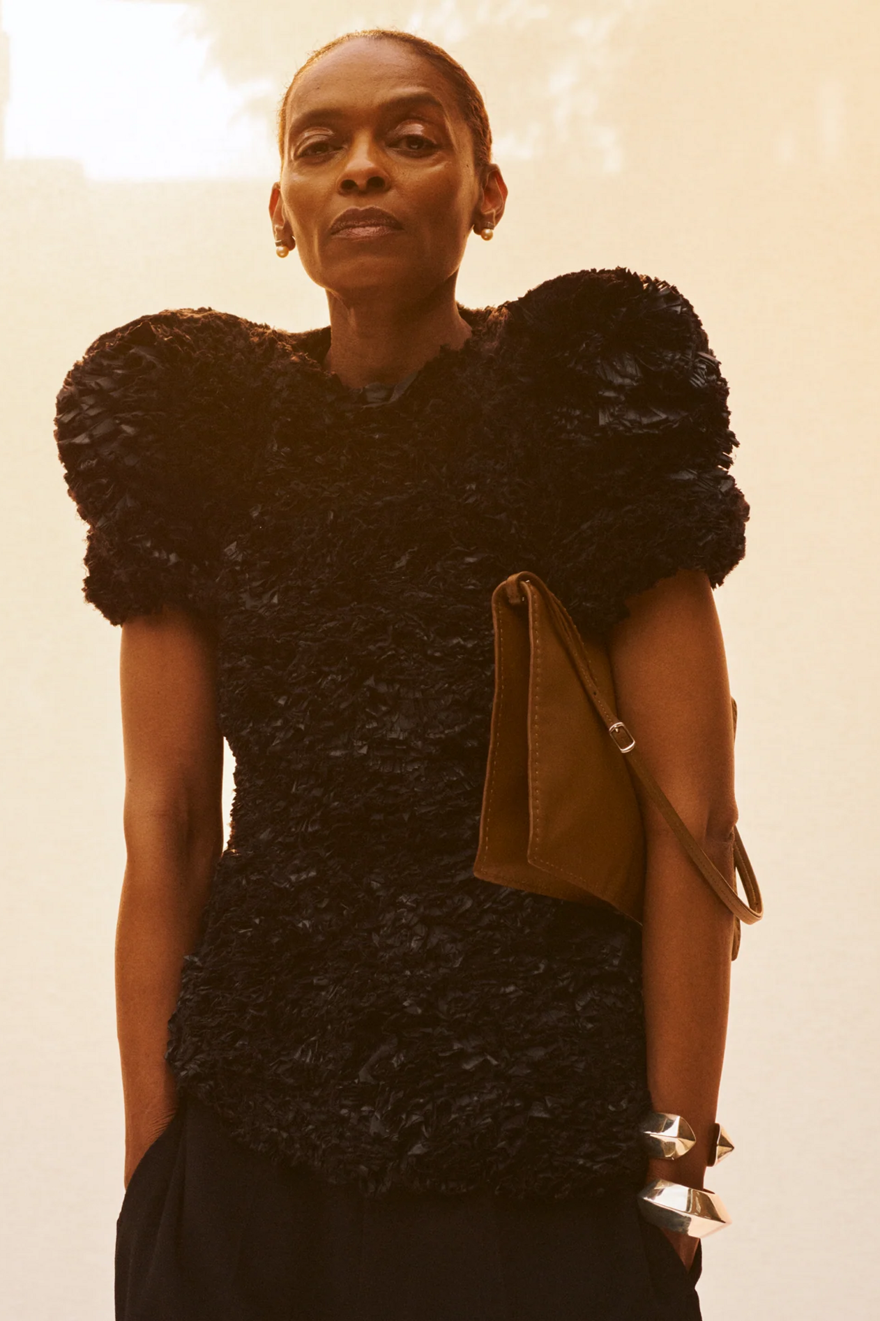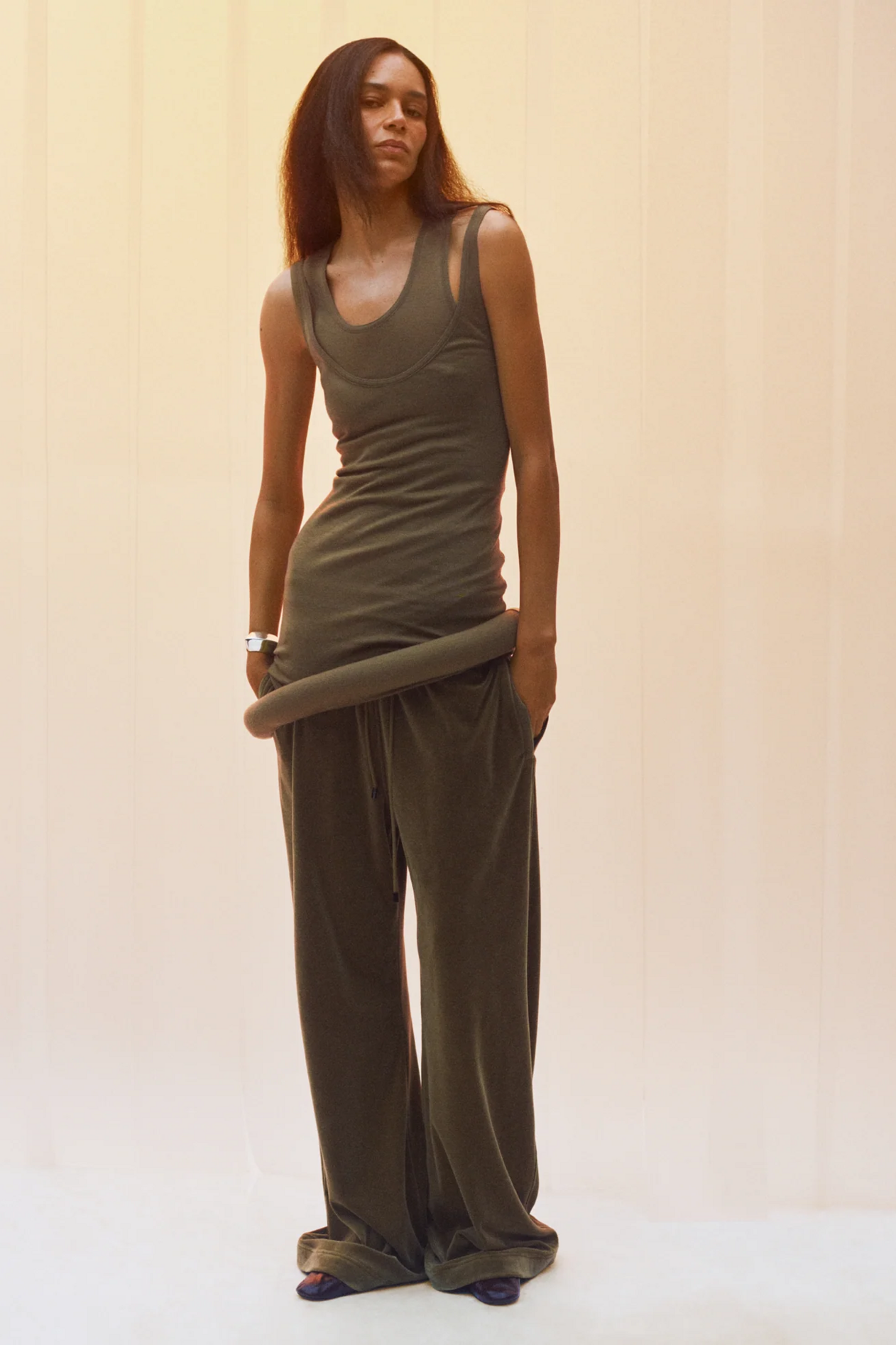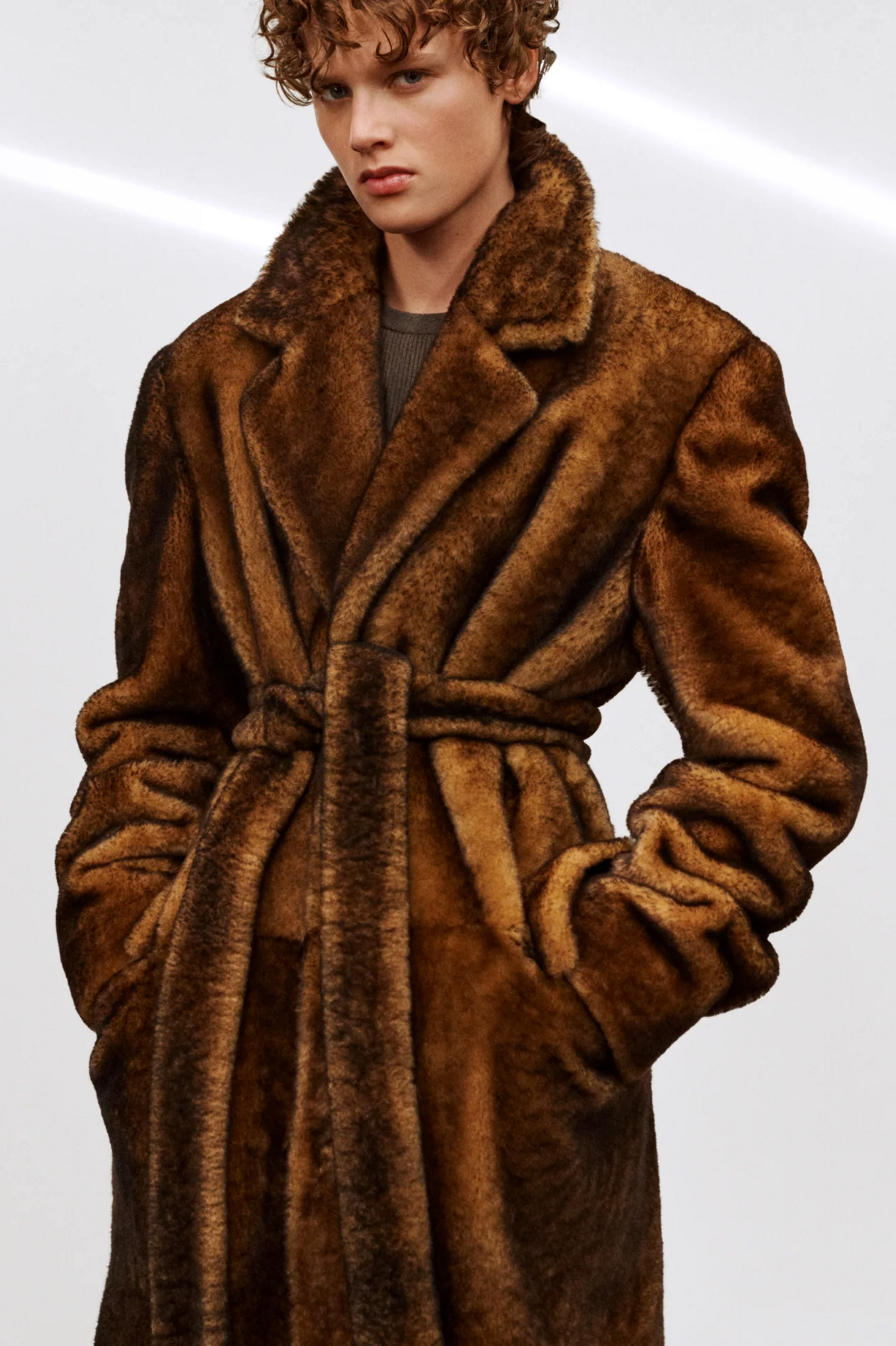 材质扮演着低调却重要的角色。羊毛皮贯穿始终,经特殊处理后其质感从挺括变为柔软,效果近乎做旧。皮革则被运用在一些看似不寻常的单品中——尤其是常常用来营造舒适感的款式,例如宽松长裤或简约套装。这种熟悉与颠覆之间的张力贯穿整季,赋予了原本简洁的单品更加鲜明的个性。