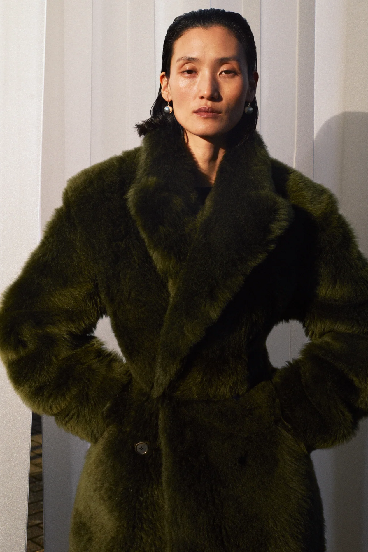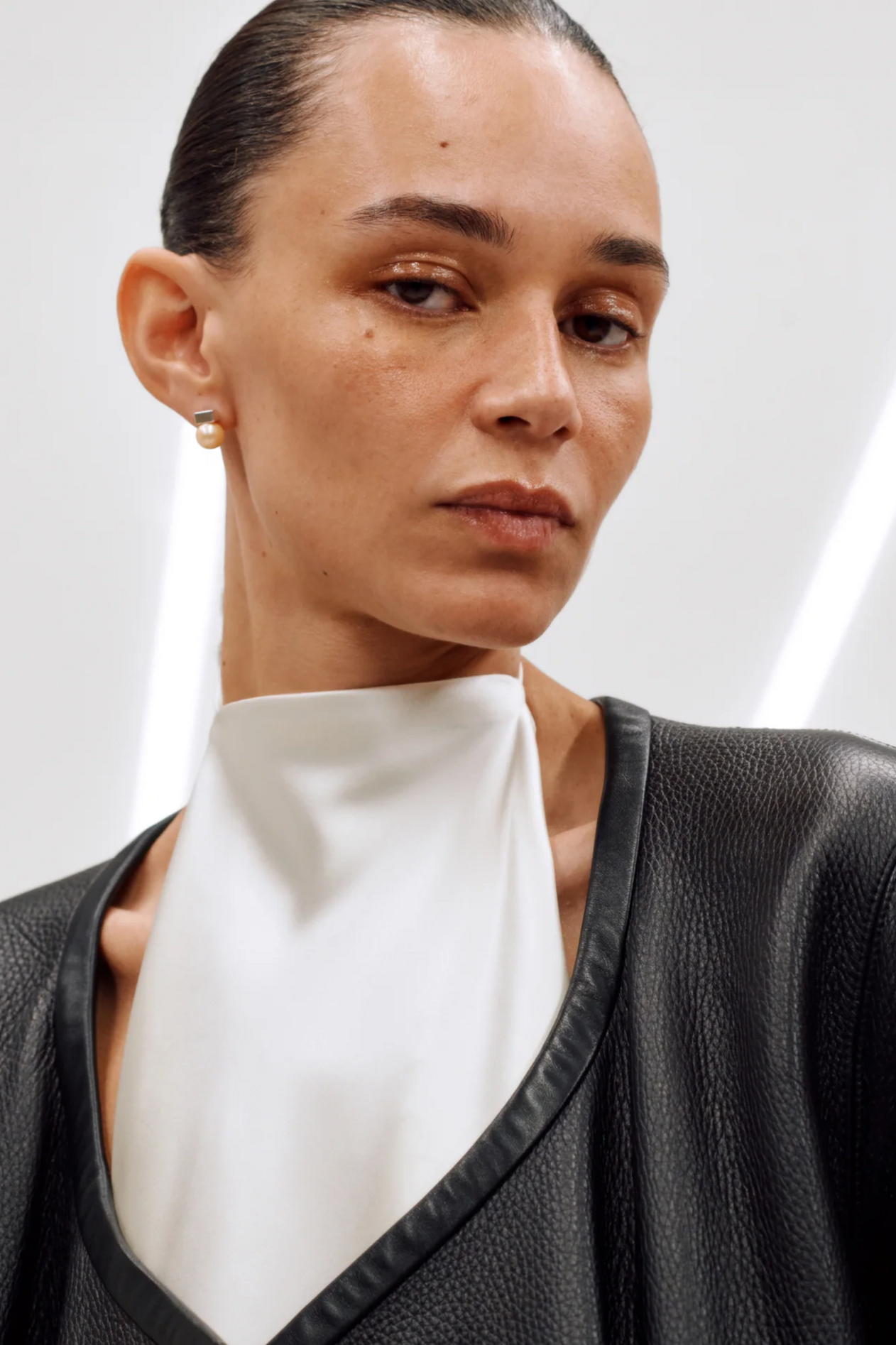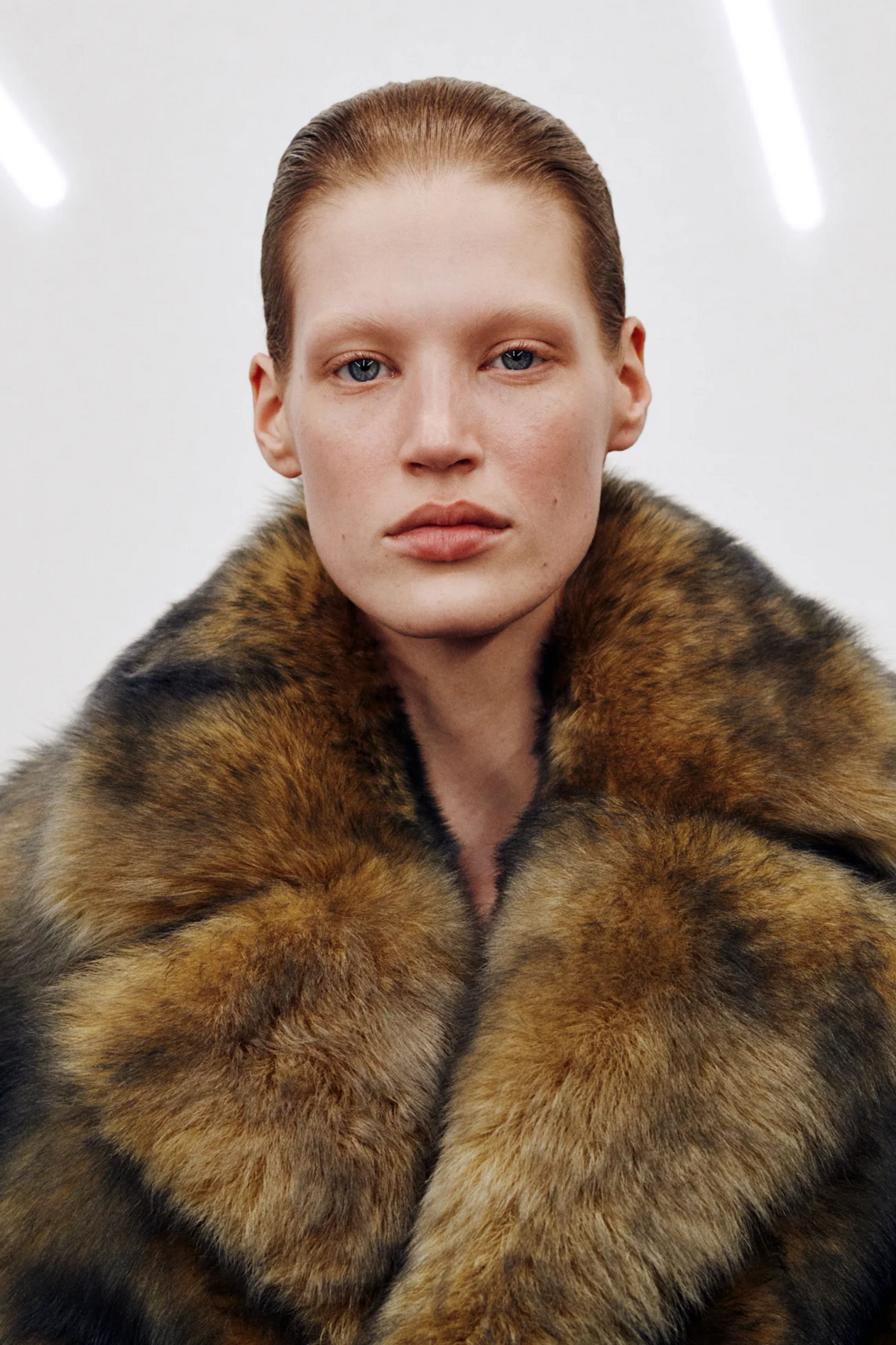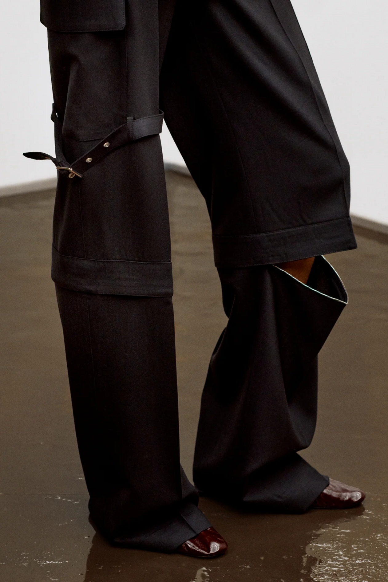 材质扮演着低调却重要的角色。羊毛皮贯穿始终,经特殊处理后其质感从挺括变为柔软,效果近乎做旧。皮革则被运用在一些看似不寻常的单品中——尤其是常常用来营造舒适感的款式,例如宽松长裤或简约套装。这种熟悉与颠覆之间的张力贯穿整季,赋予了原本简洁的单品更加鲜明的个性。