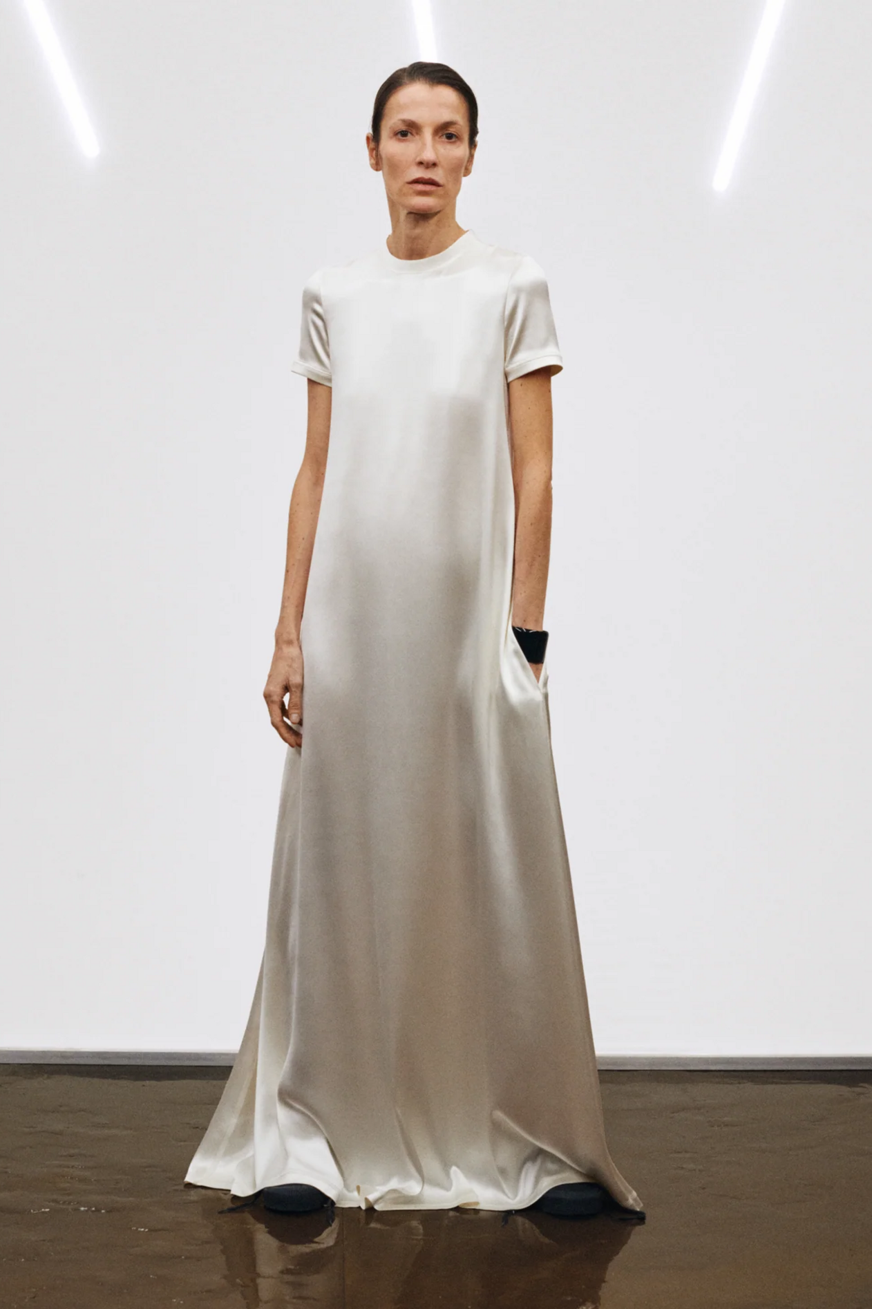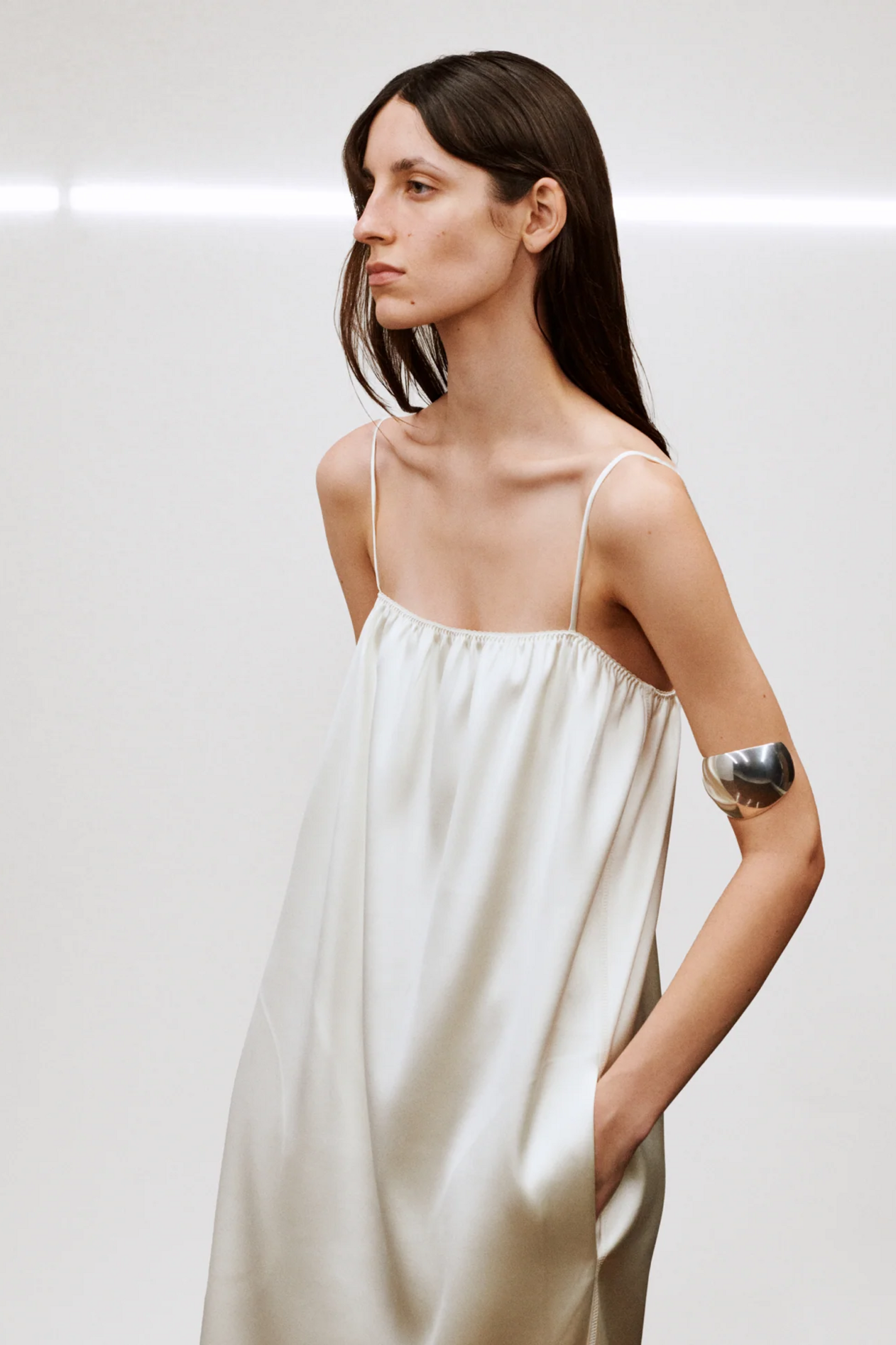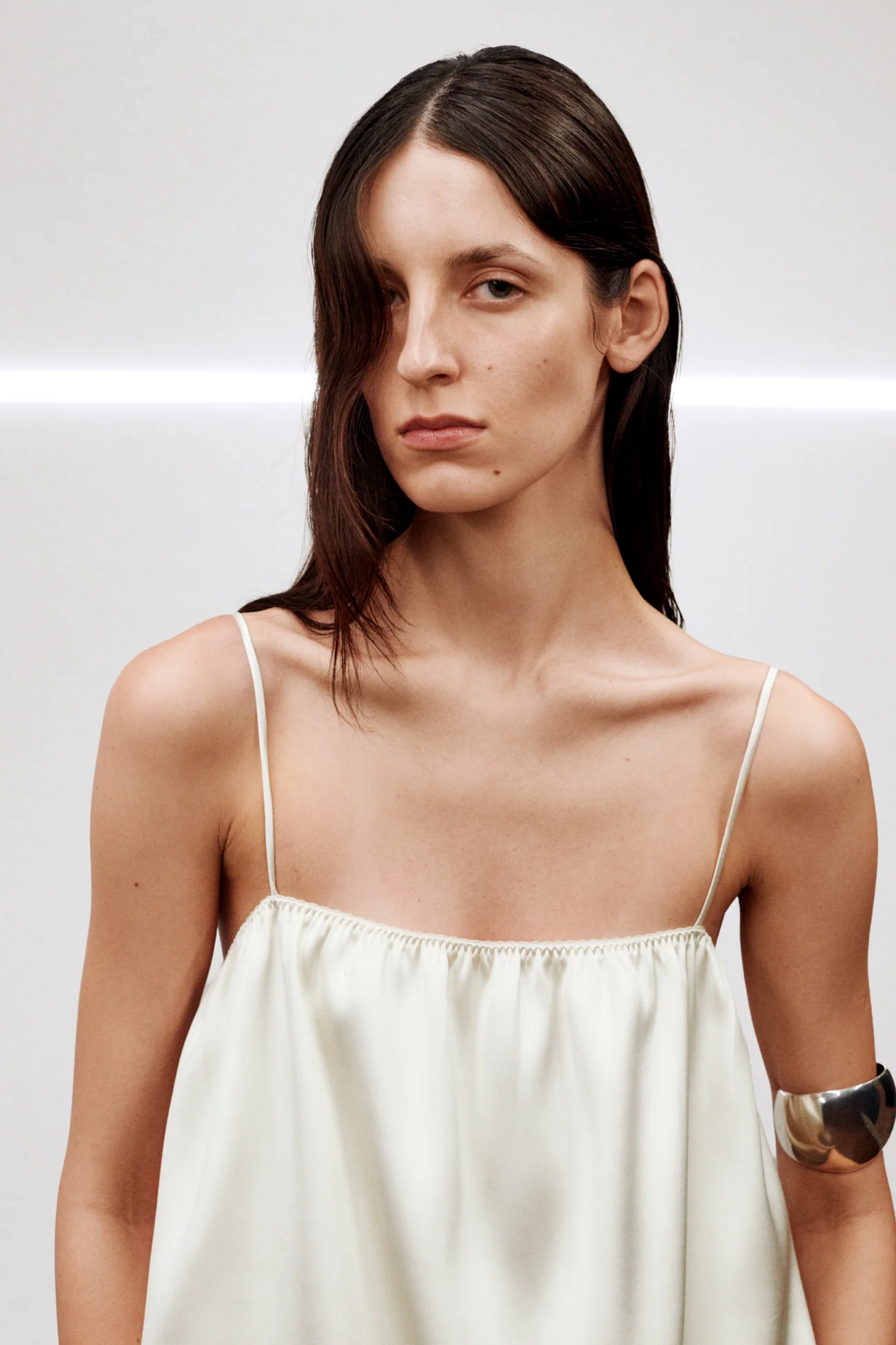 Phoebe Philo 的「E 系列 」以与往季相同的方式发布——没有时装秀,没有喧嚣,却依然令人无法忽视。焦点仍是服装本身,以及它们如何融入现代衣橱。新系列没有试图重塑 Phoebe Philo 的设计语言,而是对其进行了精炼。廓形和理念似曾相识,却更加精准、沉稳。衣裙采用了丝绸甚至是薄纱材质,被简化到服装最本质的形式。宽松的衬衫和阔腿裤也以更收敛夸张性、更加成熟的比例回归。