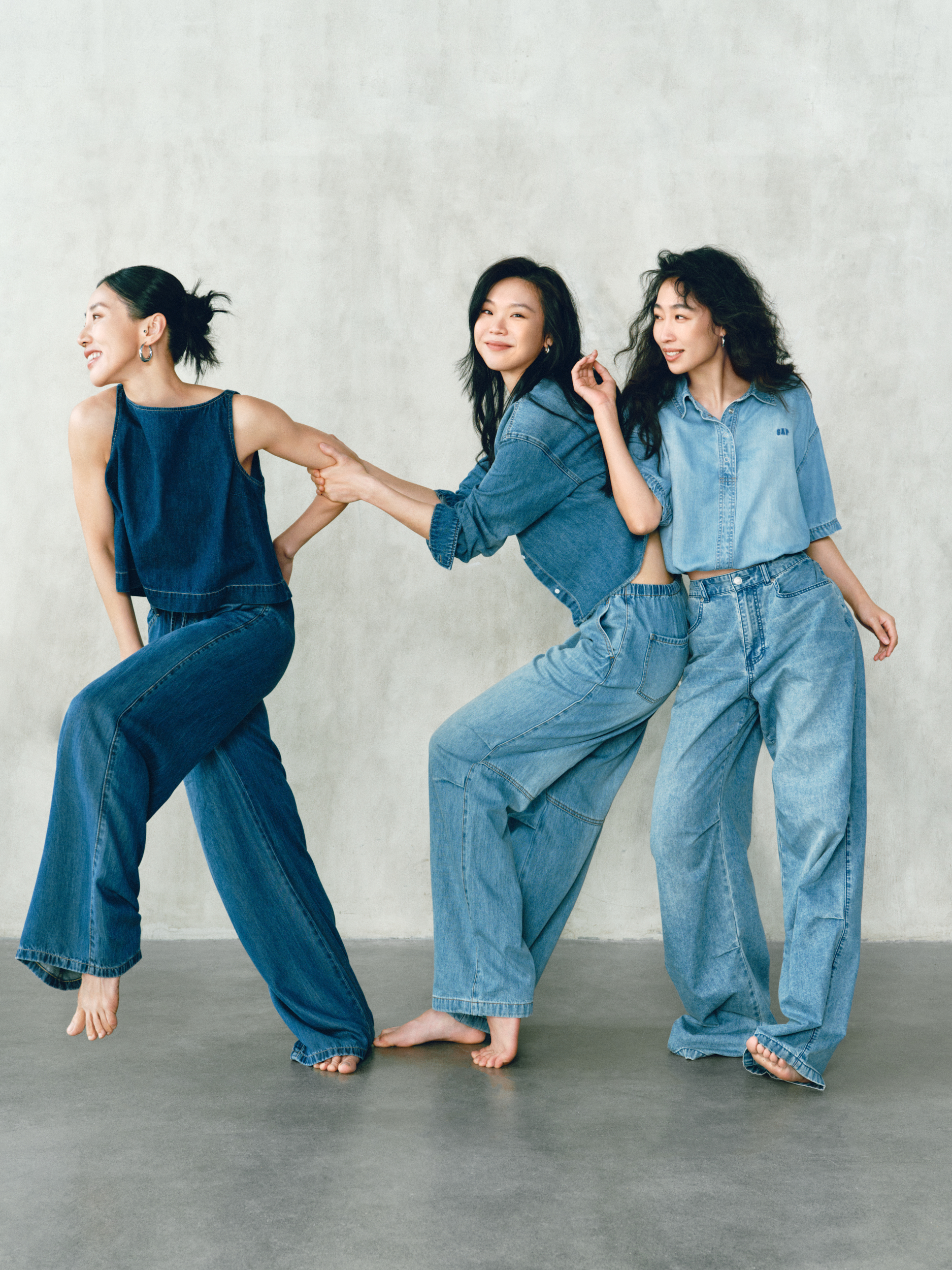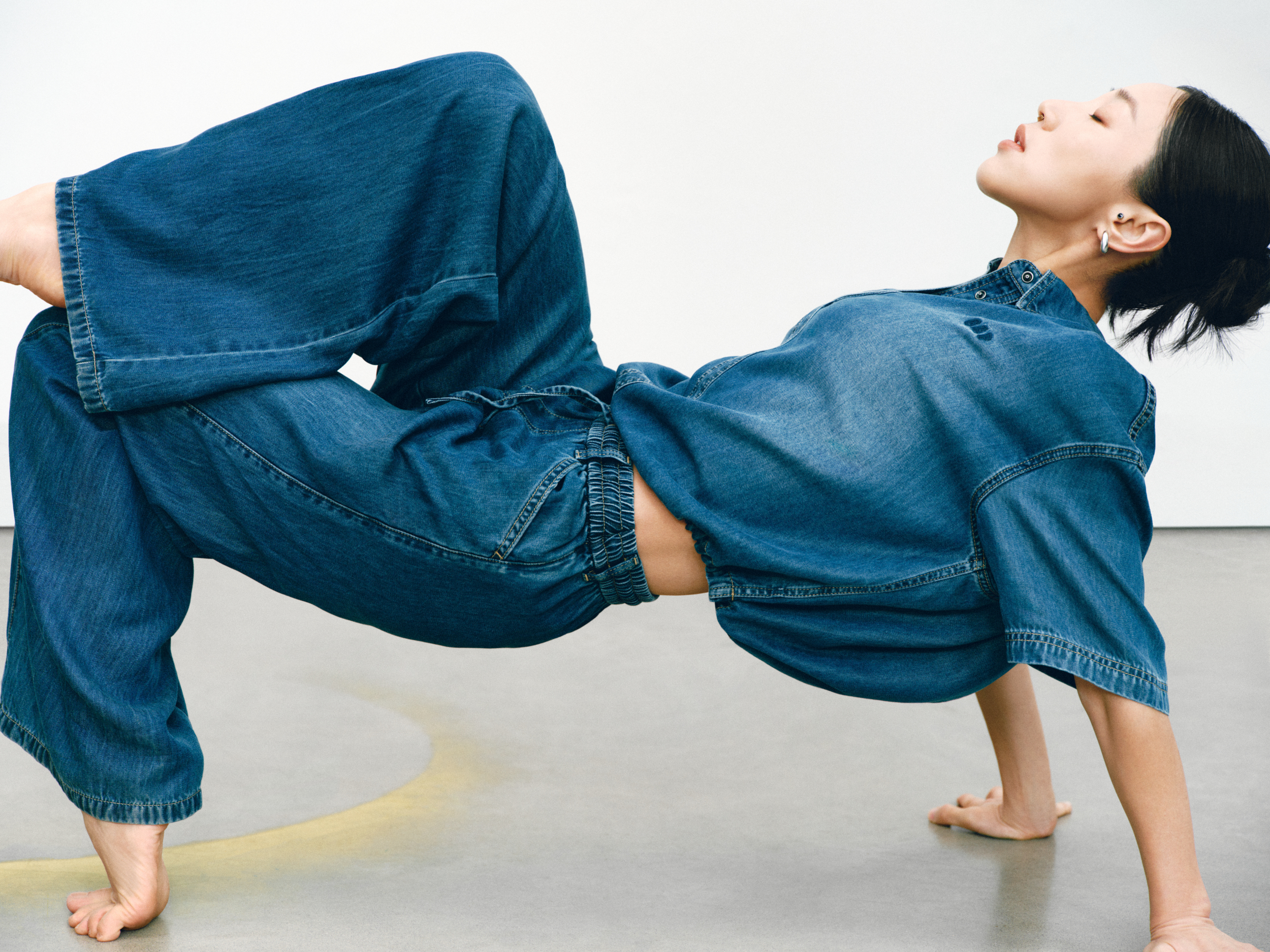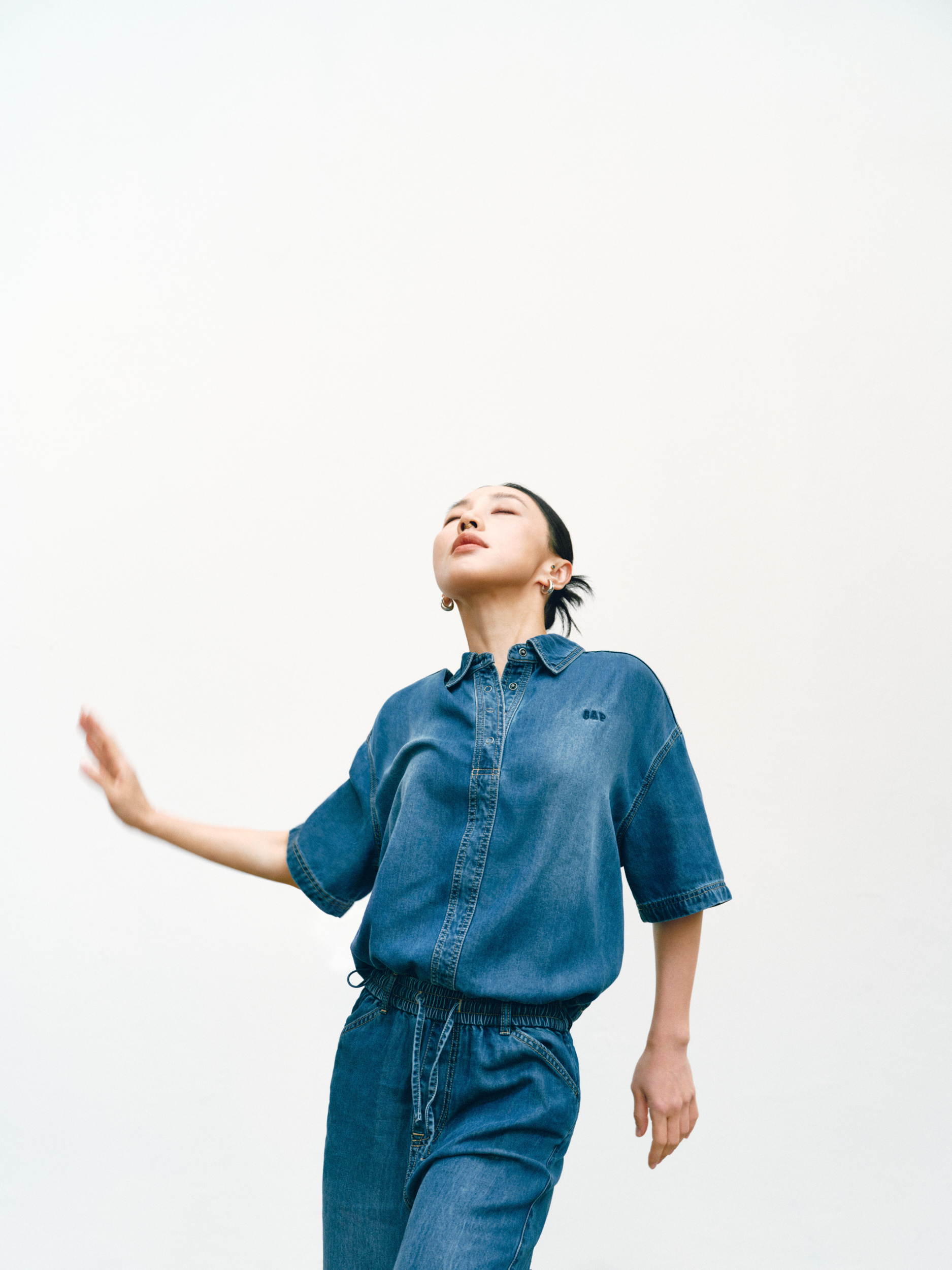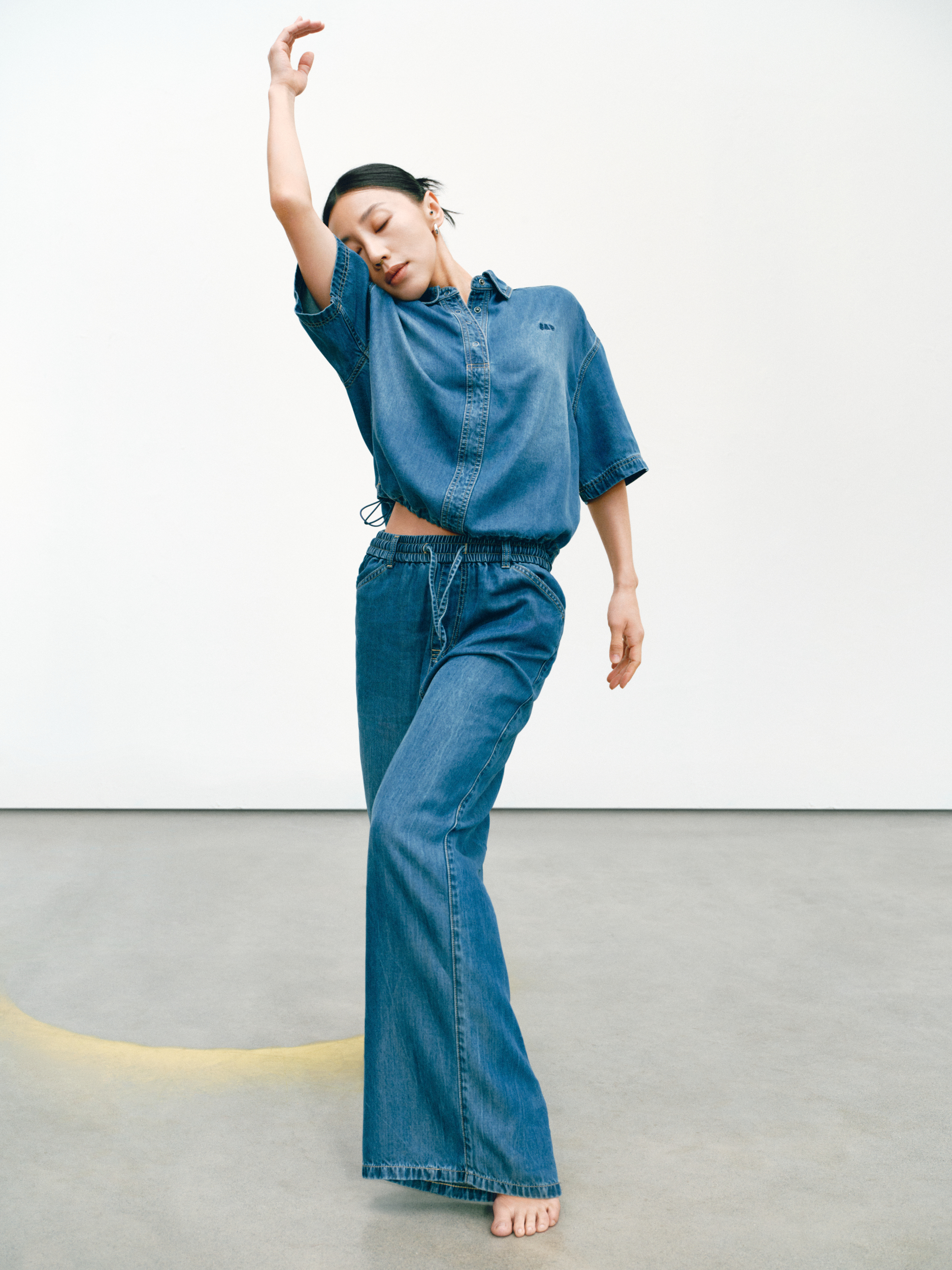 GAP 的「留白」美学不仅停留在精神维度,更巧妙注入两大产品系列:天丝牛仔(Tencel Denim)系列与经典卡其(Khaki)系列。伴随舞者的灵动演绎,天丝牛仔(Tencel Denim)系列服饰呈现出宛若「第二层肌肤」的细腻触感与垂坠性。打破了传统牛仔「硬朗」、「束缚」的刻板印象,在物理层面实现了真正的「留白」:以丝滑垂顺的质地,打造「会呼吸的牛仔」,为肢体预留出自由舒展的空间。