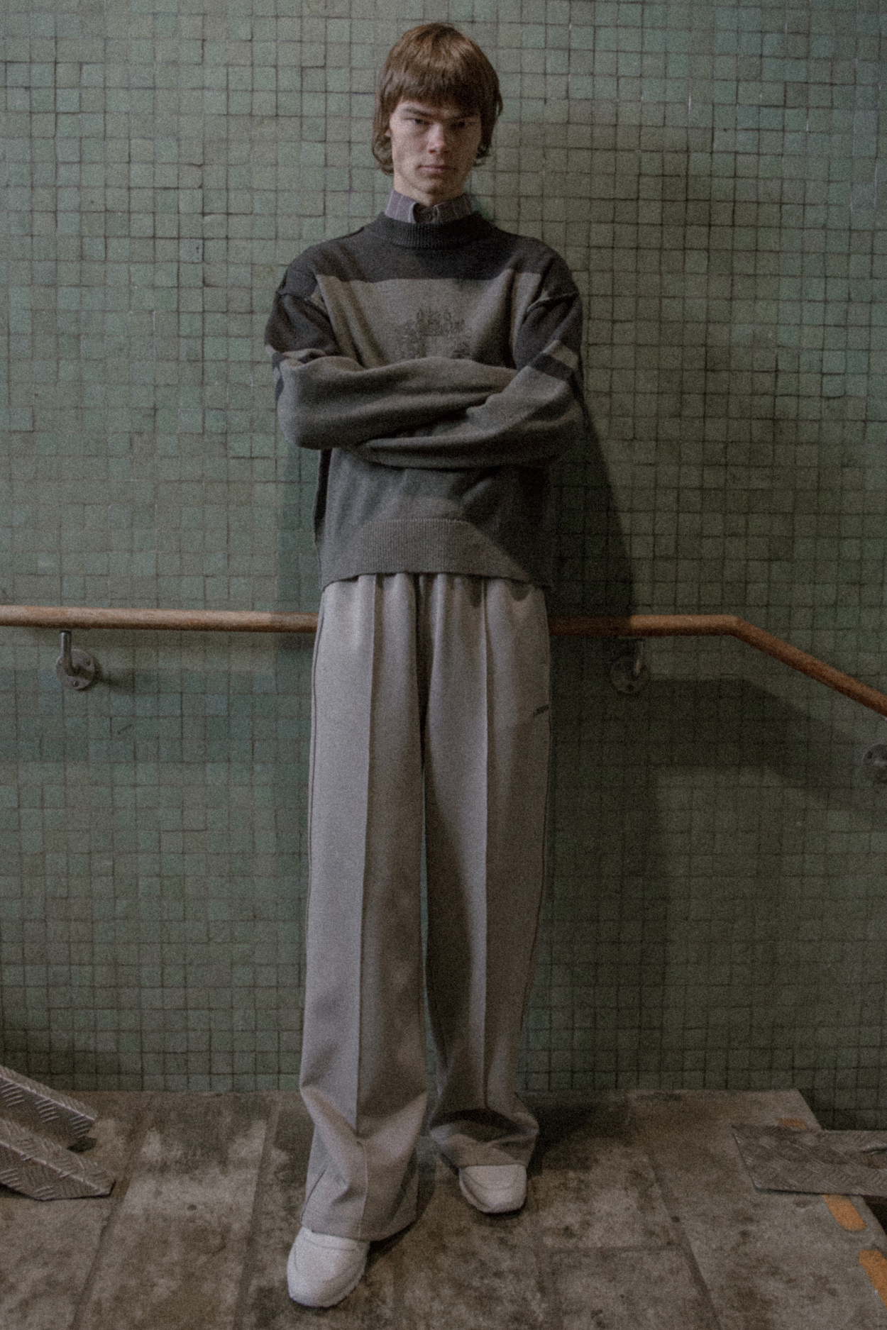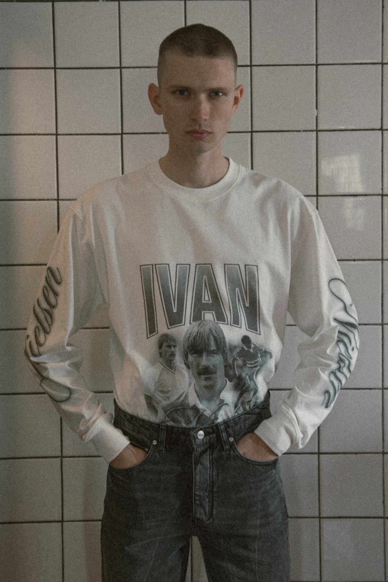 在功能性方面,防风夹克和轻便的冲锋衣引入了性能至上的元素,针织衫和卫衣则保持了宽松的廓形和落肩设计。饰有品牌标识的针织衫、连帽衫和圆领衫进一步强化了这一设计方向。裤装也以实用性为导向,采用水洗牛仔布和工装裤款式,使整个系列更贴近日常。图案设计以丹麦球星 Ivan Nielsen 为主题,其形象被融入数码印花,一一印制在以开孔单面针织面料制成的服装上,营造出水洗做旧的质感。
