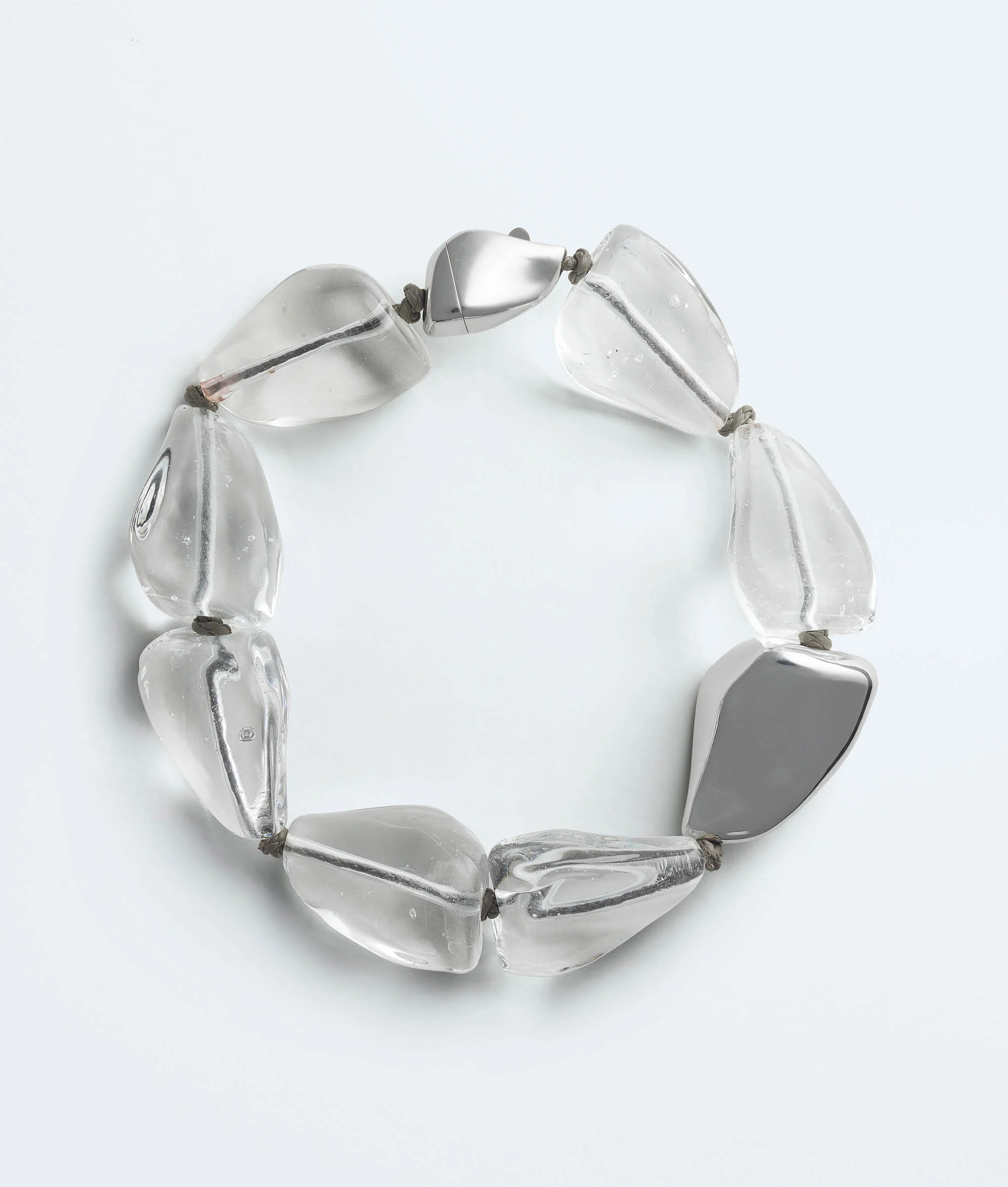 Bottega Veneta 创意总监 Louise Trotter 推出全新珠宝系列「Prisma」。该系列灵感源自穆拉诺玻璃工艺,采用内封色彩的吹制玻璃材质,并搭配与设计融为一体的定制按扣式搭扣,选用纯银与 18K 金镀层银质打造。系列涵盖耳环、手链及项链等多款单品,据悉该珠宝系列现已在 Bottega Veneta 门店及官方线上商店发售。