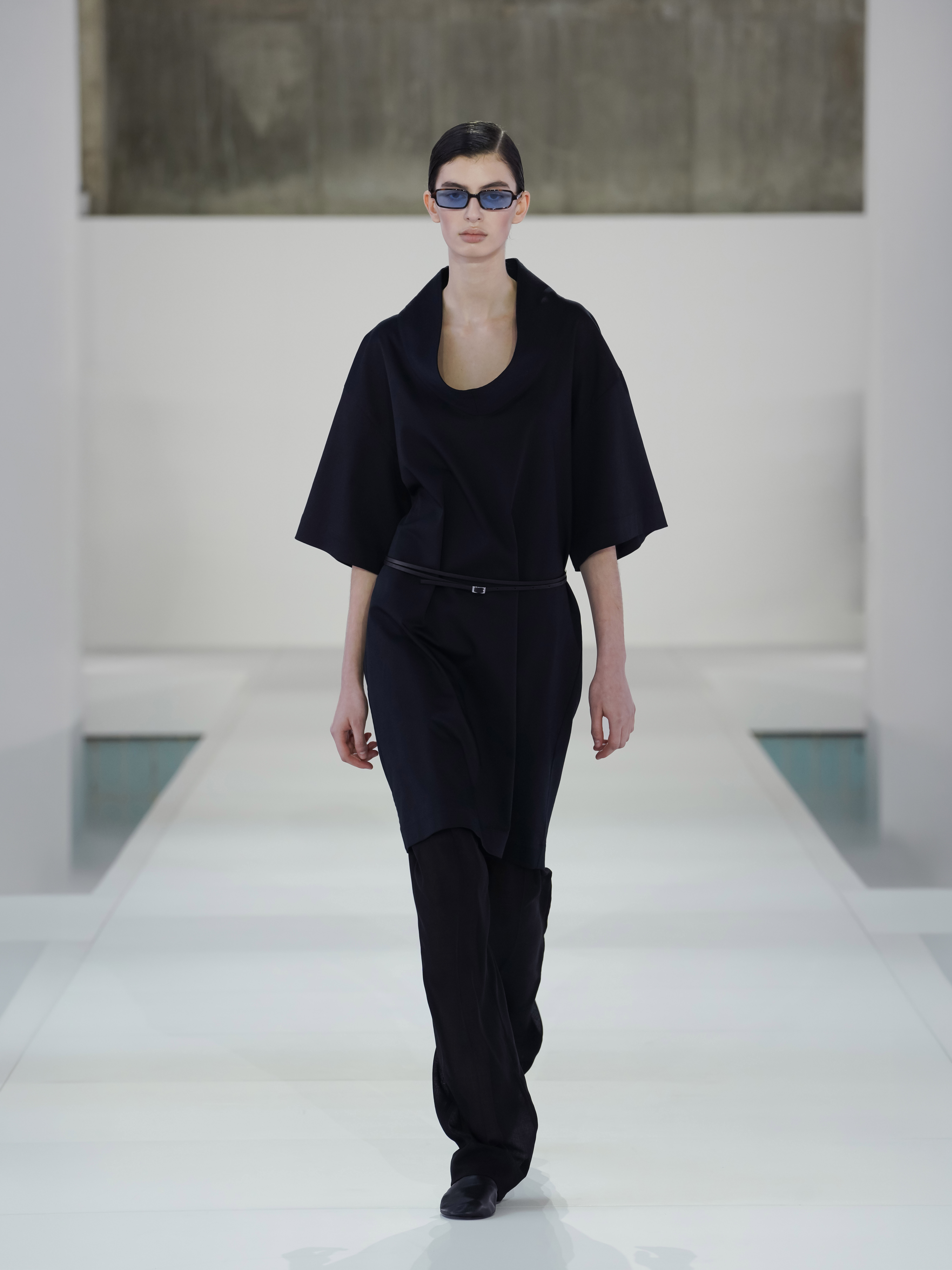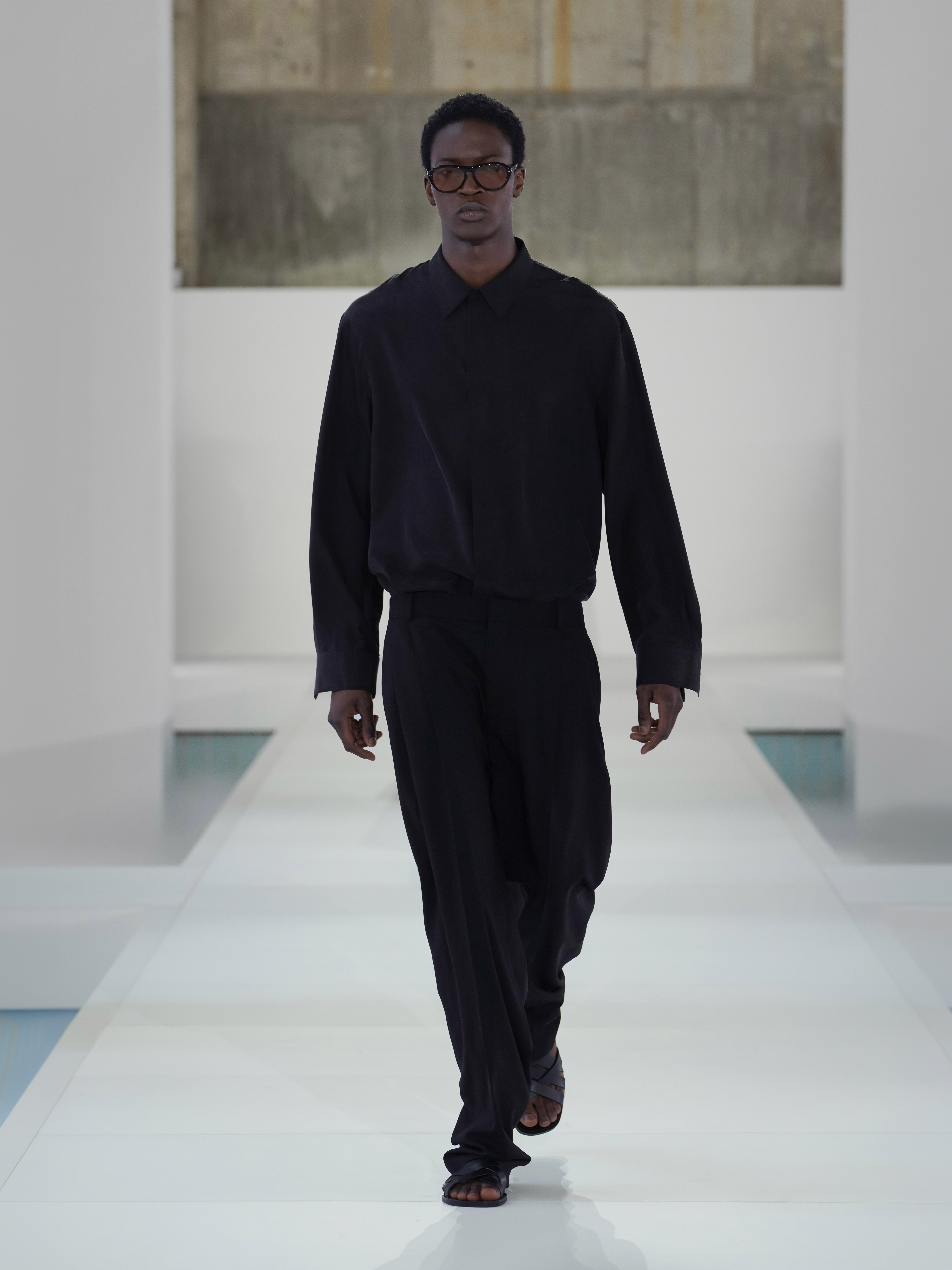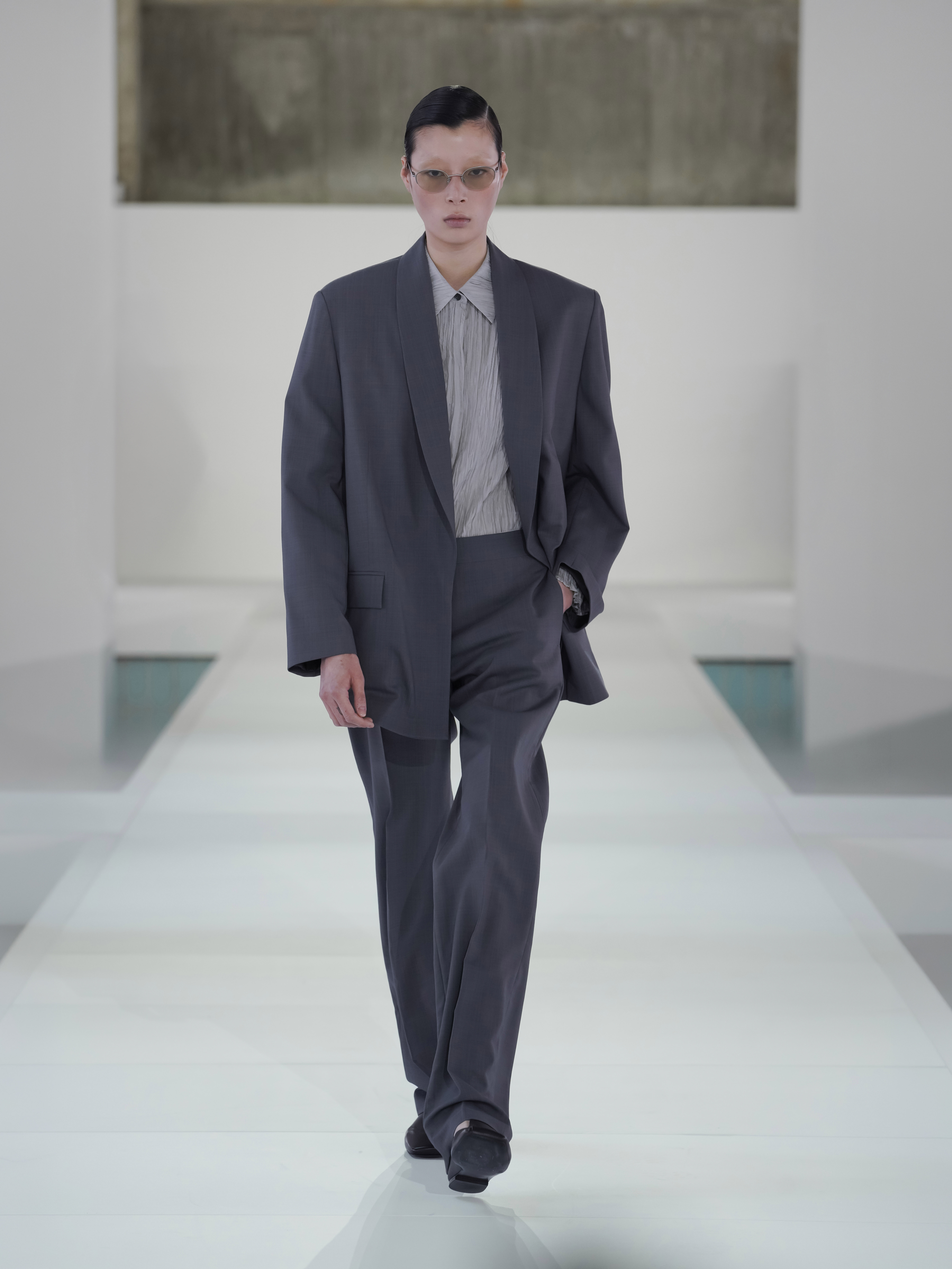 女装部分,以 90 年代极简风格为灵感,使廓形更加清晰,通过细腻的半透明罗纹针织柔化线条的硬度,体现于连衣裙和套装中;利落有力的肩部结构呼应 80 年代的力量感着装。品牌标志性剪裁以更具流动感的面料重新演绎,而以丝绸呈现的「视觉错视丹宁(trompe l’oeil denim)」则为套装造型带来新的表达方式。丝绸元素贯穿整个系列,在工坊中通过柔和褶裥处理,打造出露肩礼服造型,并延展至标志性衬衫设计,呈现出兼具精准与松弛感的风格。抓褶造型通过立体裁剪呈现柔和轮廓;过度型外套则从比例与雕塑感长度出发重新构思,在古典与现代、创新与艺术之间形成张力。整体搭配包括柔软皮革运动鞋、带有建筑感鞋跟的穆勒鞋,以及与服装材质呼应的包袋。