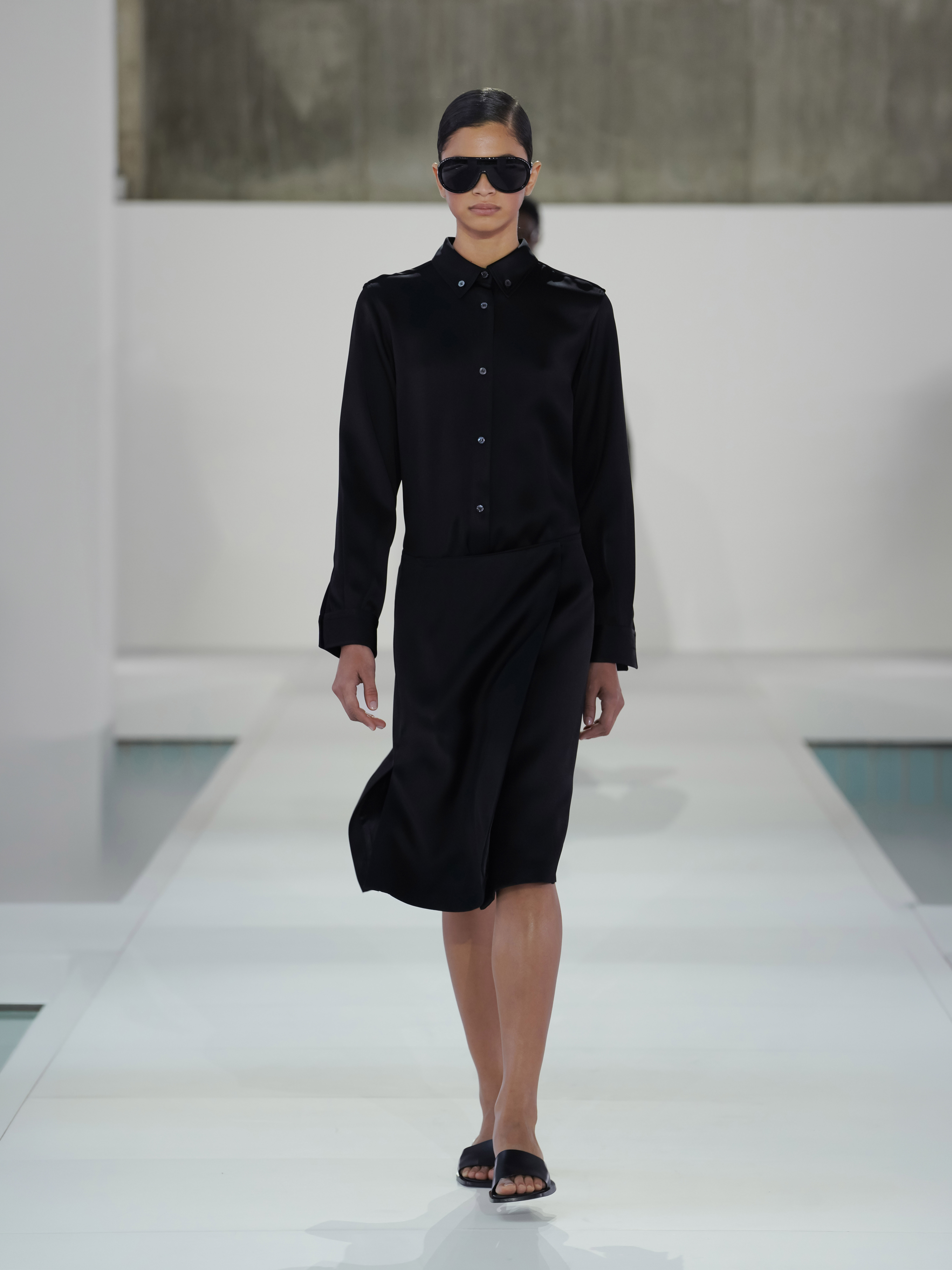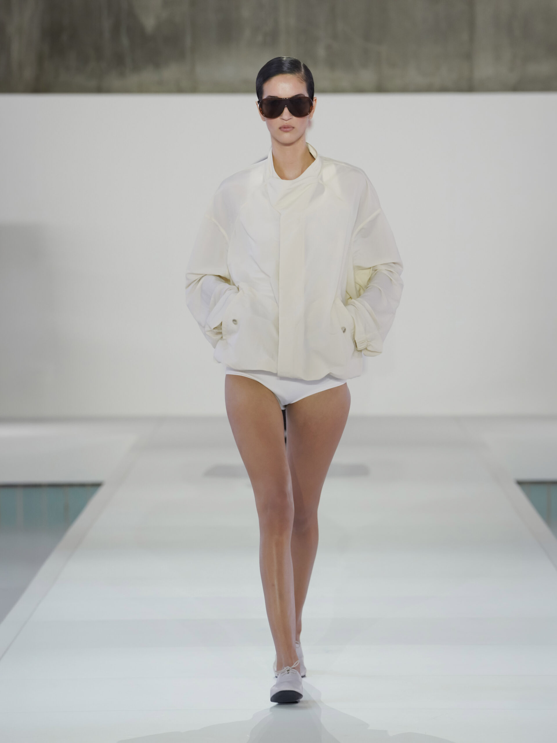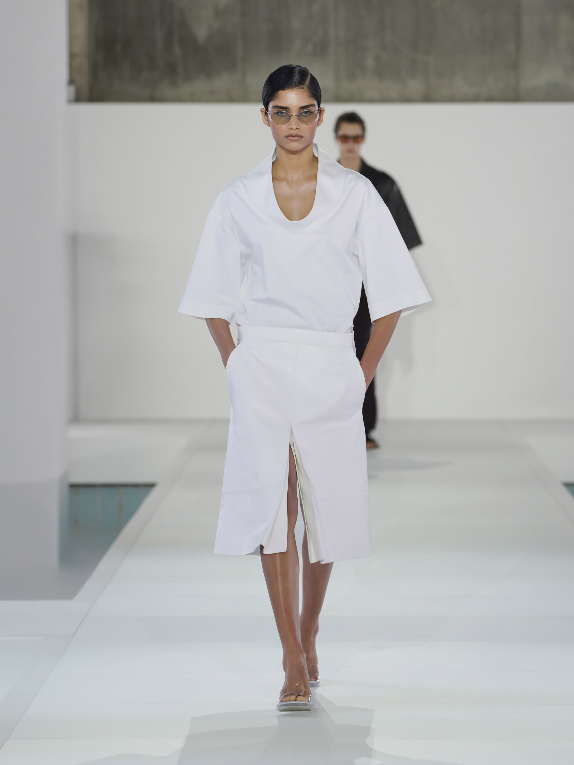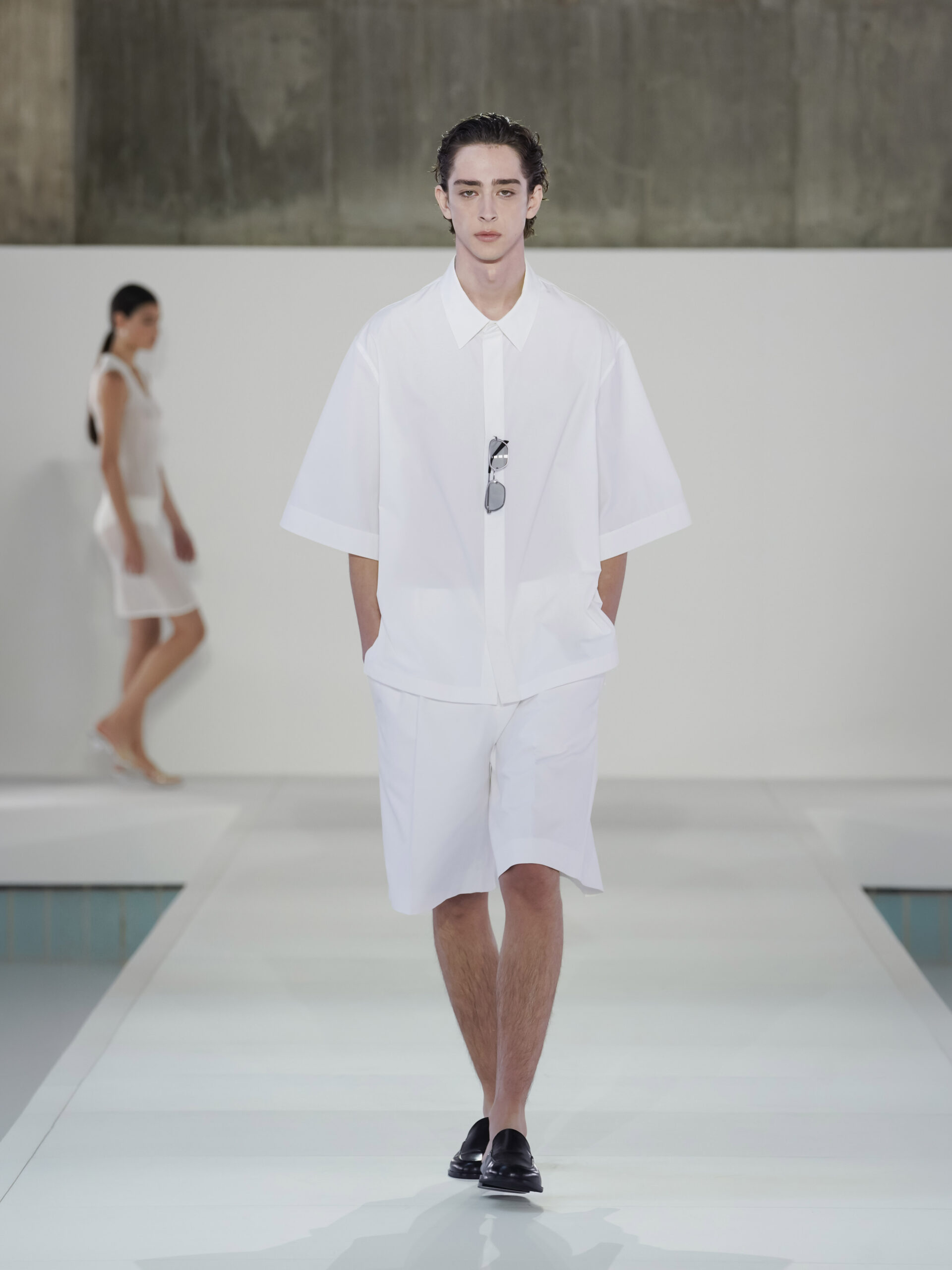 女装部分,以 90 年代极简风格为灵感,使廓形更加清晰,通过细腻的半透明罗纹针织柔化线条的硬度,体现于连衣裙和套装中;利落有力的肩部结构呼应 80 年代的力量感着装。品牌标志性剪裁以更具流动感的面料重新演绎,而以丝绸呈现的「视觉错视丹宁(trompe l’oeil denim)」则为套装造型带来新的表达方式。丝绸元素贯穿整个系列,在工坊中通过柔和褶裥处理,打造出露肩礼服造型,并延展至标志性衬衫设计,呈现出兼具精准与松弛感的风格。抓褶造型通过立体裁剪呈现柔和轮廓;过度型外套则从比例与雕塑感长度出发重新构思,在古典与现代、创新与艺术之间形成张力。整体搭配包括柔软皮革运动鞋、带有建筑感鞋跟的穆勒鞋,以及与服装材质呼应的包袋。