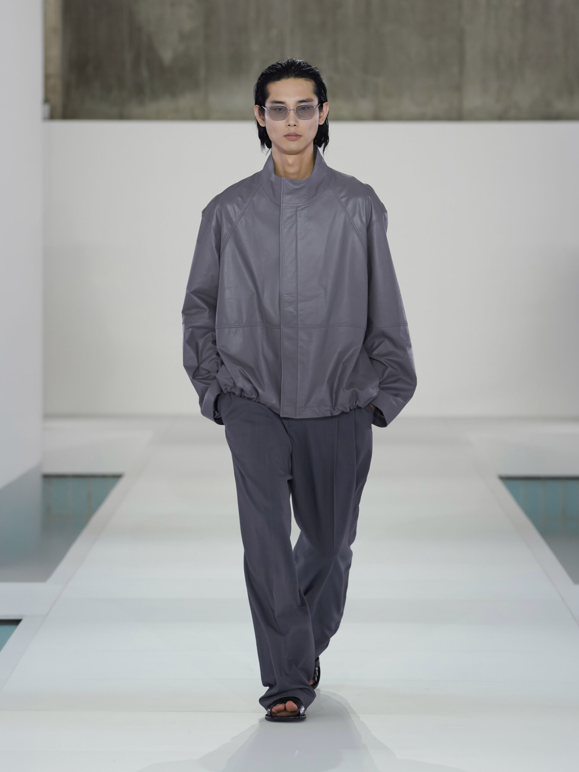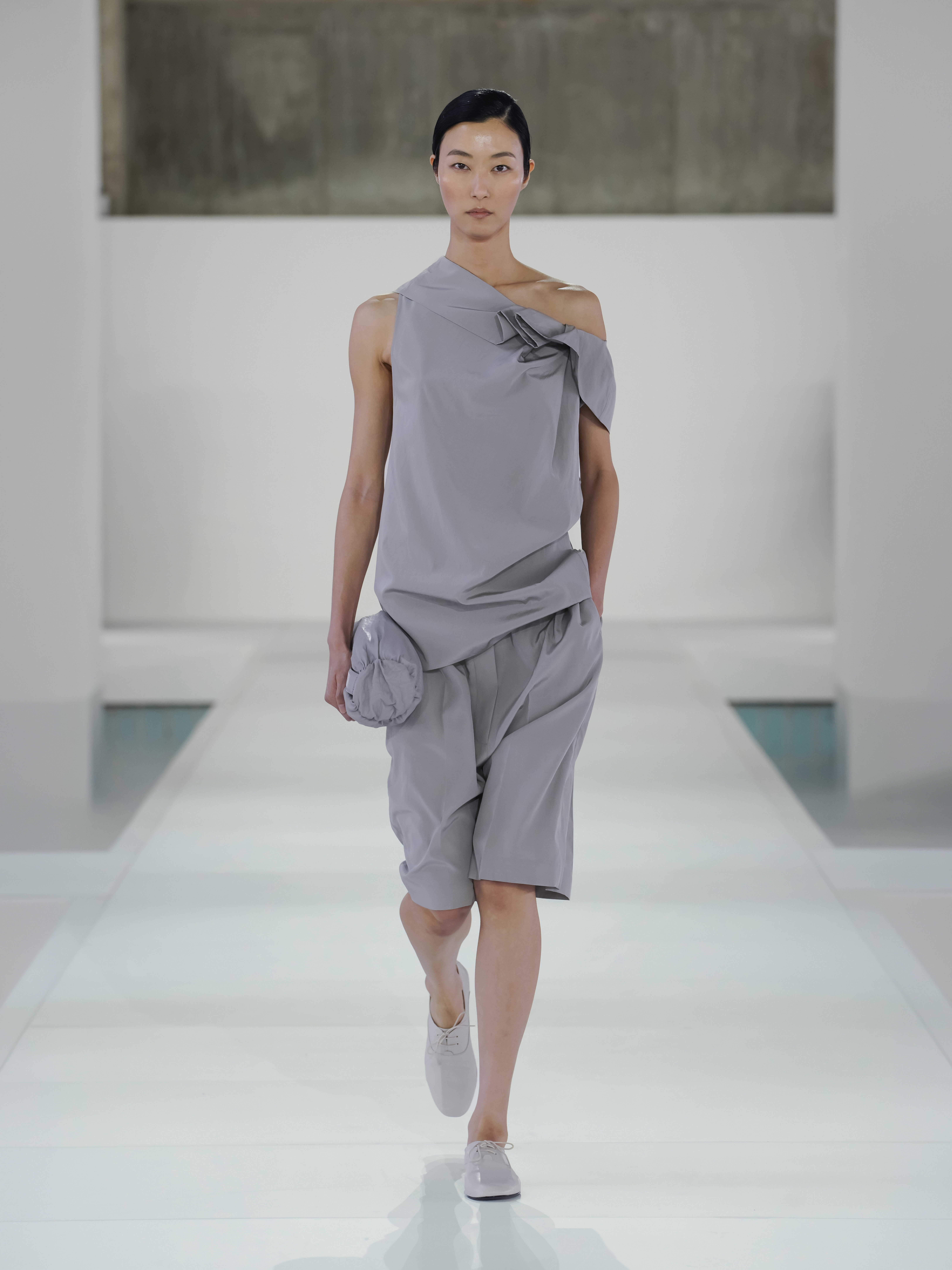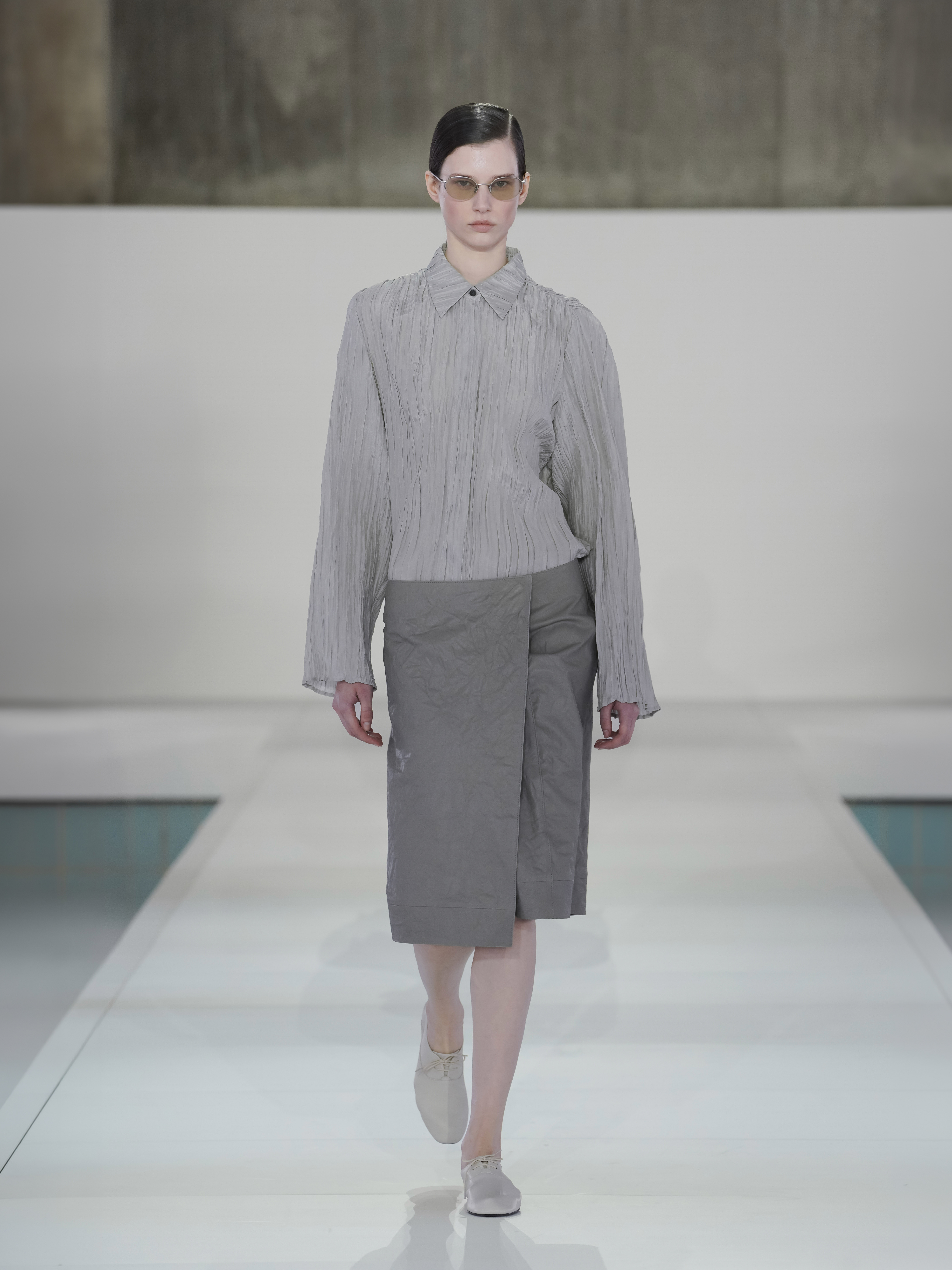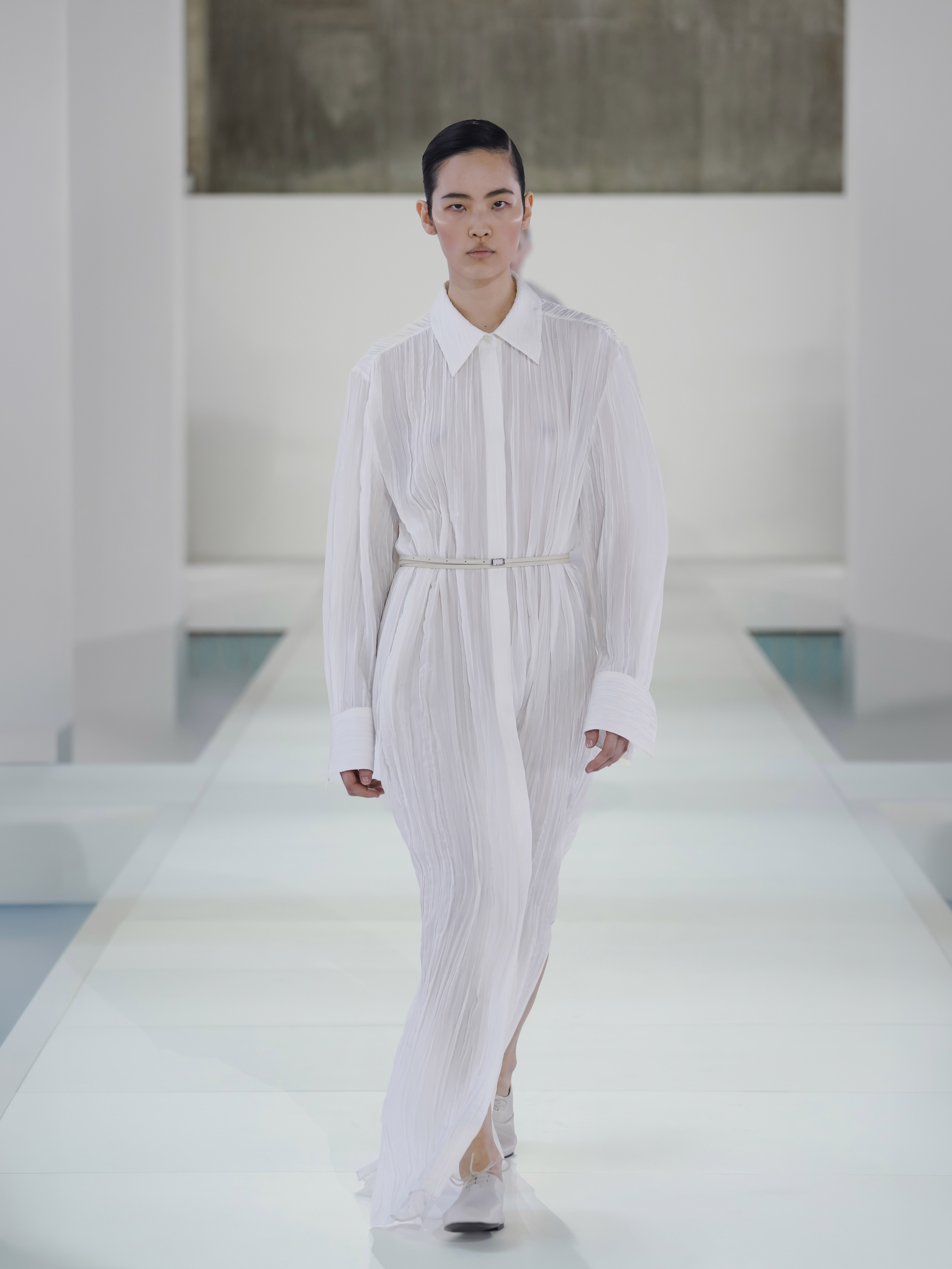 在材质探索上,本季进一步强化服装的结构感:皮革与功能性面料呈现细腻光泽,刻意营造的垂坠效果与雕塑感廓形;纸质感材料带来细微褶皱;混纺亚麻则增添纹理层次。秀场之上,轻盈通透的面料若隐若现地呈现身体动态,空气感十足的轻薄织物随步伐自然流动,共同营造出静谧而高级的氛围。