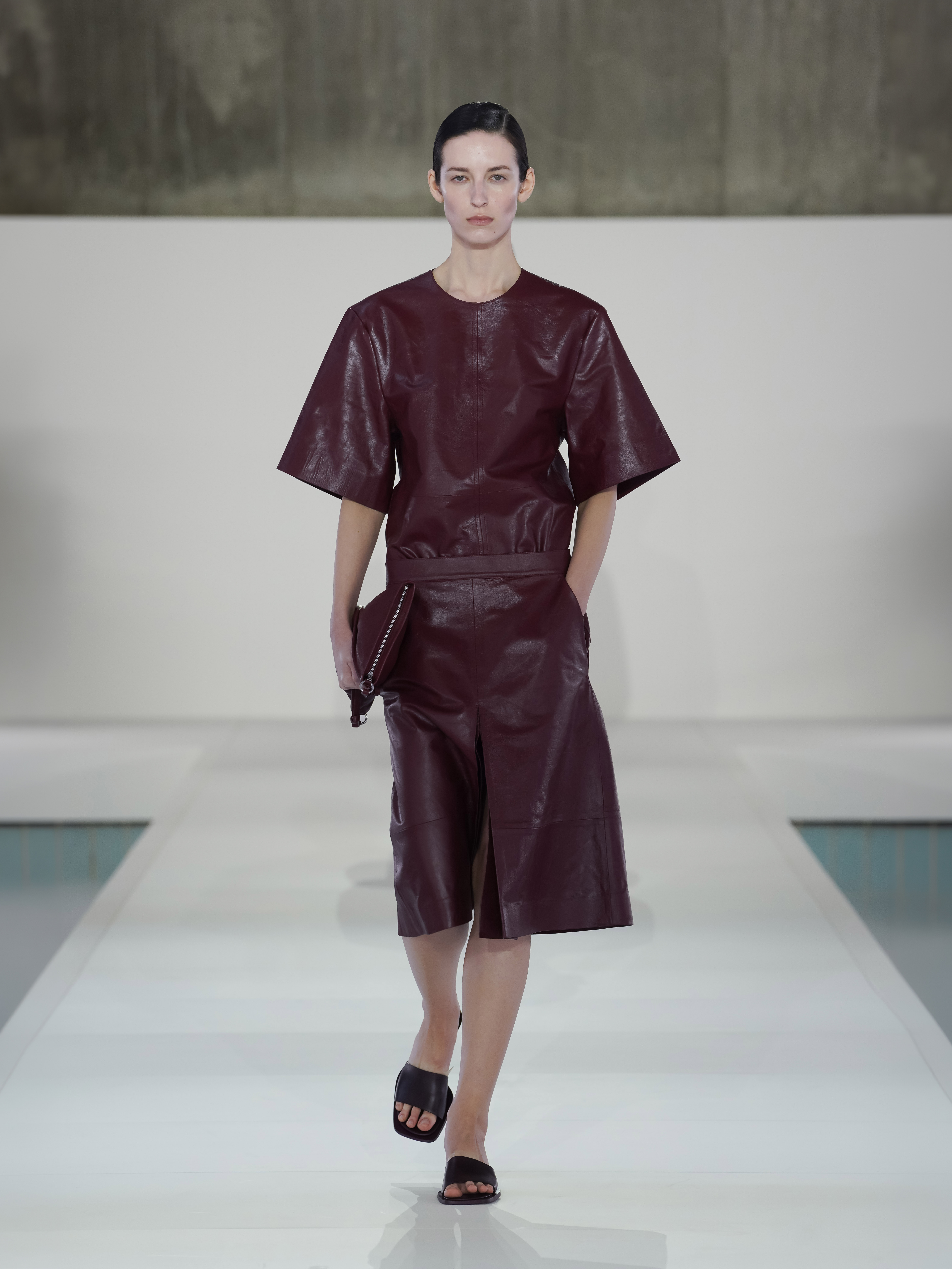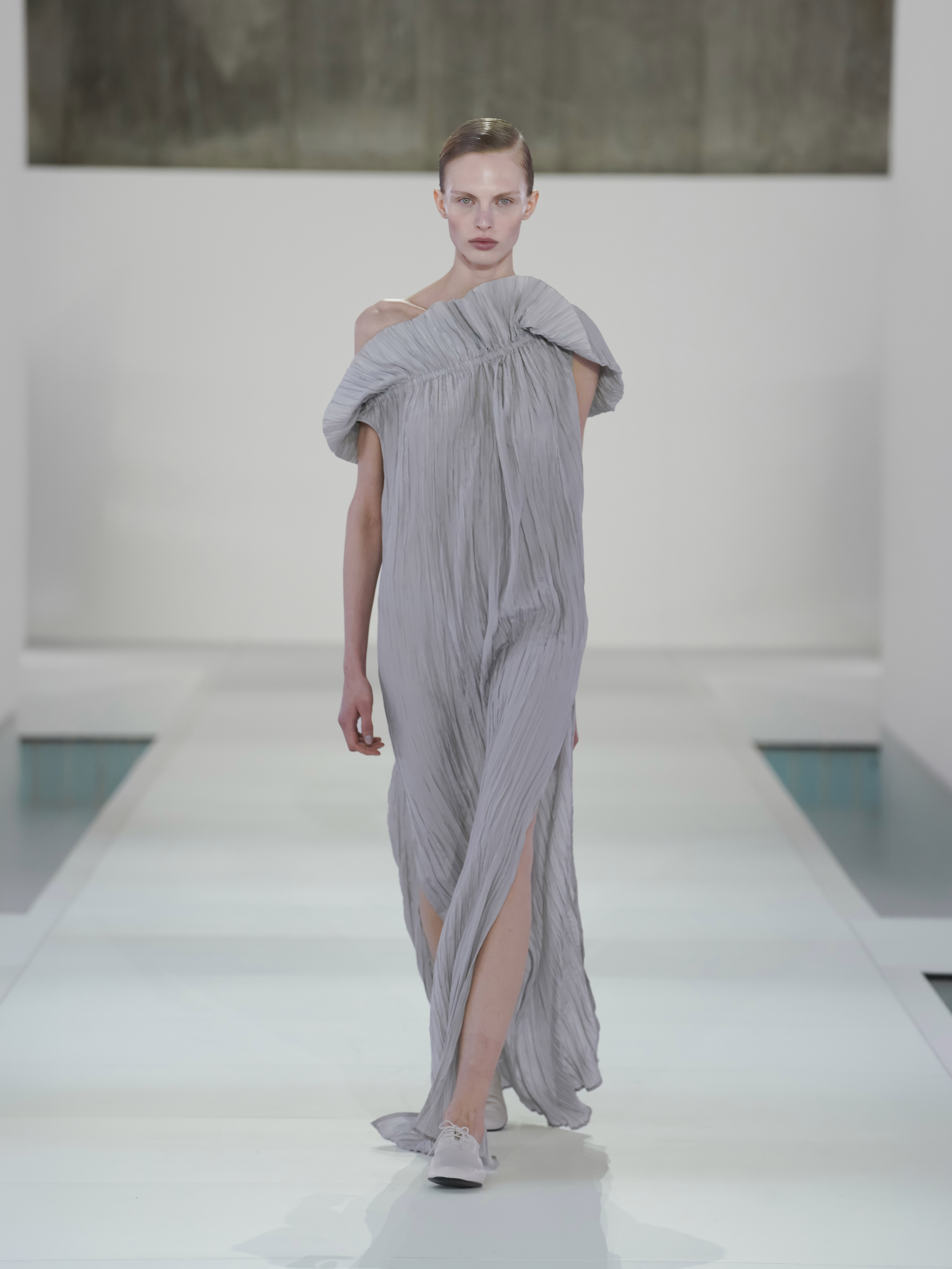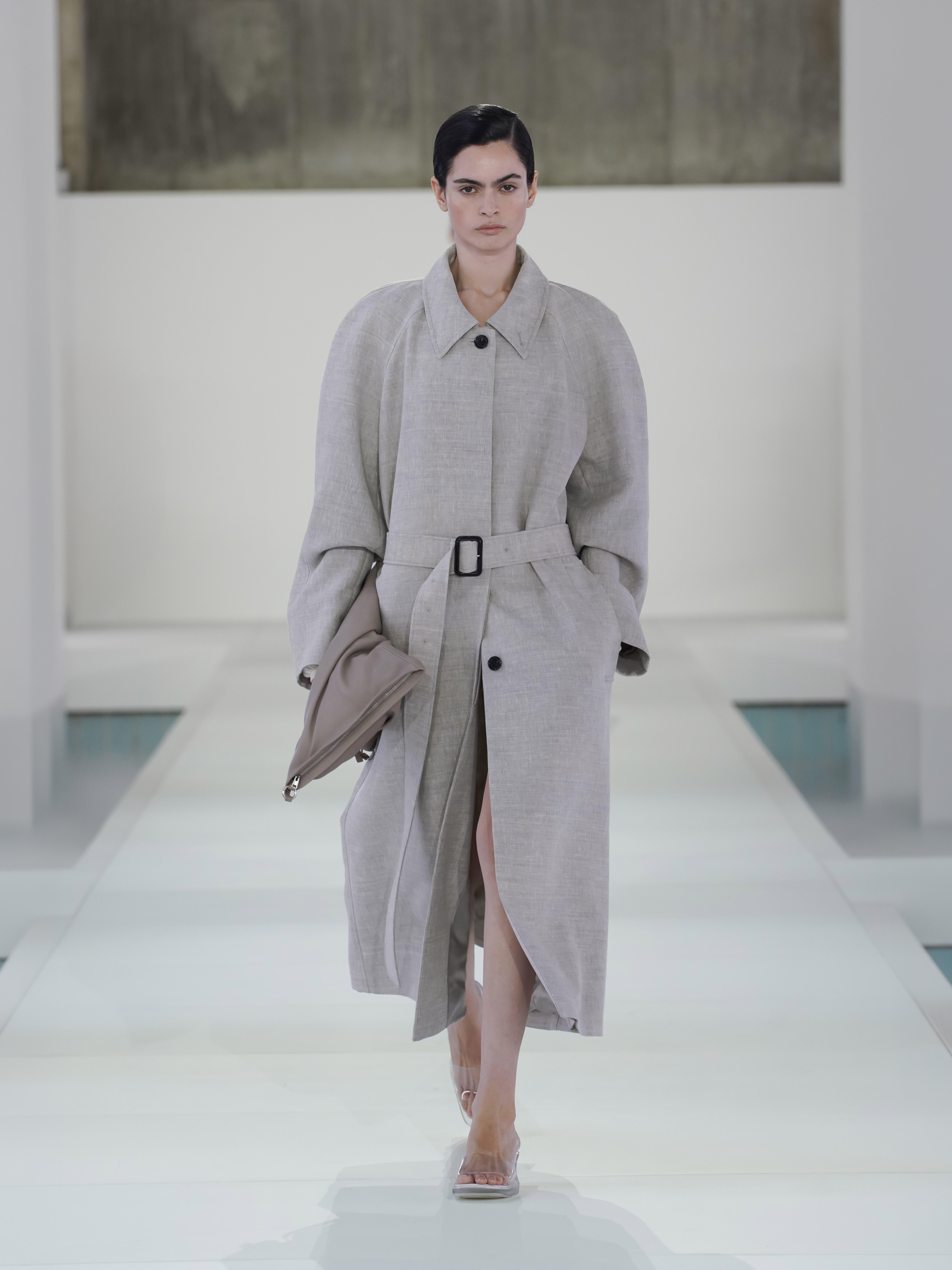在材质探索上,本季进一步强化服装的结构感:皮革与功能性面料呈现细腻光泽,刻意营造的垂坠效果与雕塑感廓形;纸质感材料带来细微褶皱;混纺亚麻则增添纹理层次。秀场之上,轻盈通透的面料若隐若现地呈现身体动态,空气感十足的轻薄织物随步伐自然流动,共同营造出静谧而高级的氛围。
