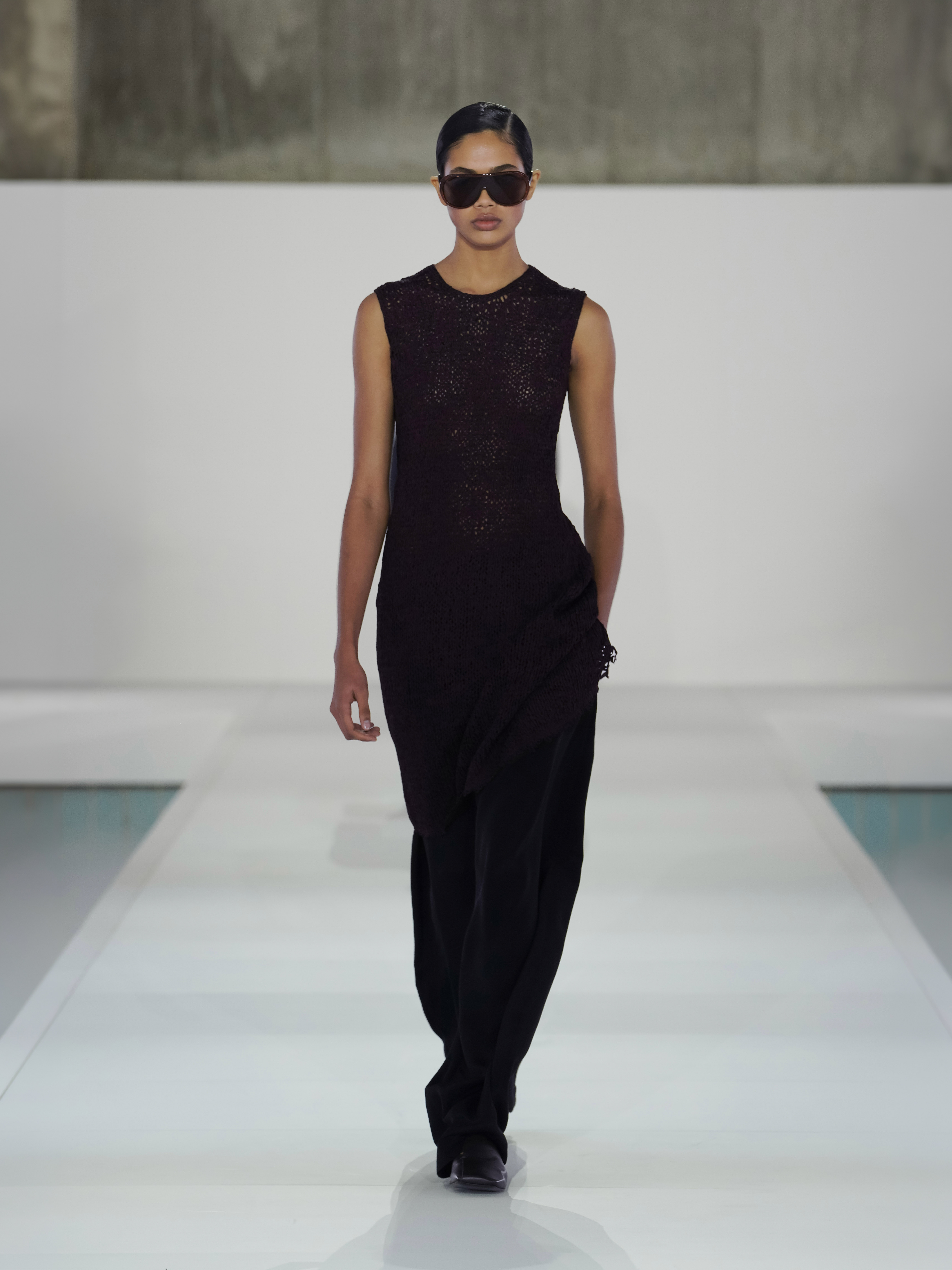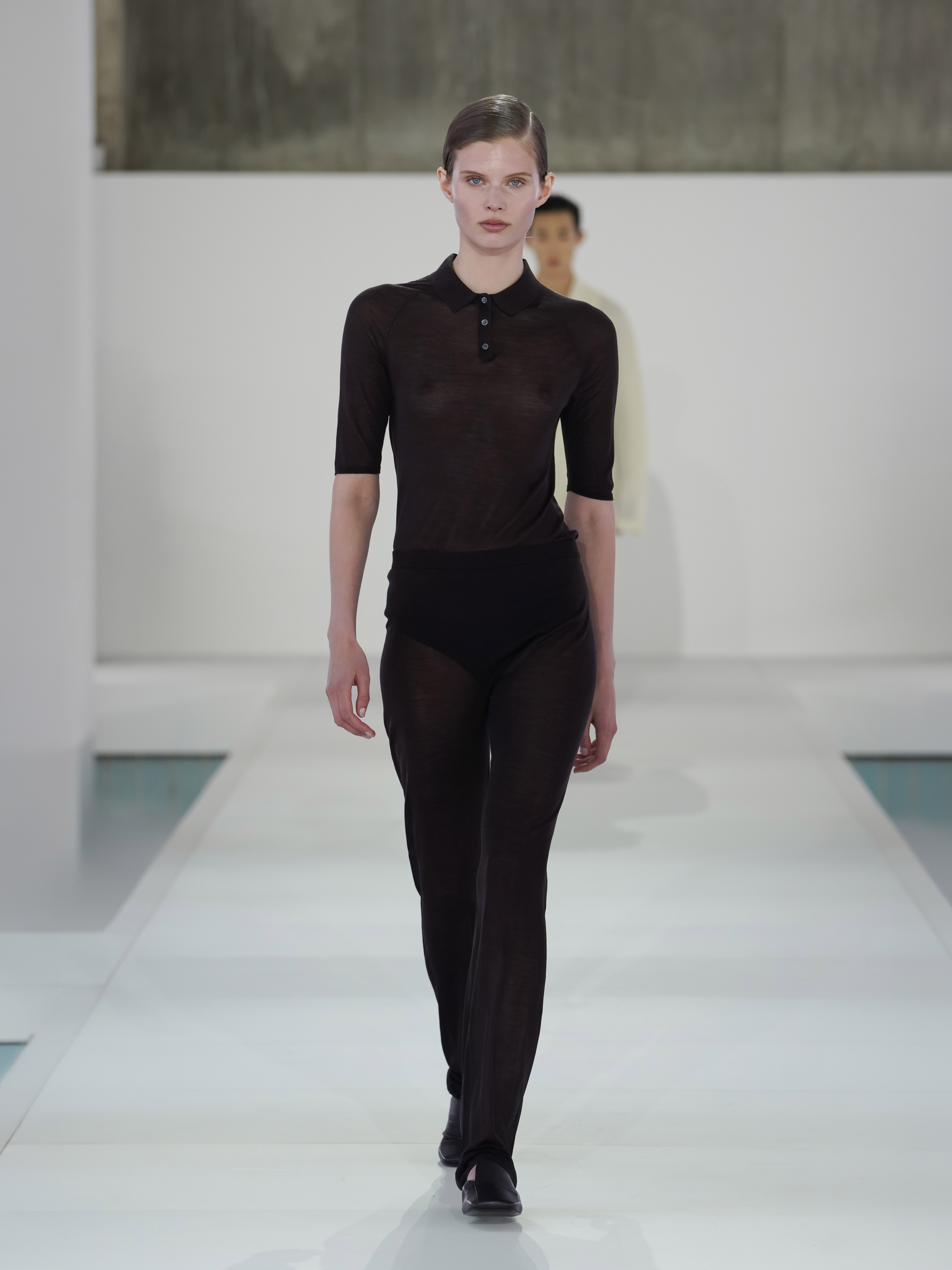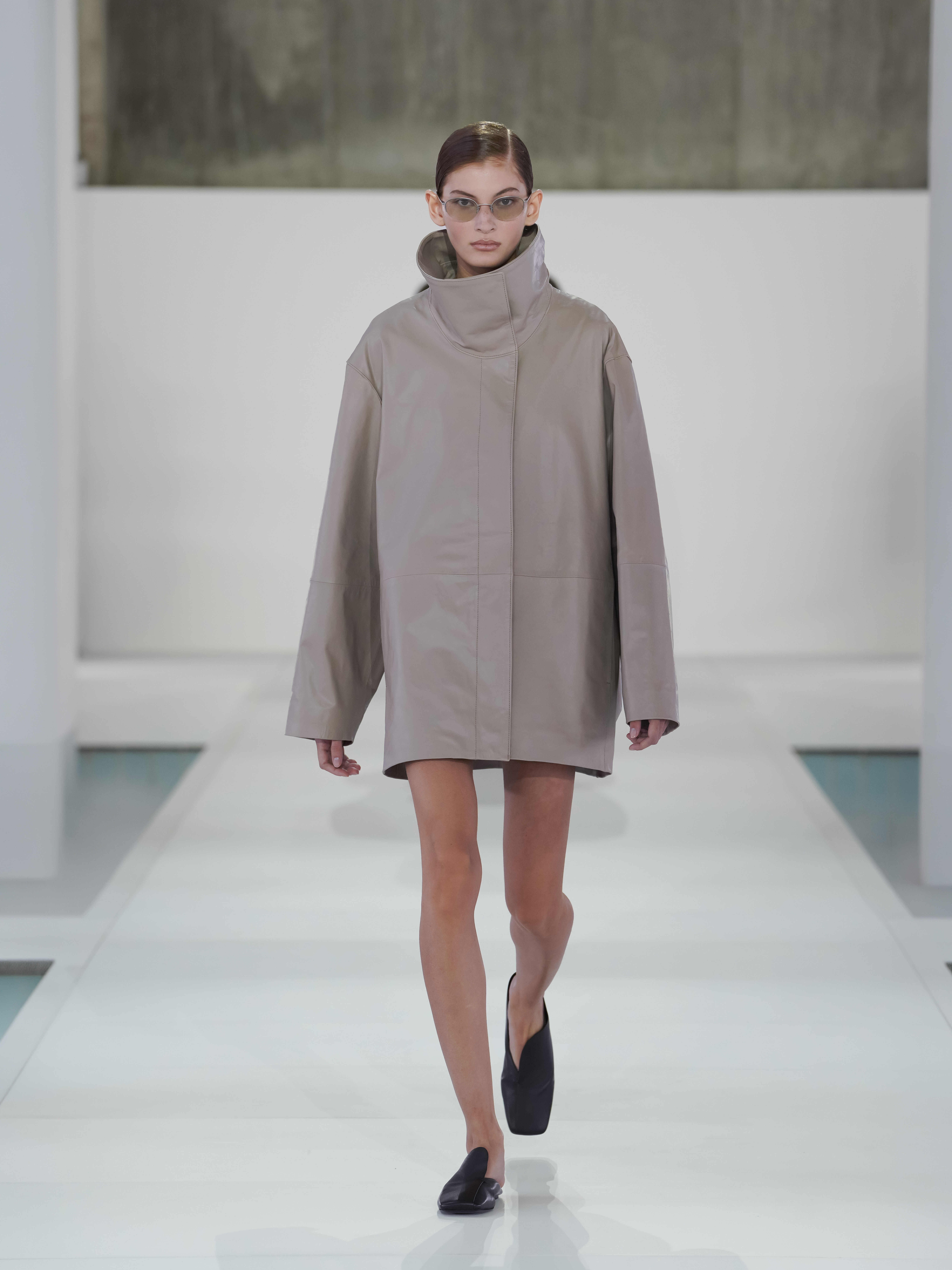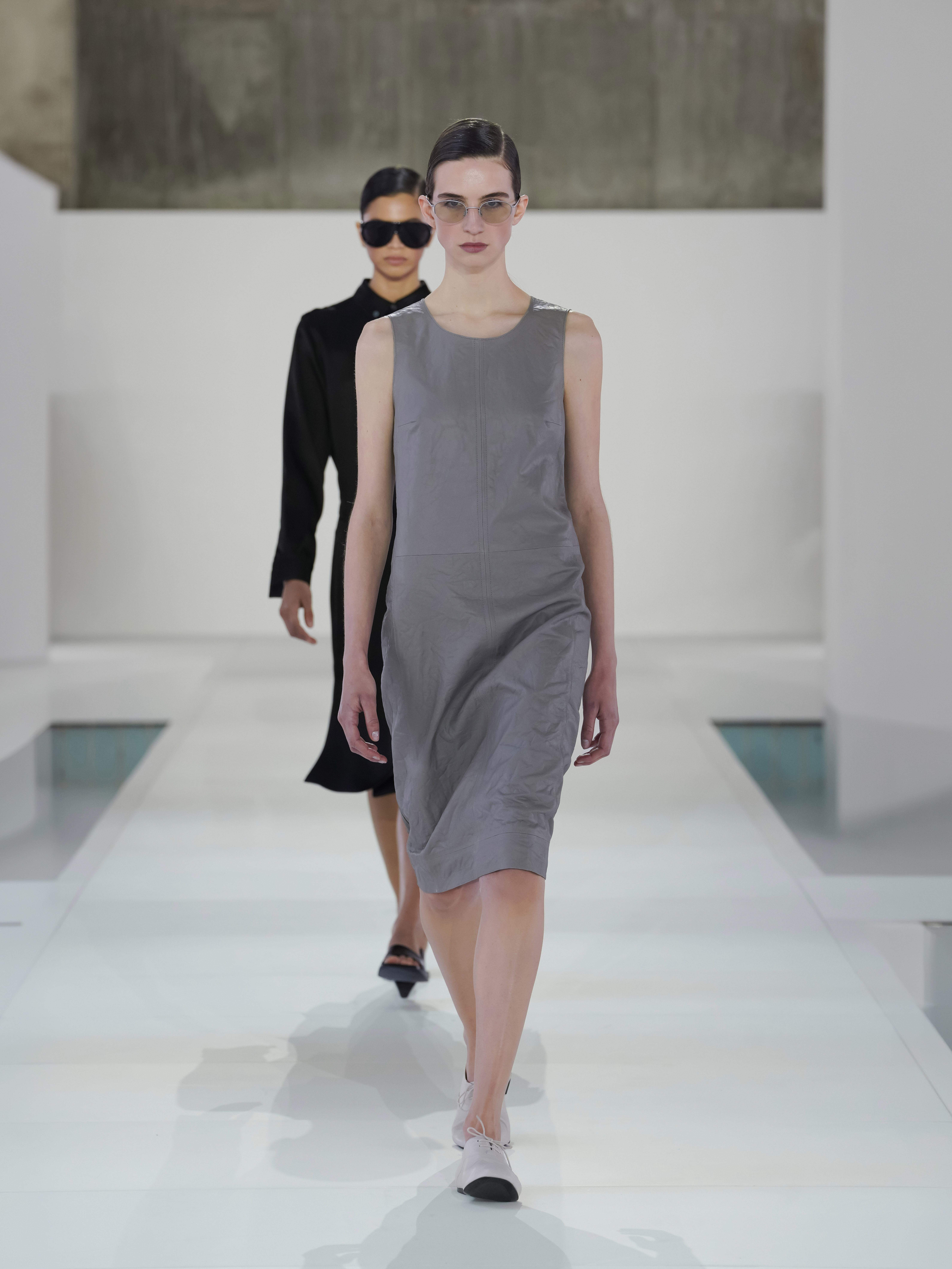 在材质探索上,本季进一步强化服装的结构感:皮革与功能性面料呈现细腻光泽,刻意营造的垂坠效果与雕塑感廓形;纸质感材料带来细微褶皱;混纺亚麻则增添纹理层次。秀场之上,轻盈通透的面料若隐若现地呈现身体动态,空气感十足的轻薄织物随步伐自然流动,共同营造出静谧而高级的氛围。
