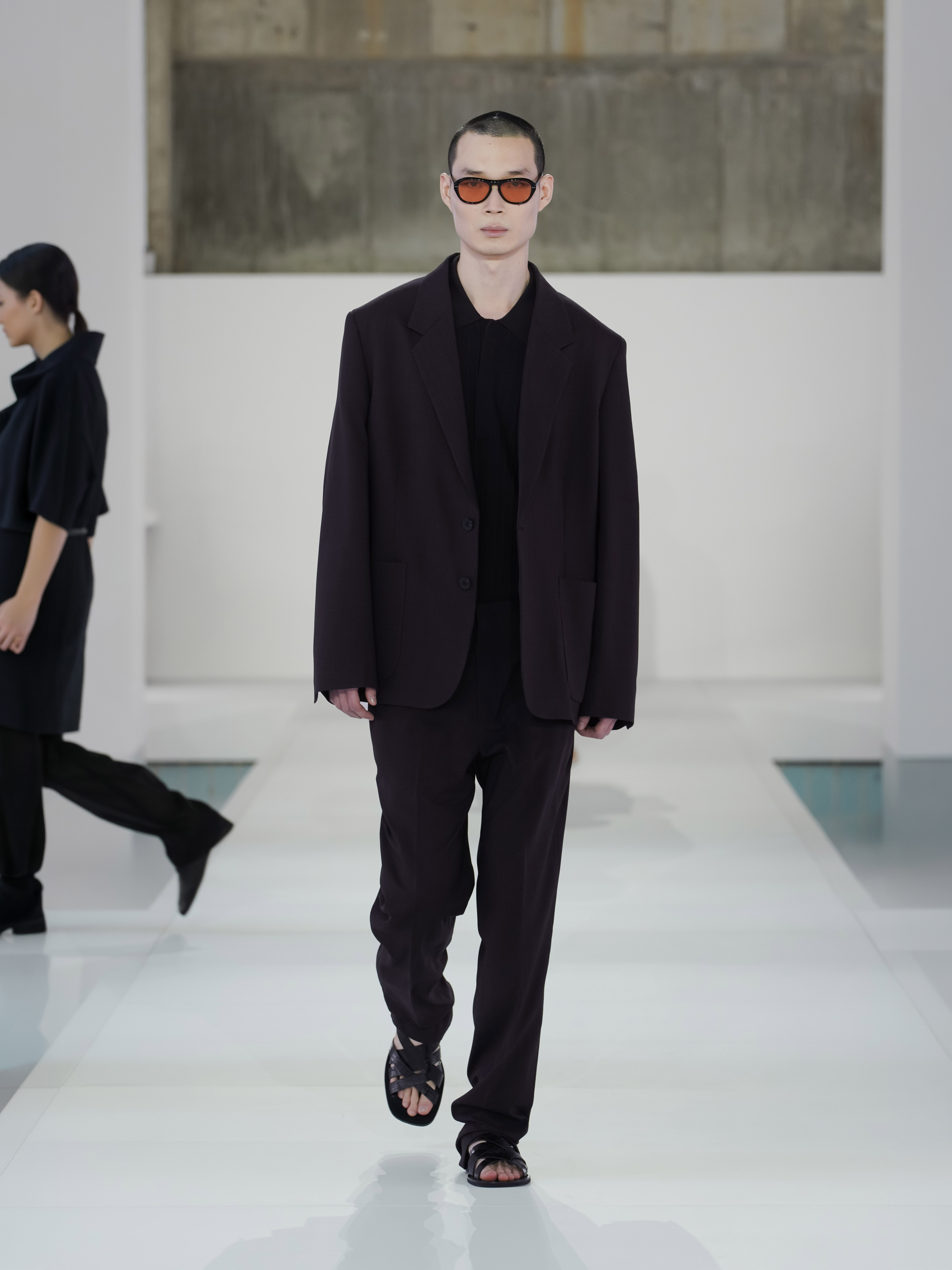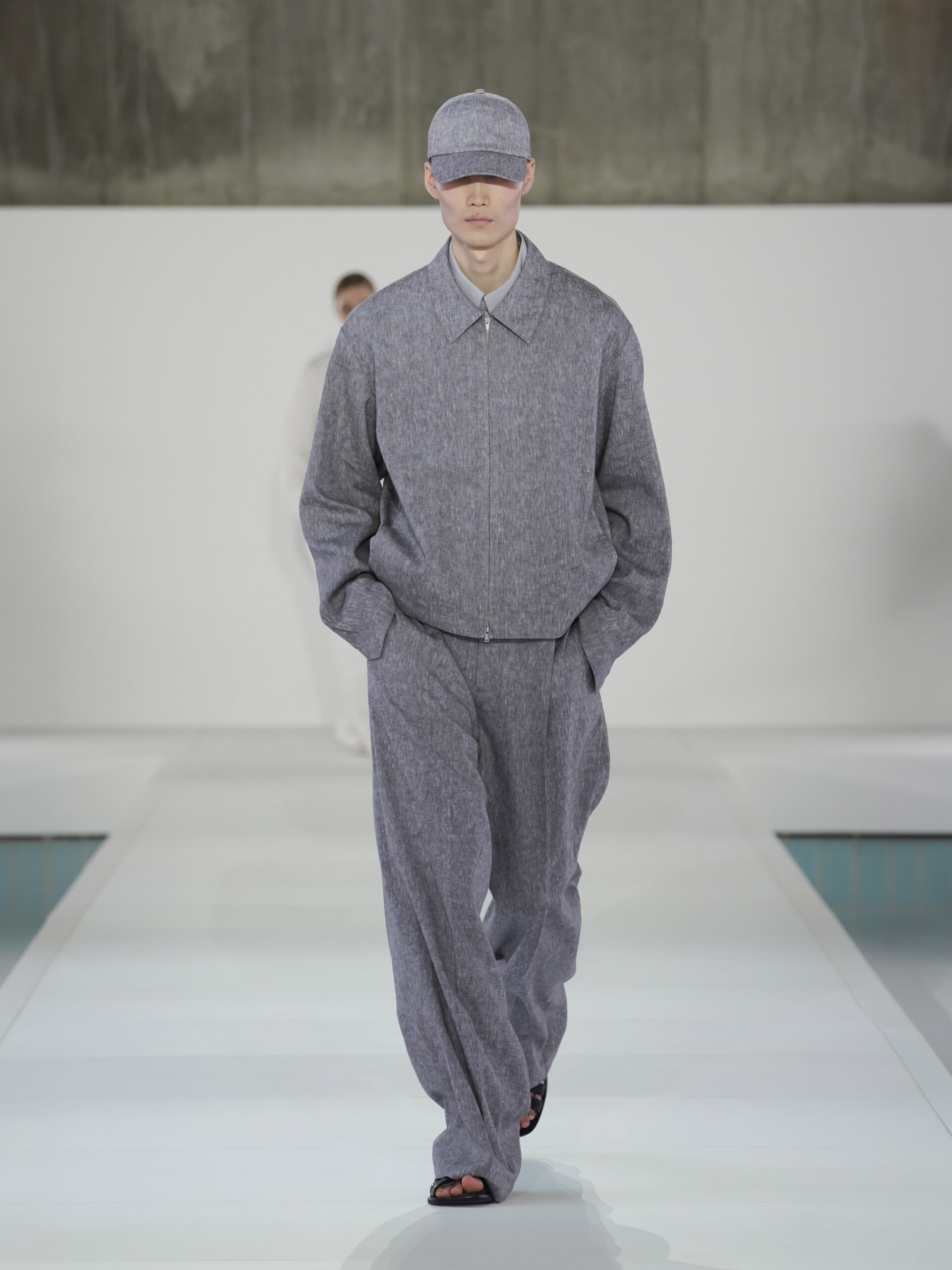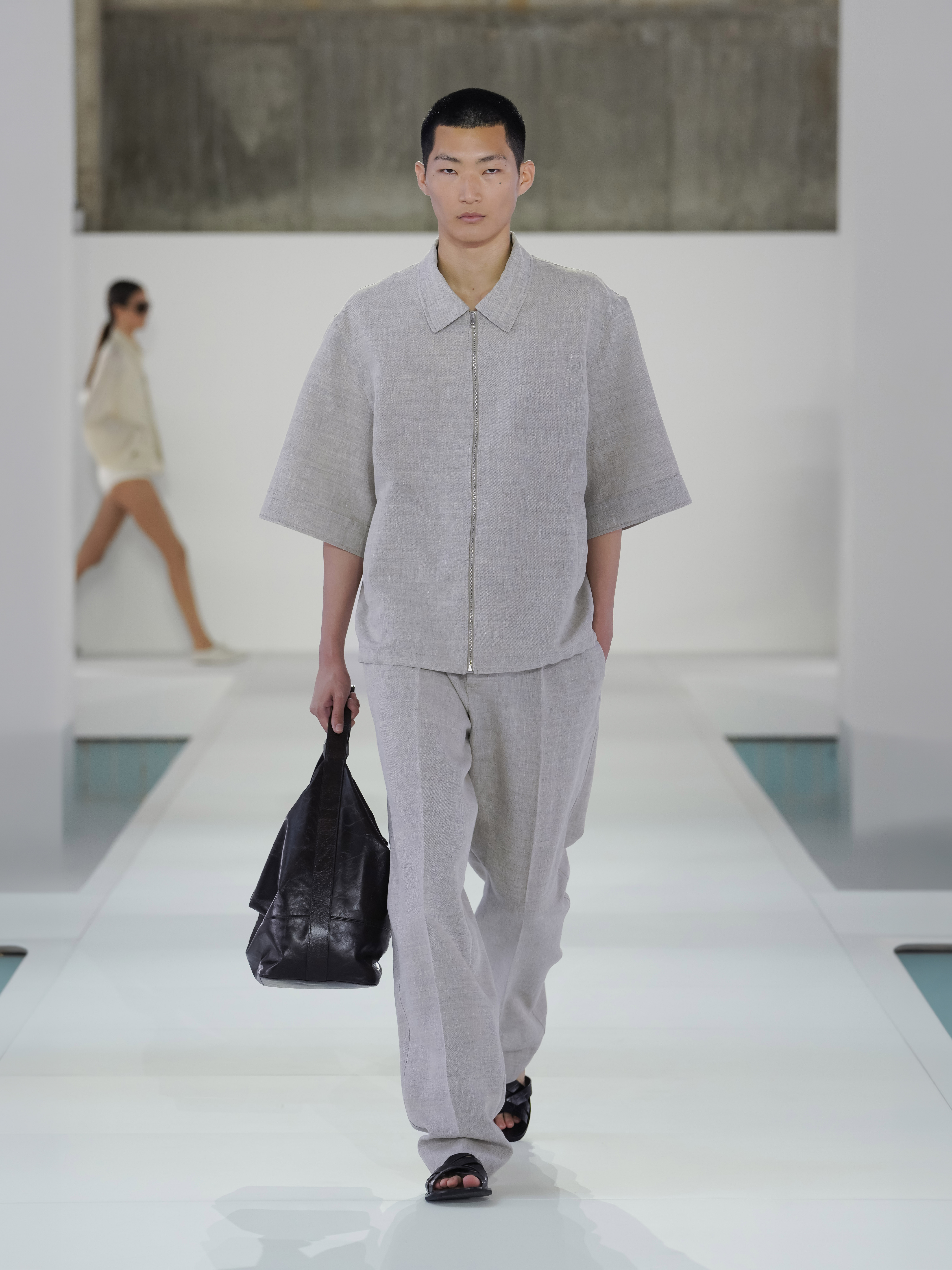 男装部分则从日常穿搭出发进行重新梳理。过渡型外套系列旨在唤起现代传承感,而修身廓形的松弛感剪裁则在方寸间尽显精湛的构筑工艺。设计中融入简化的功能性细节,低调呼应实用主义;受 80 年代造型的同色系搭配启发,为当下通勤着装提供了新的思路。麂皮材质为造型增添低调质感,配饰以皮革凉鞋和基础款运动鞋收尾,在经典款式中融入细腻的现代气息。