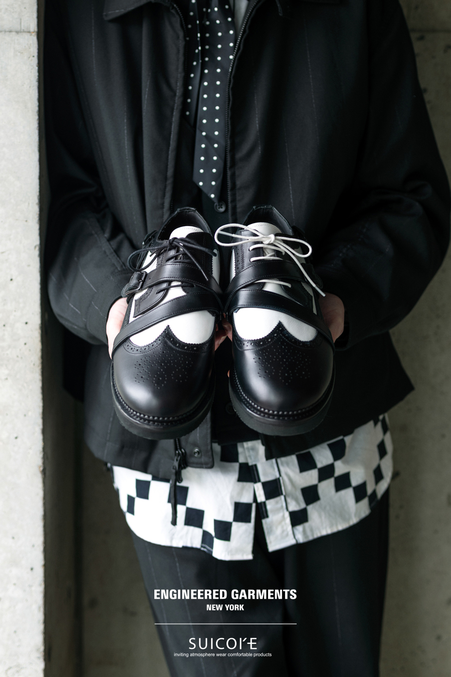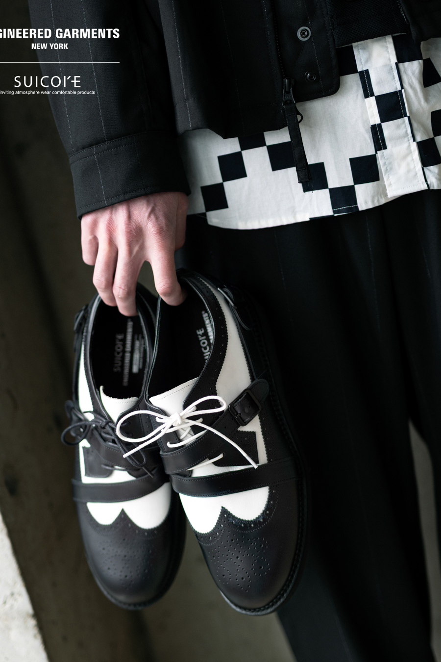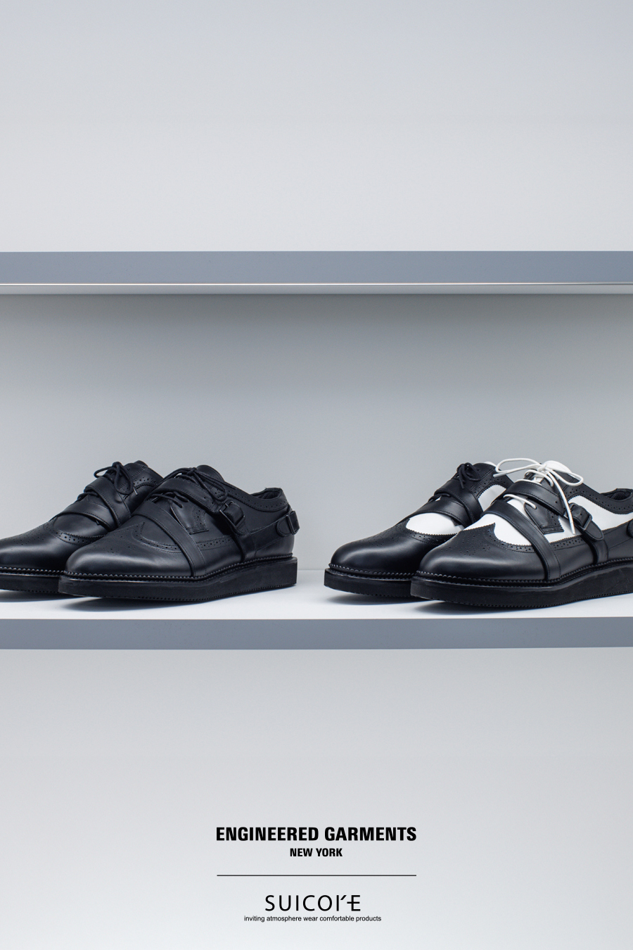 ENGINEERED GARMENTS 日前携手 SUICOKE 推出了一款全新合作鞋款——「STRAP WINGTIP SHOES」。这一次,双方以 ENGINEERED GARMENTS 的系列主题为灵感,设计了纯黑色和黑白配色两款鞋。鞋身采用皮革面料制成,翼尖和绑带细节赋予了整体优雅气质。鞋底采用轻盈的 EVA 材质,兼具出色的耐磨性和缓震性。这款鞋的鞋型饱满,可轻松驾驭各种场合,从正式到休闲风格皆宜。据悉,该款 SUICOKE x ENGINEERED GARMENTS 联名鞋已于 NEPENTHES 门店及线上发售,感兴趣的朋友不妨前往了解详情。