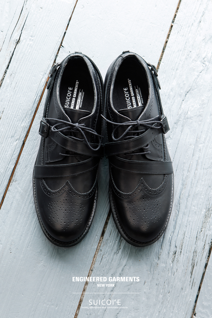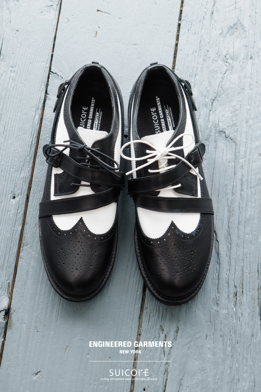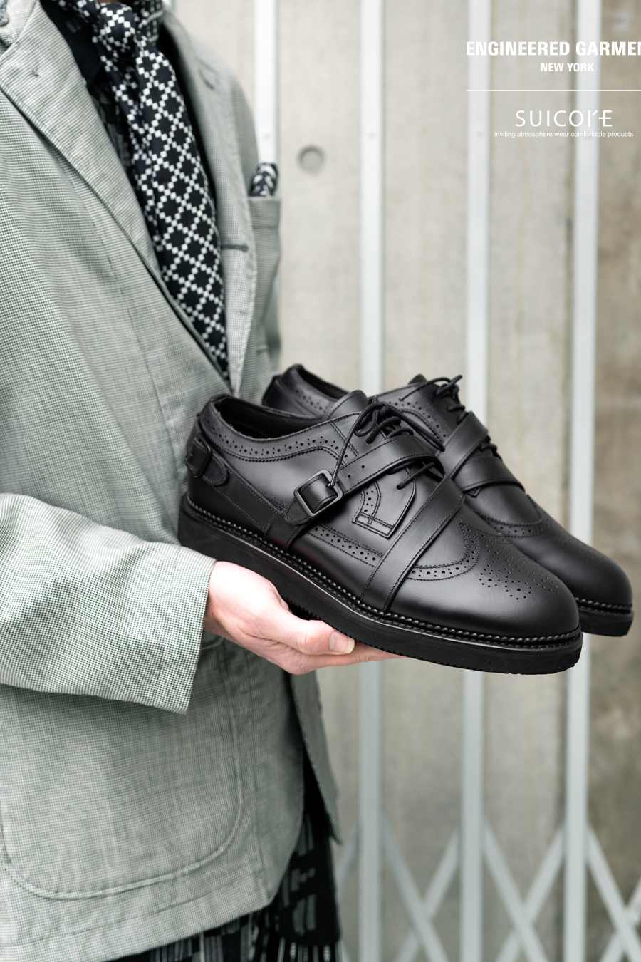 ENGINEERED GARMENTS 日前携手 SUICOKE 推出了一款全新合作鞋款——「STRAP WINGTIP SHOES」。这一次,双方以 ENGINEERED GARMENTS 的系列主题为灵感,设计了纯黑色和黑白配色两款鞋。鞋身采用皮革面料制成,翼尖和绑带细节赋予了整体优雅气质。鞋底采用轻盈的 EVA 材质,兼具出色的耐磨性和缓震性。这款鞋的鞋型饱满,可轻松驾驭各种场合,从正式到休闲风格皆宜。据悉,该款 SUICOKE x ENGINEERED GARMENTS 联名鞋已于 NEPENTHES 门店及线上发售,感兴趣的朋友不妨前往了解详情。