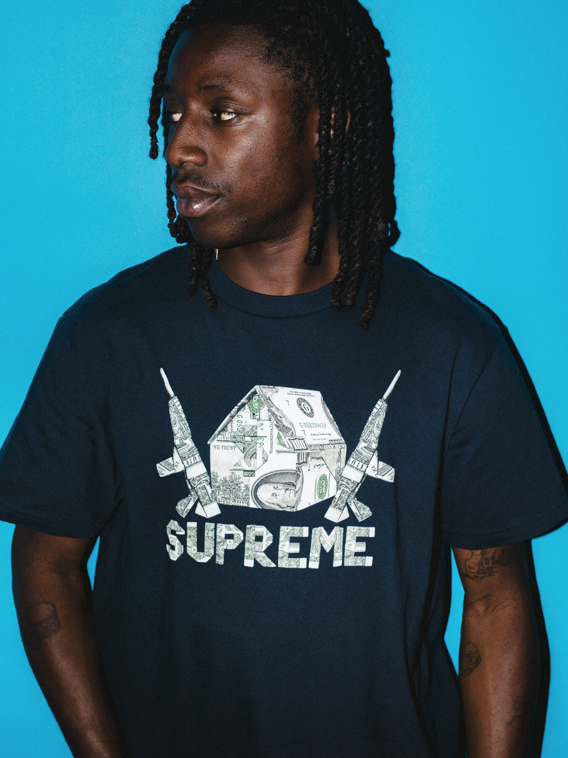 本次共推出六款设计,包含 Art Dealer 极具辨识度的《Origami》与《Grim Reaper》原创绘图,Lee Friedlander 镜头下歌后 Aretha Franklin 的经典瞬间。与此同时,系列还注入了 Marc Hundley 的文字艺术、英国艺术家 Jamie Reid 的反叛视觉等。