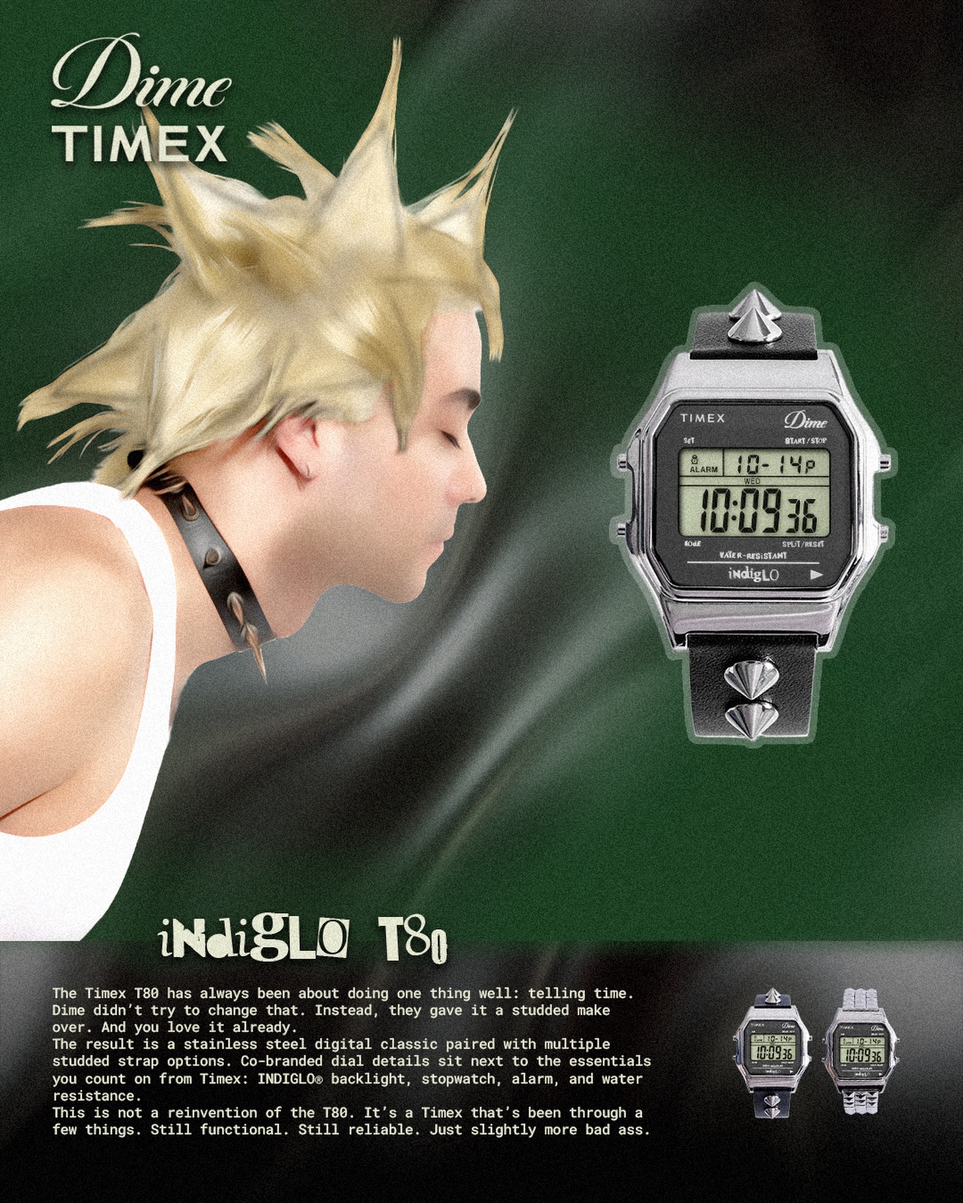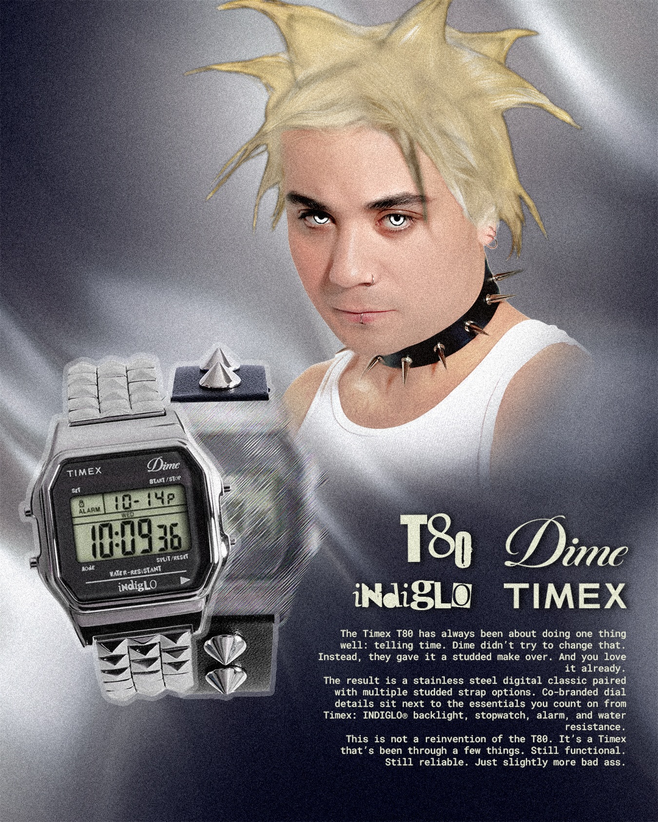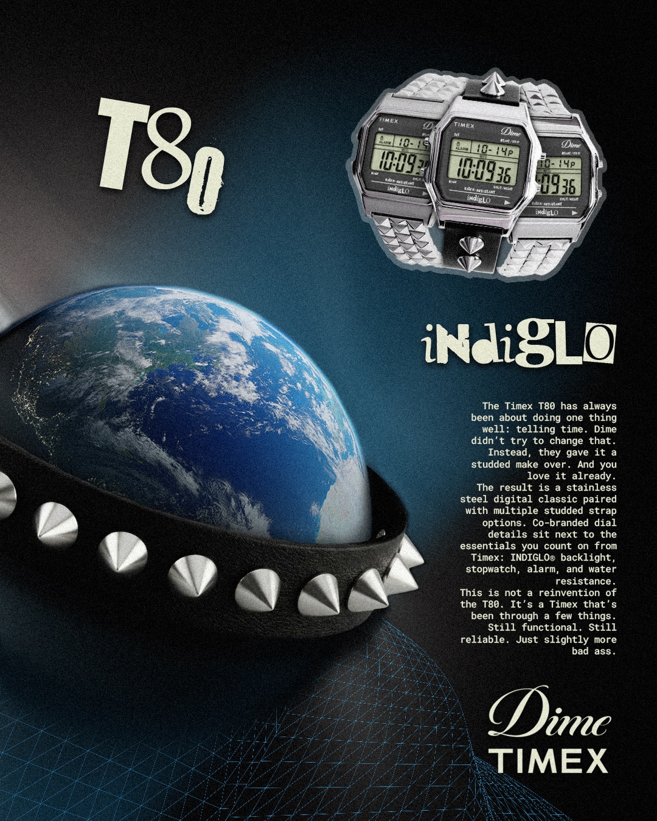 Dime 携手 TIMEX 推出全新联名 T80 数字腕表。此次合作以经典 T80 表款为蓝本,通过加入银色铆钉元素,对原有设计进行朋克风格重构,在保留复古数码表基因的同时,带来更具街头属性的视觉表达。