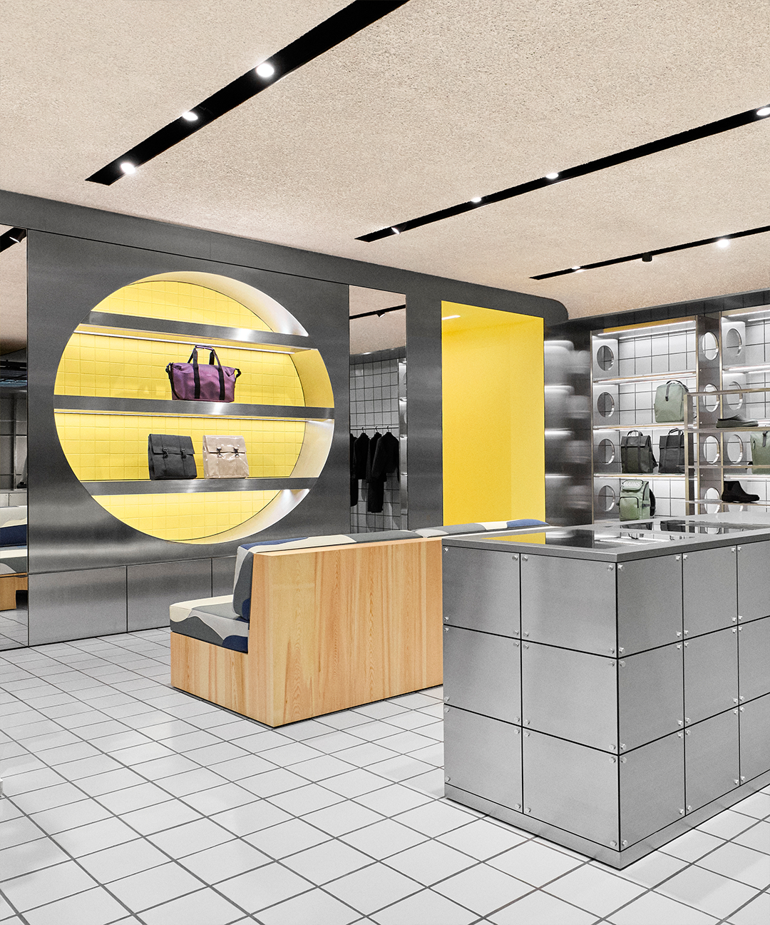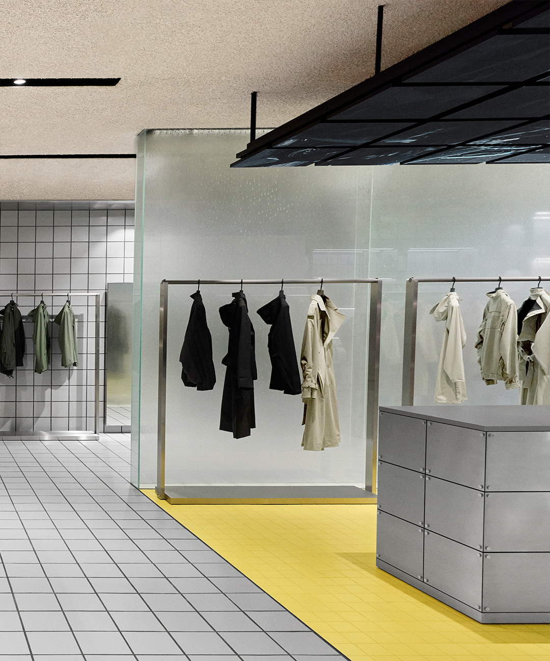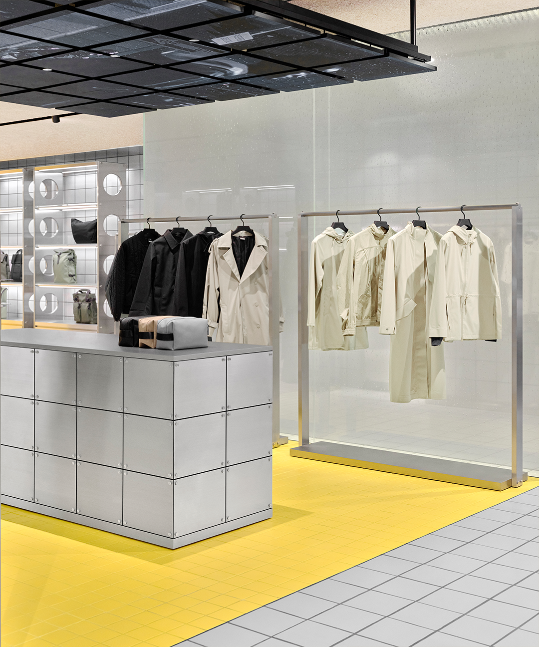 门店位于上海兴业太古汇二层,对 Rains 零售概念进行了更为深入的诠释。这间 250 平方米的空间围绕一个强烈的中心元素展开:一面雾面水滴玻璃围合结构,创造出「屋中屋」的效果,既划分了空间,又保持了通透感与视觉连续性。不同材质的碰撞在空间中扮演着关键角色。外立面采用了与 Rains 阿姆斯特丹旗舰店相同的瓷砖,强化品牌的国际一致性;内部地砖则延伸至墙面,将网格感带入垂直平面,营造出静谧而有序的环境。克制的灰色瓷砖色调中,点缀以黄色,引导着空间动线。