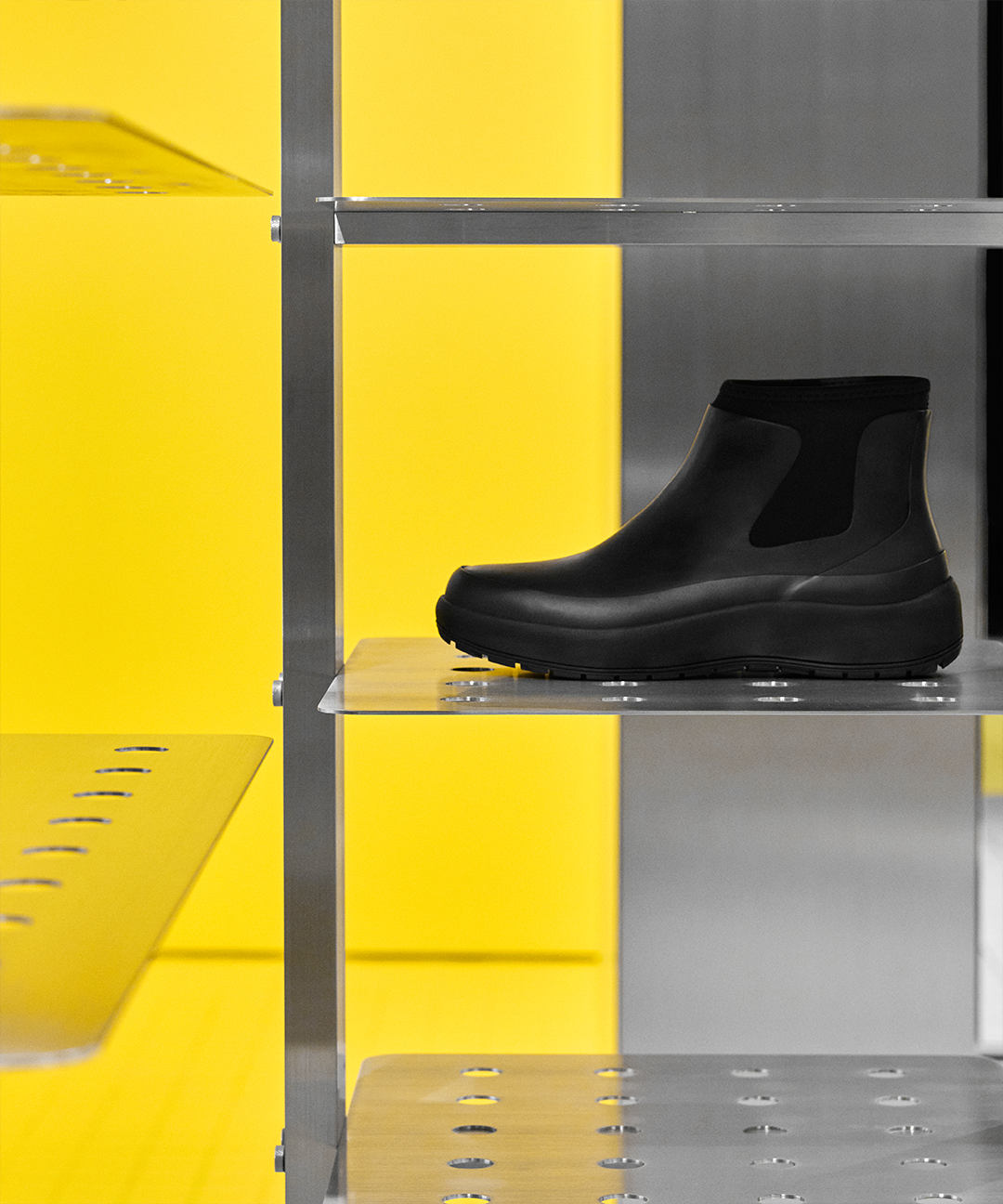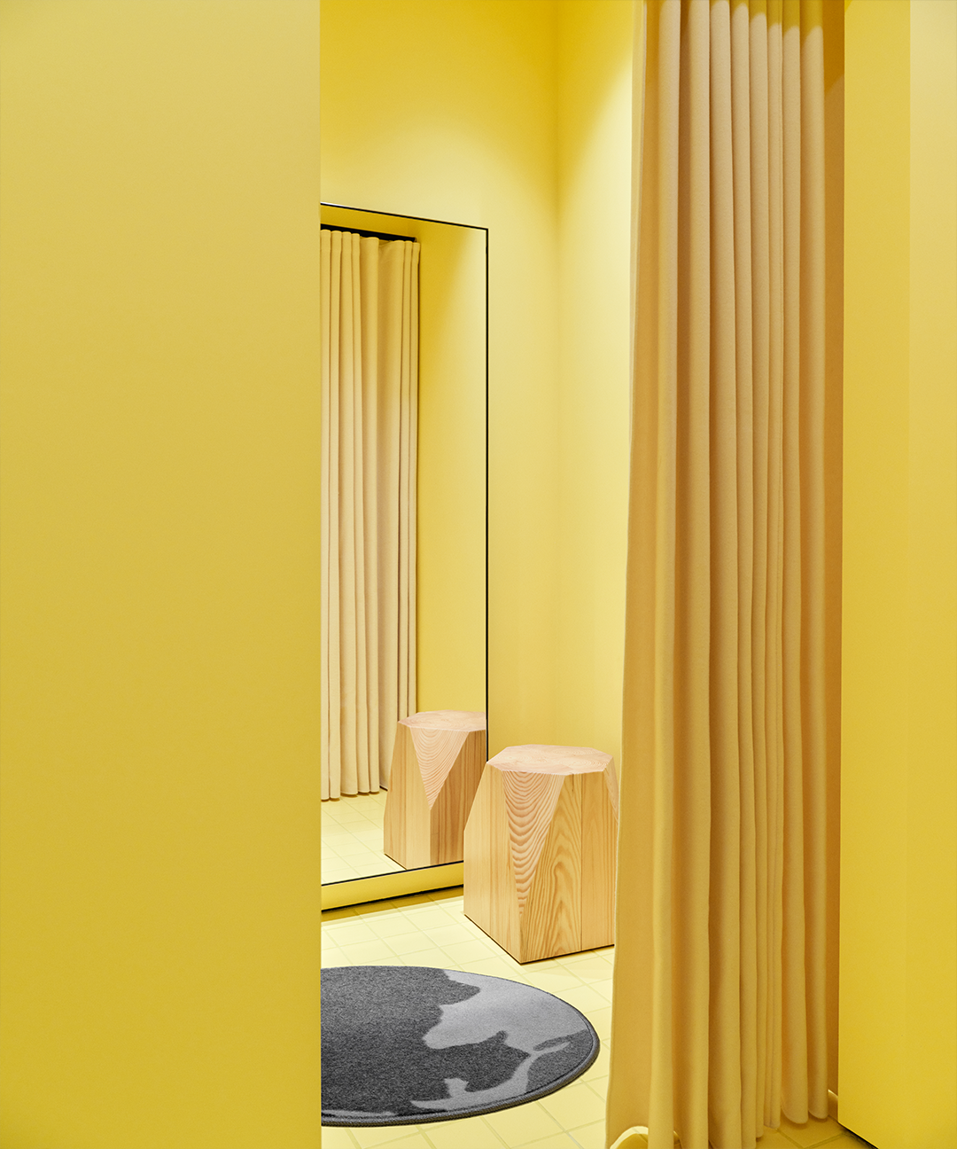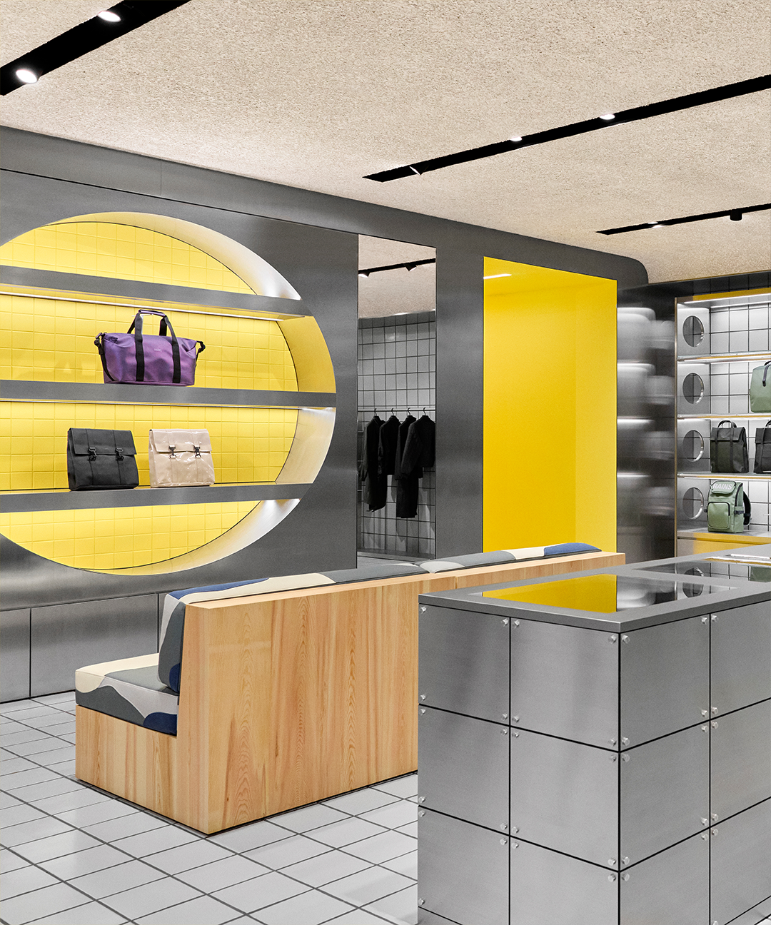 门店位于上海兴业太古汇二层,对 Rains 零售概念进行了更为深入的诠释。这间 250 平方米的空间围绕一个强烈的中心元素展开:一面雾面水滴玻璃围合结构,创造出「屋中屋」的效果,既划分了空间,又保持了通透感与视觉连续性。不同材质的碰撞在空间中扮演着关键角色。外立面采用了与 Rains 阿姆斯特丹旗舰店相同的瓷砖,强化品牌的国际一致性;内部地砖则延伸至墙面,将网格感带入垂直平面,营造出静谧而有序的环境。克制的灰色瓷砖色调中,点缀以黄色,引导着空间动线。