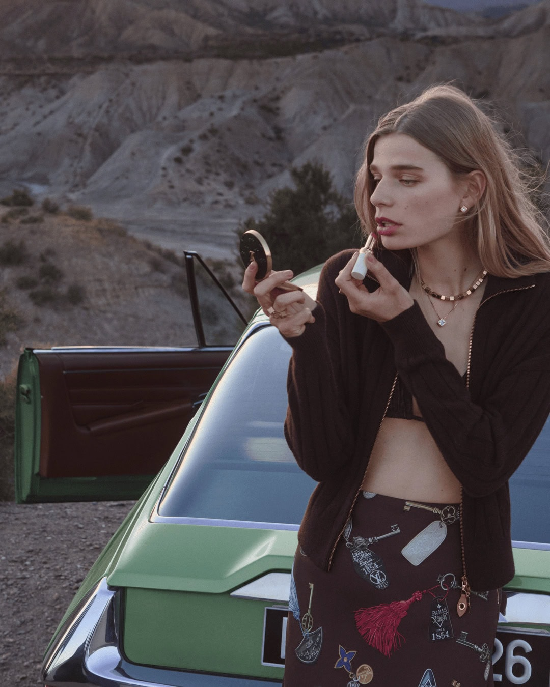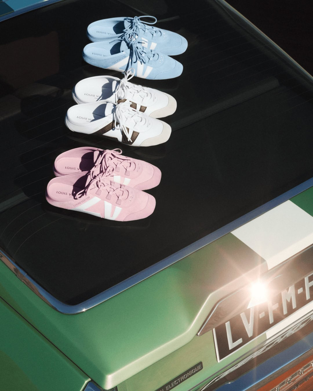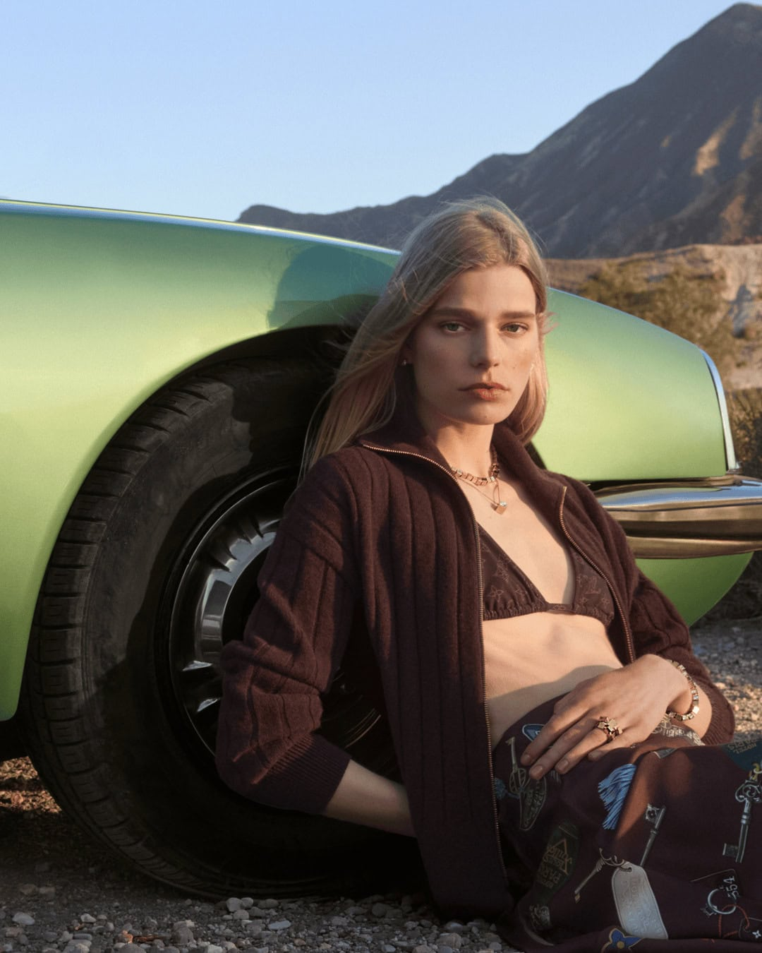 系列在实用与精致之间取得平衡:外套包括连帽飞行夹克、飞行外套、开衫及马甲,材质丰富,从颗粒皮、光面皮到穿孔与天鹅绒般柔软的皮革,兼顾功能与触感;羊绒与美利奴毛织物的针织单品带来温暖与柔软感;牛仔单品采用蓝灰色渐变水洗效果,并融入全新棕色 Monogram 图案。其他成衣如轻盈的半裙、宽松衬衫、系带连衣裙与棉质风衣、丝质及印花塔夫绸外套,以橘色、玫瑰、赭色、沙色与白色呈现轻快氛围,让衣物兼具随行与优雅,却从不显急促。
