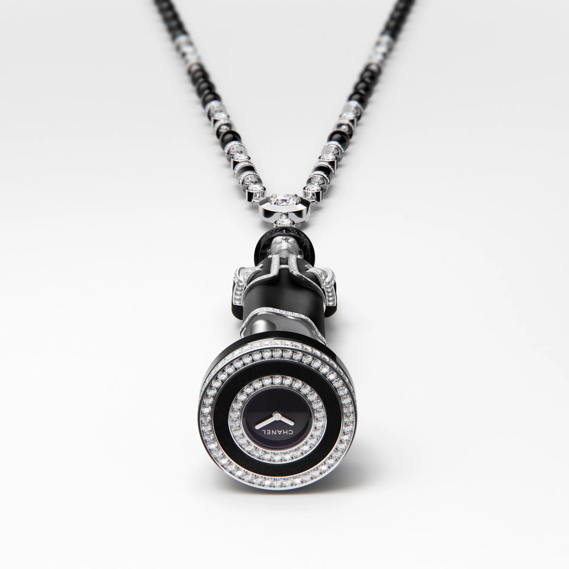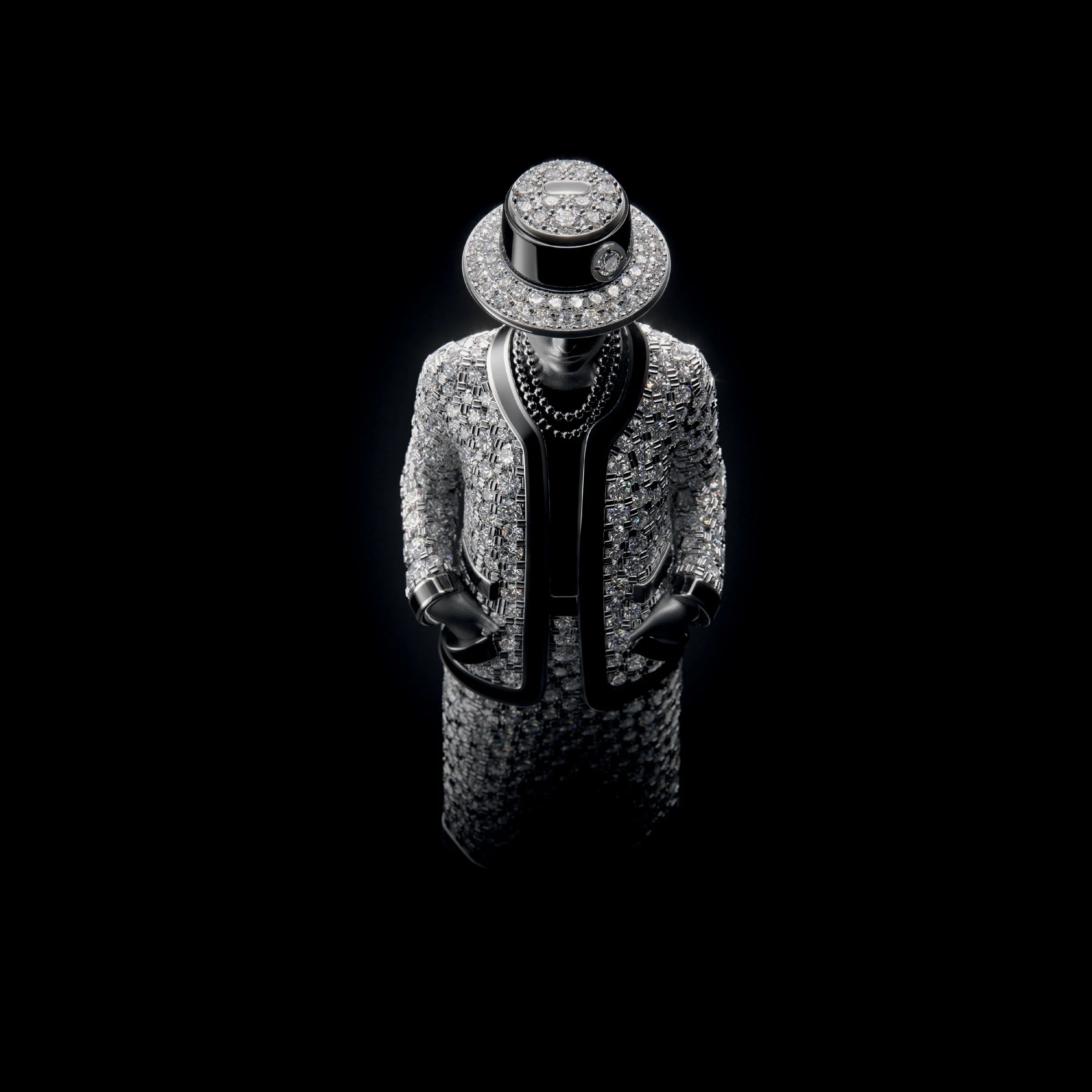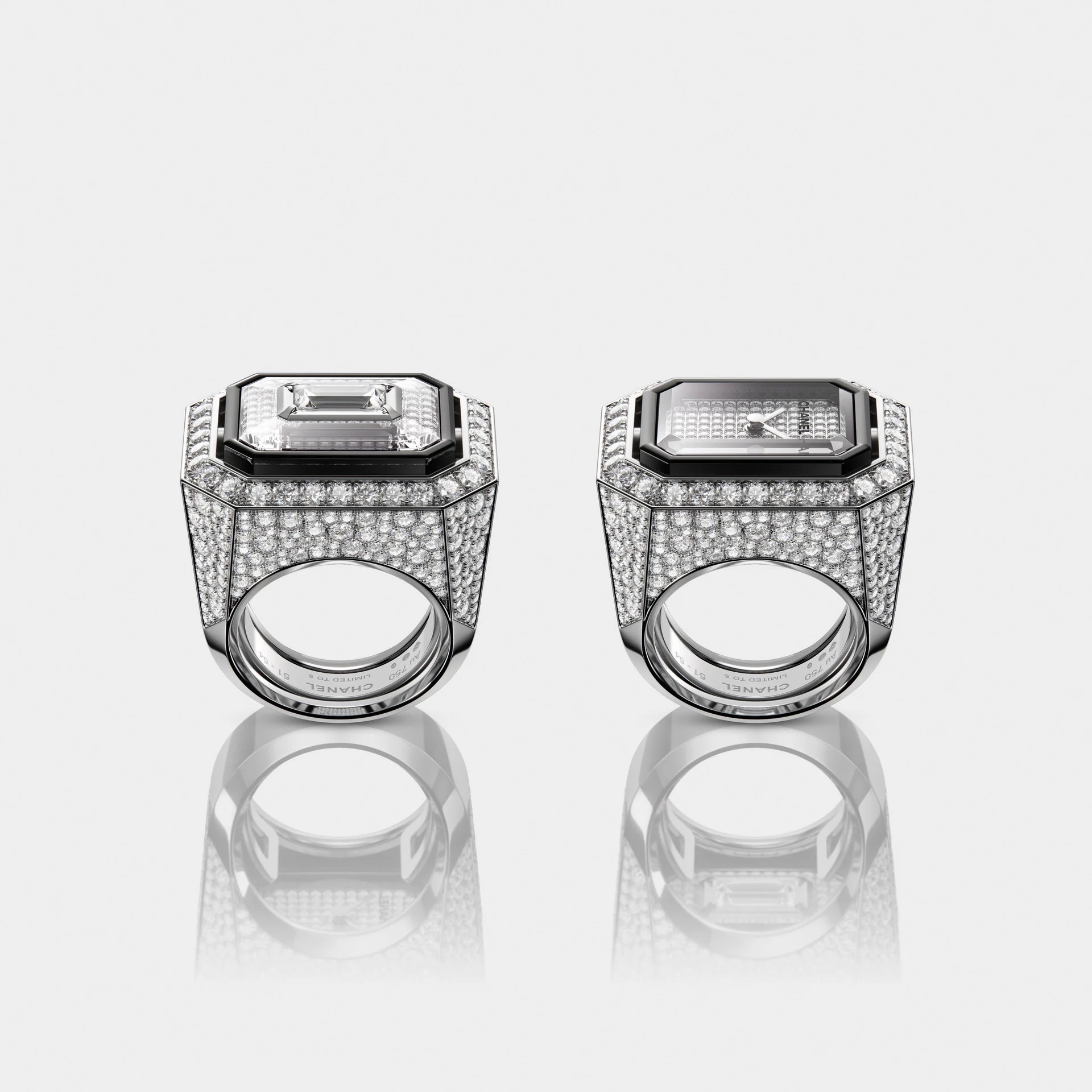 此外,项链式腕表——「Gabrielle 长项链」的表盘置于一个底座之上,底座上坐着 Gabrielle Chanel 的人偶;「COCO GAME 长项链」则采用像素艺术风格设计,Gabrielle Chanel 的形象化身为了电子游戏中的像素小人;「Première COCO GAME 戒指」则是一款饰有醒目八角形黑色线条的神秘戒指。每款均全球限量 5 枚。