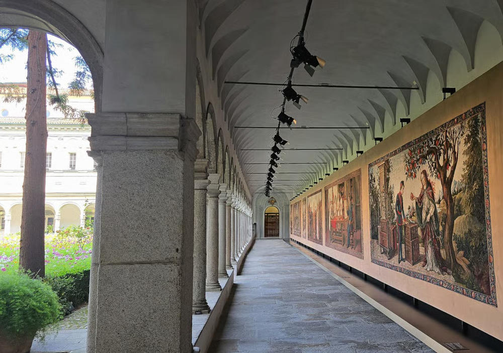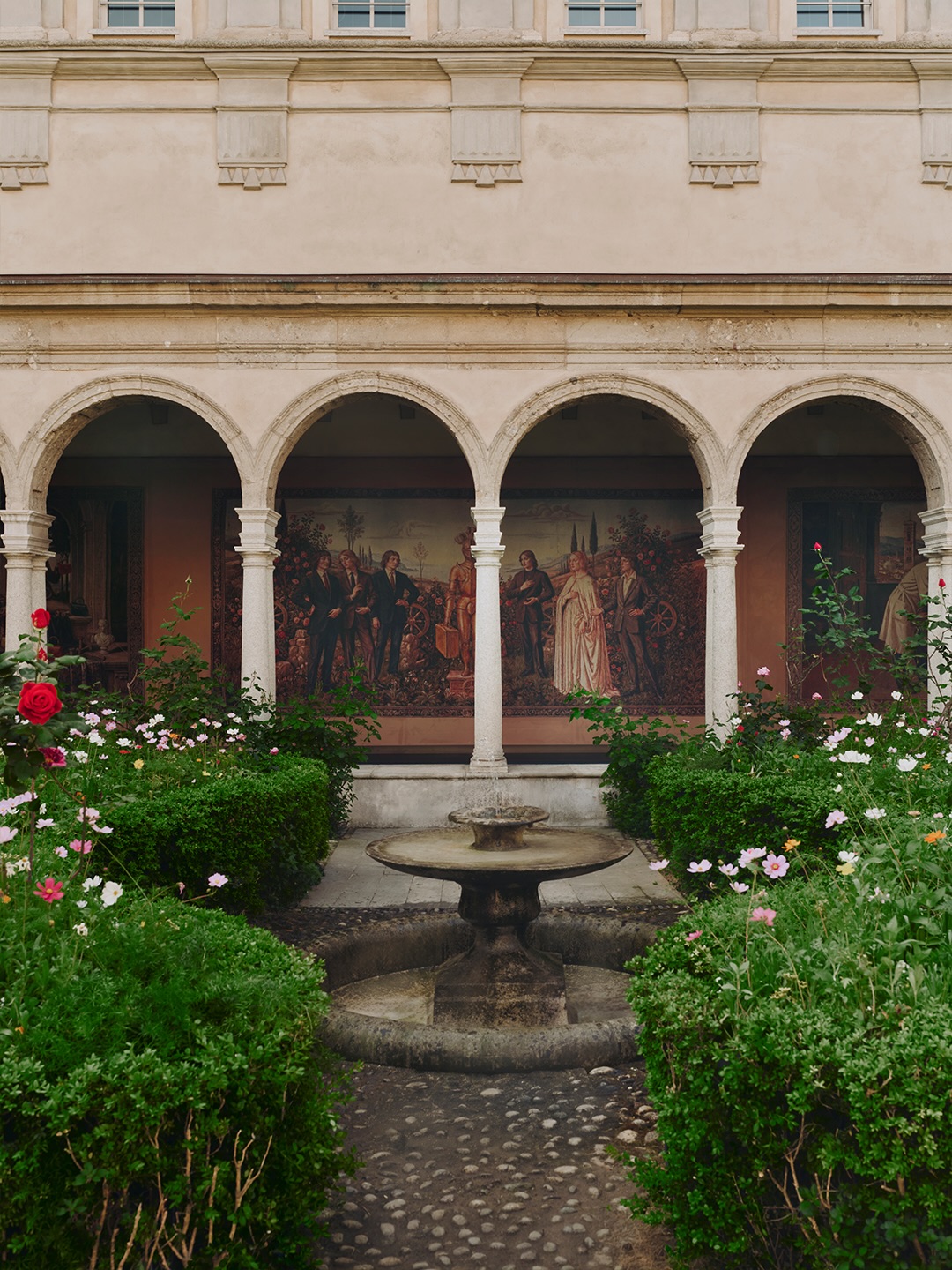 「GUCCI Memoria」By Demna 展览在米兰圣辛普利恰诺修道院拉开帷幕,展览的核心是分布于修道院回廊中的 12 幅巨型挂毯。Demna 并没有选择传统的档案回放,而是将 GUCCI 105 年的历史编织成了超现实的「剧场场景」。