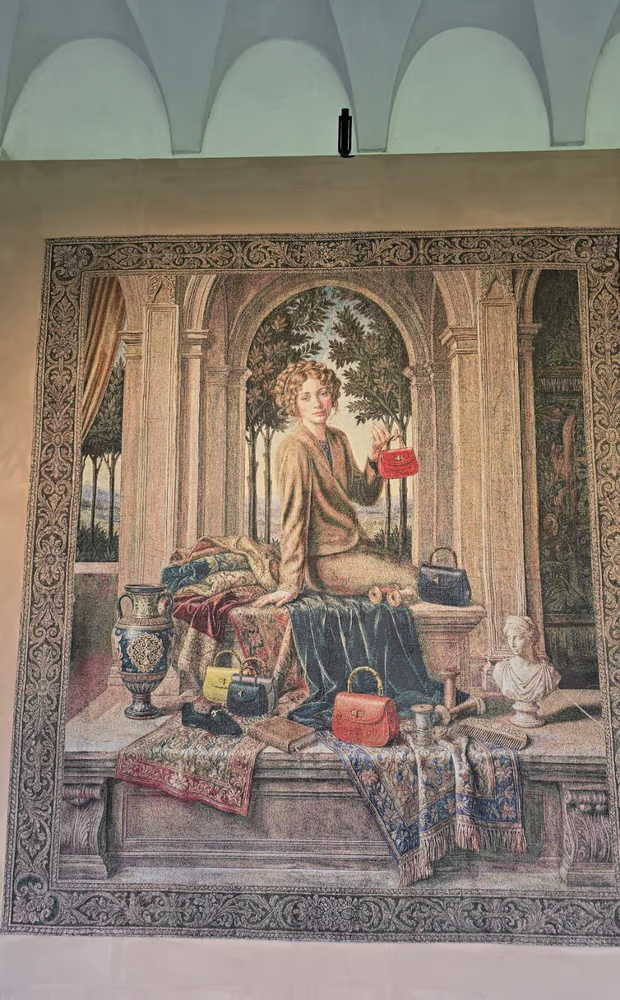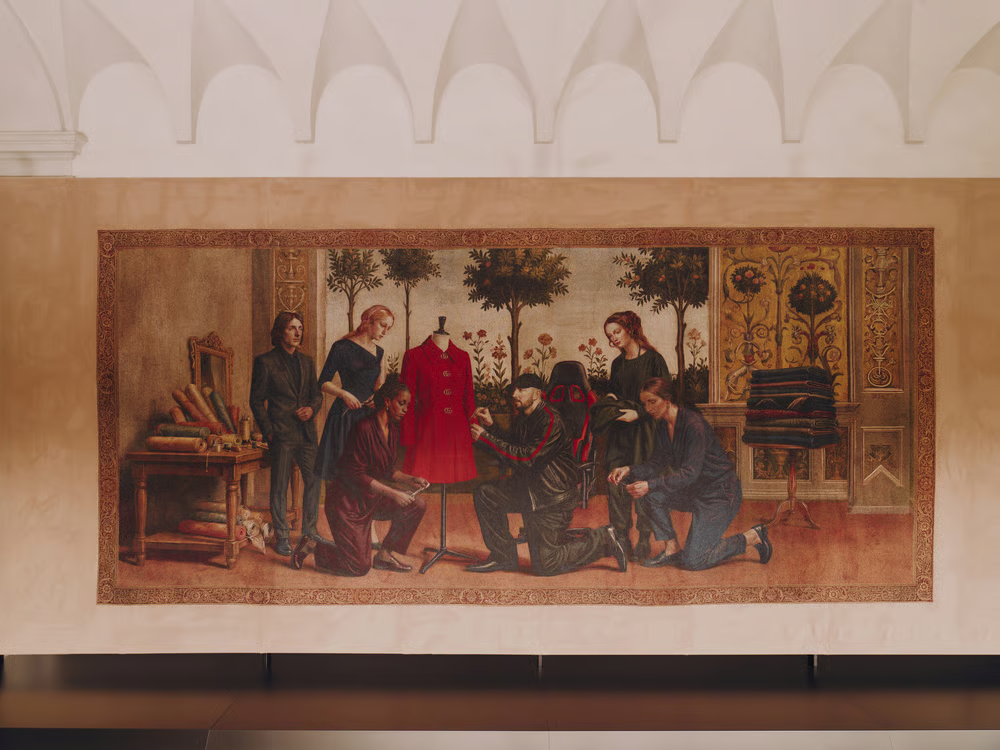 这些挂毯在视觉上借鉴了文艺复兴时期的宏伟构图(如波提切利的《春》),但细节中却充满了 Demna 式的幽默与现代解构:在描绘品牌创始人早期佛罗伦萨行李箱店的场景旁,赫然出现了一把红色的皮革电竞椅;而在致敬 Tom Ford 时期性感美学的画面中,Demna 本人则以穿着皮夹克、头戴棒球帽的形象「乱入」,为模特调整衣角。