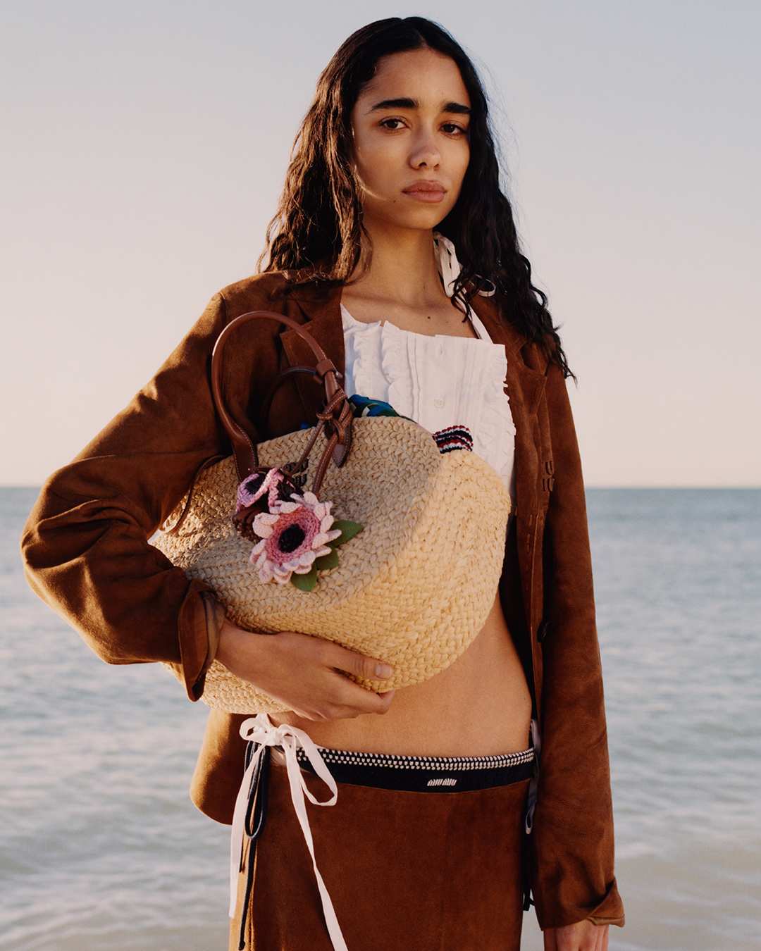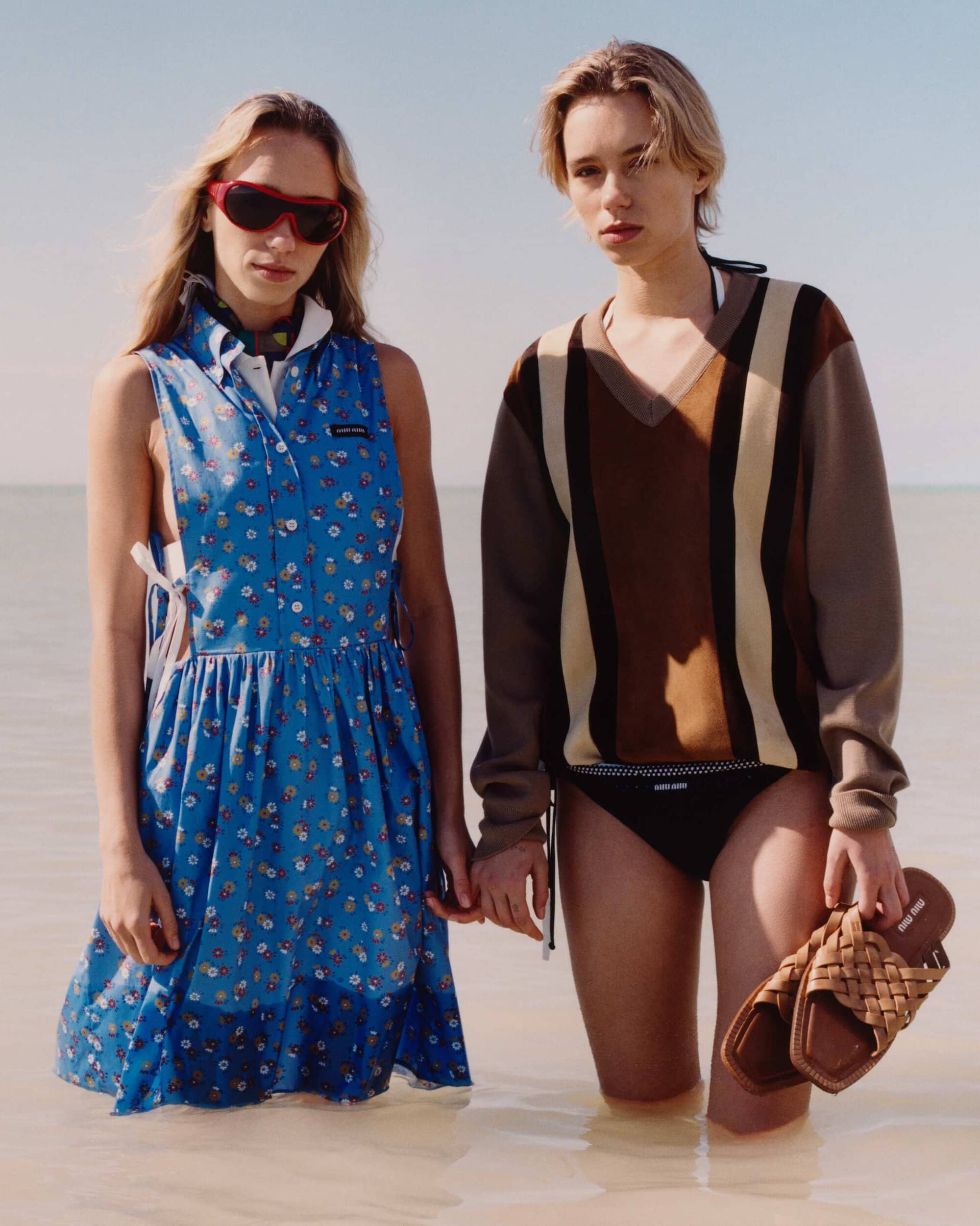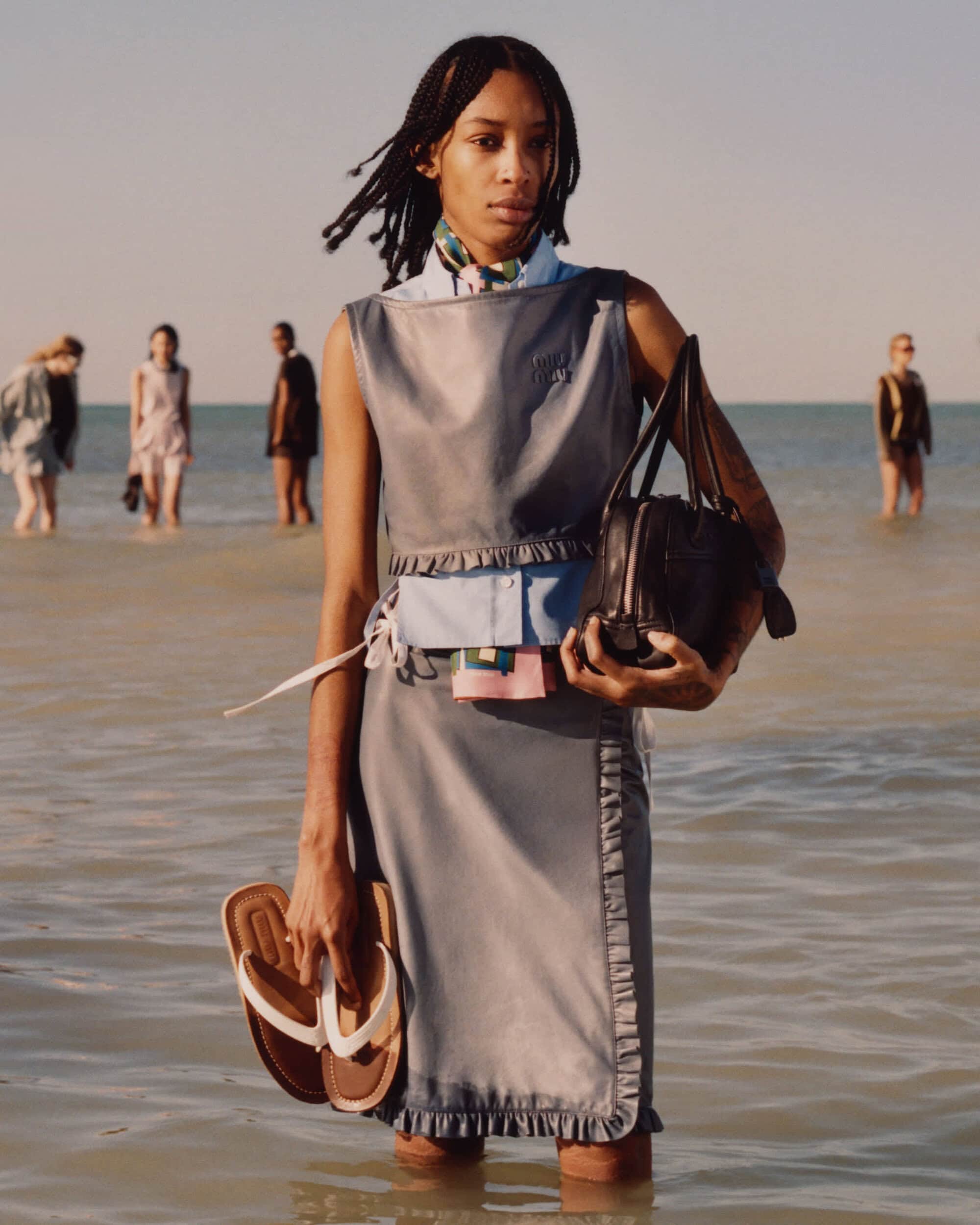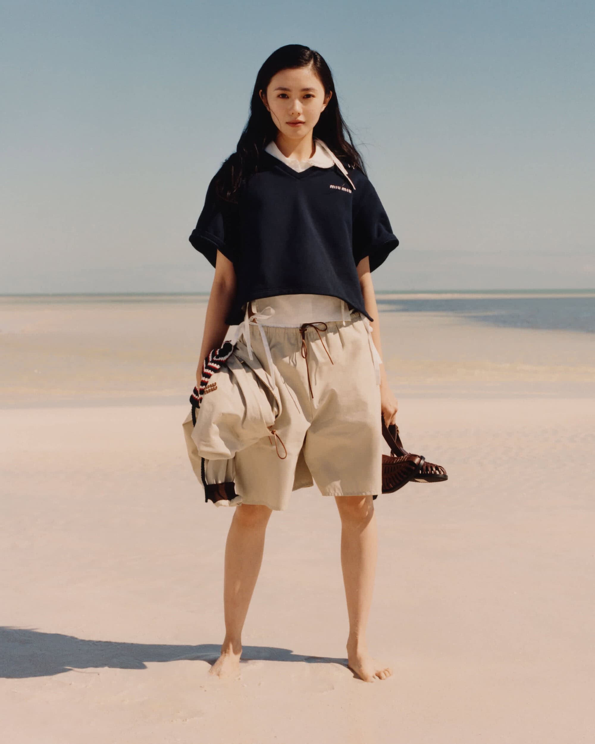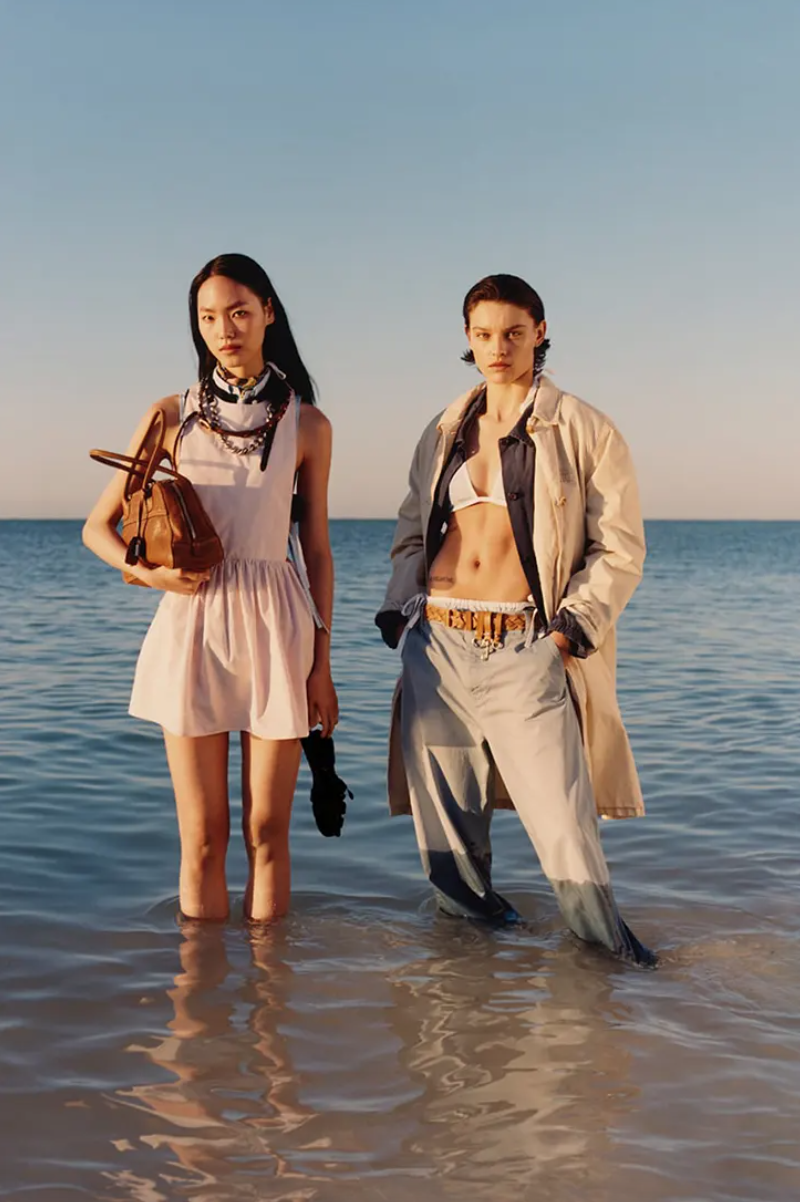 以柔和的蓝色调、阳光下的海滩和专为夏日设计的服装为特色,MIU MIU 发布了 2026 年夏季系列大片。该片由 Jeano Edwards 掌镜,Sateen Besson、刘浩存以及双胞胎 Lena Mantler 和 Lisa Mantler 倾情演绎。该系列主打轻盈透气的经典单品——例如棉质府绸裙、牛仔衬衫和帆布斜纹裤,配色从海军蓝色过渡到柔和的沙色系,呼应着海洋和海岸线的色调。剪裁上采用了休闲舒适的学院风,并点缀以丝巾、扇形领和蝴蝶结等浪漫细节。迷你裙和针织连衣裙则以随意的臀部系带收尾,营造出一种不拘一格的随性感。