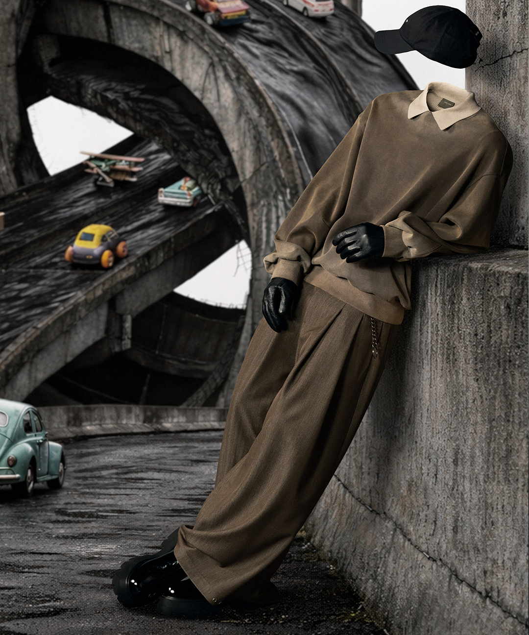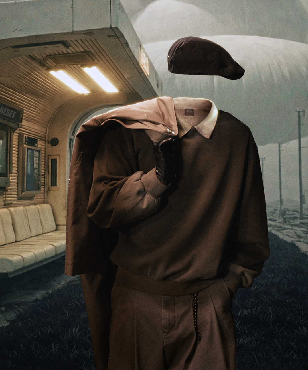 在视觉表达上,「RESET」以一组被刻意稀释的中性色谱作为整体基底。烟灰色、砂石色、深苔色、深棕色、灰褐色与卡其色构成一套接近自然沉积层的色彩系统。低饱和度与灰度倾向共同作用,削弱情绪指向,使颜色从「表达」转化为一种基础条件,成为承载结构与材质的背景而非主角。