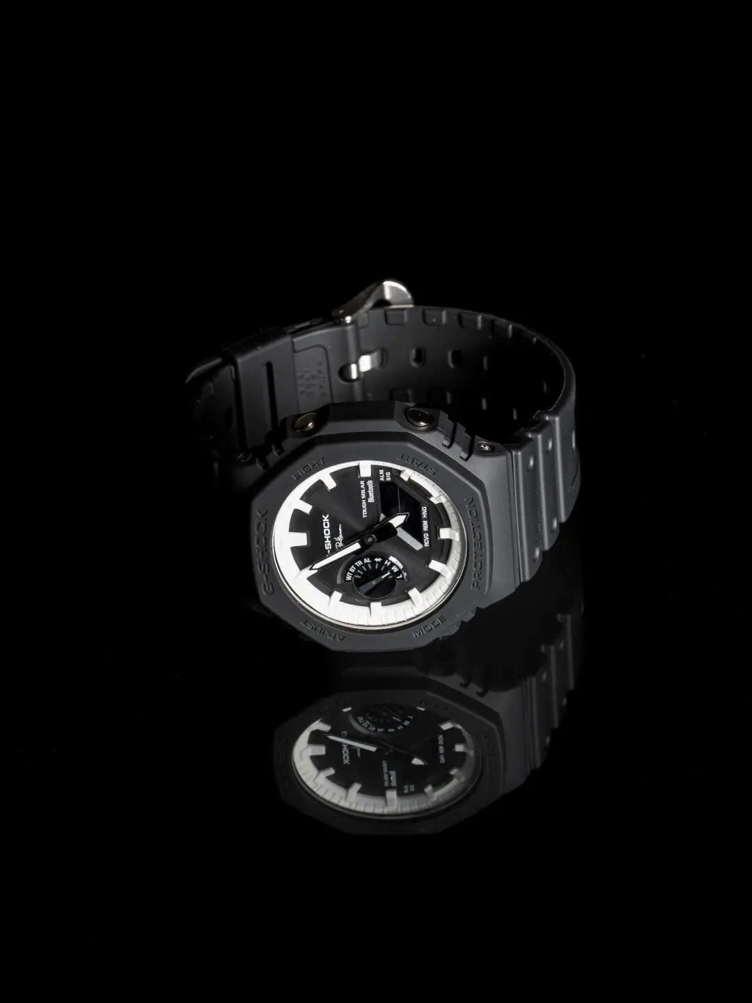 GA-B2100 作为 G-SHOCK 经典「卡西欧橡树」的进化之作,此次推出与 Ron Herman 的联名特别款。腕表保留标志性八角形表圈,搭载智能手机联动与 Tough Solar 太阳能动力。整体采用单色设计,白色刻度与外缘在黑色表盘上形成清晰对比,反显 LCD 更添现代感。表盘及表背均镌刻 Ron Herman 专属标志,兼顾正式与休闲场景。据悉该联名表款将于 5 月 9 日发布,感兴趣的朋友不容错过。
