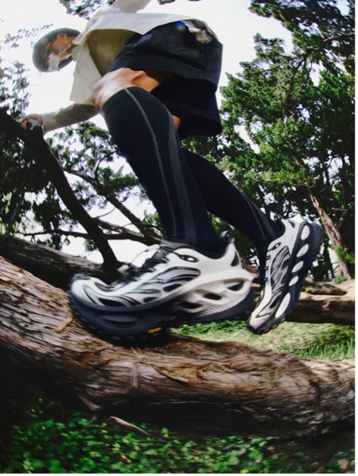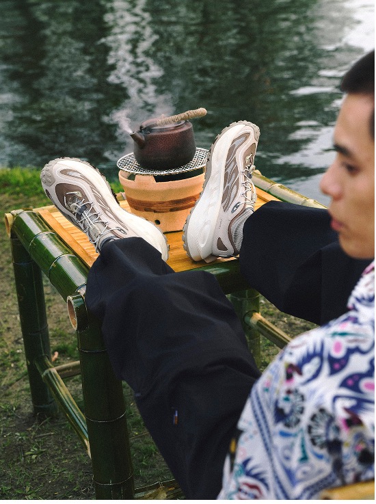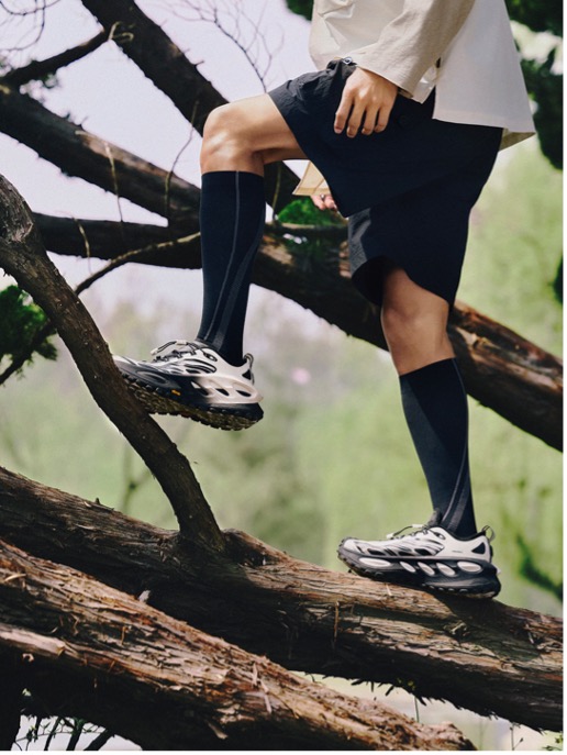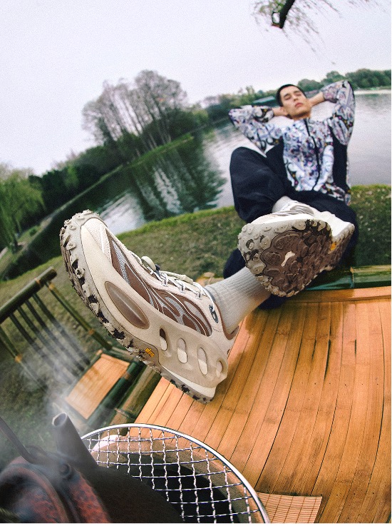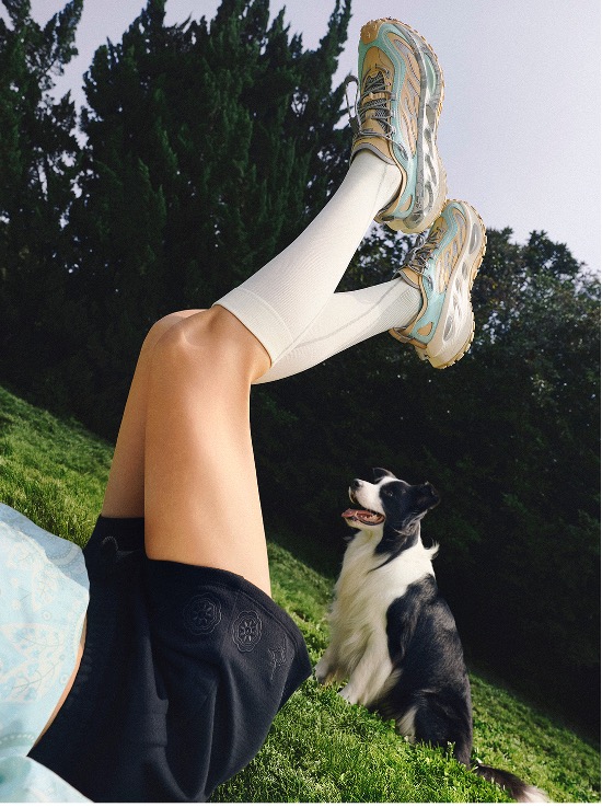 本季游侠 2.0 的设计灵感源自稻城亚丁牛奶海。整体配色取样自海拔 4600 米的自然垂直带谱:雪山白、冰川乳蓝、草甸嫩绿、岩层褐与云海灰,对应高原环境中的不同地貌层次,形成具有山川意象的视觉表达。鞋身线条以地貌结构为参考,将山体走势与水域纹理进行抽象转译,形成贯穿整体的设计语言,使产品在视觉层面呈现出来源于自然环境的形态逻辑。功能上,游侠 2.0 以科技完成了一次从「苦行」到「畅行」的进化。Vibram 大底带来稳定抓地;超䨻中底科技提供轻弹缓震;COOLSHELL 凉感科技与高透气鞋面组合,即便春夏升温也能保持清爽透气;快速系带系统则在穿脱效率与使用便捷性上提供支持——无需繁复穿着,随时出发。