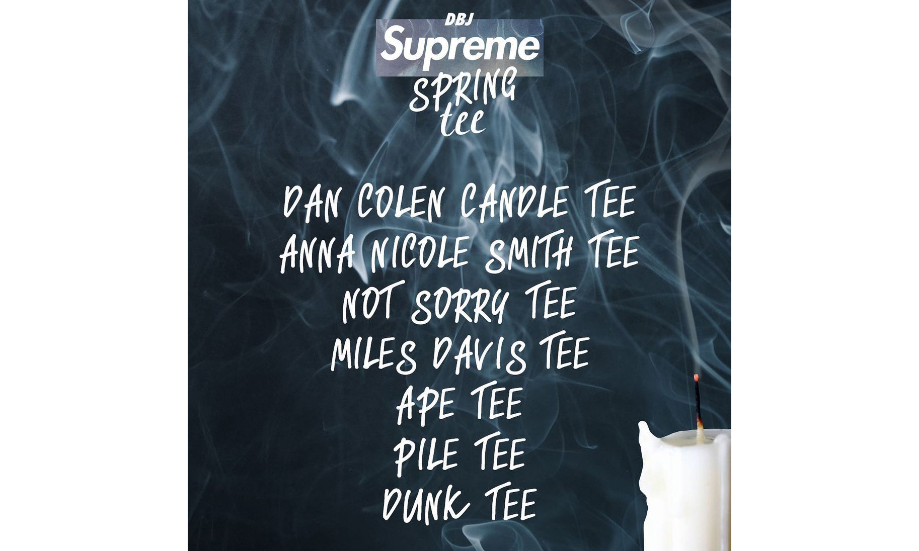 除了 2021 春夏系列预览中出现的 Tee 系列外,夏季限定 Tee 也将在本周正式上架。根据情报账号 @dropsbyjay 的情报显示,本季将有 7 款 Tee 新品登场,包括 Dan Colen Candle Tee、Anna Nicole Smith Tee、Not Sorry Tee 等等,至于官方预览将在晚些时候正式登场,敬请关注我们的后续报道。