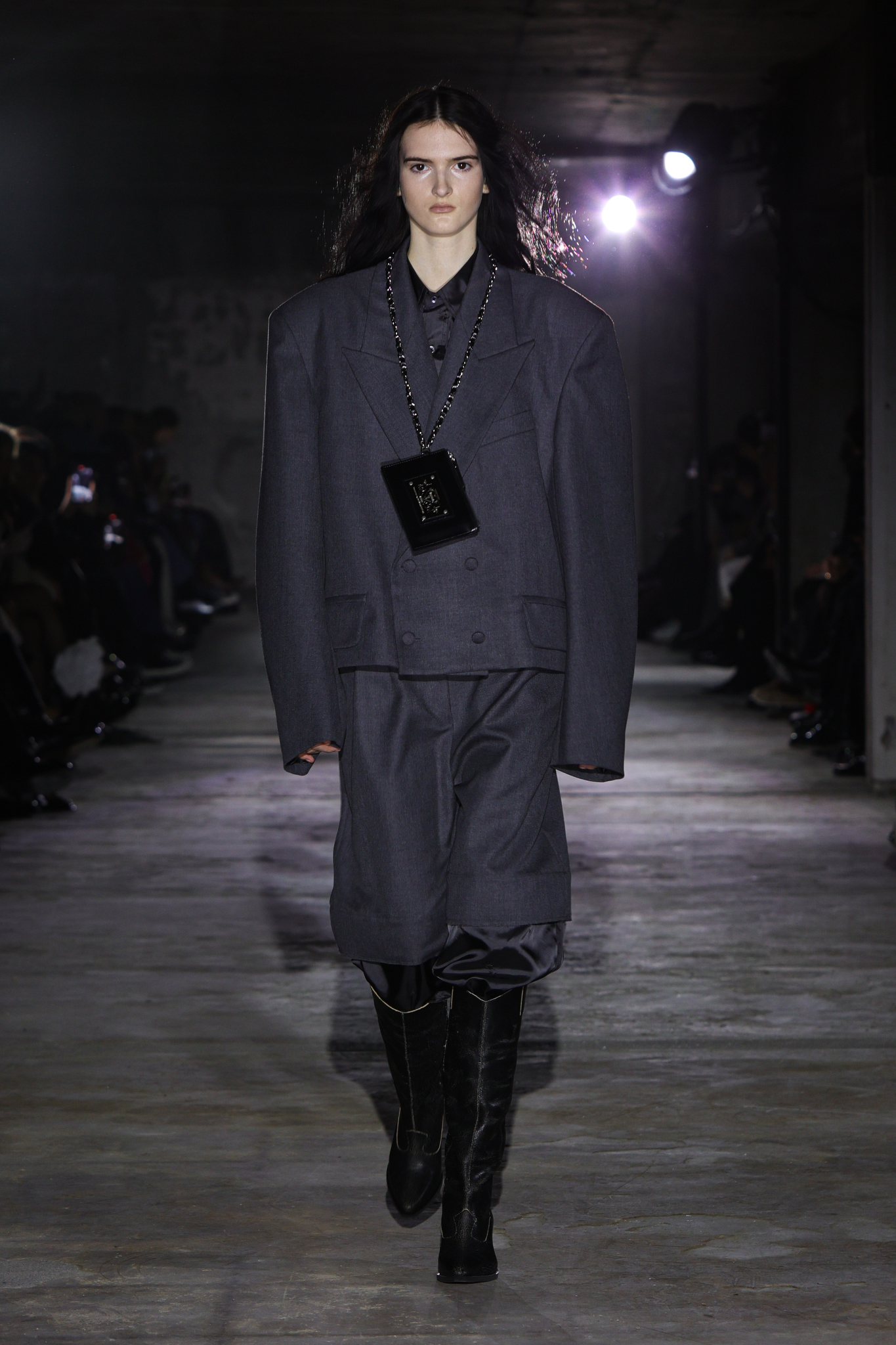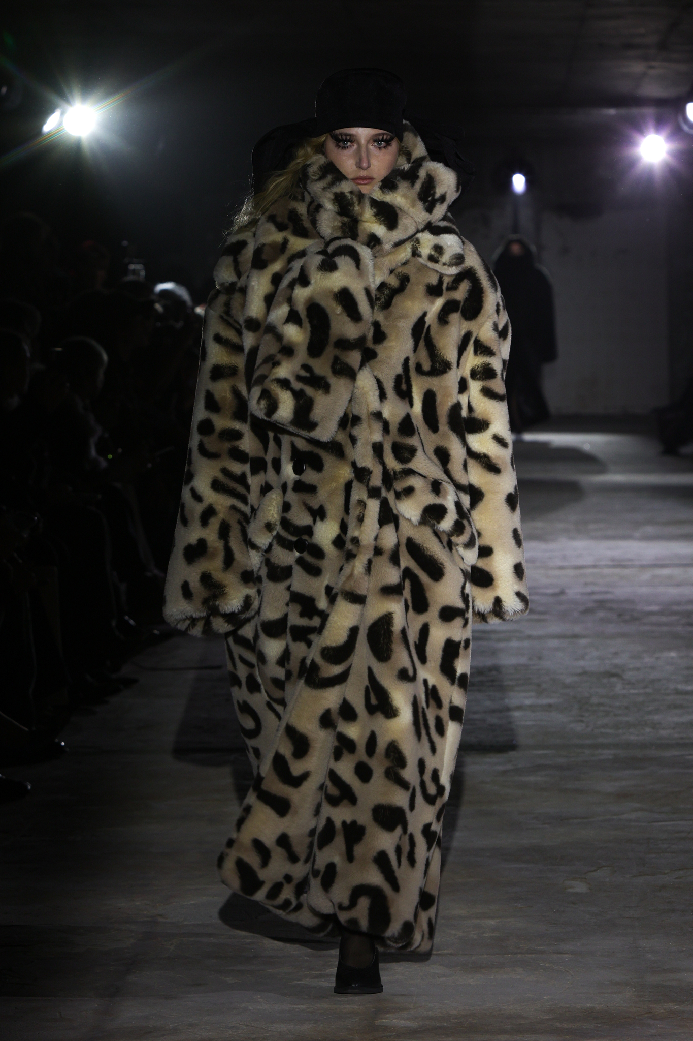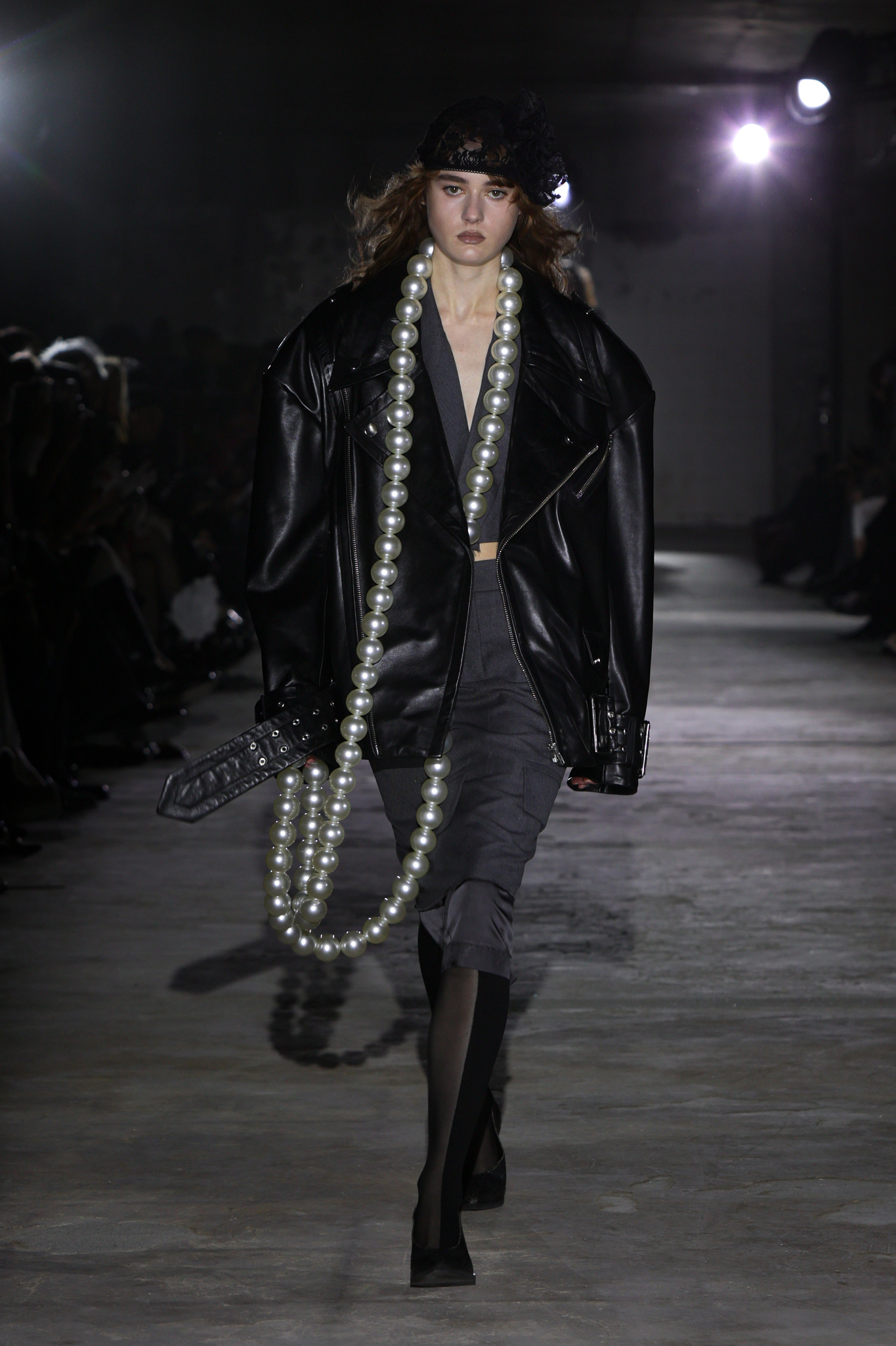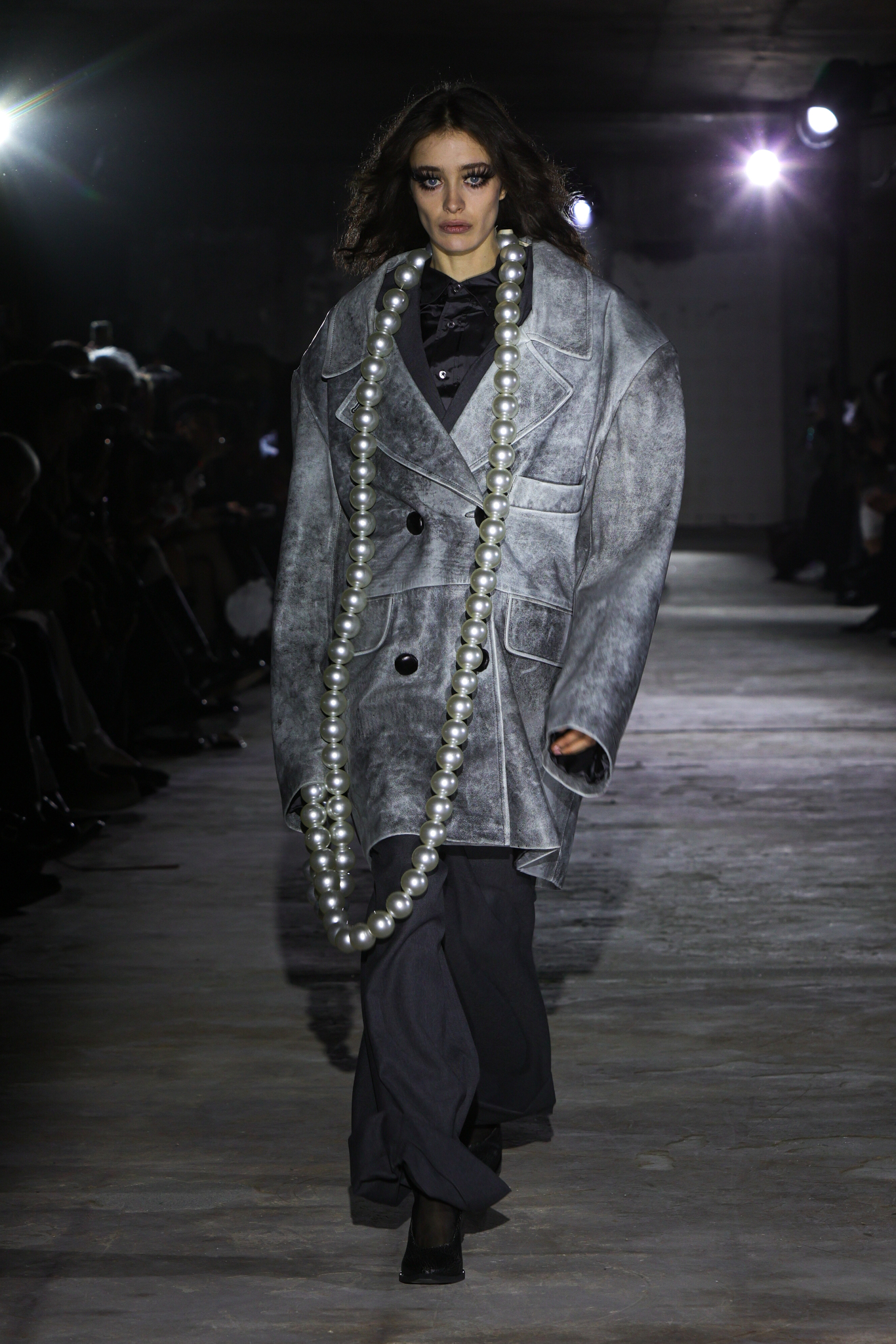 本季,设计团队回溯 1920 年代和 1980 年代,将超大垫肩西装变成本季的关键单品,夸张的线条塑造出充满权力感的造型;而沉稳的暗色调贯穿系列,仅以淡粉色、豹纹、超大花朵胸针和珍珠项链作点缀,形成戏剧性的对比;针织单品则采用粗棒针编织,并使用白色涂层工艺,营造出一种近乎雕塑感的视觉效果,这一设计手法也出现在风衣上,赋予经典单品全新质感。