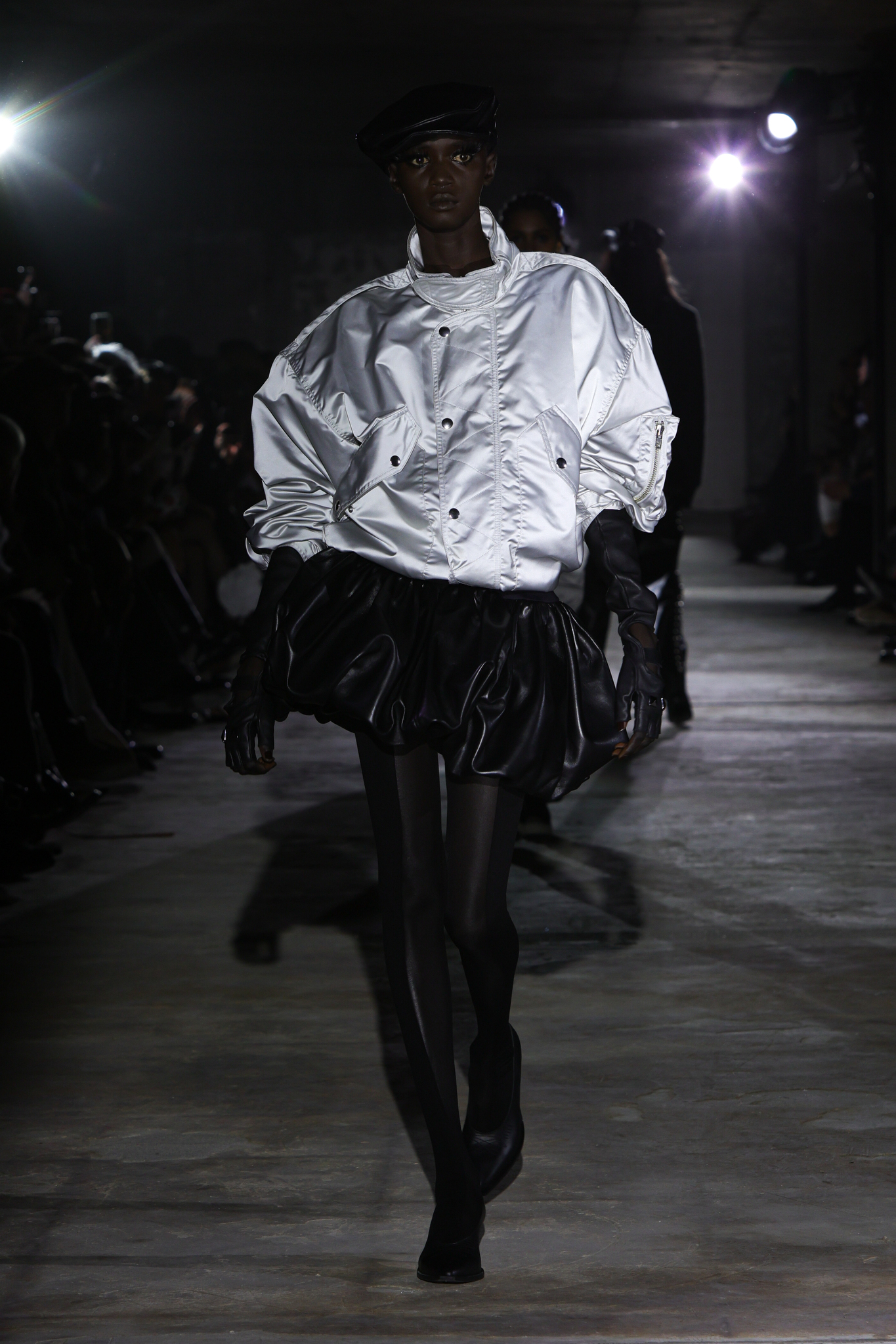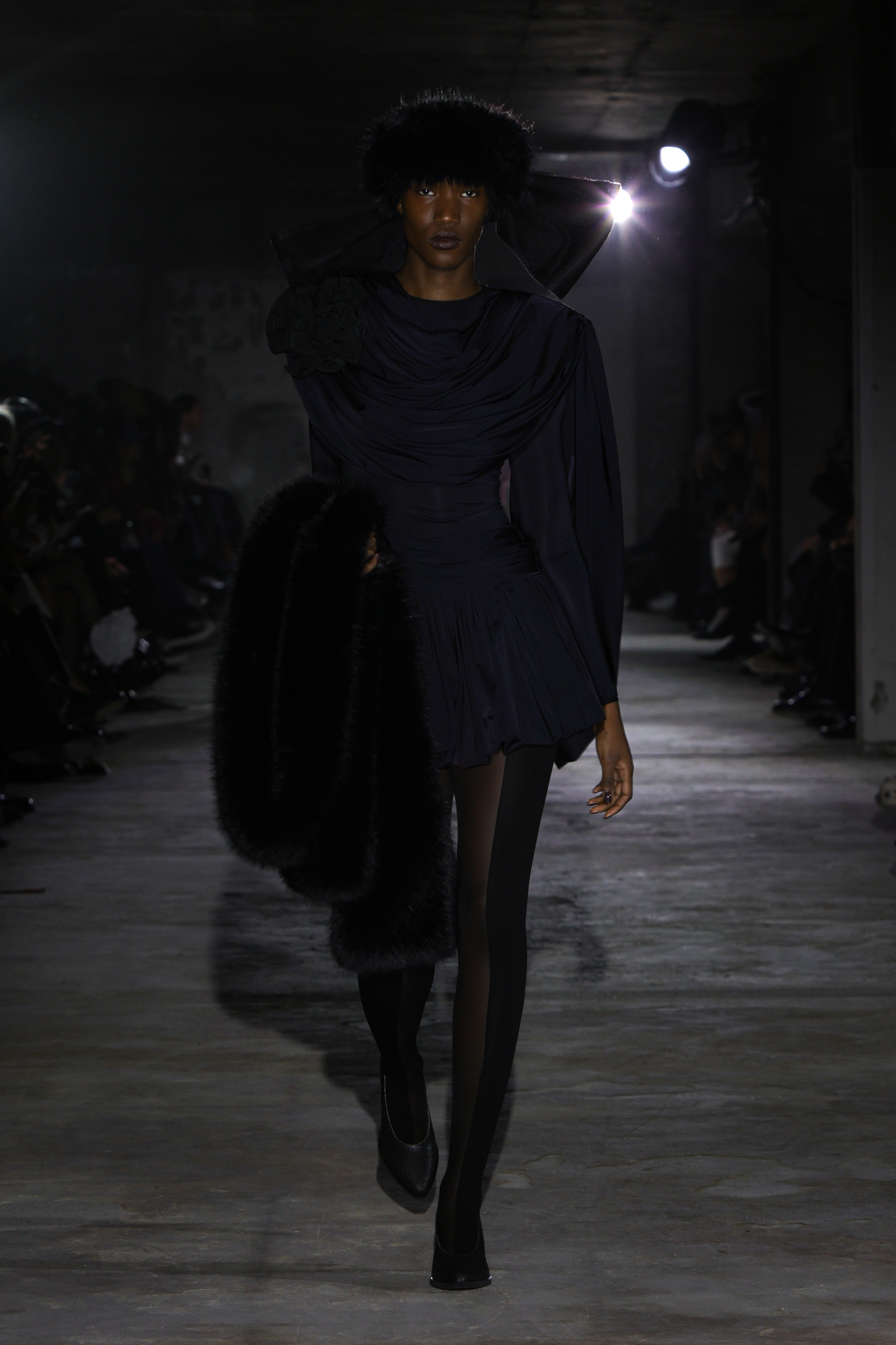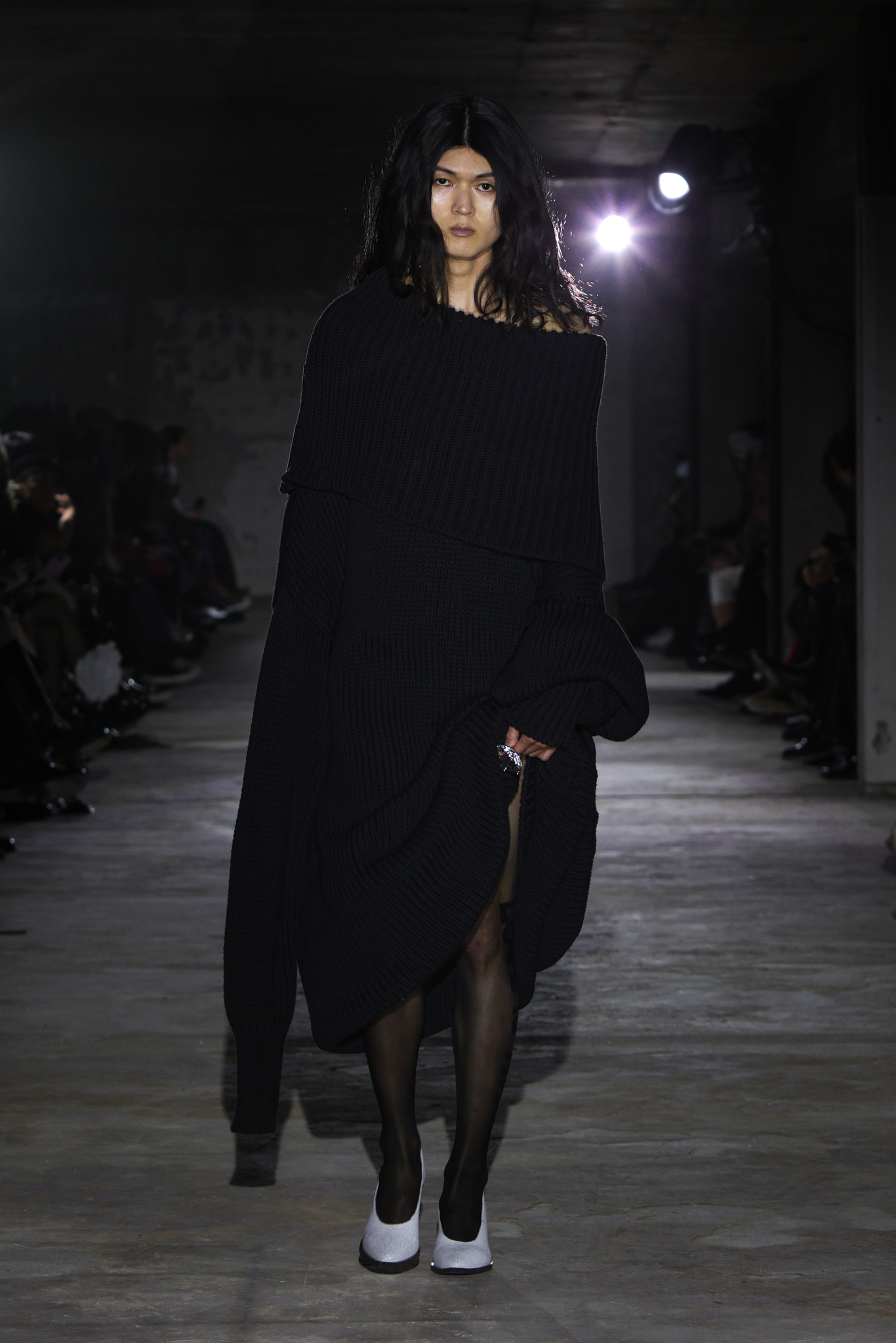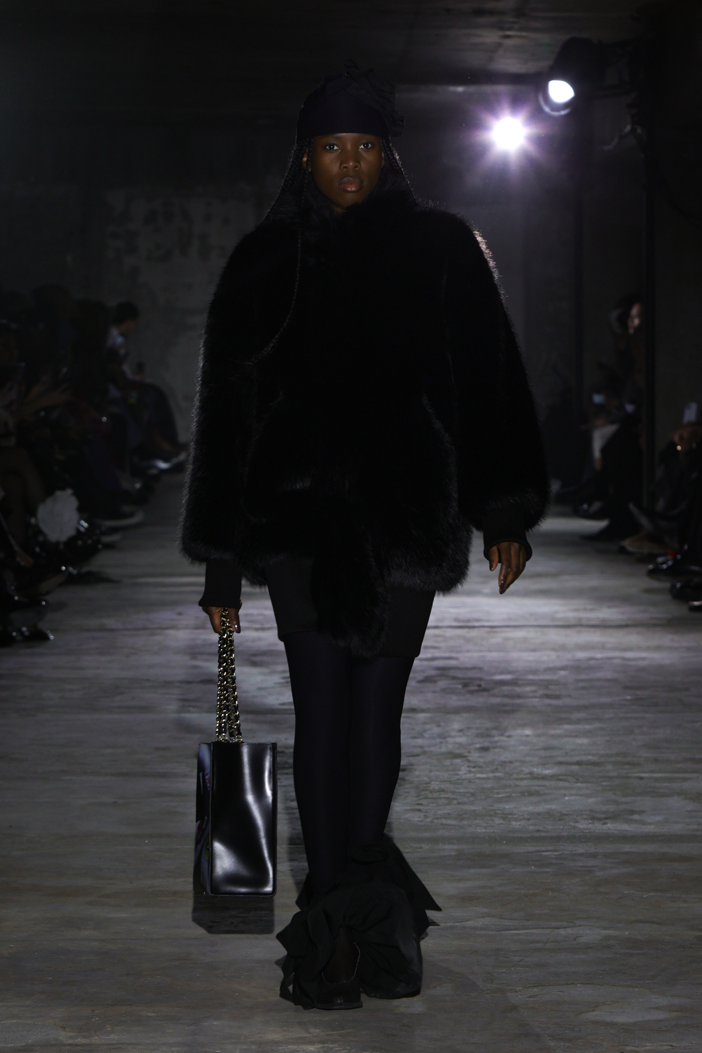 本季,设计团队回溯 1920 年代和 1980 年代,将超大垫肩西装变成本季的关键单品,夸张的线条塑造出充满权力感的造型;而沉稳的暗色调贯穿系列,仅以淡粉色、豹纹、超大花朵胸针和珍珠项链作点缀,形成戏剧性的对比;针织单品则采用粗棒针编织,并使用白色涂层工艺,营造出一种近乎雕塑感的视觉效果,这一设计手法也出现在风衣上,赋予经典单品全新质感。