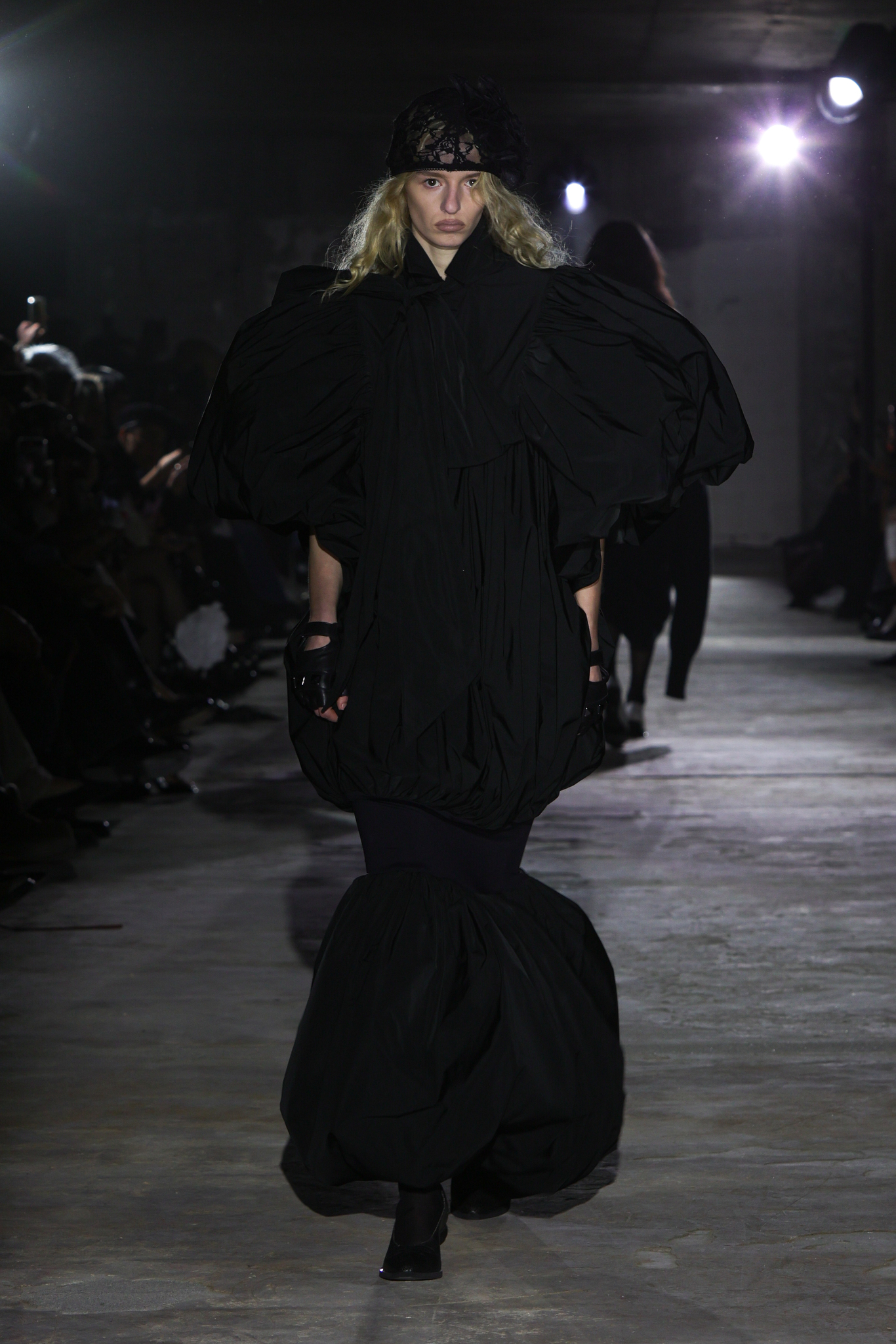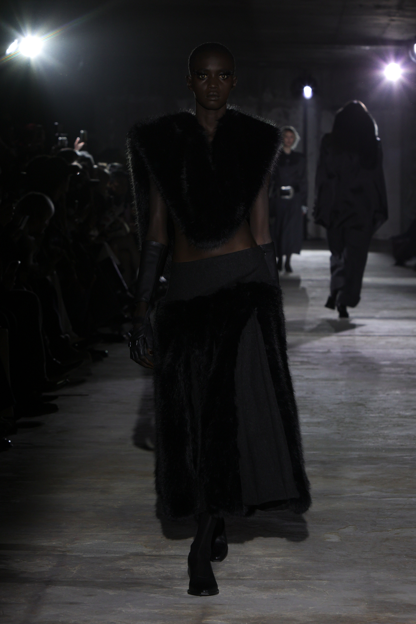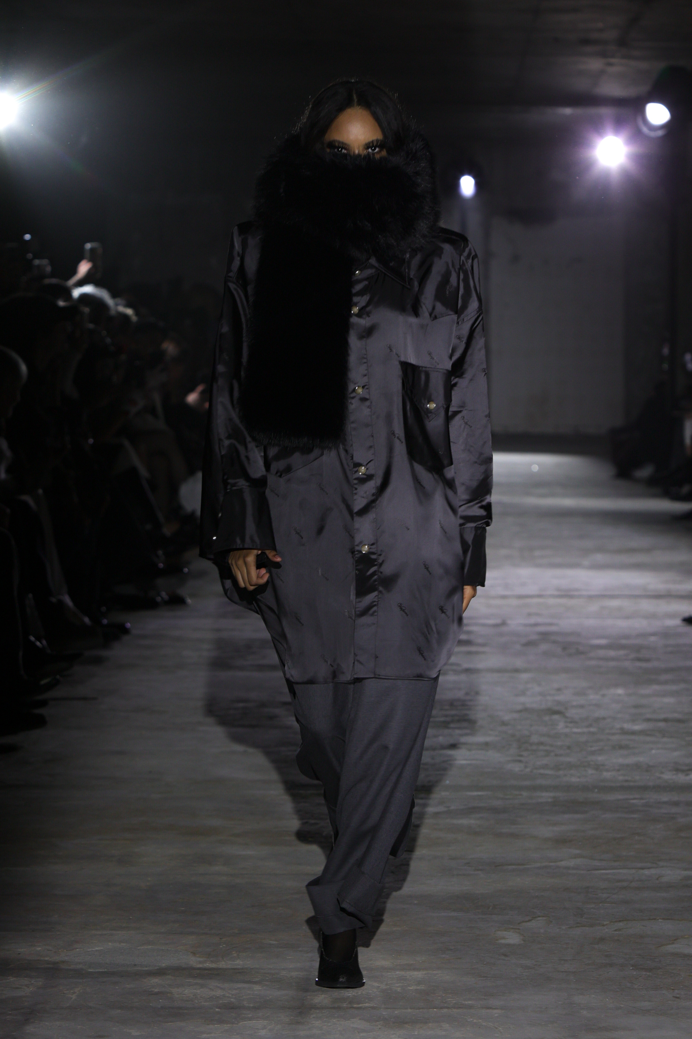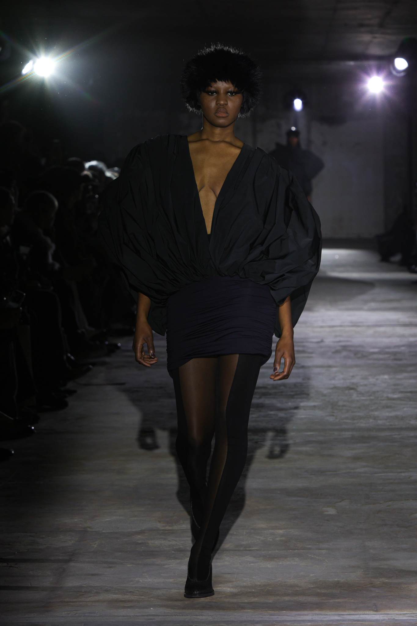 本季,设计团队回溯 1920 年代和 1980 年代,将超大垫肩西装变成本季的关键单品,夸张的线条塑造出充满权力感的造型;而沉稳的暗色调贯穿系列,仅以淡粉色、豹纹、超大花朵胸针和珍珠项链作点缀,形成戏剧性的对比;针织单品则采用粗棒针编织,并使用白色涂层工艺,营造出一种近乎雕塑感的视觉效果,这一设计手法也出现在风衣上,赋予经典单品全新质感。