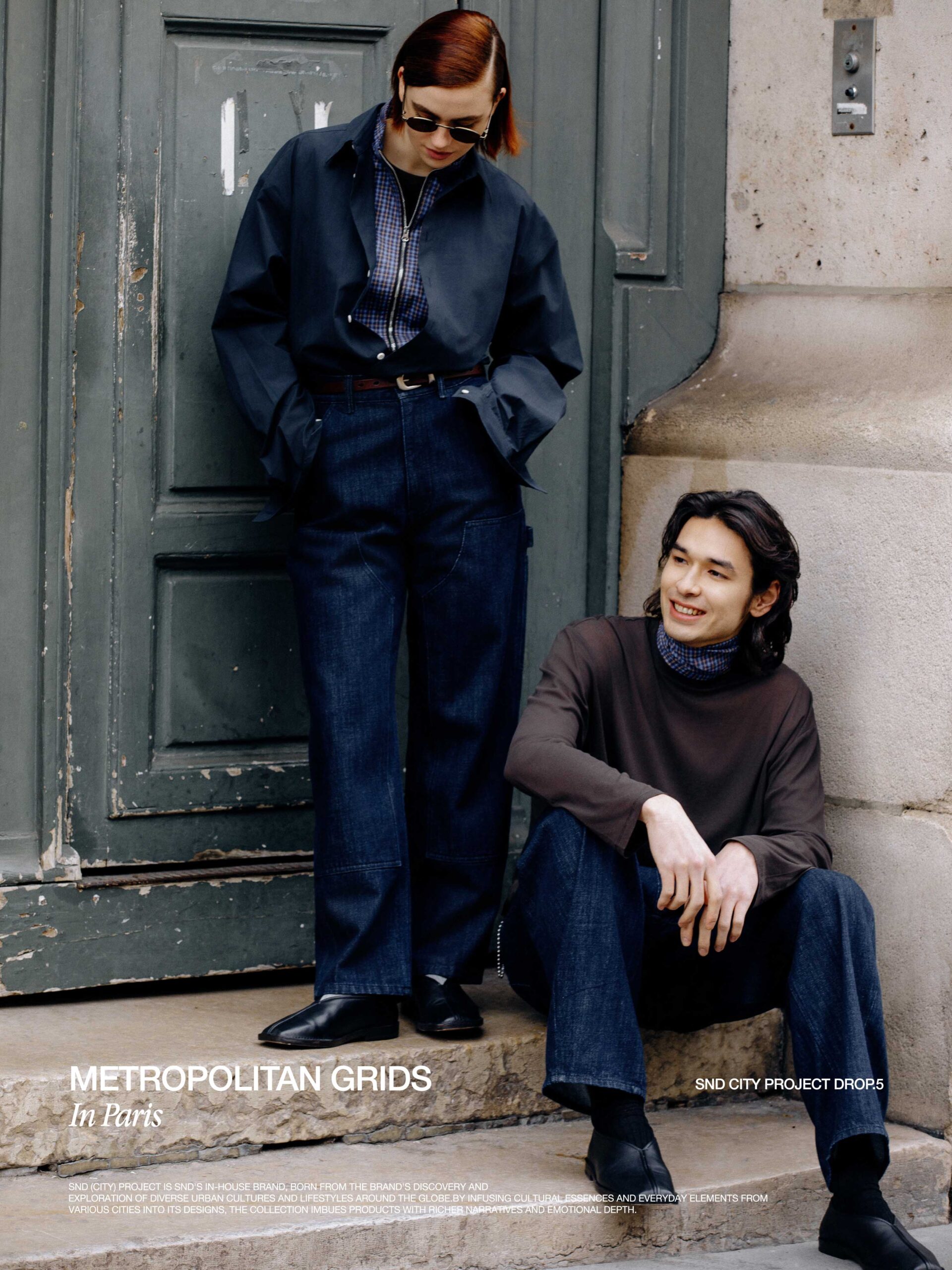 本季主打产品格纹衬衫,借由经典几何线条的排列,隐喻城市街巷的纵横轨迹,将文化、艺术与日常编织成诗。SND (CITY) PROJECT 首次带来牛仔单品,经典的丹宁原色,藉由柔软且耐磨的面料诠释质感;首次加入红色系配色,如经纬间的跳跃音符,为系列注入鲜活气息,打破以往灰黑色系的克制叙事。