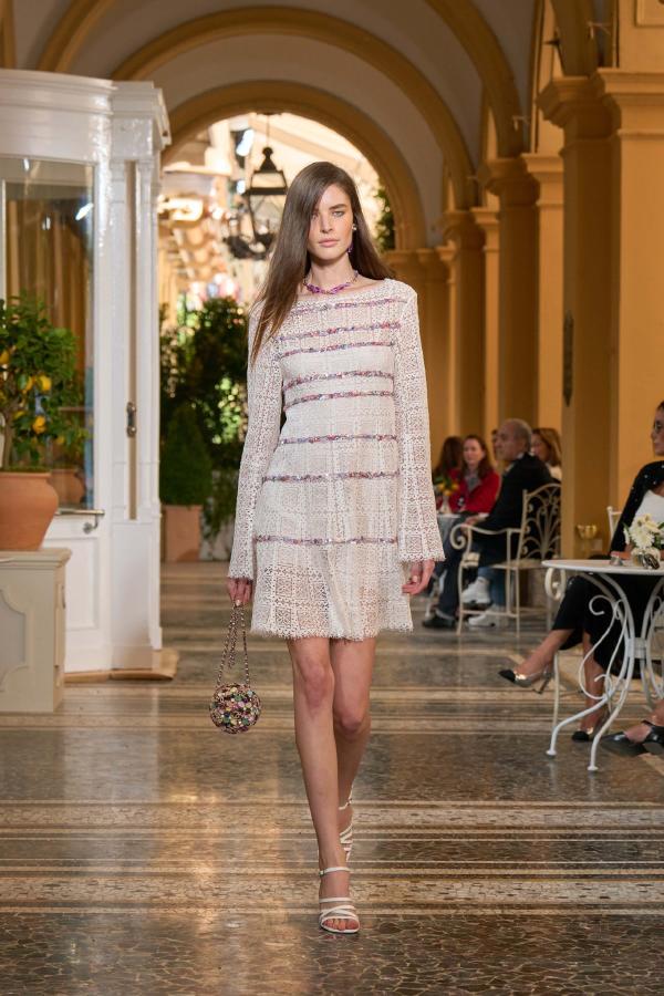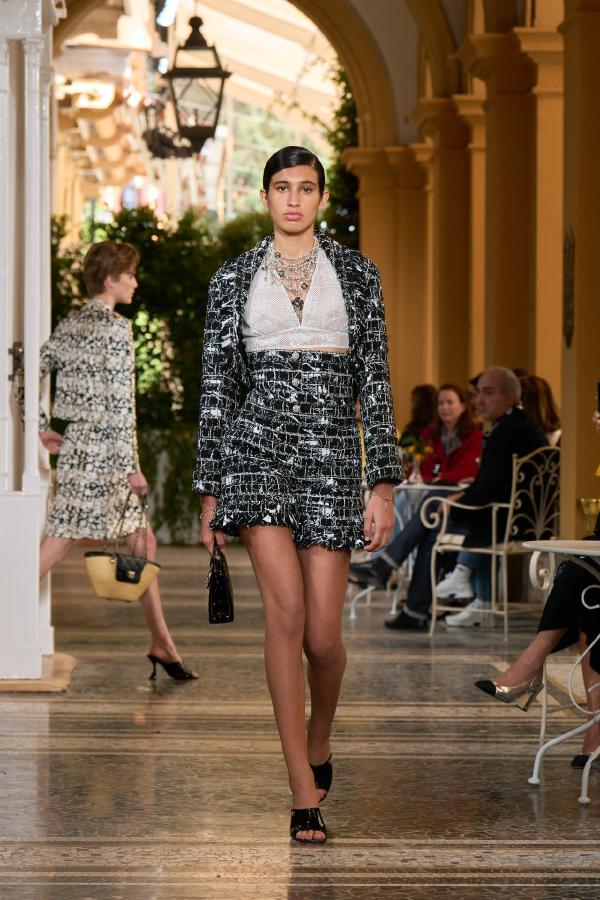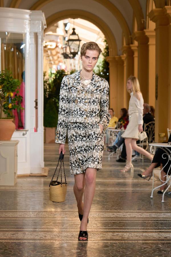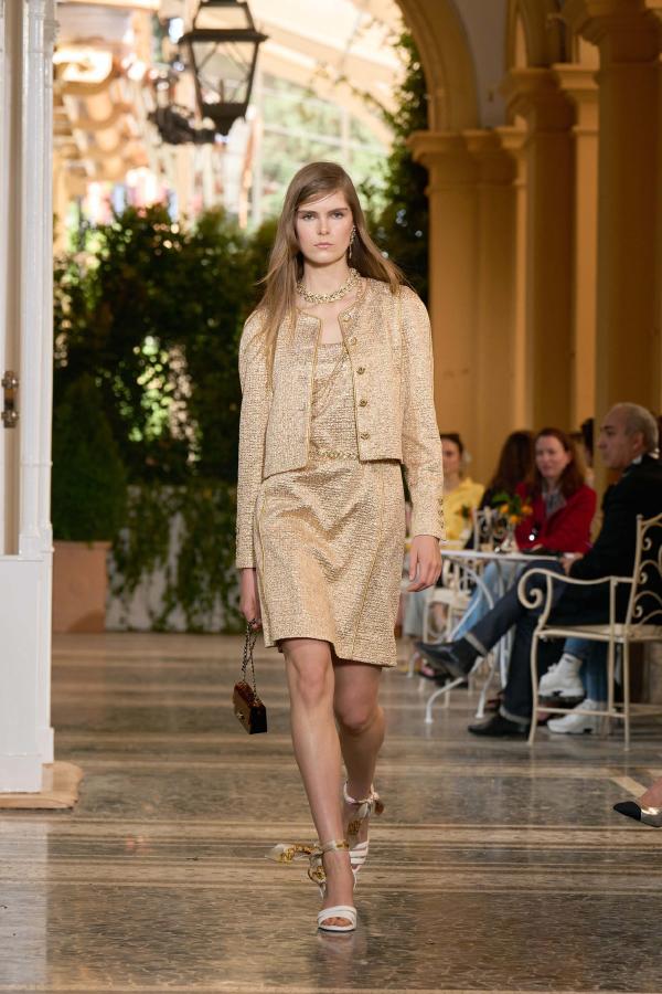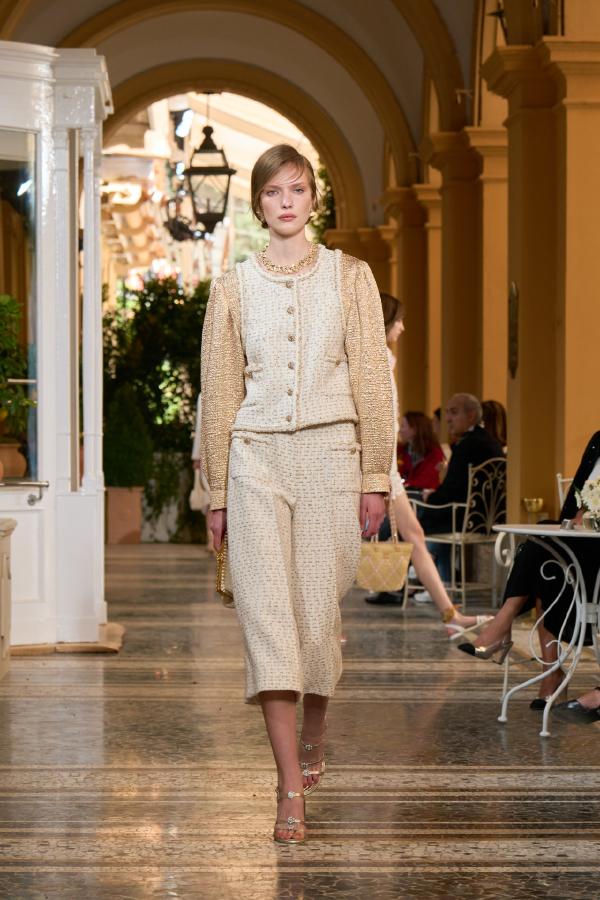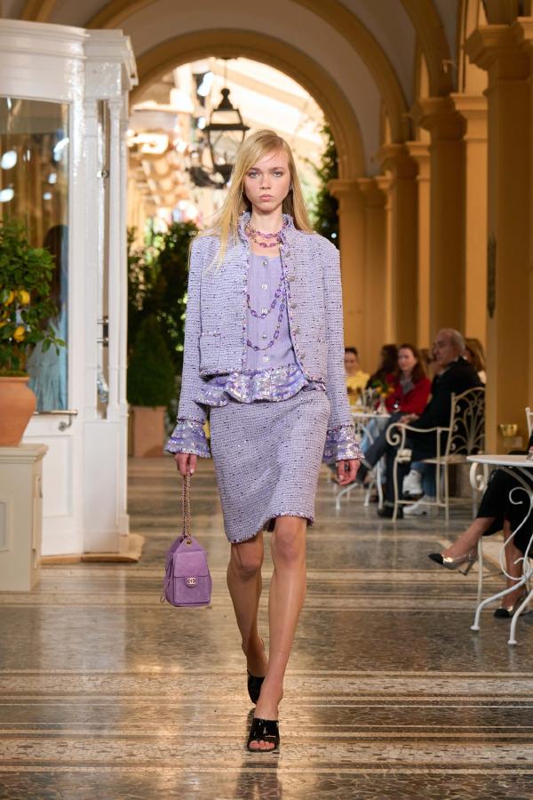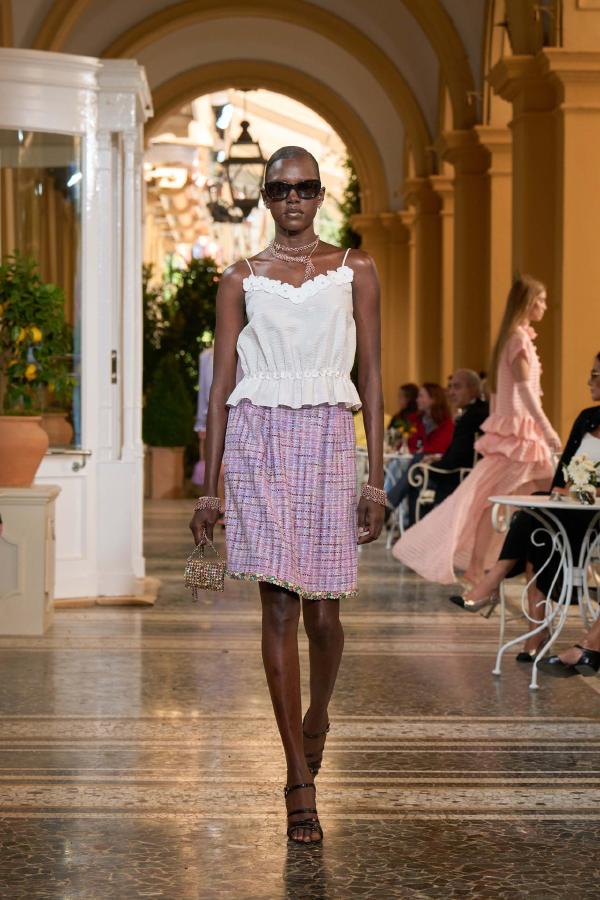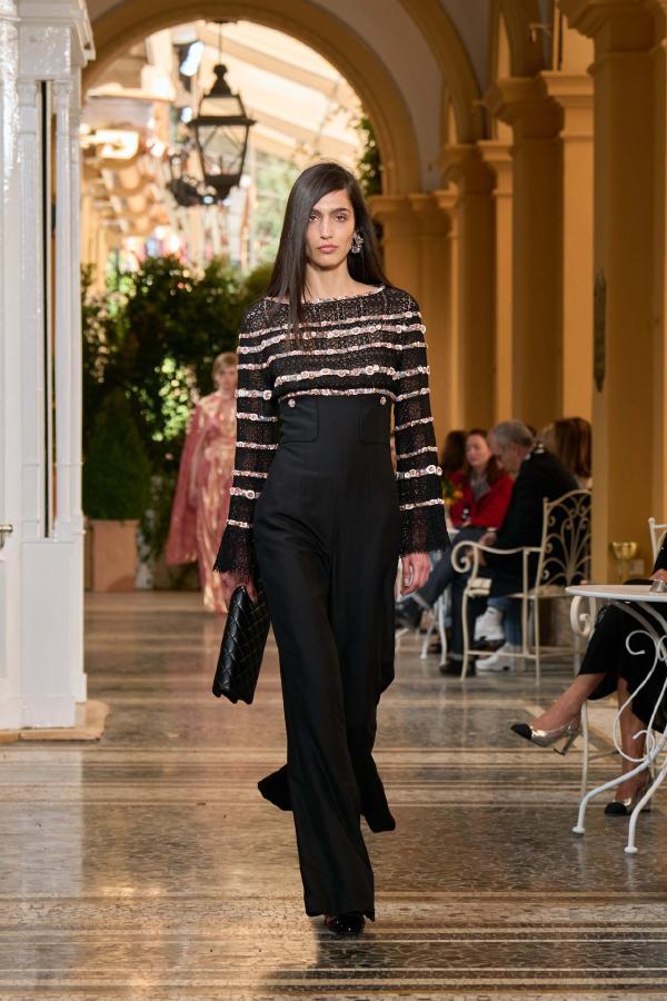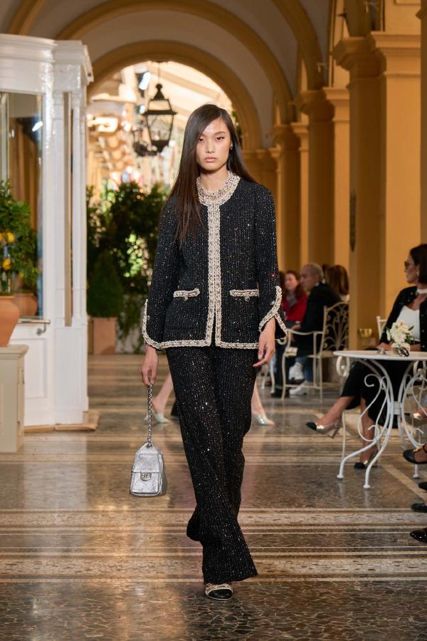 本季以充满想象力的日装为主,阳光下的缤纷配色令人联想到埃斯特别墅墙壁的陶土色调、点缀其壮丽花园的柔和紫藤花色,以及穿插着的九重葛和山茶花色。一套以哑光金色泡泡纱制成的飘逸睡衣套装上闪着微光,大胆的粉色和橙色条纹帆布连体裤搭配以抢眼的同色斗篷。亮片饰边为经典淡紫色粗花呢套装增添了活力,套装内是饰有亮片的飘逸衬衫。流苏、钩针编织和繁复的蕾丝则为短而纤细的廓形增添了质感——就像罗密·施奈德在维斯康蒂执导的《70 年的薄伽丘》中穿的 CHANEL 礼服一样。压轴出场的是一系列纯色礼服,其中的黑色塔夫绸晚礼服散发出颇具戏剧性的光芒。