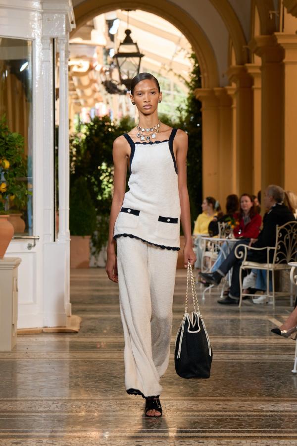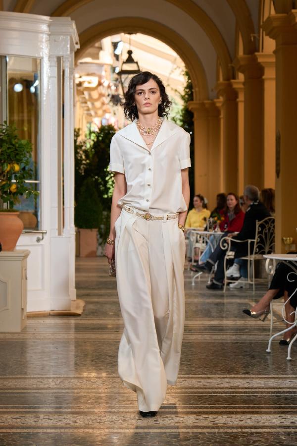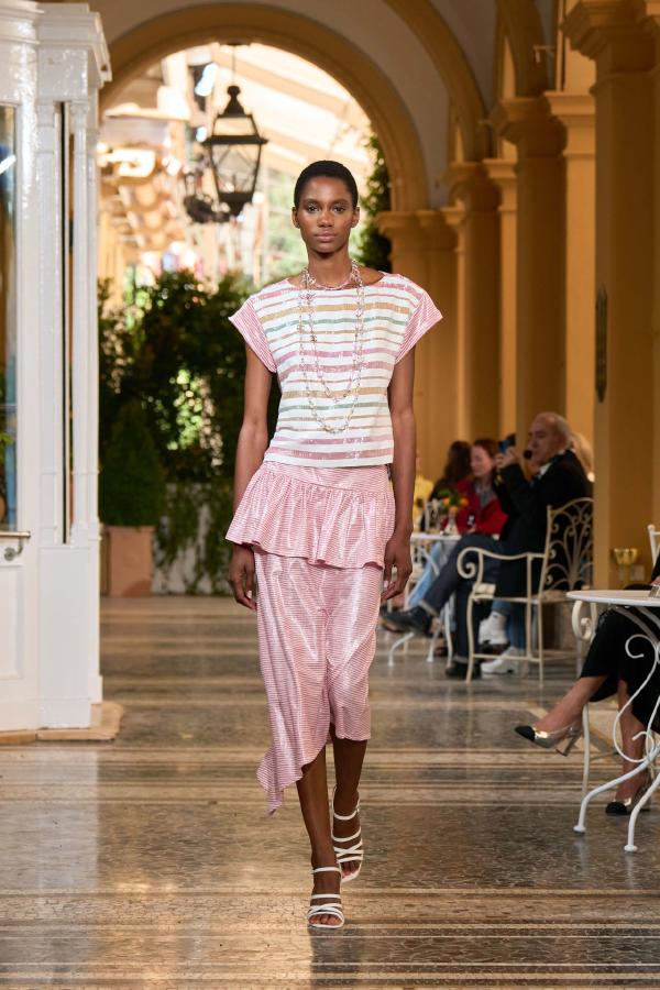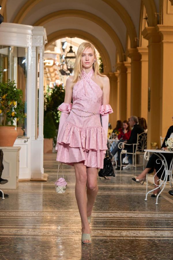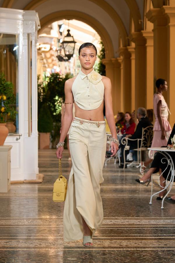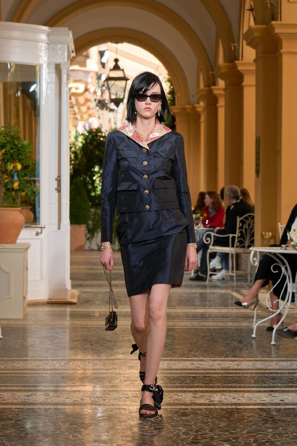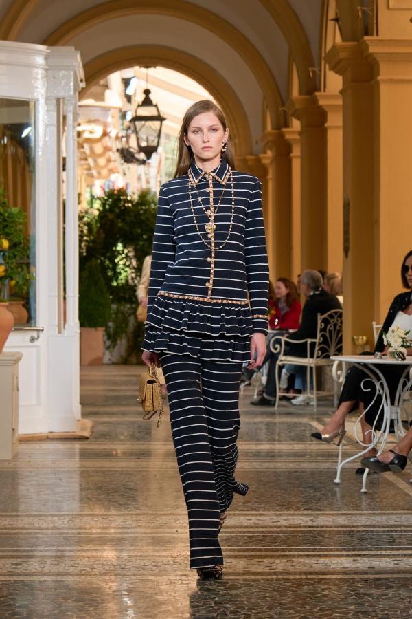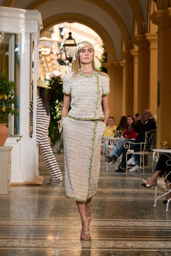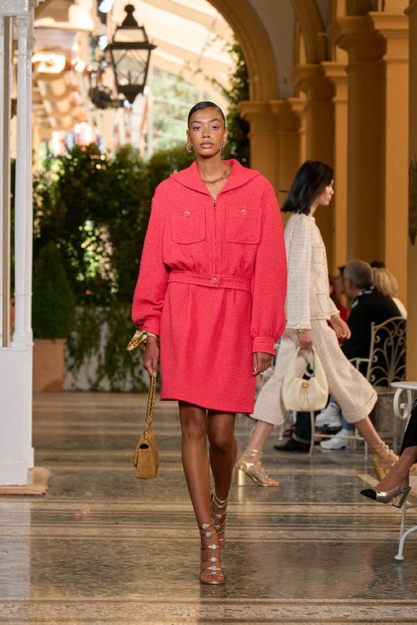 本季以充满想象力的日装为主,阳光下的缤纷配色令人联想到埃斯特别墅墙壁的陶土色调、点缀其壮丽花园的柔和紫藤花色,以及穿插着的九重葛和山茶花色。一套以哑光金色泡泡纱制成的飘逸睡衣套装上闪着微光,大胆的粉色和橙色条纹帆布连体裤搭配以抢眼的同色斗篷。亮片饰边为经典淡紫色粗花呢套装增添了活力,套装内是饰有亮片的飘逸衬衫。流苏、钩针编织和繁复的蕾丝则为短而纤细的廓形增添了质感——就像罗密·施奈德在维斯康蒂执导的《70 年的薄伽丘》中穿的 CHANEL 礼服一样。压轴出场的是一系列纯色礼服,其中的黑色塔夫绸晚礼服散发出颇具戏剧性的光芒。