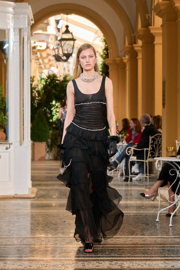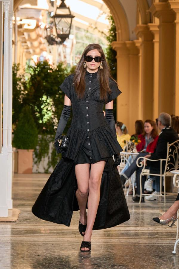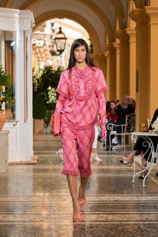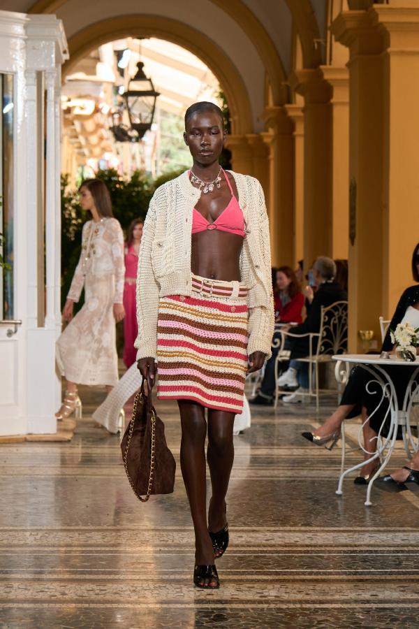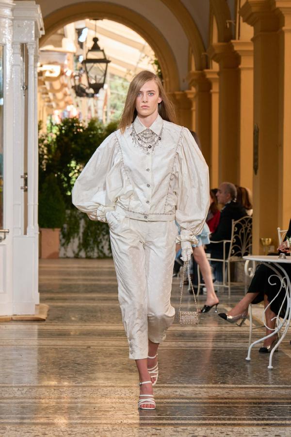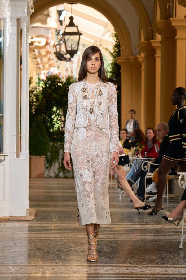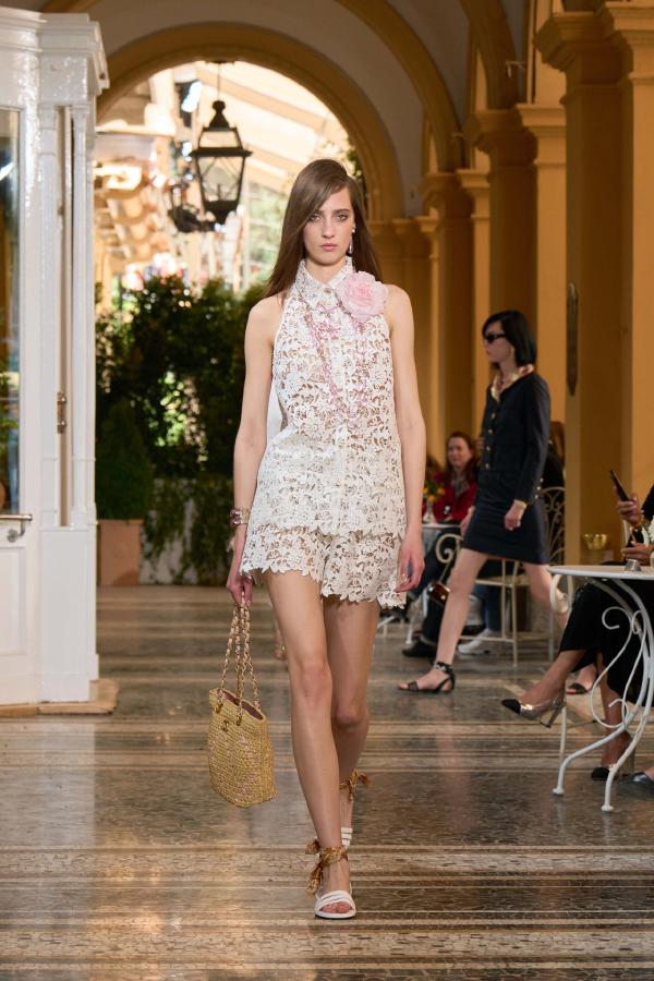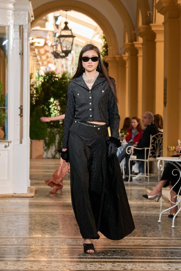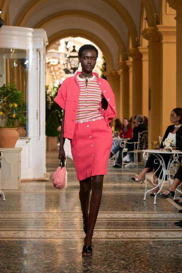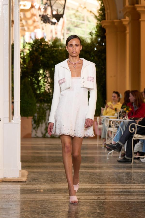 本季以充满想象力的日装为主,阳光下的缤纷配色令人联想到埃斯特别墅墙壁的陶土色调、点缀其壮丽花园的柔和紫藤花色,以及穿插着的九重葛和山茶花色。一套以哑光金色泡泡纱制成的飘逸睡衣套装上闪着微光,大胆的粉色和橙色条纹帆布连体裤搭配以抢眼的同色斗篷。亮片饰边为经典淡紫色粗花呢套装增添了活力,套装内是饰有亮片的飘逸衬衫。流苏、钩针编织和繁复的蕾丝则为短而纤细的廓形增添了质感——就像罗密·施奈德在维斯康蒂执导的《70 年的薄伽丘》中穿的 CHANEL 礼服一样。压轴出场的是一系列纯色礼服,其中的黑色塔夫绸晚礼服散发出颇具戏剧性的光芒。