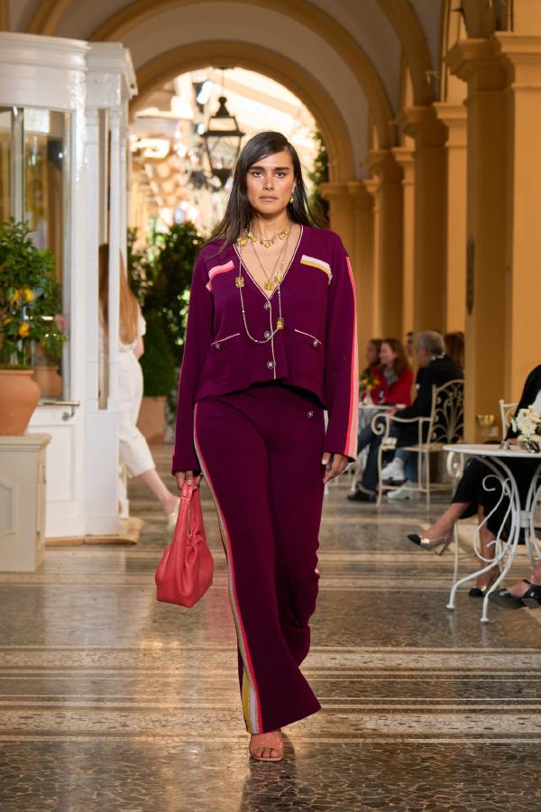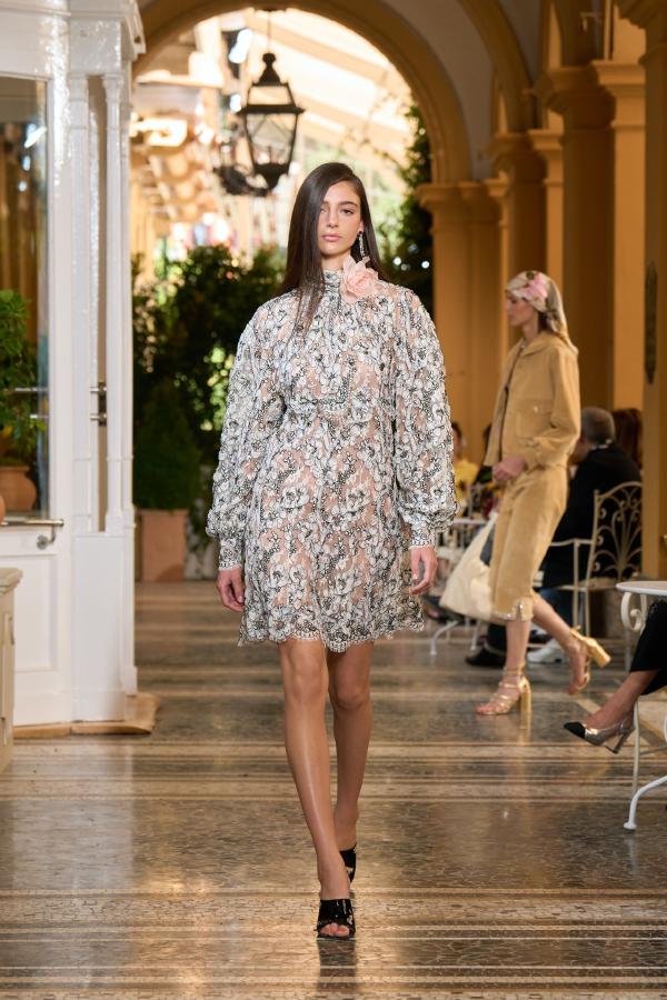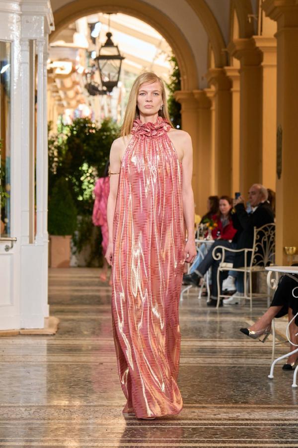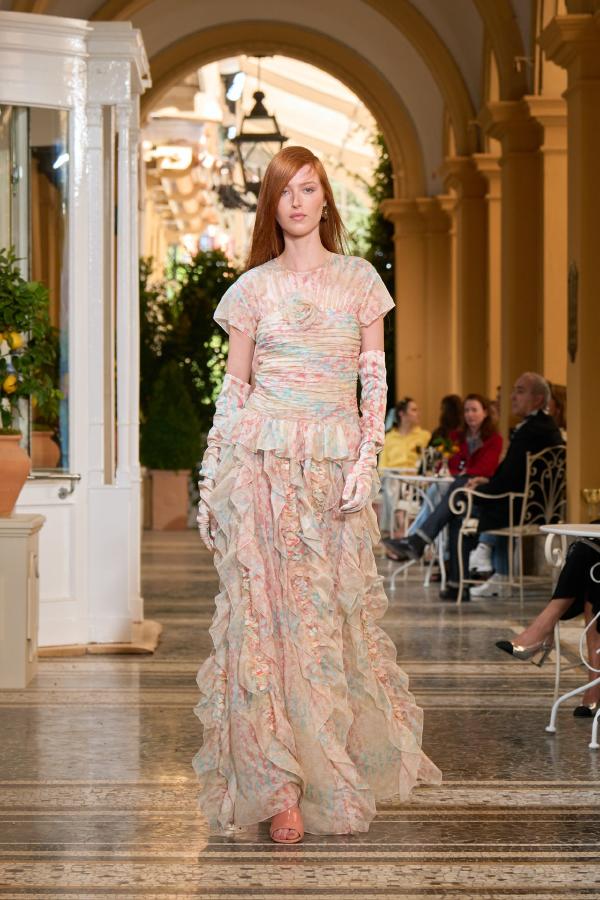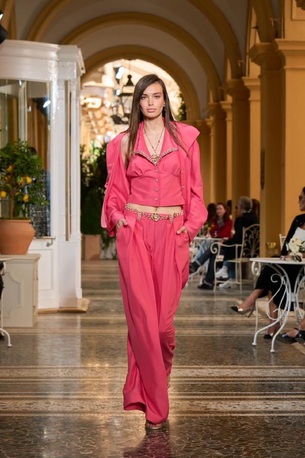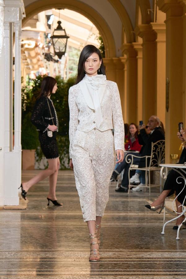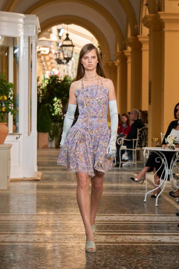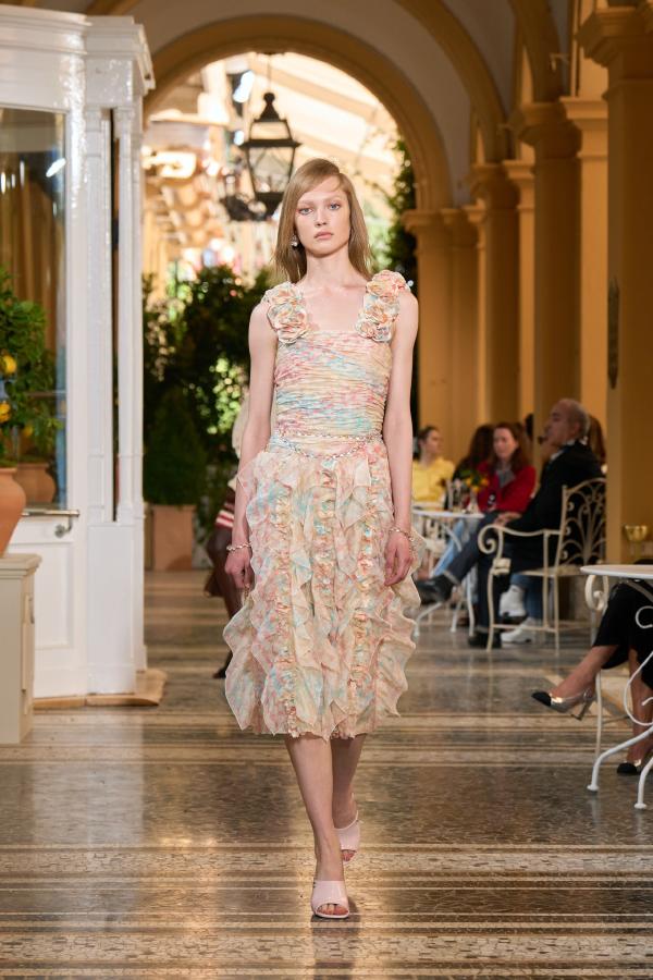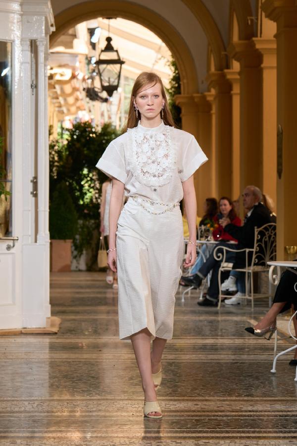 本季以充满想象力的日装为主,阳光下的缤纷配色令人联想到埃斯特别墅墙壁的陶土色调、点缀其壮丽花园的柔和紫藤花色,以及穿插着的九重葛和山茶花色。一套以哑光金色泡泡纱制成的飘逸睡衣套装上闪着微光,大胆的粉色和橙色条纹帆布连体裤搭配以抢眼的同色斗篷。亮片饰边为经典淡紫色粗花呢套装增添了活力,套装内是饰有亮片的飘逸衬衫。流苏、钩针编织和繁复的蕾丝则为短而纤细的廓形增添了质感——就像罗密·施奈德在维斯康蒂执导的《70 年的薄伽丘》中穿的 CHANEL 礼服一样。压轴出场的是一系列纯色礼服,其中的黑色塔夫绸晚礼服散发出颇具戏剧性的光芒。