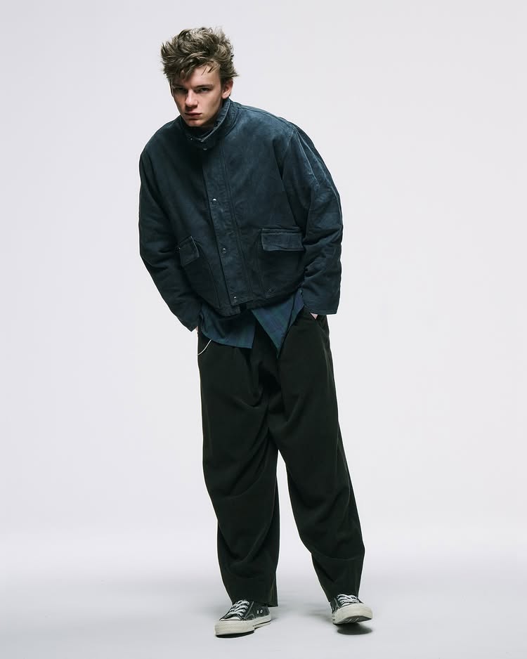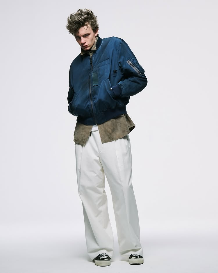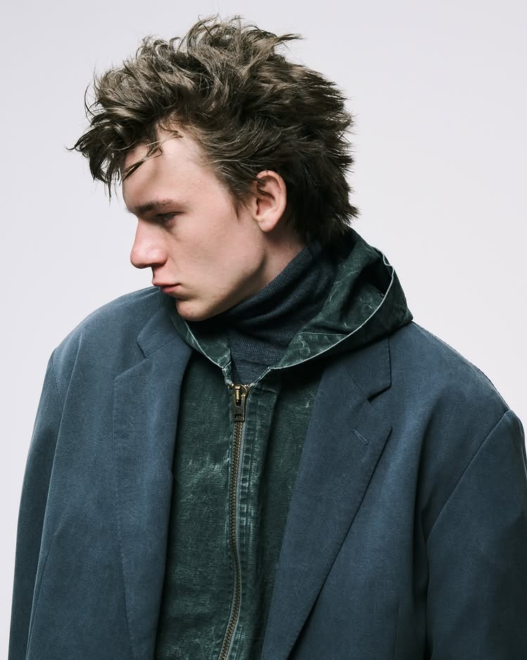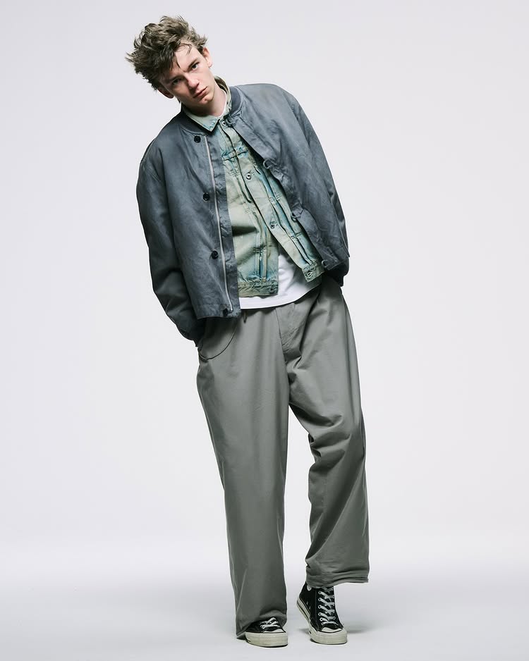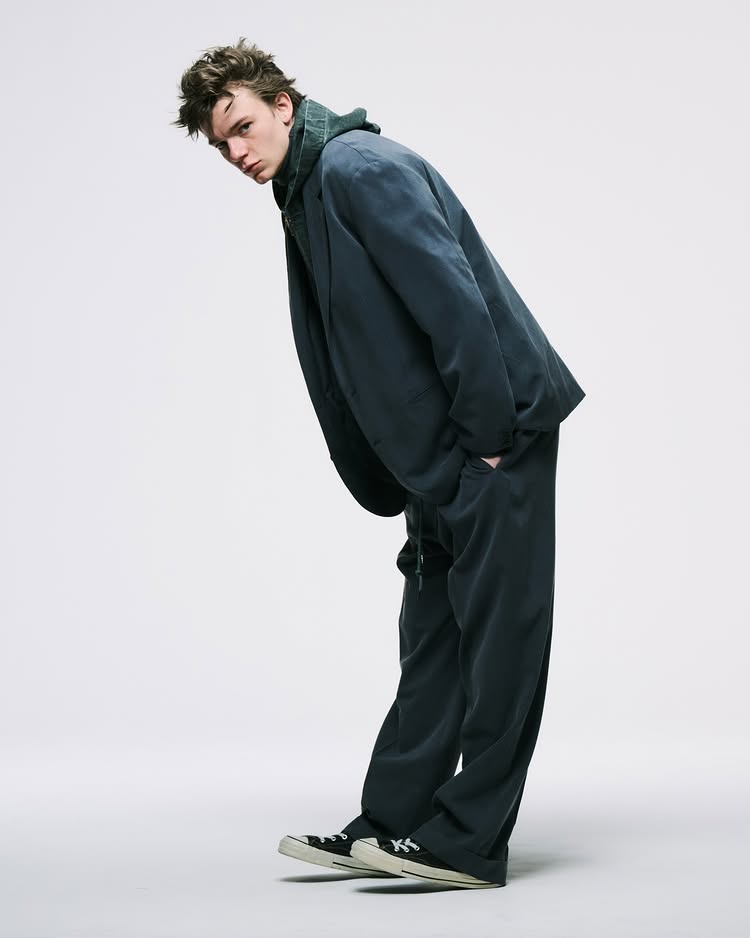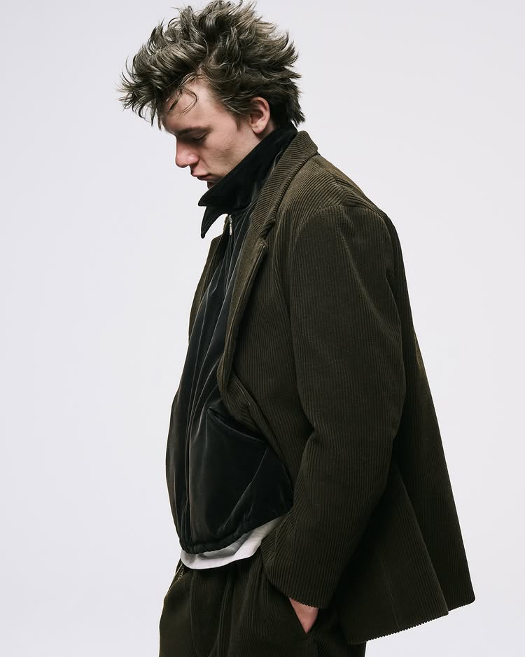 日本新锐男装品牌 A.PRESSE 即将推出 2025 年春夏系列的第二部分。在一组延续品牌一贯极简风格的形象拍摄中,创始人重松一真以擅长的复古语汇与工艺细节,探索运动服、军装与剪裁服饰之间的自然衔接。各类面料交错组合,呈现出一种不经意却经精准拿捏的混搭结构。
