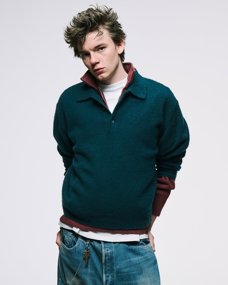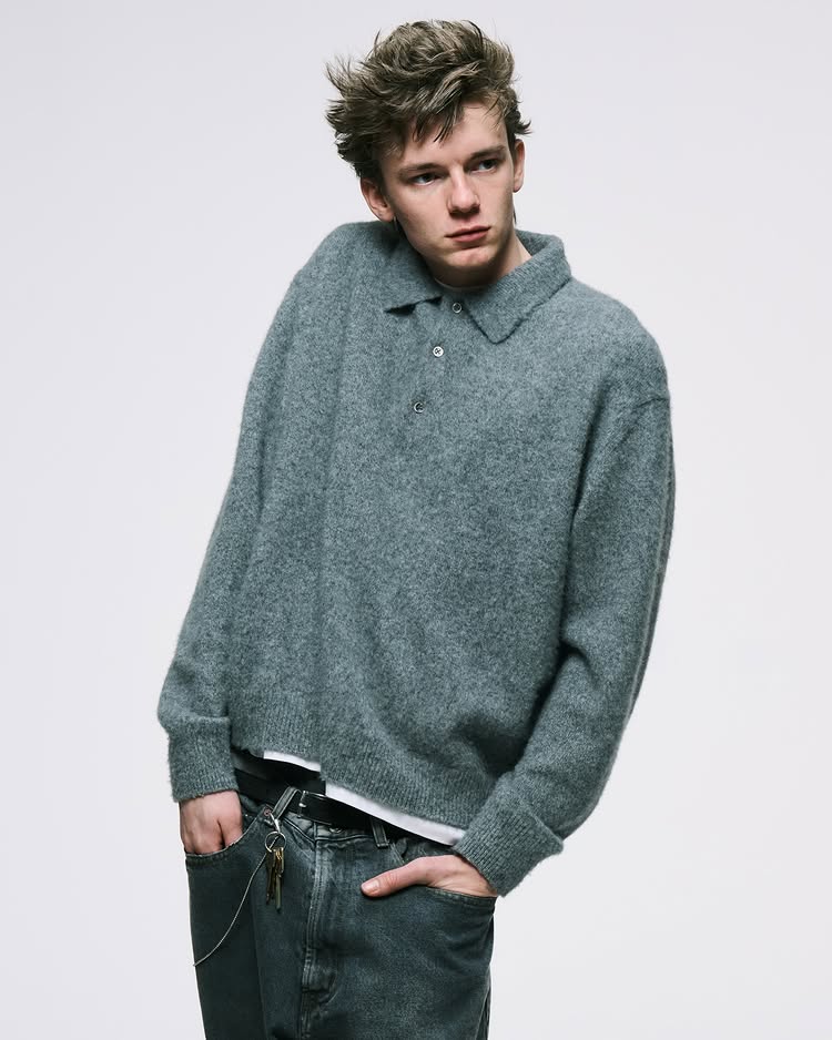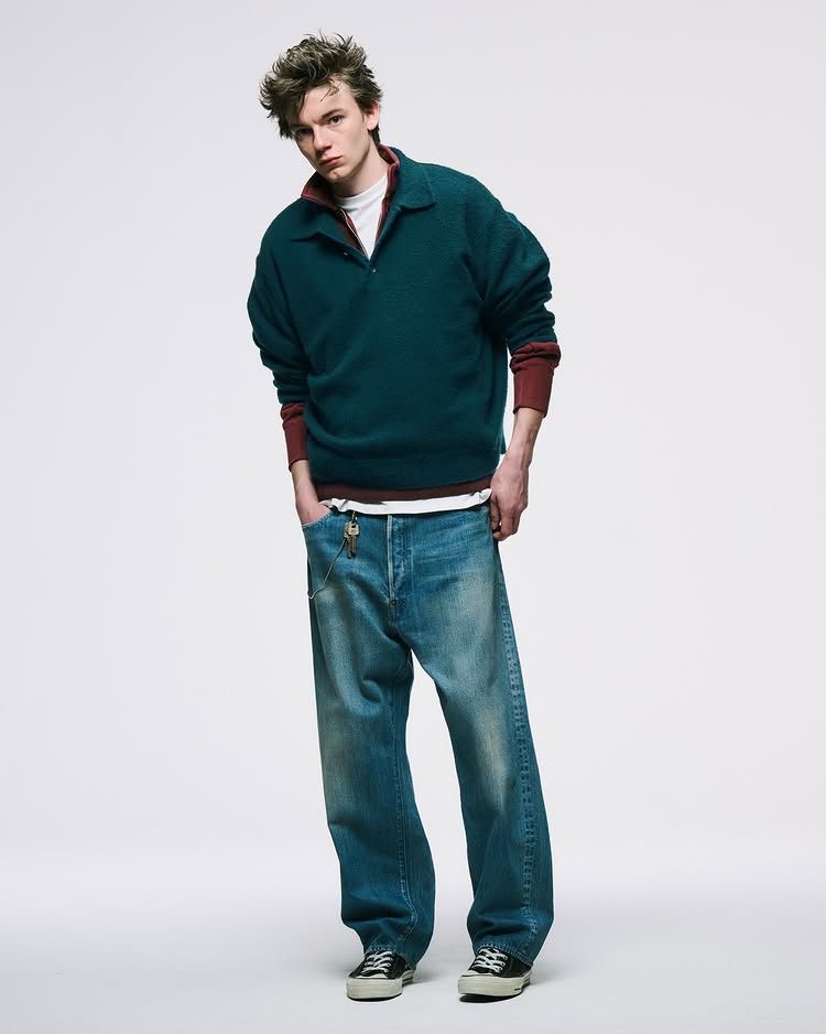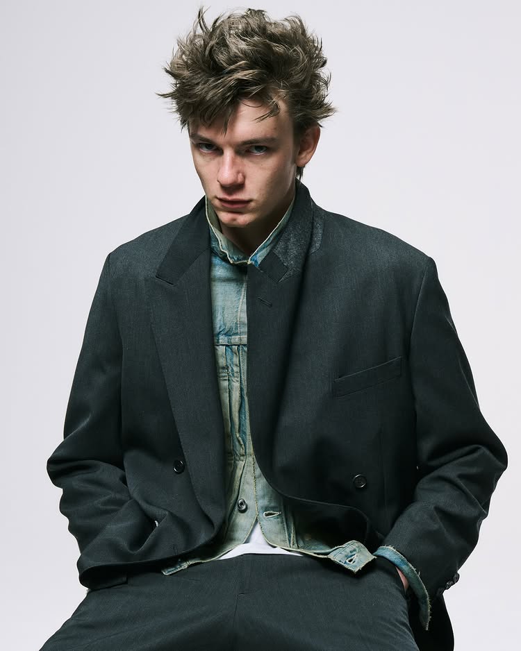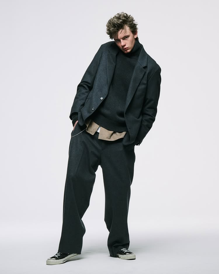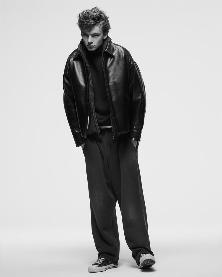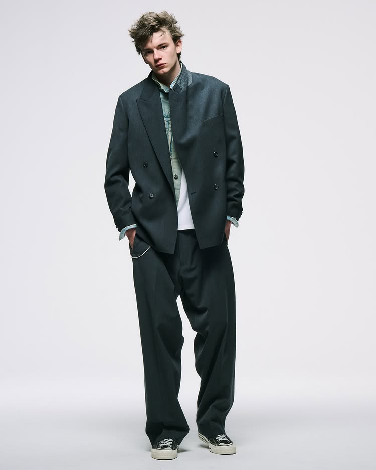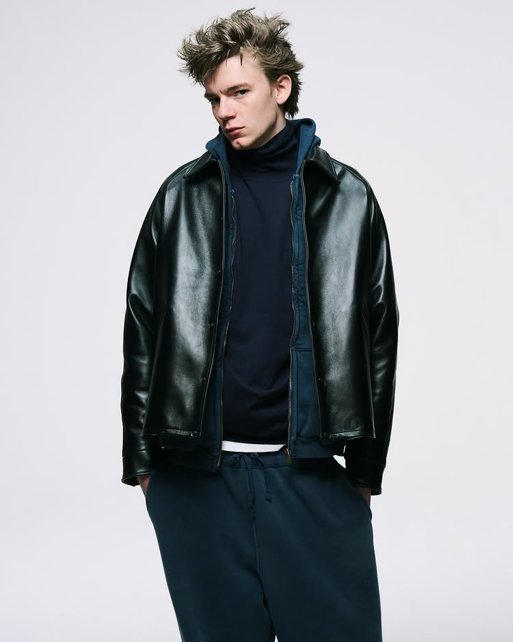 系列中,一件黑色皮革教练夹克搭配羊绒高领衫与复古卫裤,模糊日常与奢华的界限;另一套水洗丝质西装则叠穿海军风连帽衫与羊毛针织,带出错层的视觉语感。品牌也展现了带有复古领口结构的双排扣羊毛西装,与牛仔夹克、白色 T 恤、复古球鞋组合,呼应其对「穿着感」与「结构性」的双重关注。