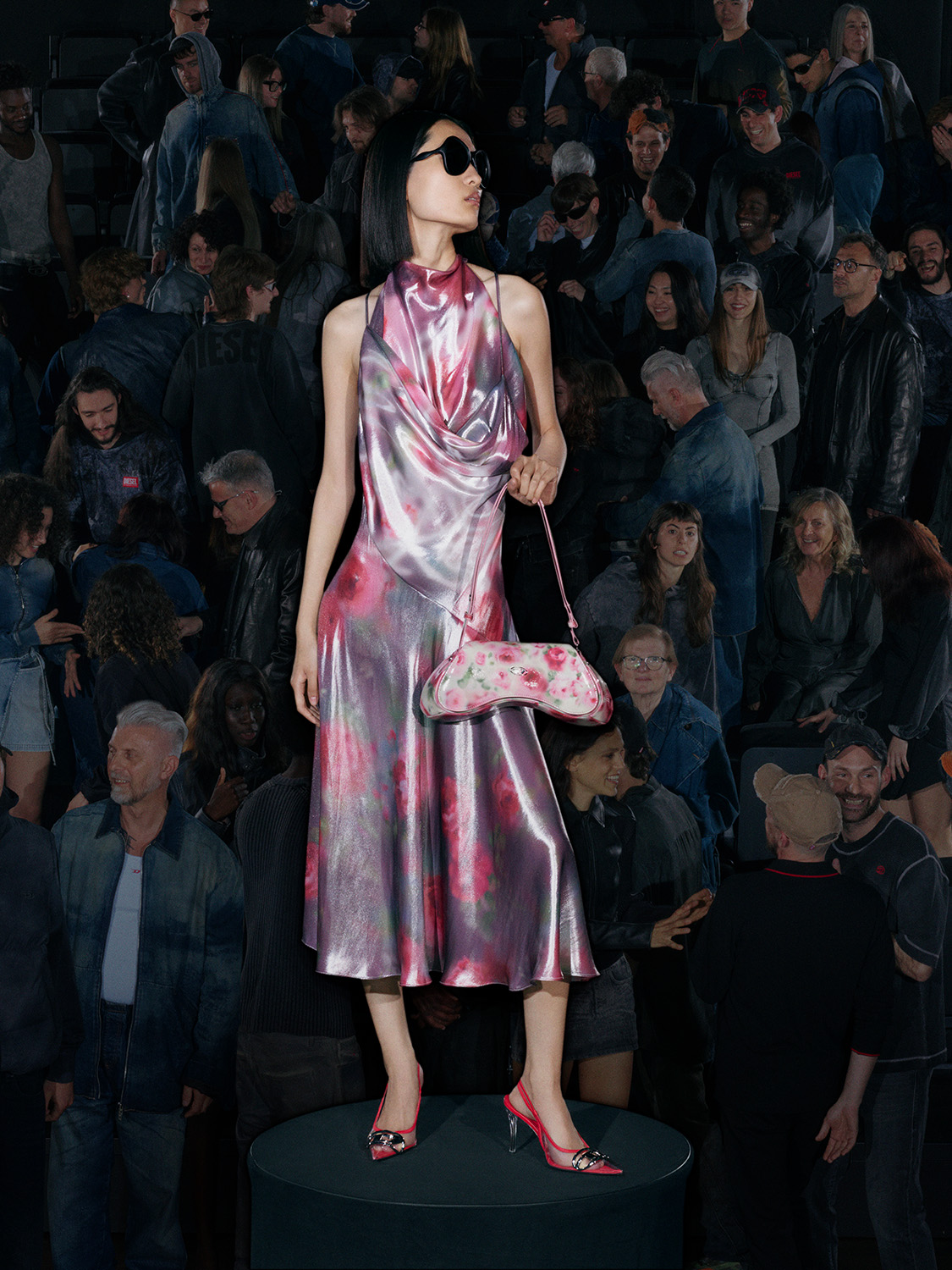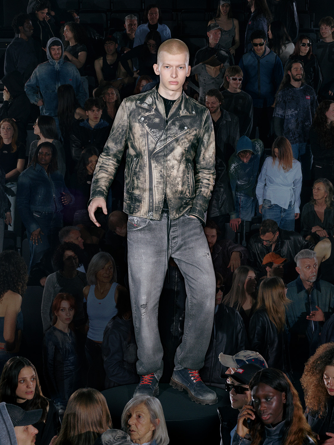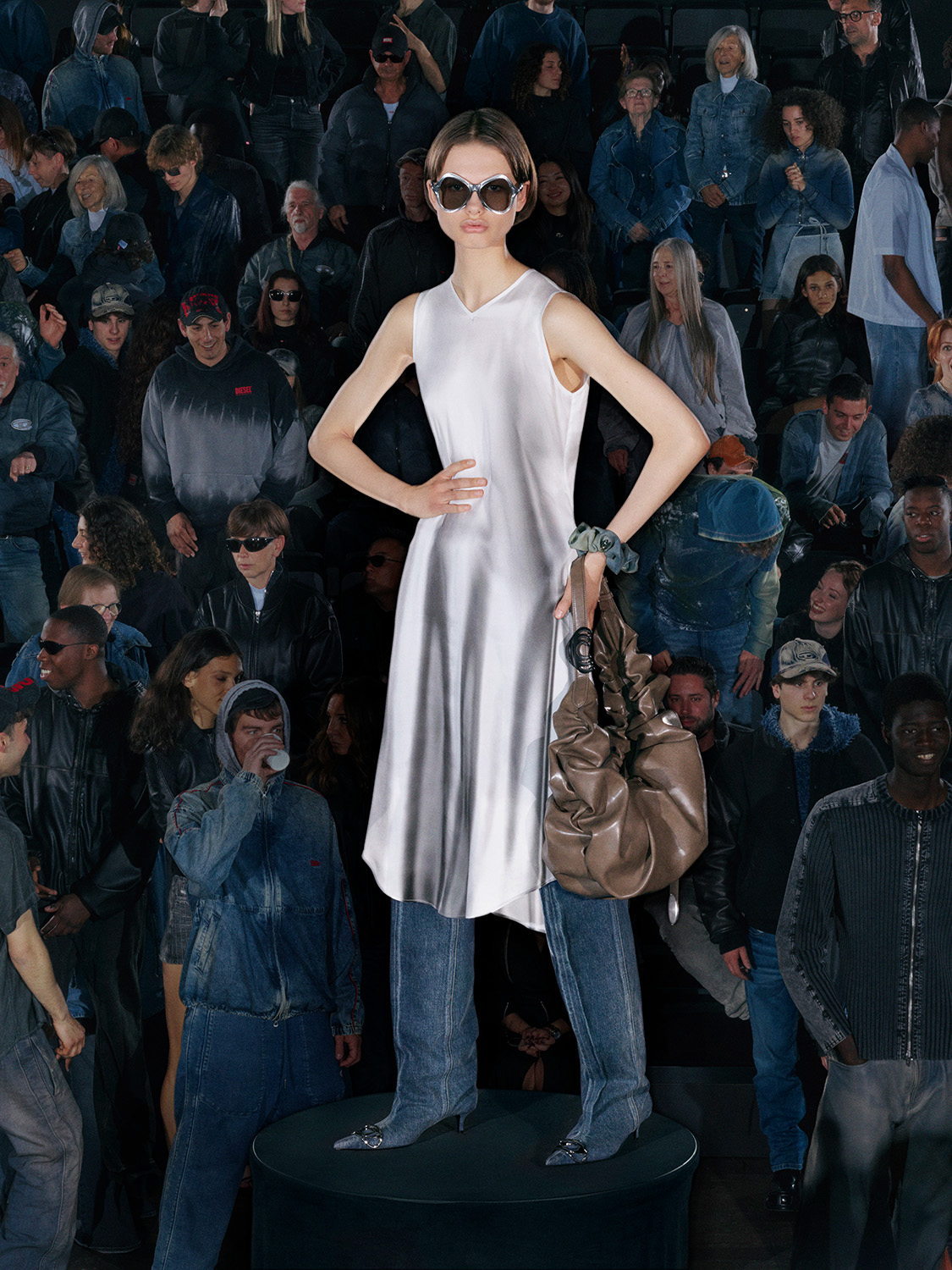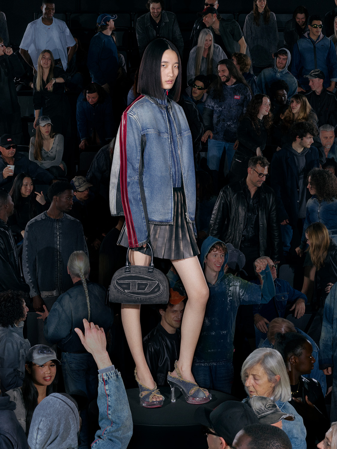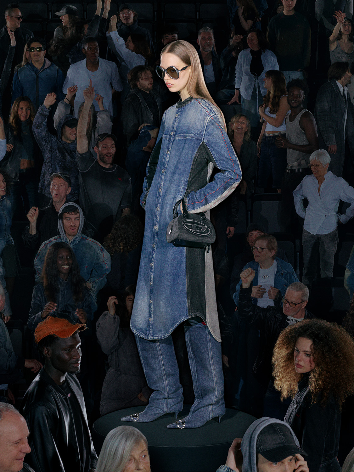 外界都在期待 Glenn Martens 即将发布的 Maison Margiela 高级定制系列之际,他率先发布了为 DIESEL 打造的 2026 早春度假系列。品牌的基因已经在 Glenn Martens 手中悄然发生了改变,从最初专注丹宁材质到如今借助错视牛仔印花拓展了品牌的美学广度。因此我们得以看见氯丁橡胶这一材质,异想天开地融入了本次的产品矩阵——连衣裙、无领外套在水洗丹宁印花的帮助下「伪装」得天衣无缝,而分段式拼接剪裁,则呈现出挺阔的沙漏型轮廓。
