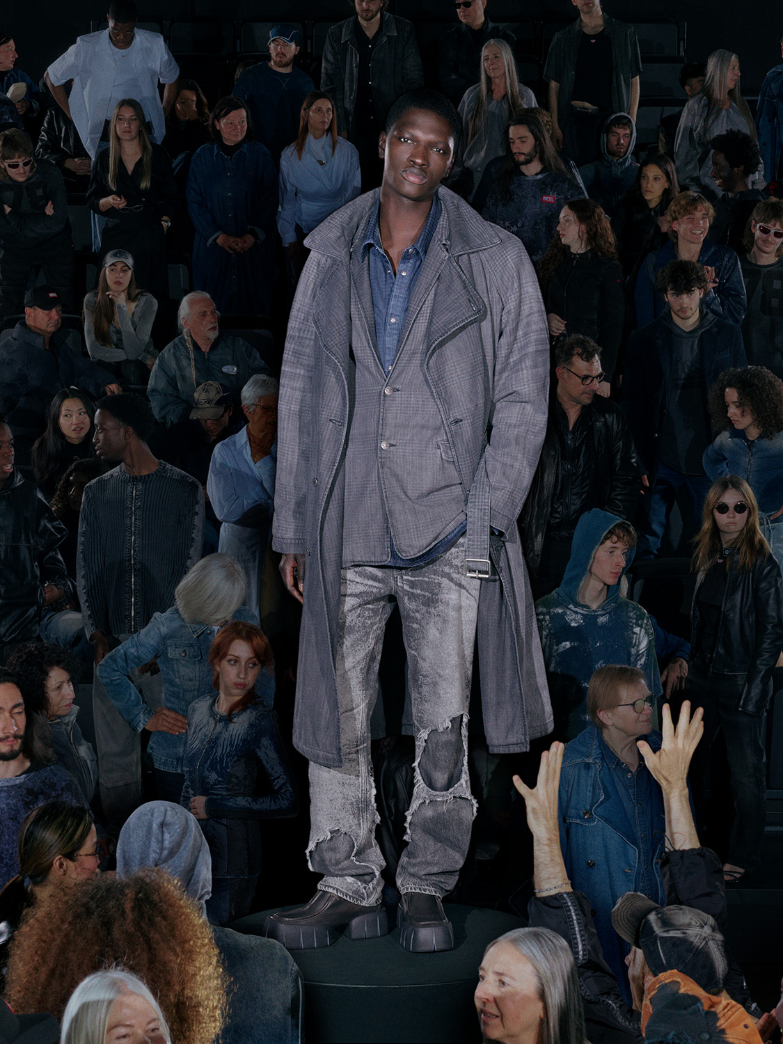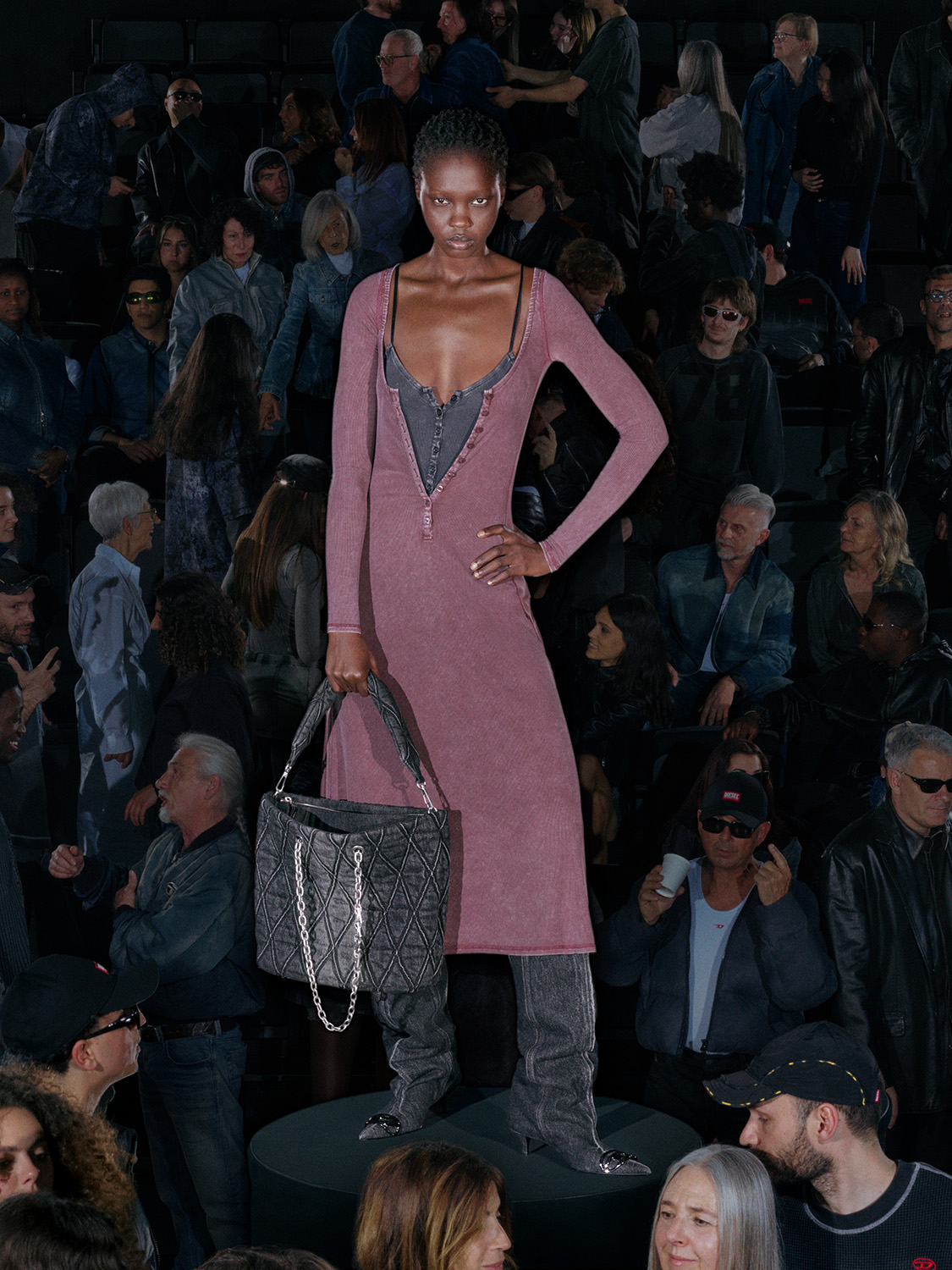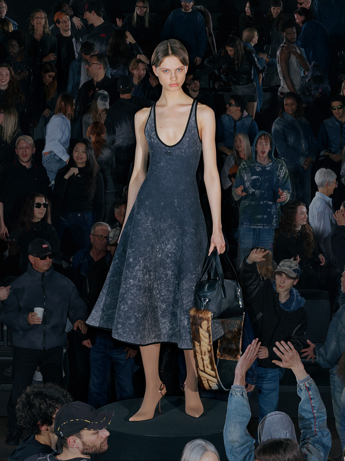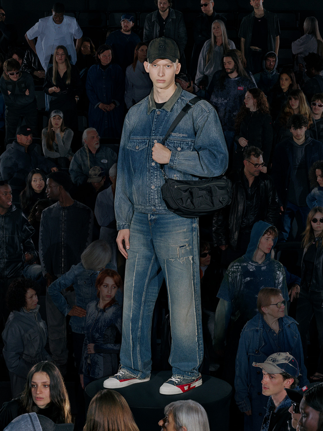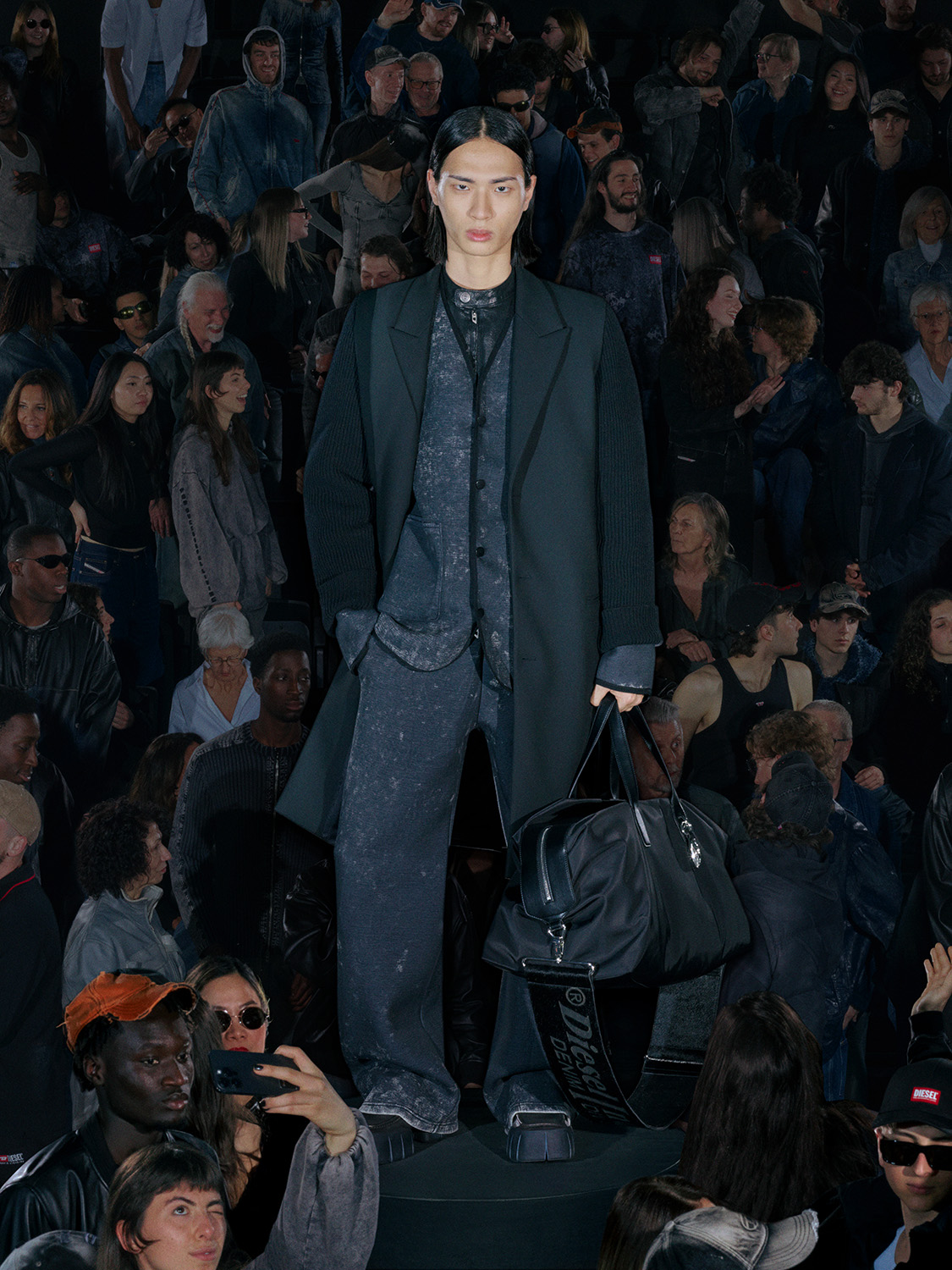 外界都在期待 Glenn Martens 即将发布的 Maison Margiela 高级定制系列之际,他率先发布了为 DIESEL 打造的 2026 早春度假系列。品牌的基因已经在 Glenn Martens 手中悄然发生了改变,从最初专注丹宁材质到如今借助错视牛仔印花拓展了品牌的美学广度。因此我们得以看见氯丁橡胶这一材质,异想天开地融入了本次的产品矩阵——连衣裙、无领外套在水洗丹宁印花的帮助下「伪装」得天衣无缝,而分段式拼接剪裁,则呈现出挺阔的沙漏型轮廓。