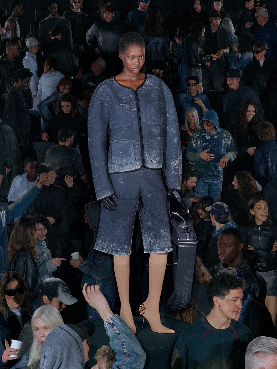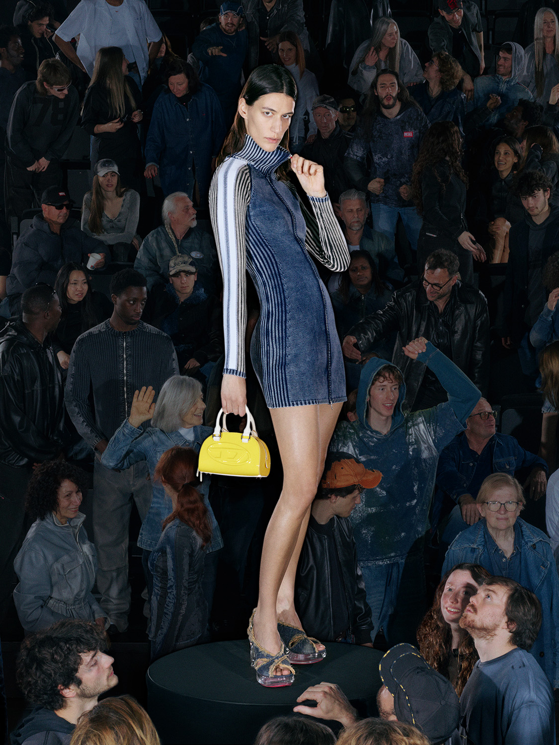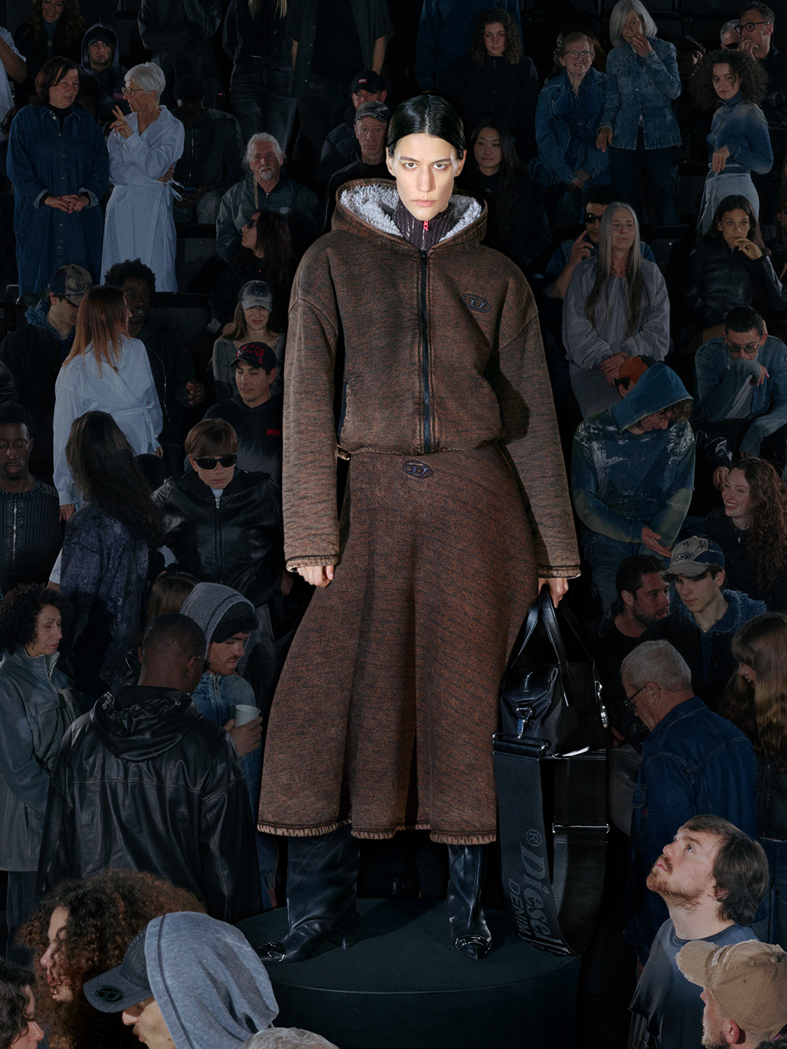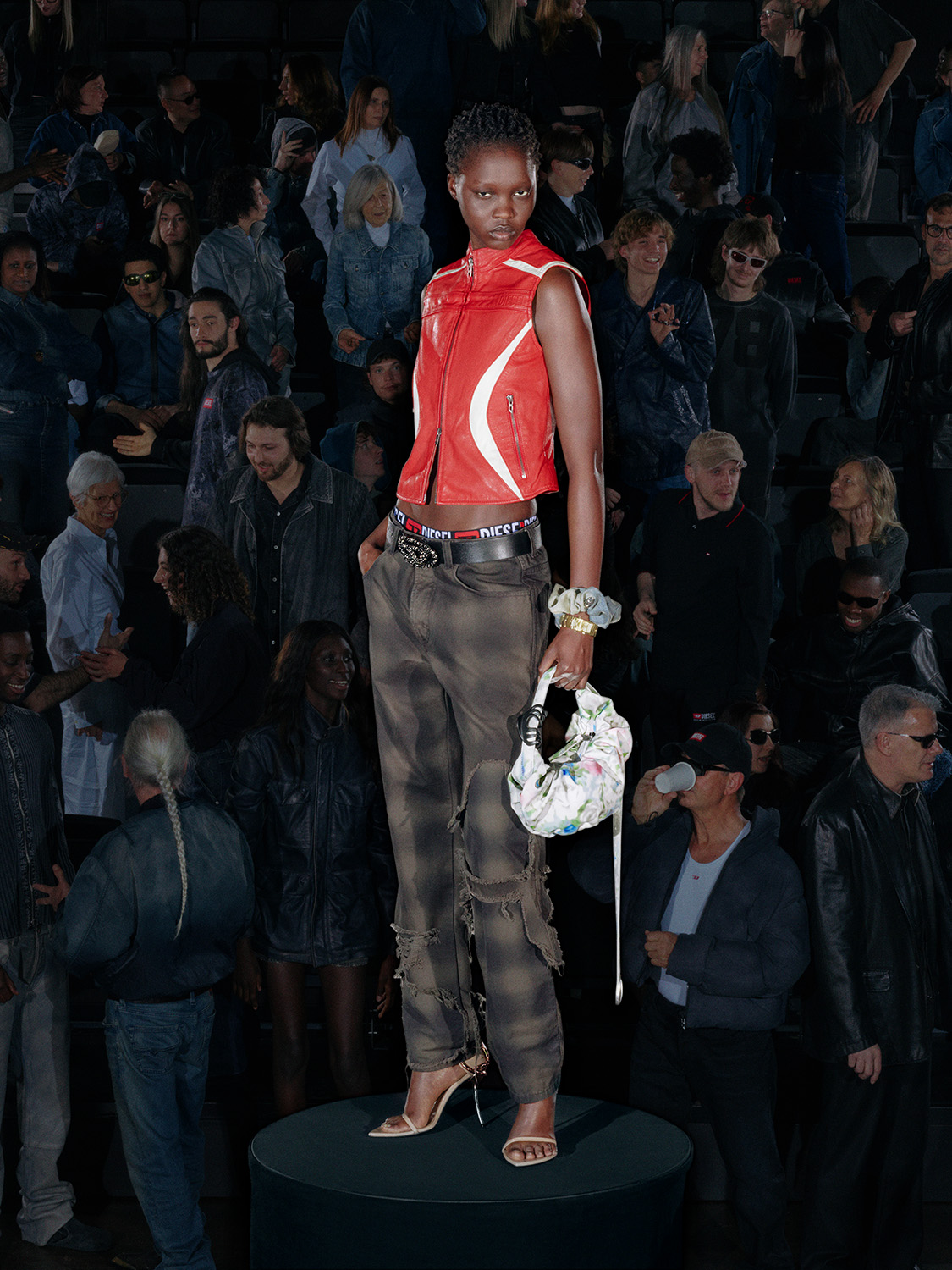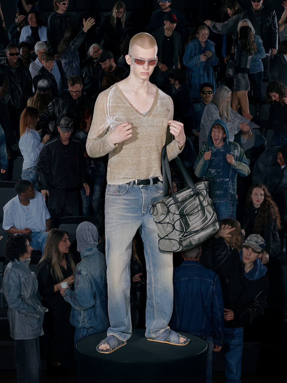 外界都在期待 Glenn Martens 即将发布的 Maison Margiela 高级定制系列之际,他率先发布了为 DIESEL 打造的 2026 早春度假系列。品牌的基因已经在 Glenn Martens 手中悄然发生了改变,从最初专注丹宁材质到如今借助错视牛仔印花拓展了品牌的美学广度。因此我们得以看见氯丁橡胶这一材质,异想天开地融入了本次的产品矩阵——连衣裙、无领外套在水洗丹宁印花的帮助下「伪装」得天衣无缝,而分段式拼接剪裁,则呈现出挺阔的沙漏型轮廓。