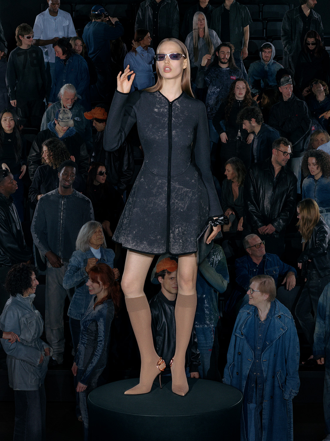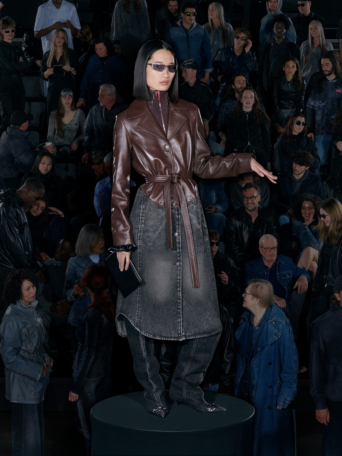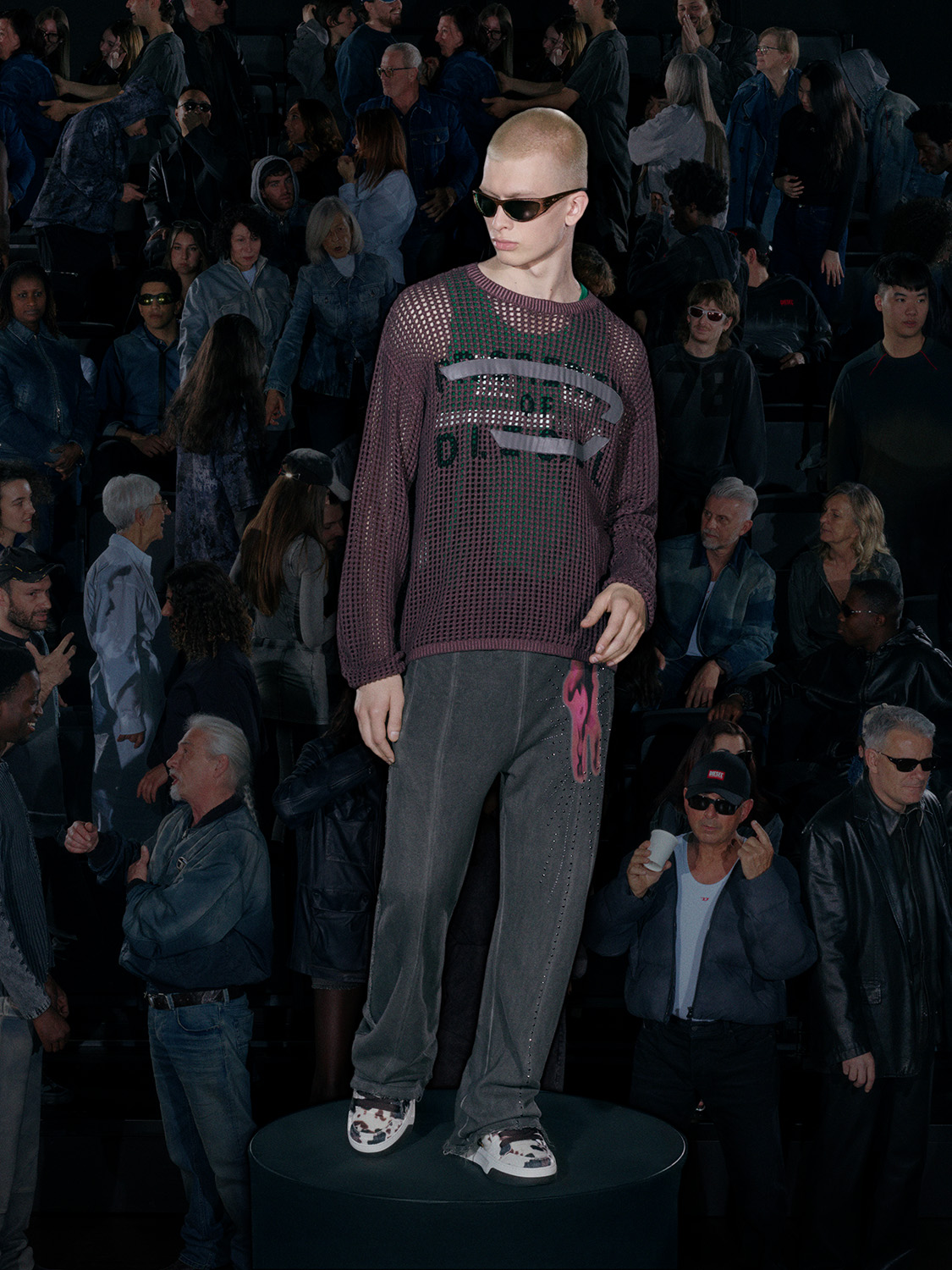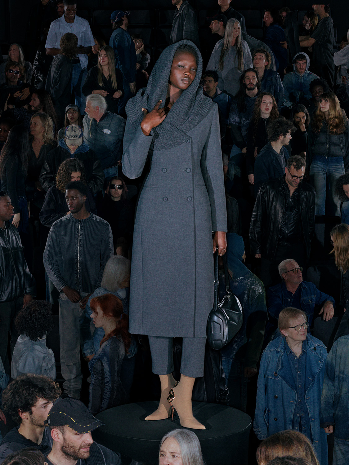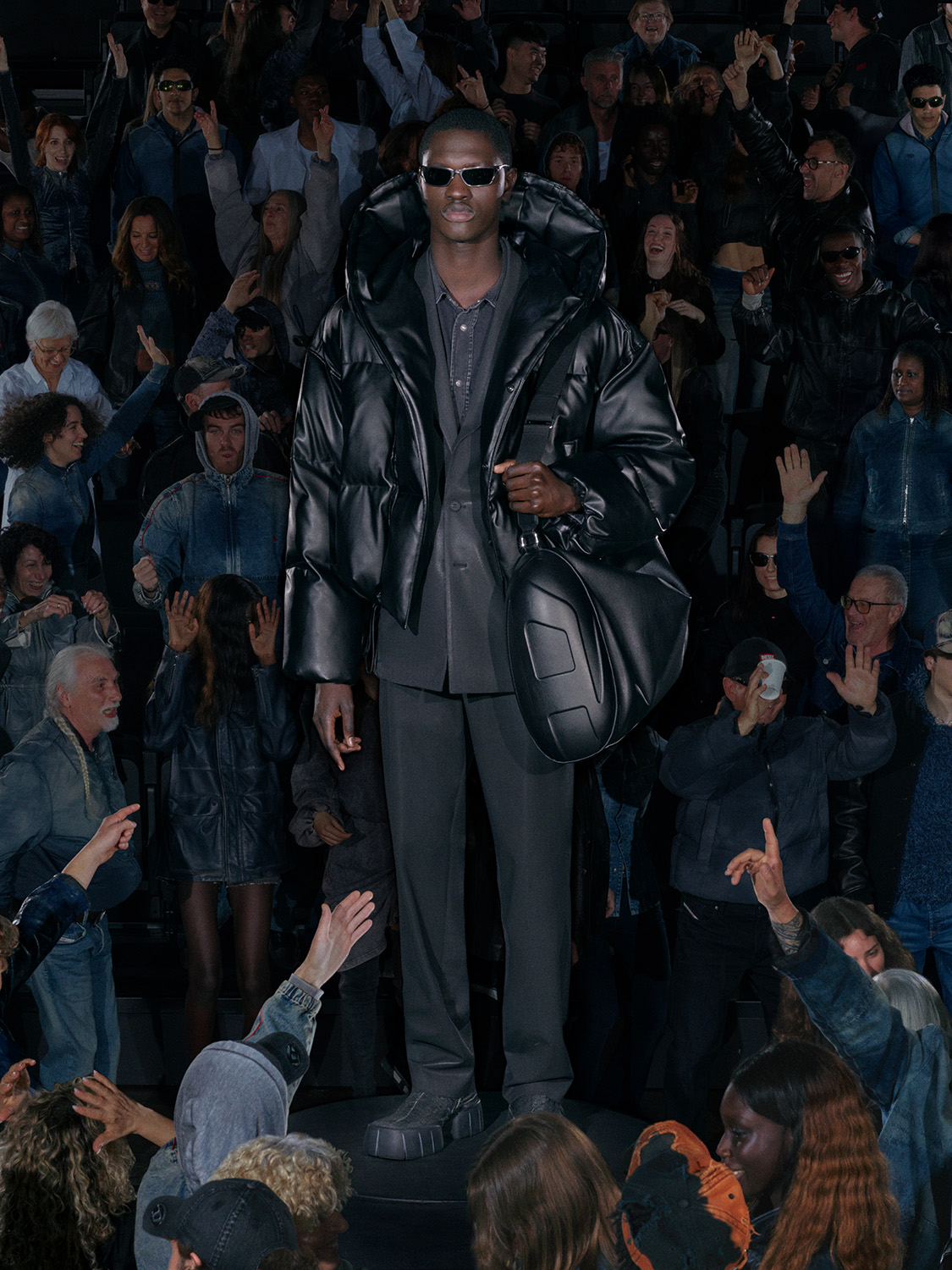 外界都在期待 Glenn Martens 即将发布的 Maison Margiela 高级定制系列之际,他率先发布了为 DIESEL 打造的 2026 早春度假系列。品牌的基因已经在 Glenn Martens 手中悄然发生了改变,从最初专注丹宁材质到如今借助错视牛仔印花拓展了品牌的美学广度。因此我们得以看见氯丁橡胶这一材质,异想天开地融入了本次的产品矩阵——连衣裙、无领外套在水洗丹宁印花的帮助下「伪装」得天衣无缝,而分段式拼接剪裁,则呈现出挺阔的沙漏型轮廓。
