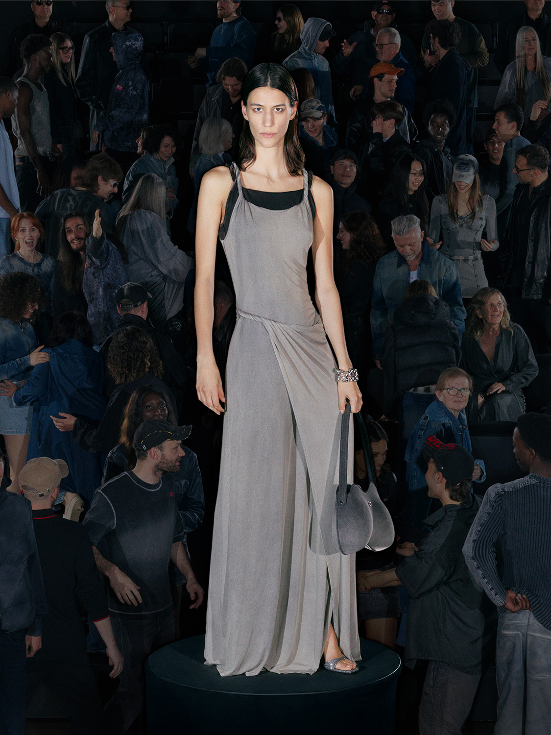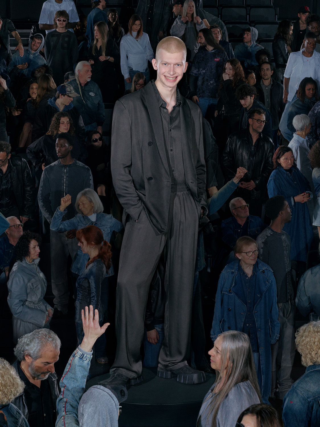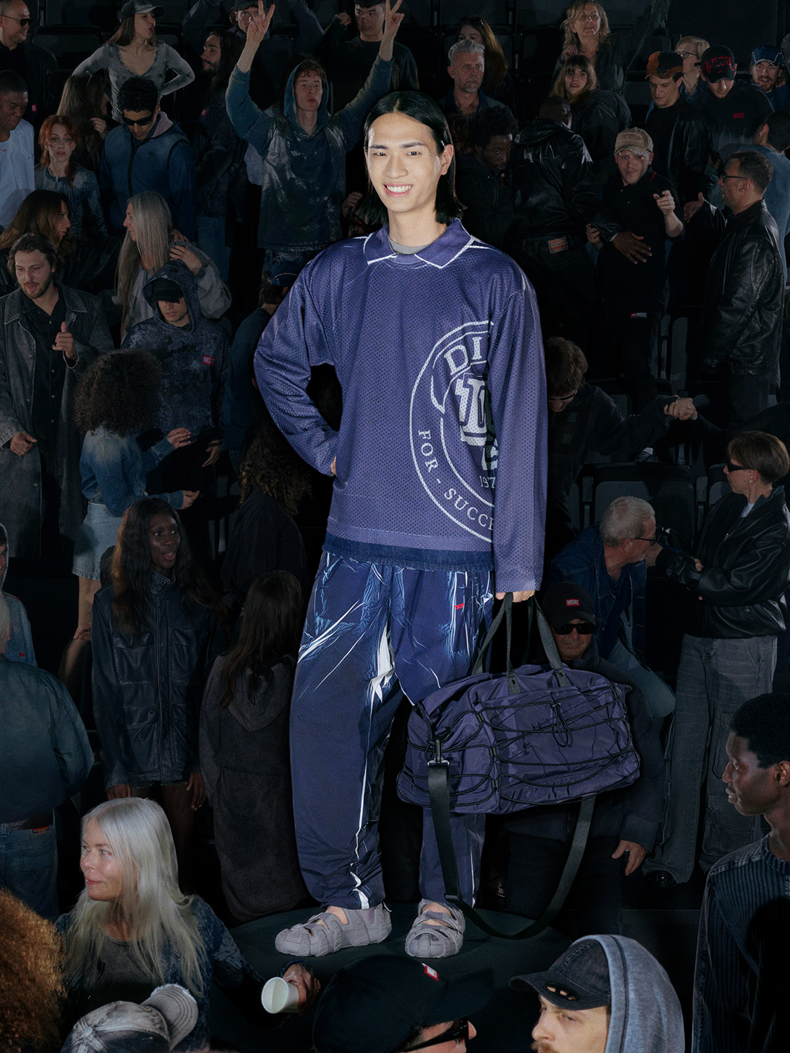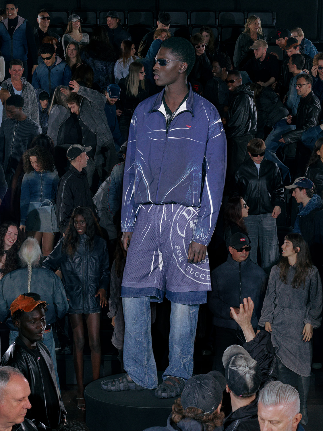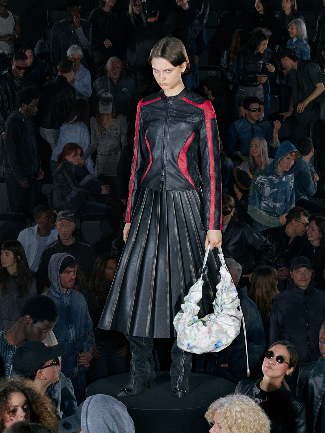 外界都在期待 Glenn Martens 即将发布的 Maison Margiela 高级定制系列之际,他率先发布了为 DIESEL 打造的 2026 早春度假系列。品牌的基因已经在 Glenn Martens 手中悄然发生了改变,从最初专注丹宁材质到如今借助错视牛仔印花拓展了品牌的美学广度。因此我们得以看见氯丁橡胶这一材质,异想天开地融入了本次的产品矩阵——连衣裙、无领外套在水洗丹宁印花的帮助下「伪装」得天衣无缝,而分段式拼接剪裁,则呈现出挺阔的沙漏型轮廓。