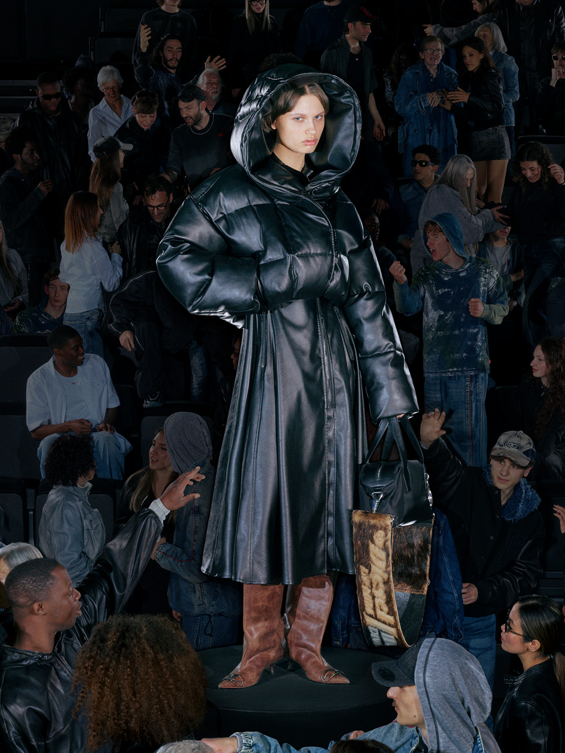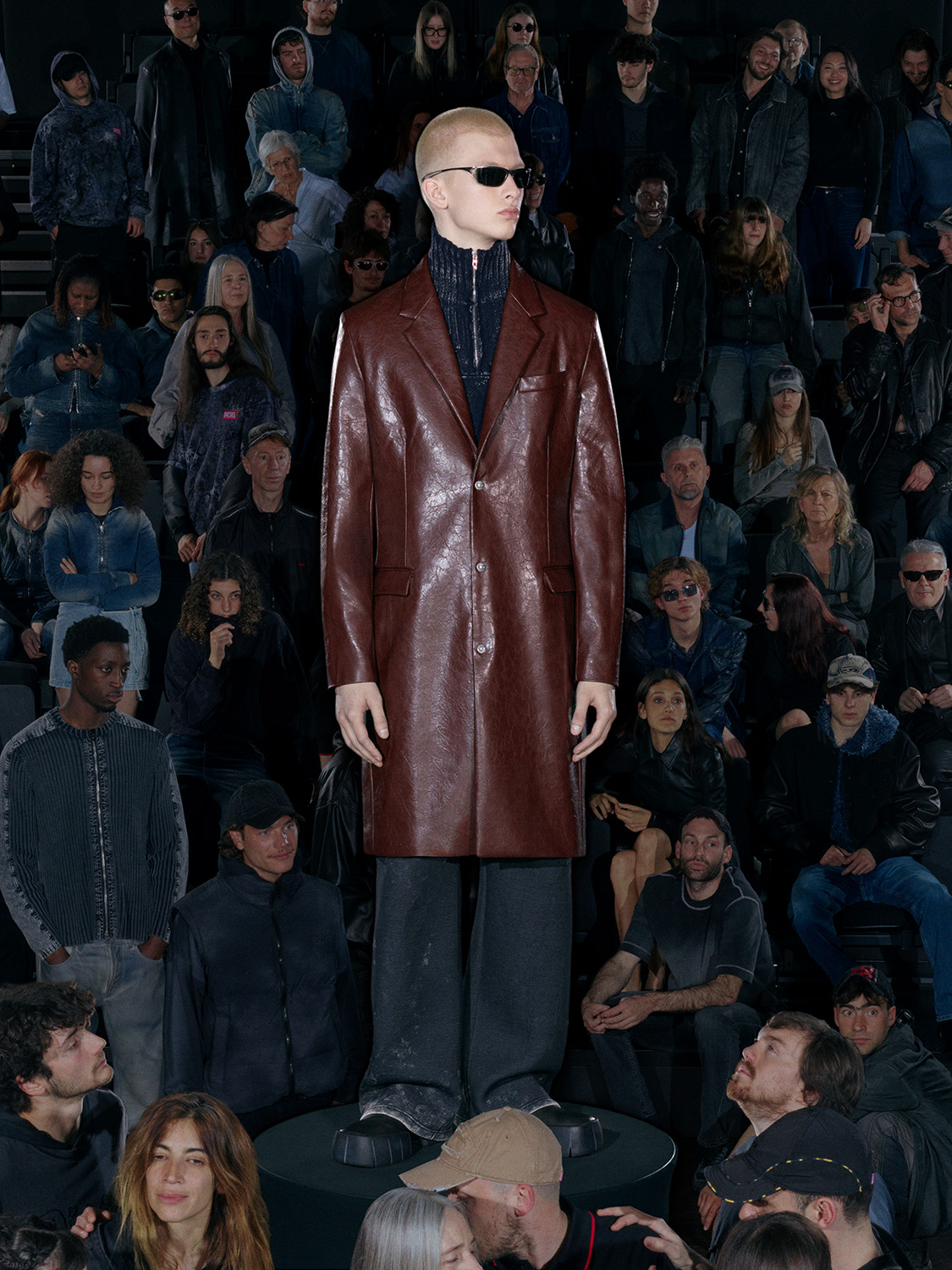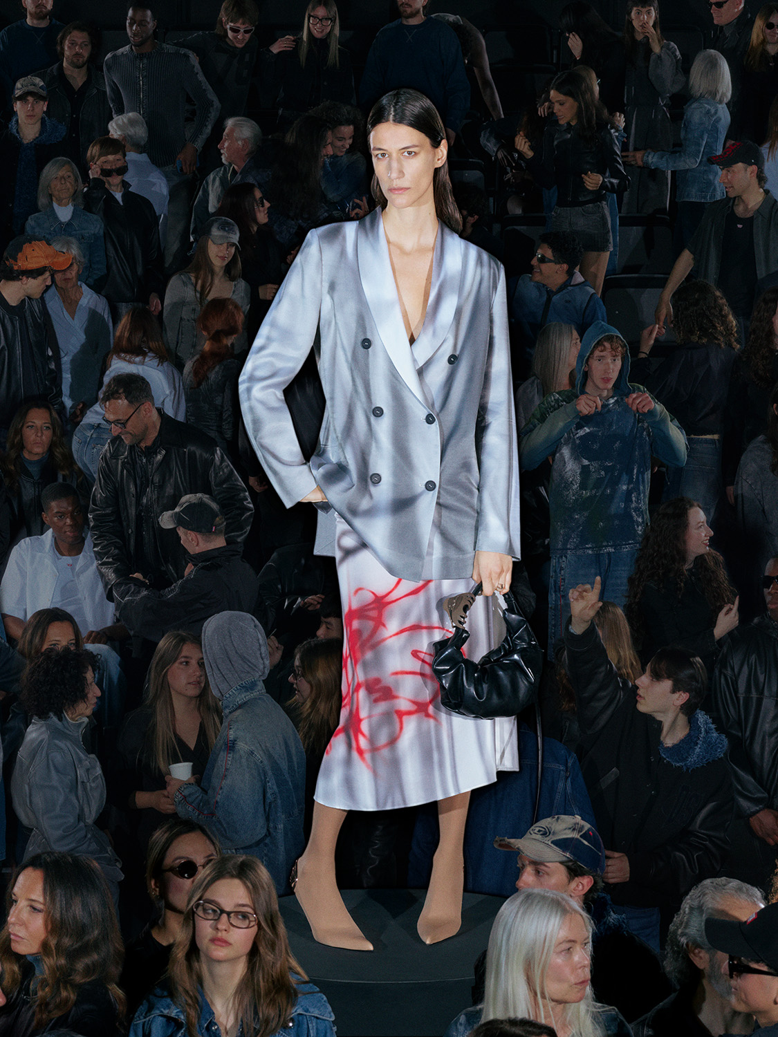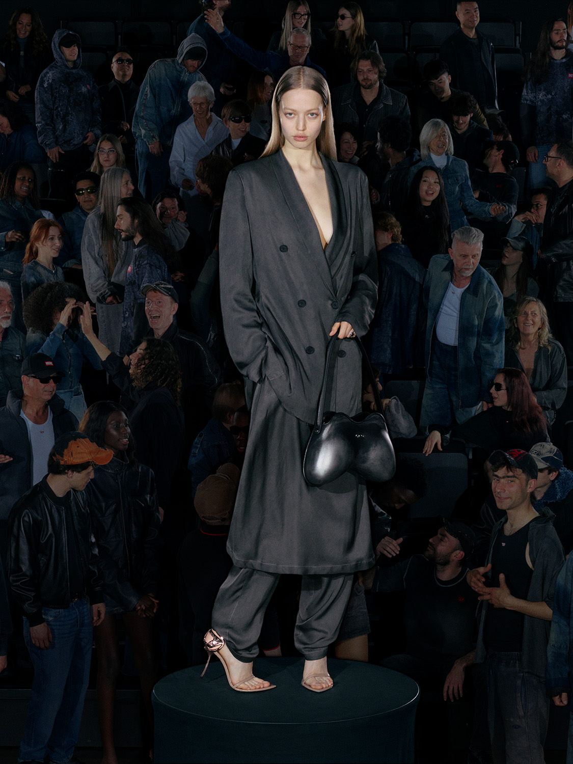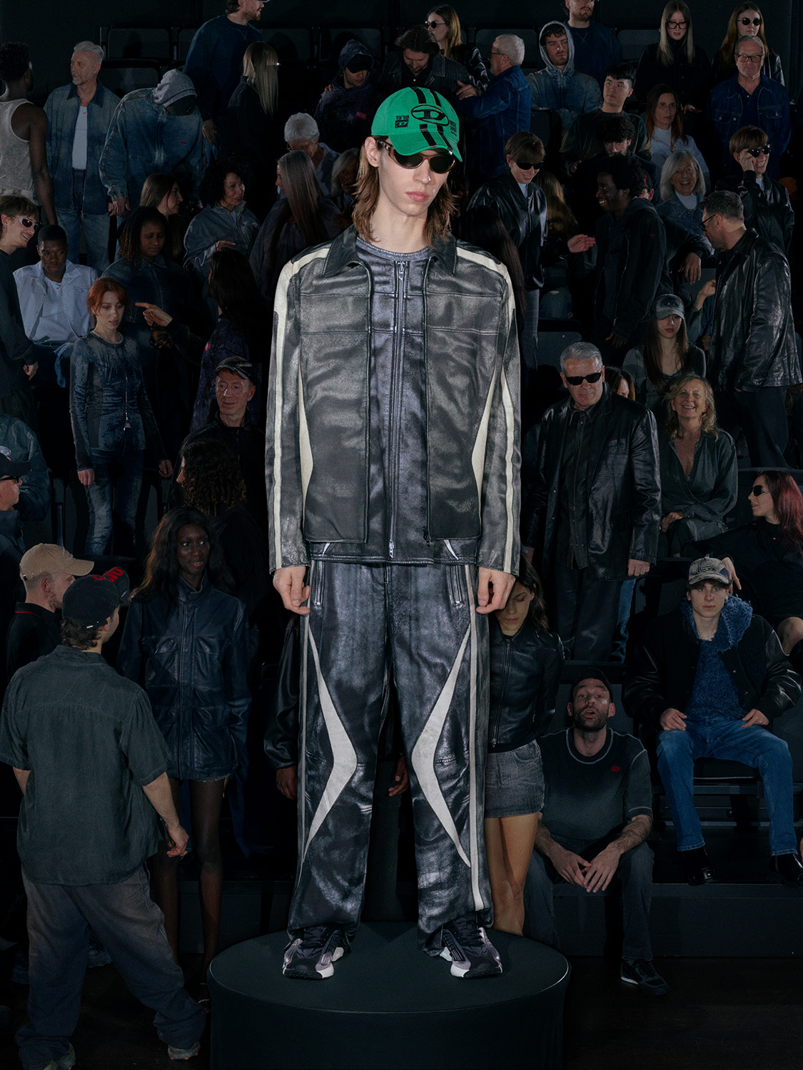 同时,材质的大胆对比同样是该系列中的另一看点,采用羊毛与氯丁橡胶材质的双排扣大衣演绎出更为成熟、理性的轮廓,搭配可拆卸的针织领口;亮面皮革与水洗丹宁材质共同塑造的风衣除了在视觉上宏观呈现出巨大的观感差异,还在拼接处巧妙形成收腰设计,在微观上具备一定的功能性考量。此外,该系列还囊括大量具备赛车基因的夹克,而正装部分如西装和鸡尾酒裙则通过流畅剪裁和宽松比例,结合数字化处理的弥散褶皱印花,展现出飘逸而轻盈的质感。