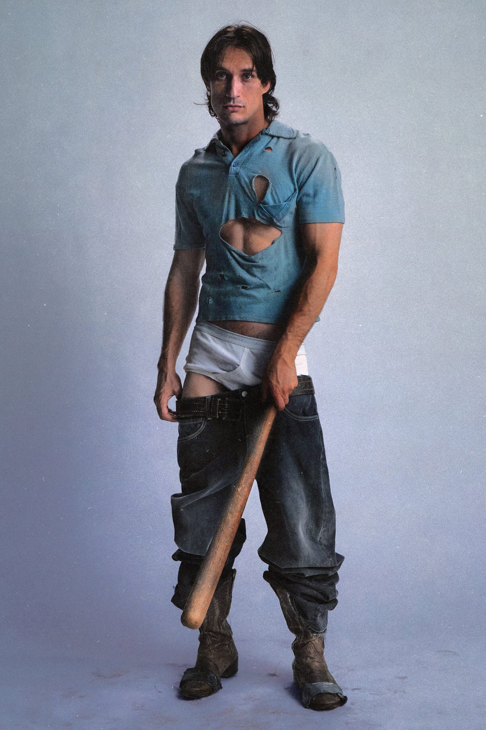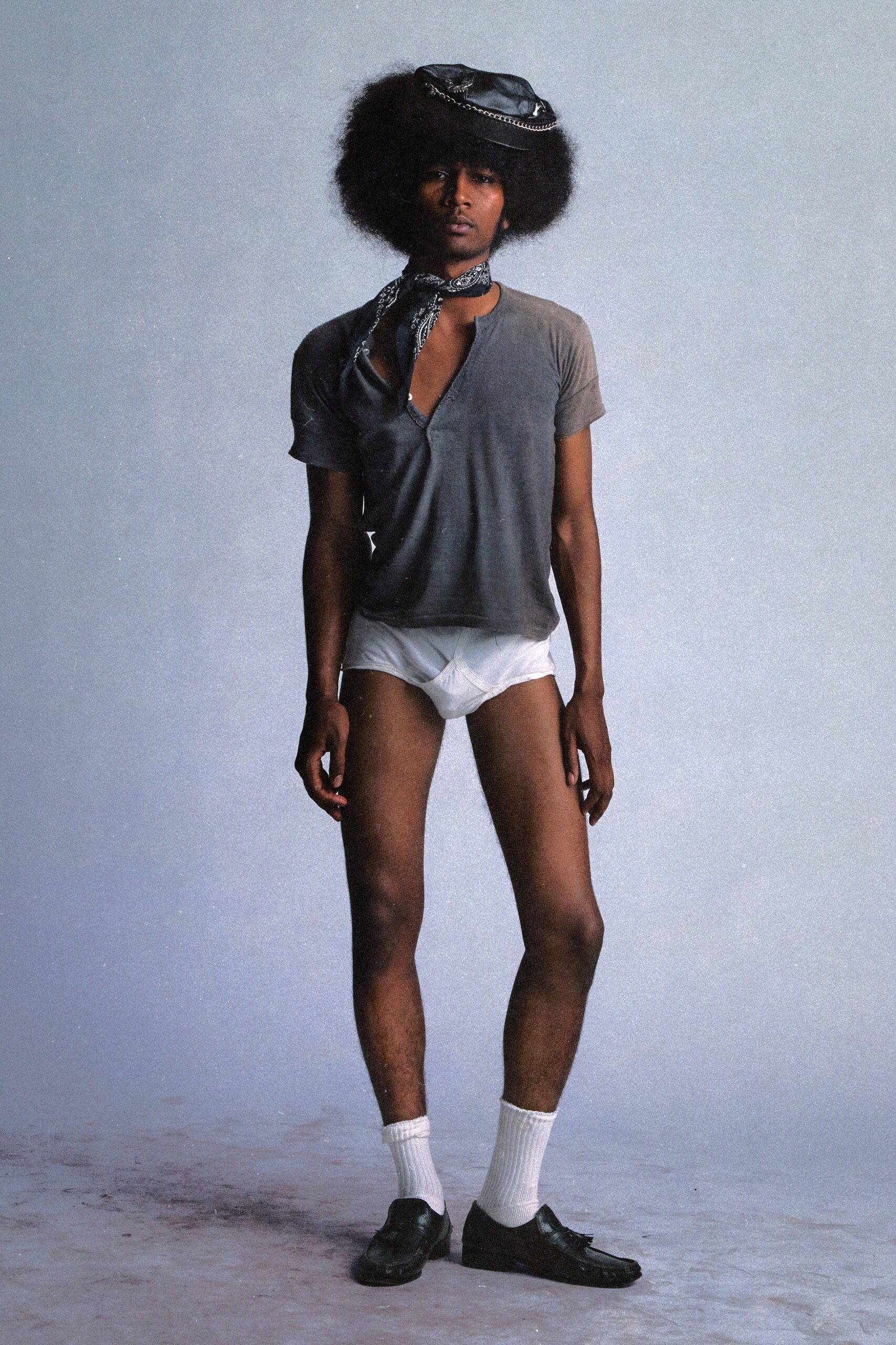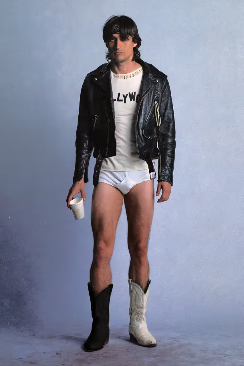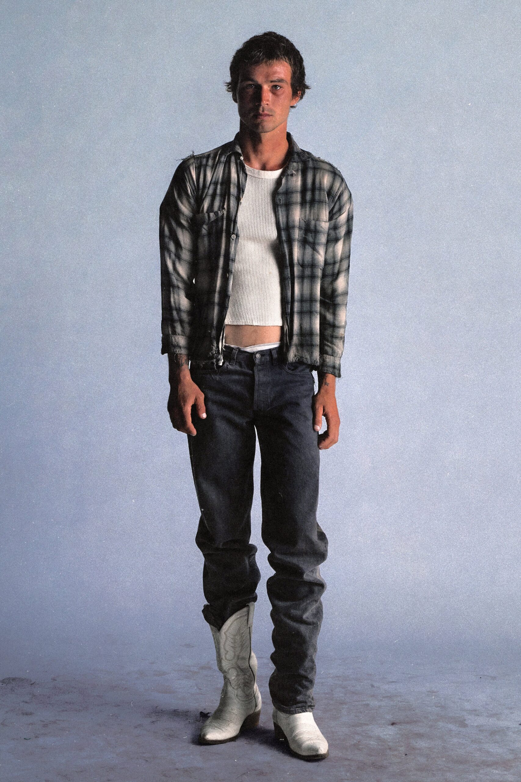 紧身 T 恤、亨利衫、衬衫以及靴型牛仔裤展现了男性对更精致且独立风格的追求,强调了随性却不失力量感的设计。此次系列的亮点之一是与 70 至 80 年代的艺术家 Peter Berlin 的合作,Berlin 的作品和形象为该系列增添了更多的挑衅性,使得整个系列更具成熟魅力与危险感。