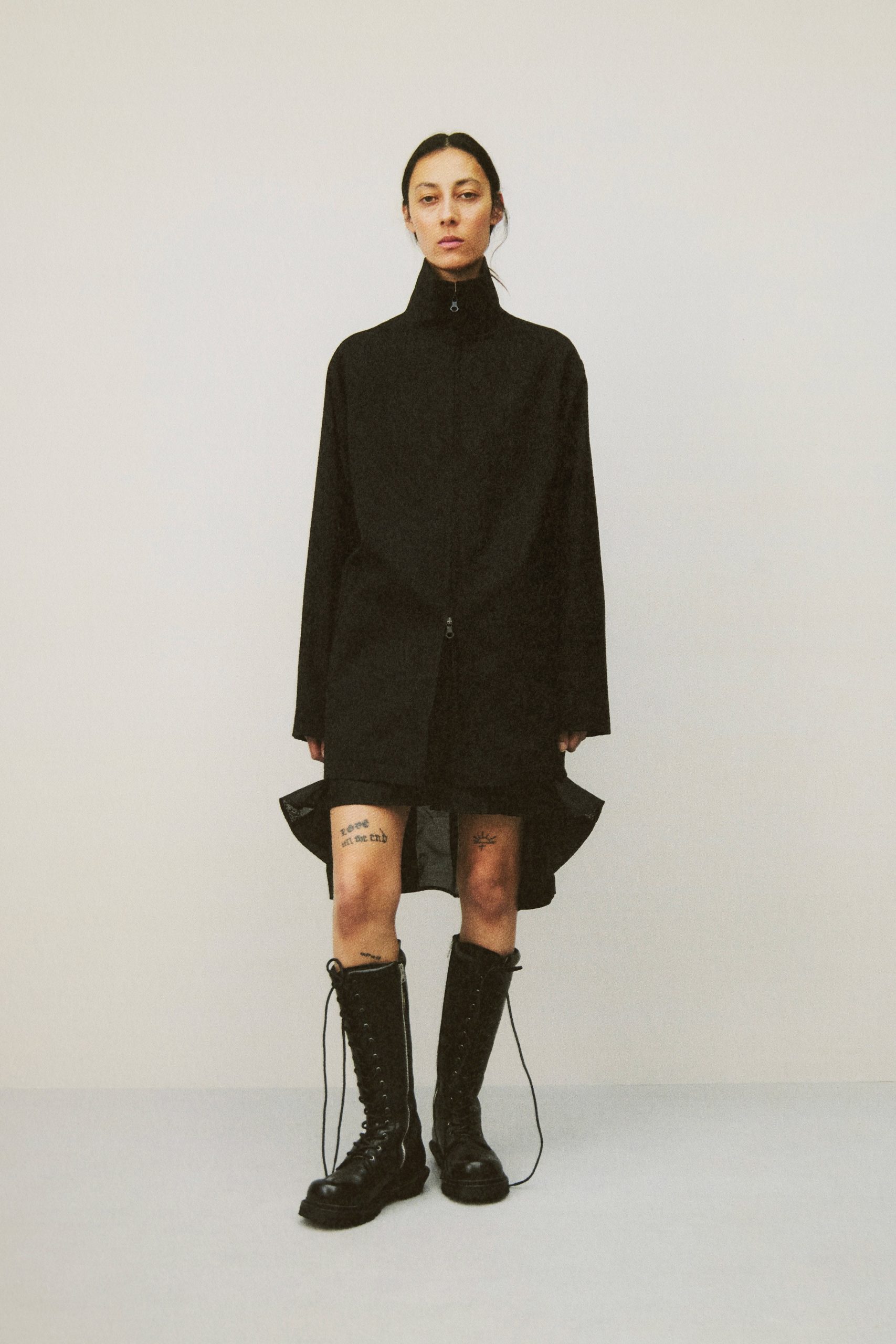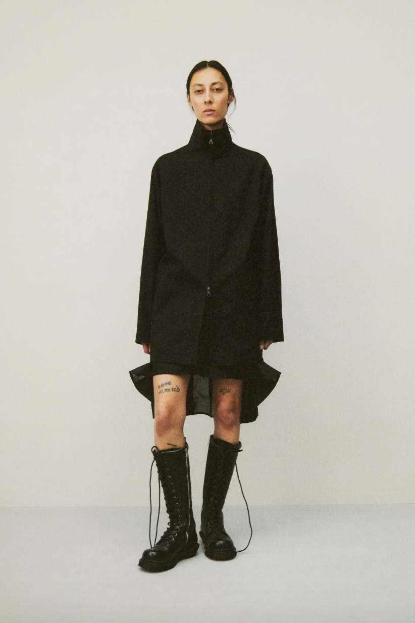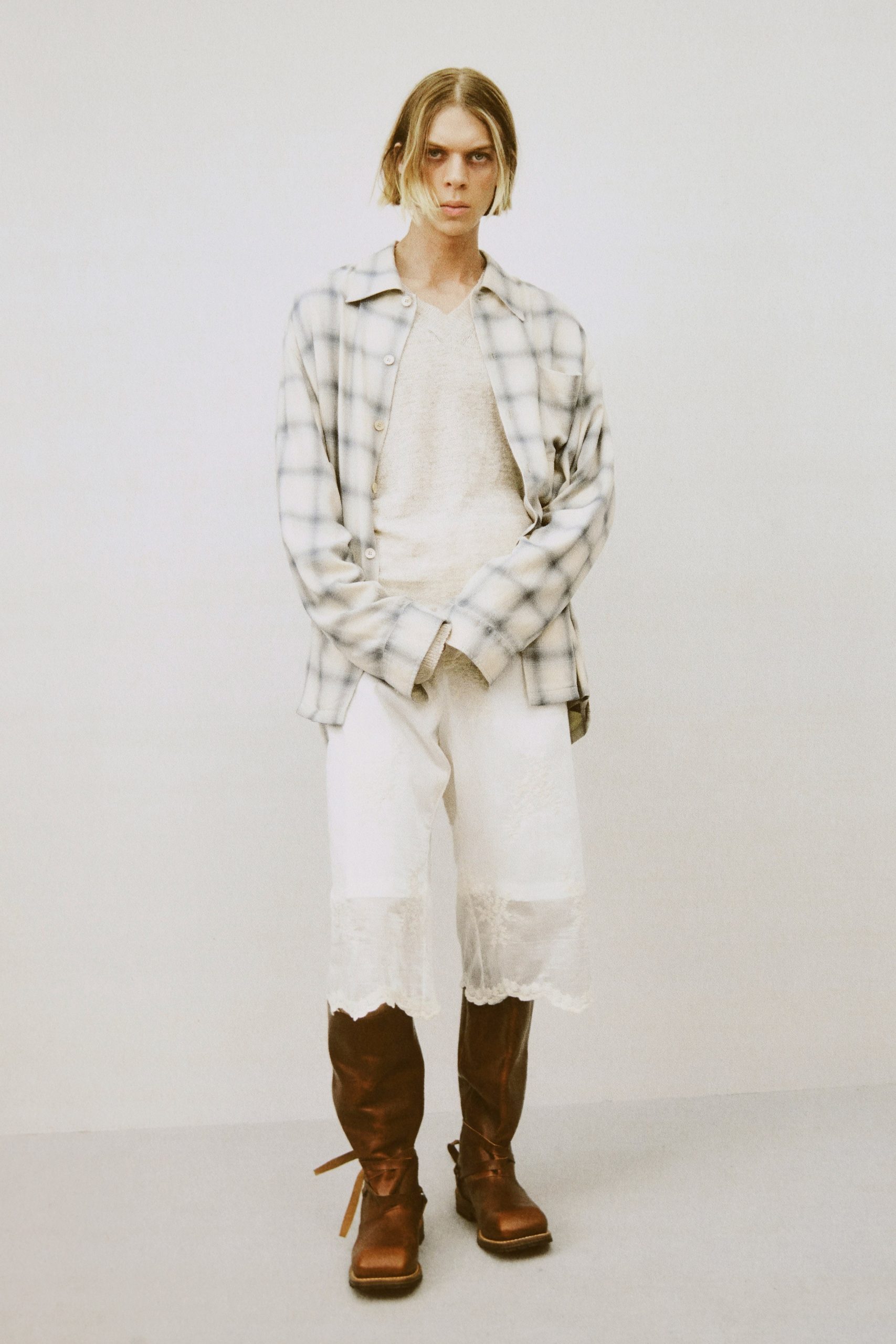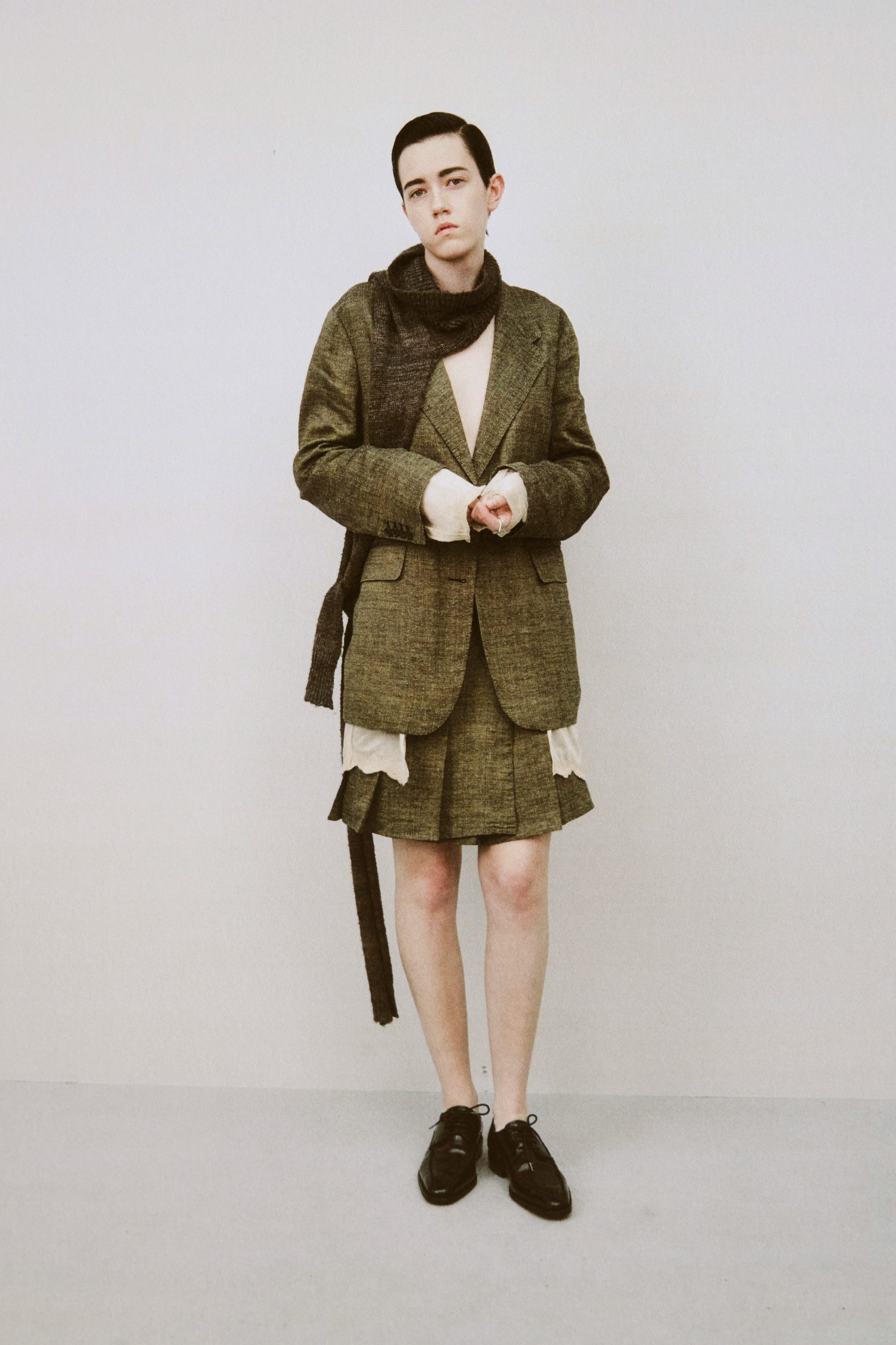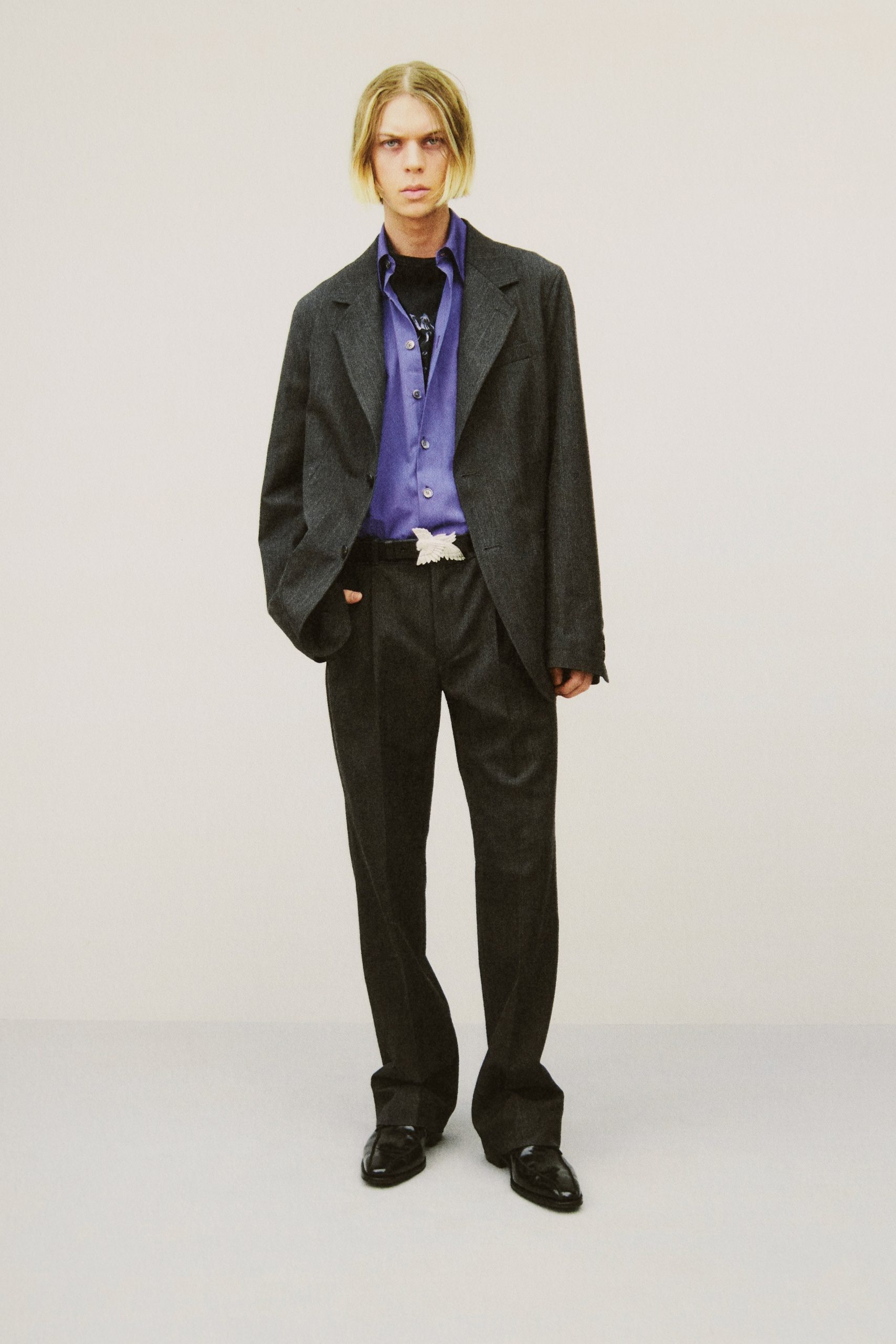 男女装造型比往季更加和谐。男式制服夹克通过塑形设计更显女性柔美,女装中常见的小开衩也被加入男装。蕾丝贯穿了军装造型在内的整个系列。Our Legacy 热门单品得以全新再现,例如燕尾服飞行员夹克或 2005 年首个系列中的「死亡天使」印花。还有一些面料首次亮相,例如彩虹色的针织面料——曾并未被纳入考虑。