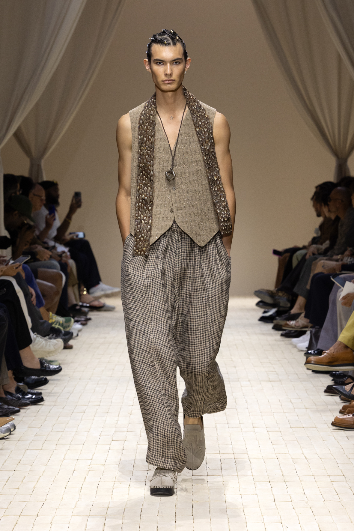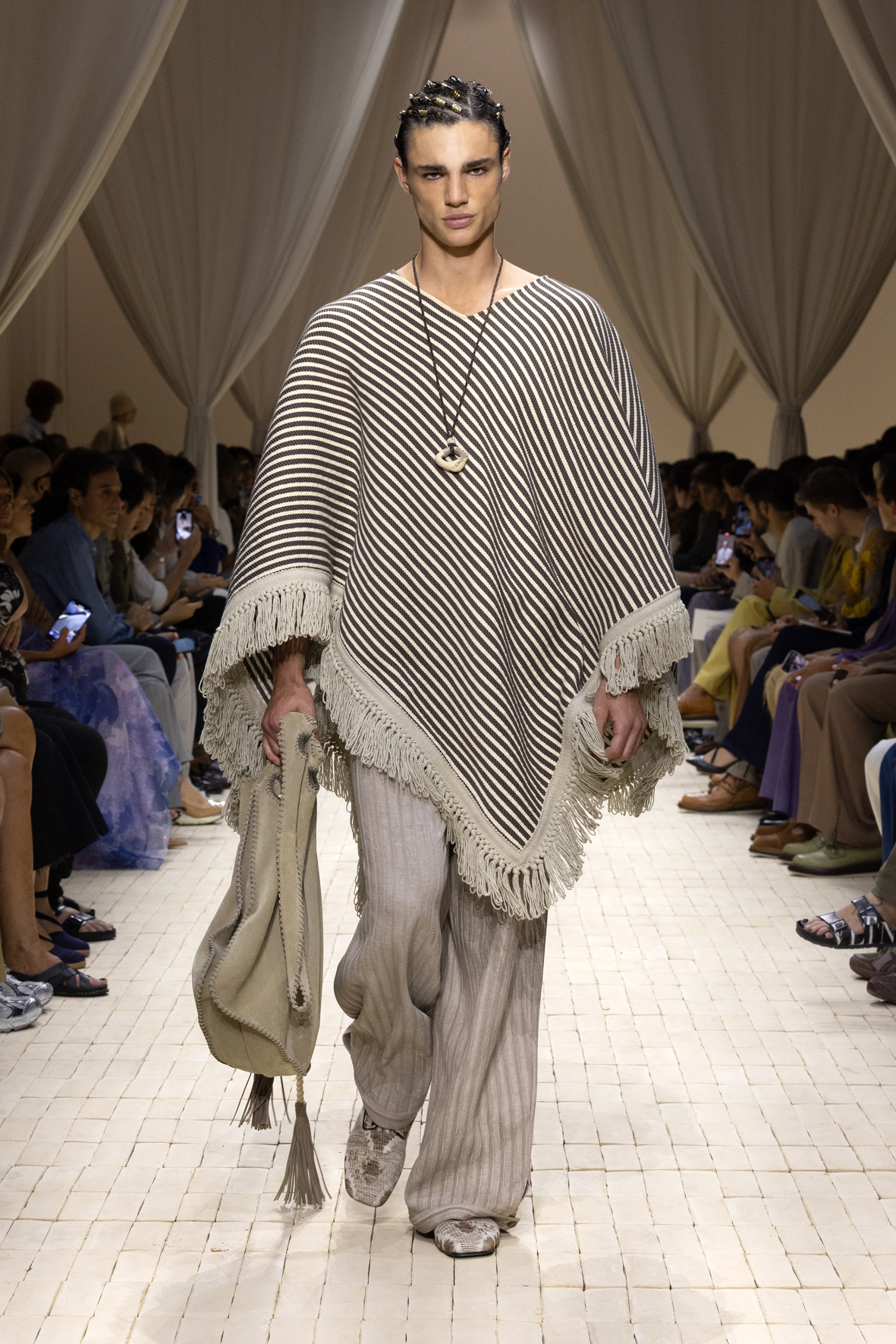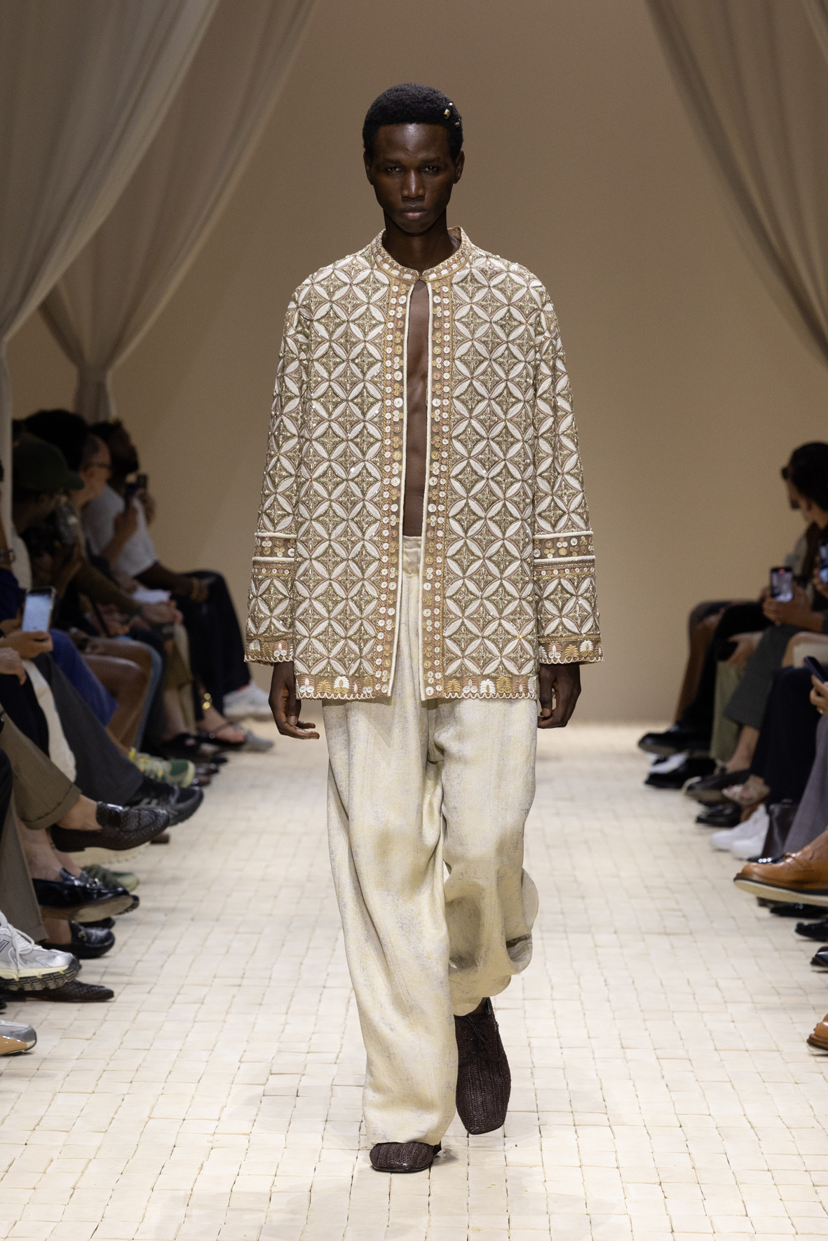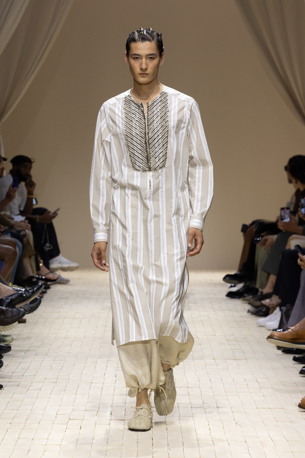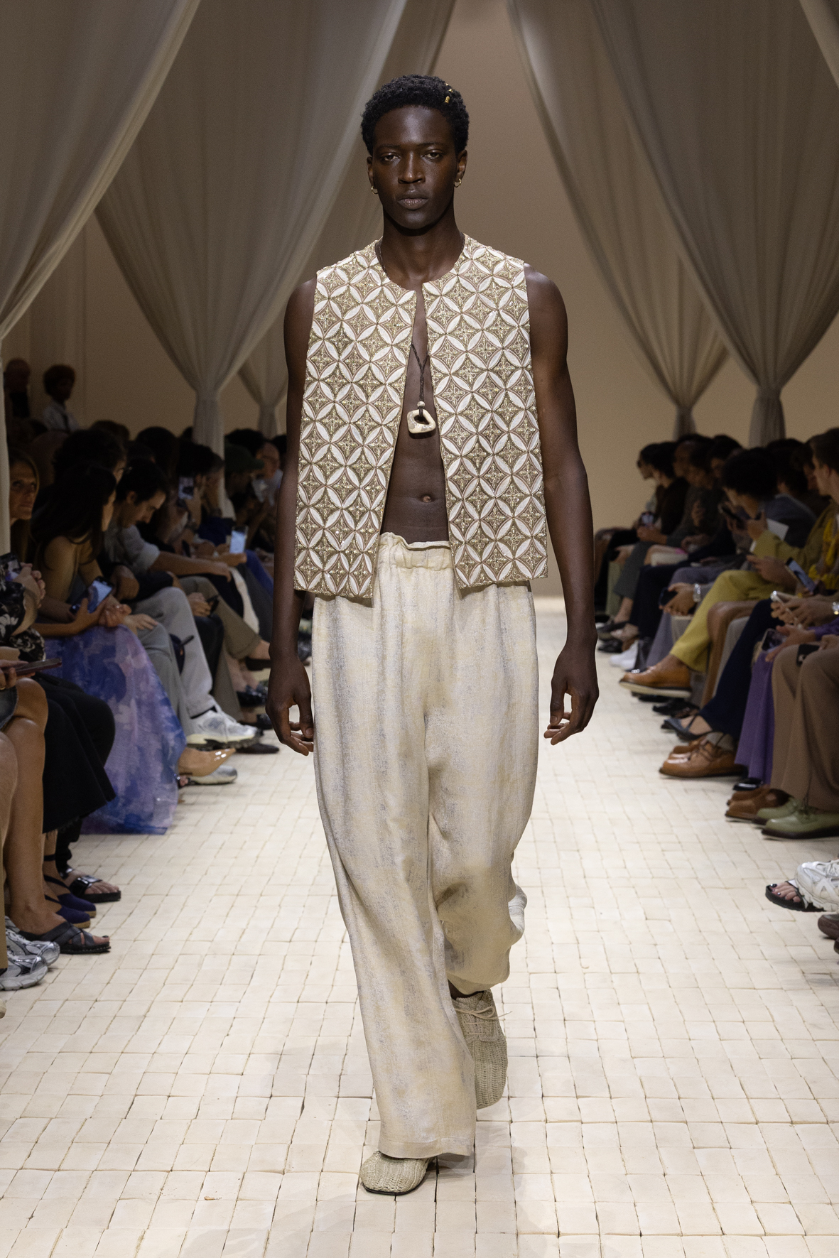 对本源的思考始于材质:绉绸和亚麻或粗粝而挺括,或流畅而轻盈;冷染技术则赋予色彩经受烈日洗礼的古朴质感,如温暖的沙色、泥土色和红土色调,其间点缀着草原的色彩、深邃的紫罗兰和饱和度较低的红色。跃然于衣 面的图案灵感源自摩洛哥马赛克或柏柏尔帐篷;缩褶绣令人联想到仪式纹身,密集的珠饰和丝线刺绣则勾勒出富有韵律的几何图案和象征无限的符号意向。