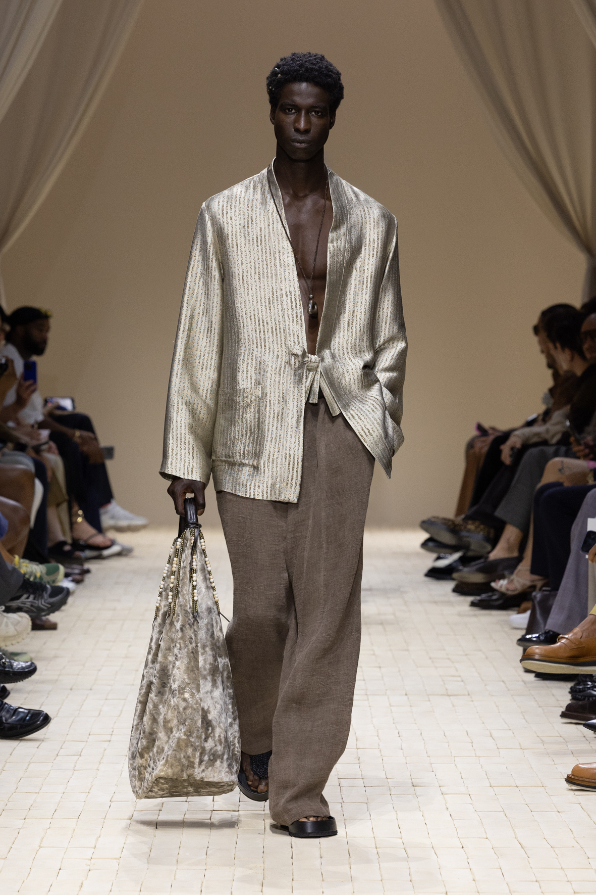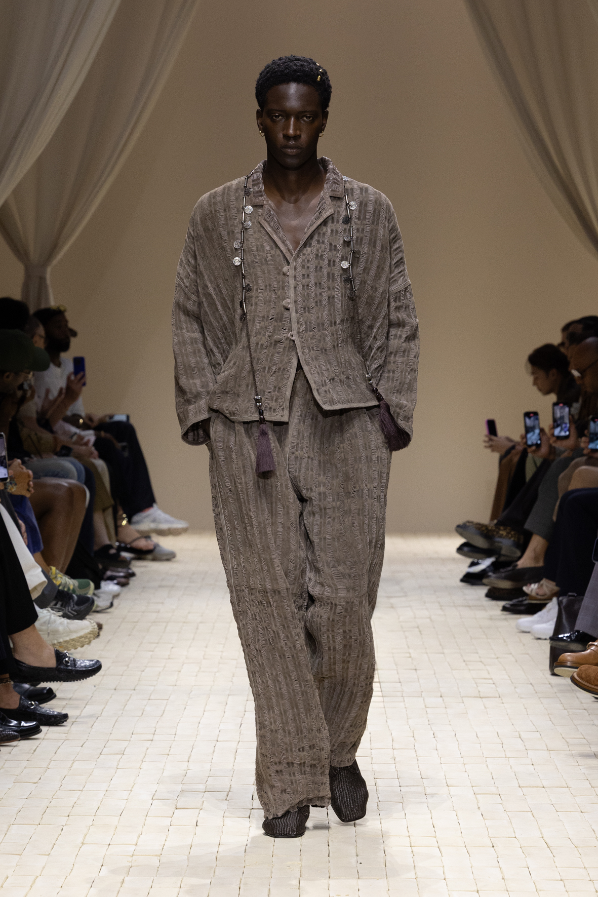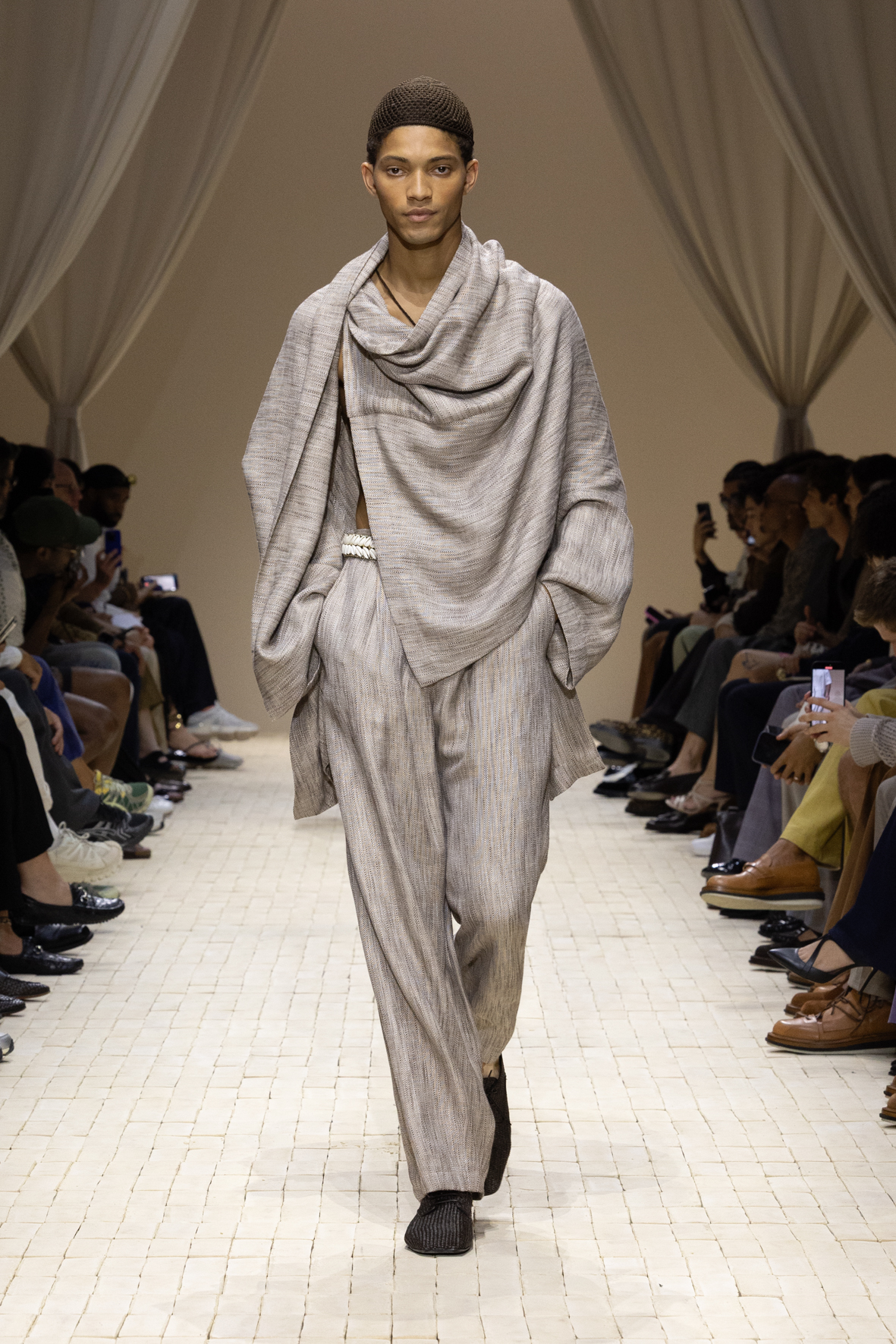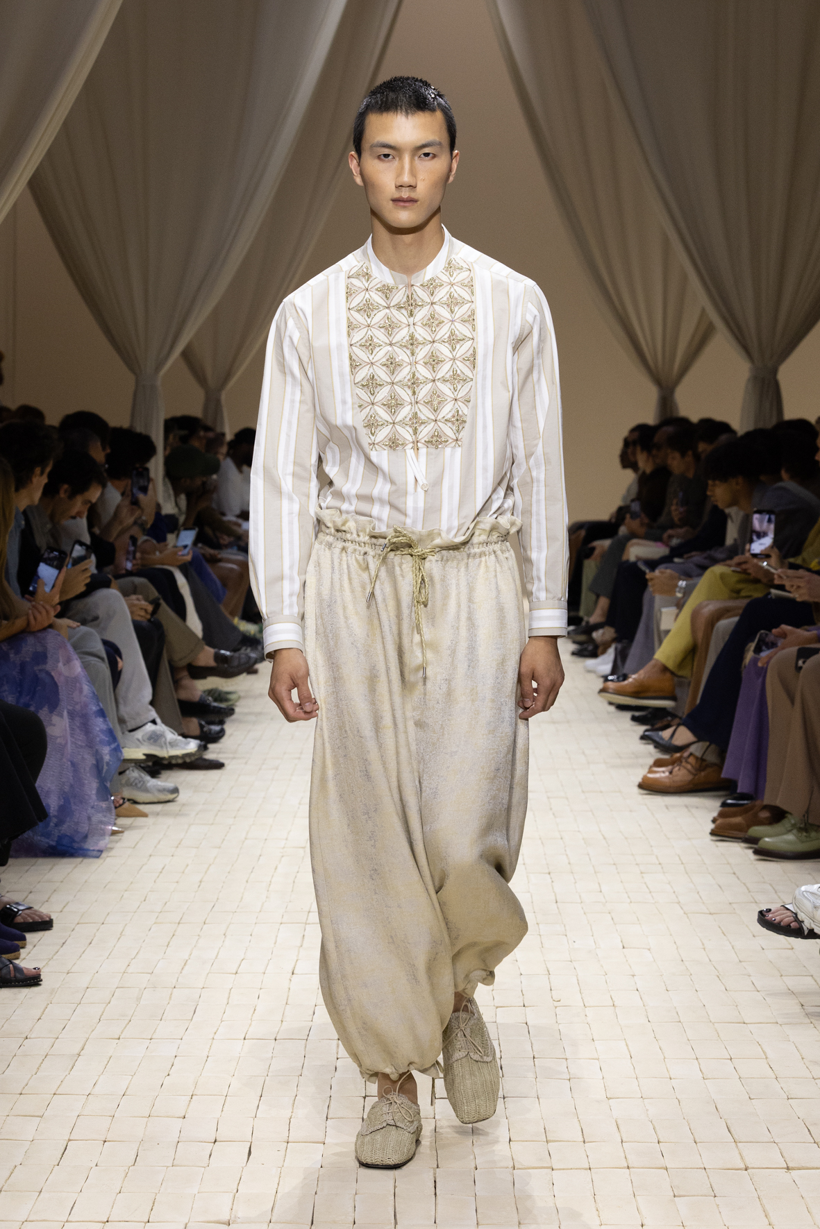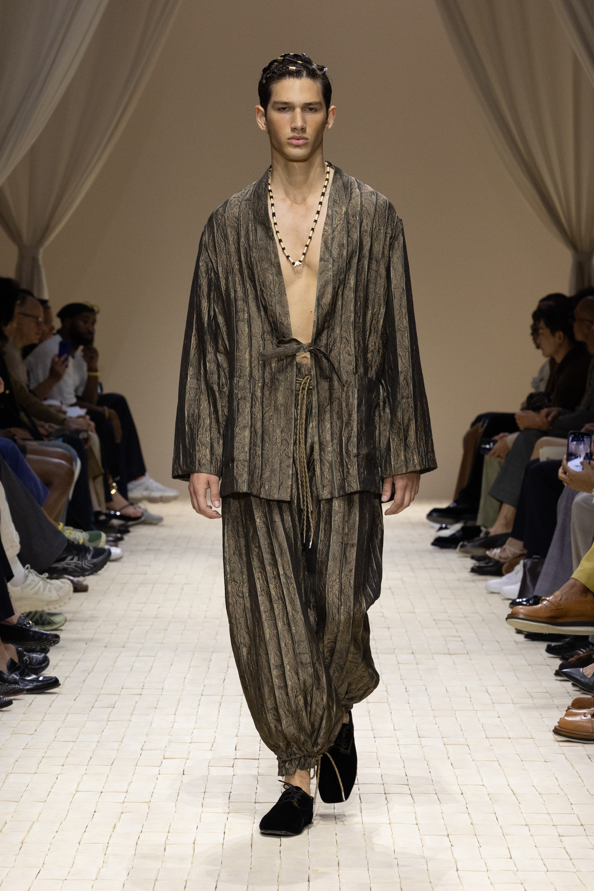 对本源的思考始于材质:绉绸和亚麻或粗粝而挺括,或流畅而轻盈;冷染技术则赋予色彩经受烈日洗礼的古朴质感,如温暖的沙色、泥土色和红土色调,其间点缀着草原的色彩、深邃的紫罗兰和饱和度较低的红色。跃然于衣 面的图案灵感源自摩洛哥马赛克或柏柏尔帐篷;缩褶绣令人联想到仪式纹身,密集的珠饰和丝线刺绣则勾勒出富有韵律的几何图案和象征无限的符号意向。